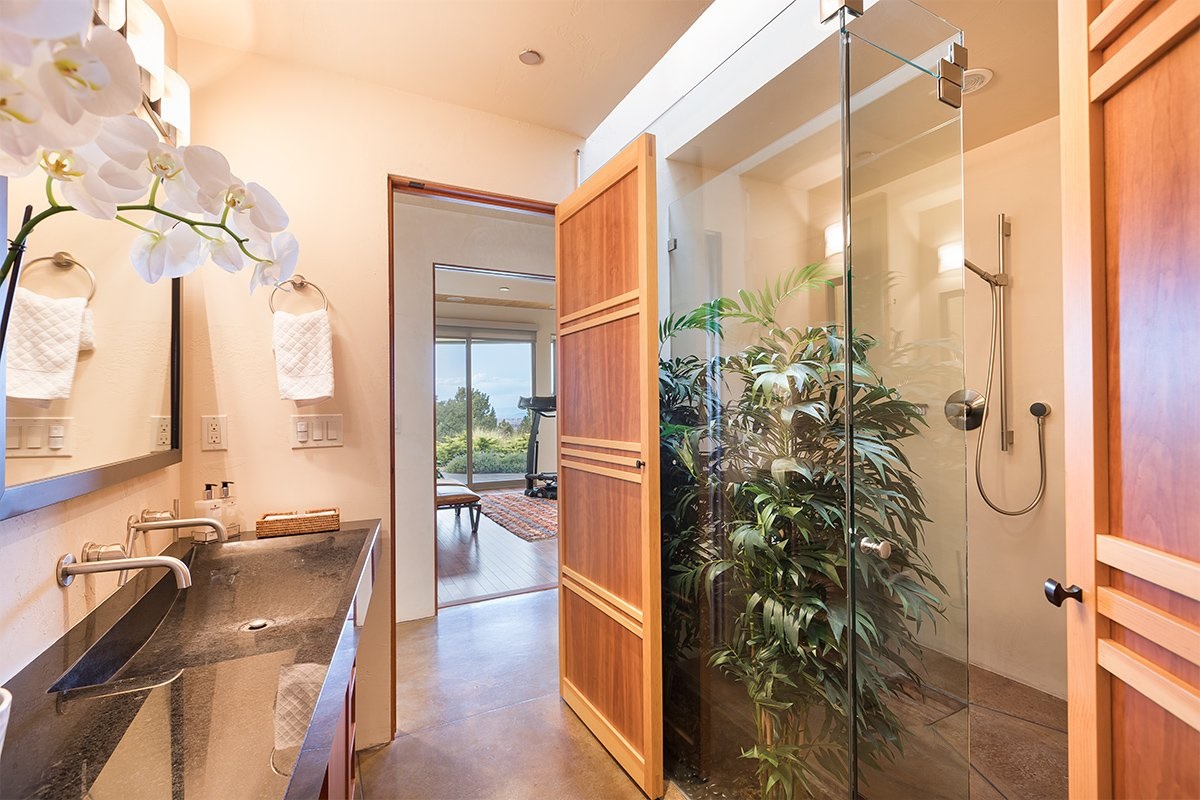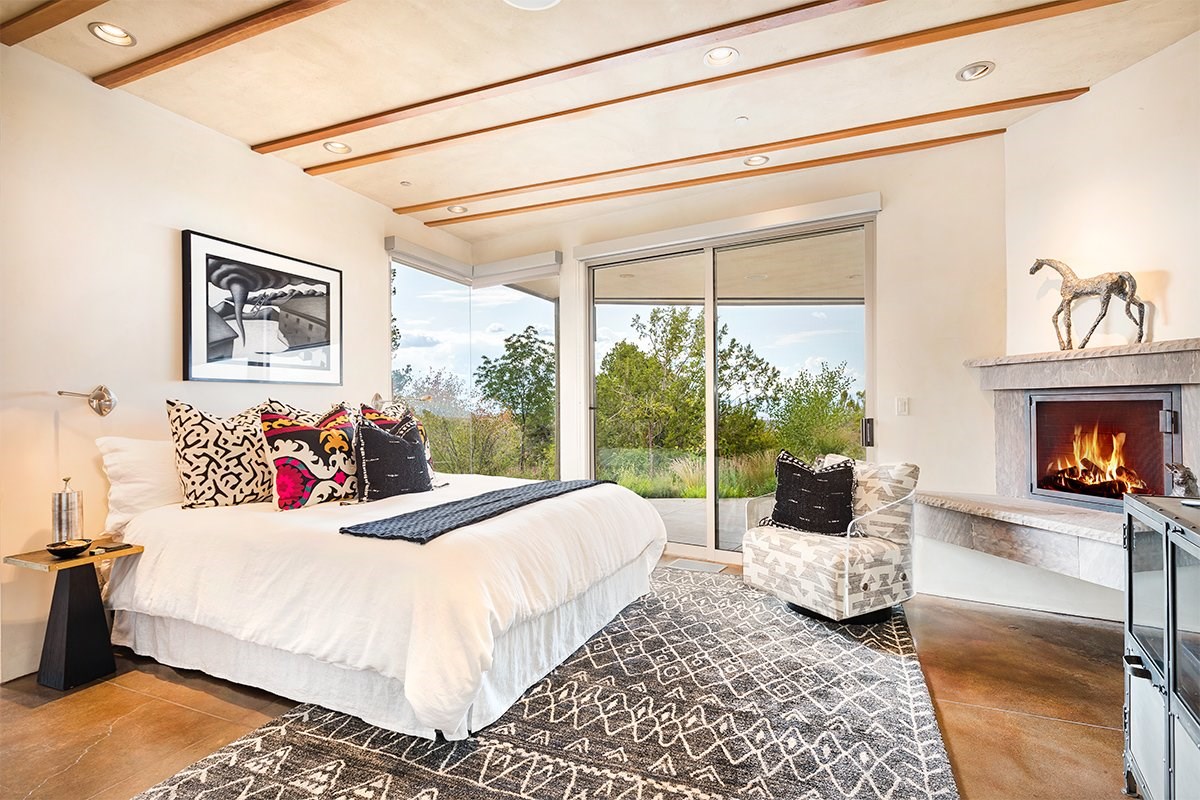 Contemporary architectural masterpiece, sited high above Bishops Lodge Hills with unparalleled Jemez Mountain and sunset views. Designed by renowned architect, Ted Turner, this exquisite home exemplifies the unique blend of clean, modern design which incorporates indoor and outdoor living to perfection with sliding glass doors and seamless glass view windows throughout this stunning residence. Thoughtfully designed with an open concept interior, this home offers the ultimate entertainment experience with wrap around view portal space, surround, lush inspired, vibrant landscape, raised gardens, a vineyard, tranquil water feature, and fire pit. Design features include a stunning living room and formal dining area with surround view windows, which open directly into the modern chef's island kitchen with spectacular views, a breakfast dining area, and casual living room or media room. Additionally, this contemporary residence offers ideal separation of space with a private primary suite and luxurious spa-like bath complete with a glass atrium, soaking tub and exercise area, in addition to a generous office and a separate guest wing with 3 guest bedrooms. Luxury details include rich cherry and maple custom doors throughout, plaster walls, a Geothermal heating and cooling system, and a new roof in 2020 with transferable warranty. Bishops Lodge Hills is a luxury, gated community with a community pool and home of the future Auberge Resort.