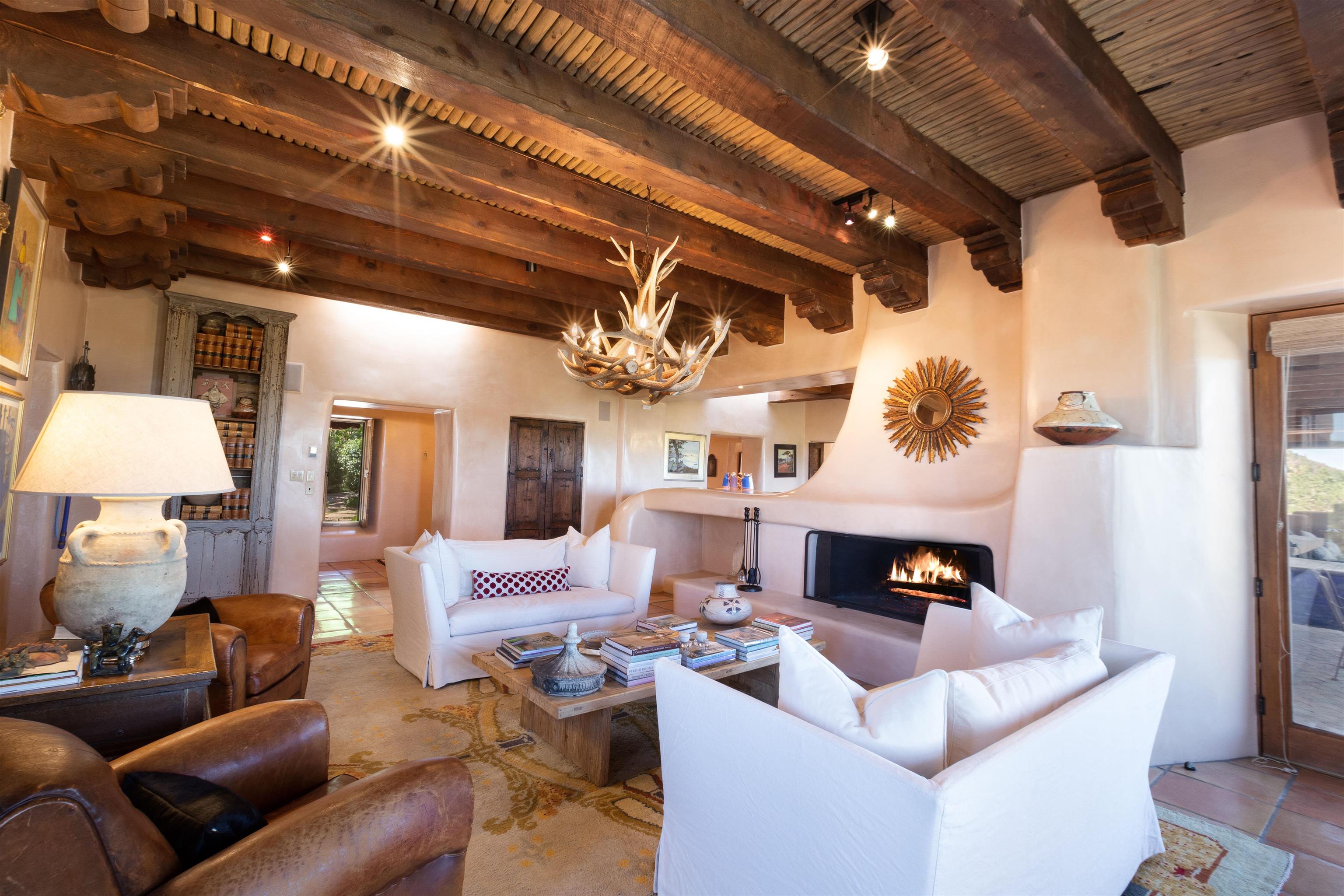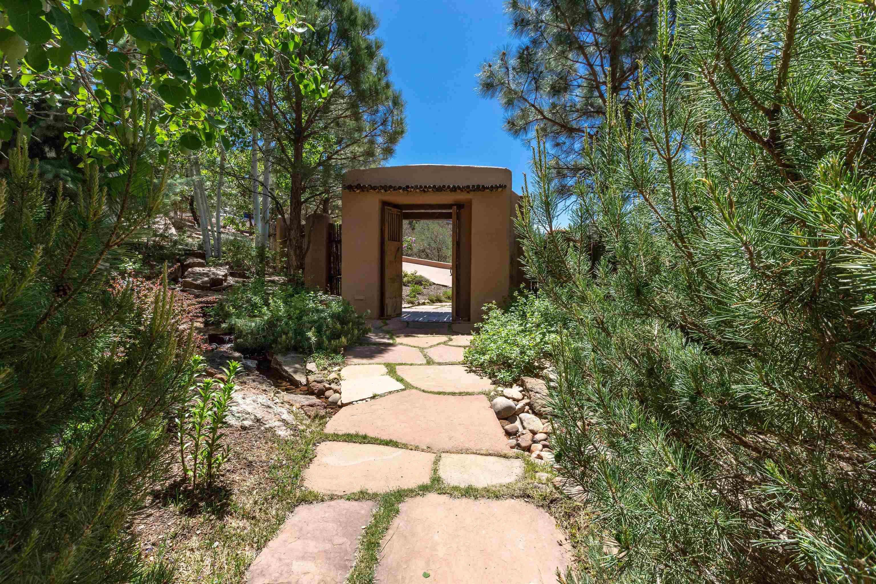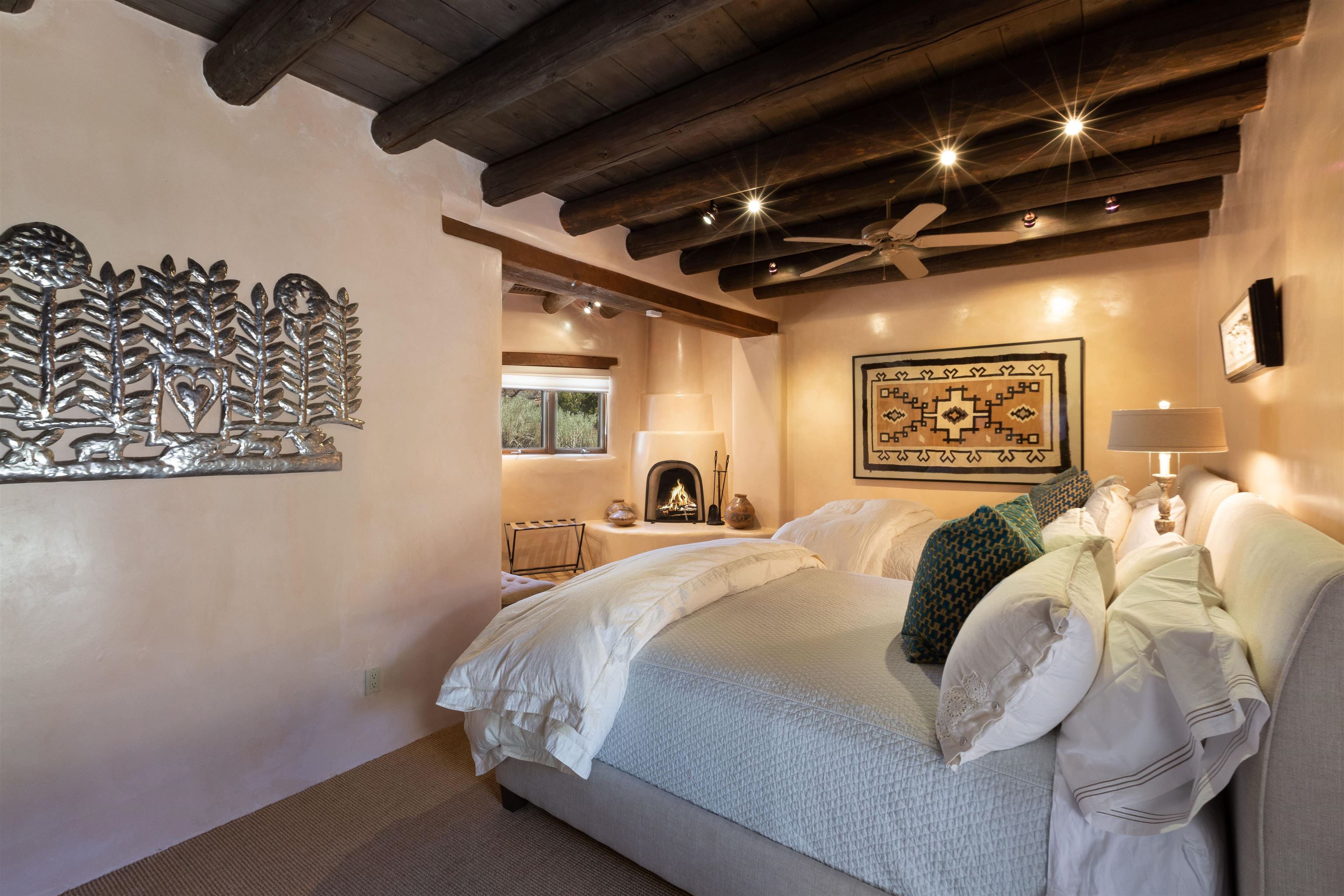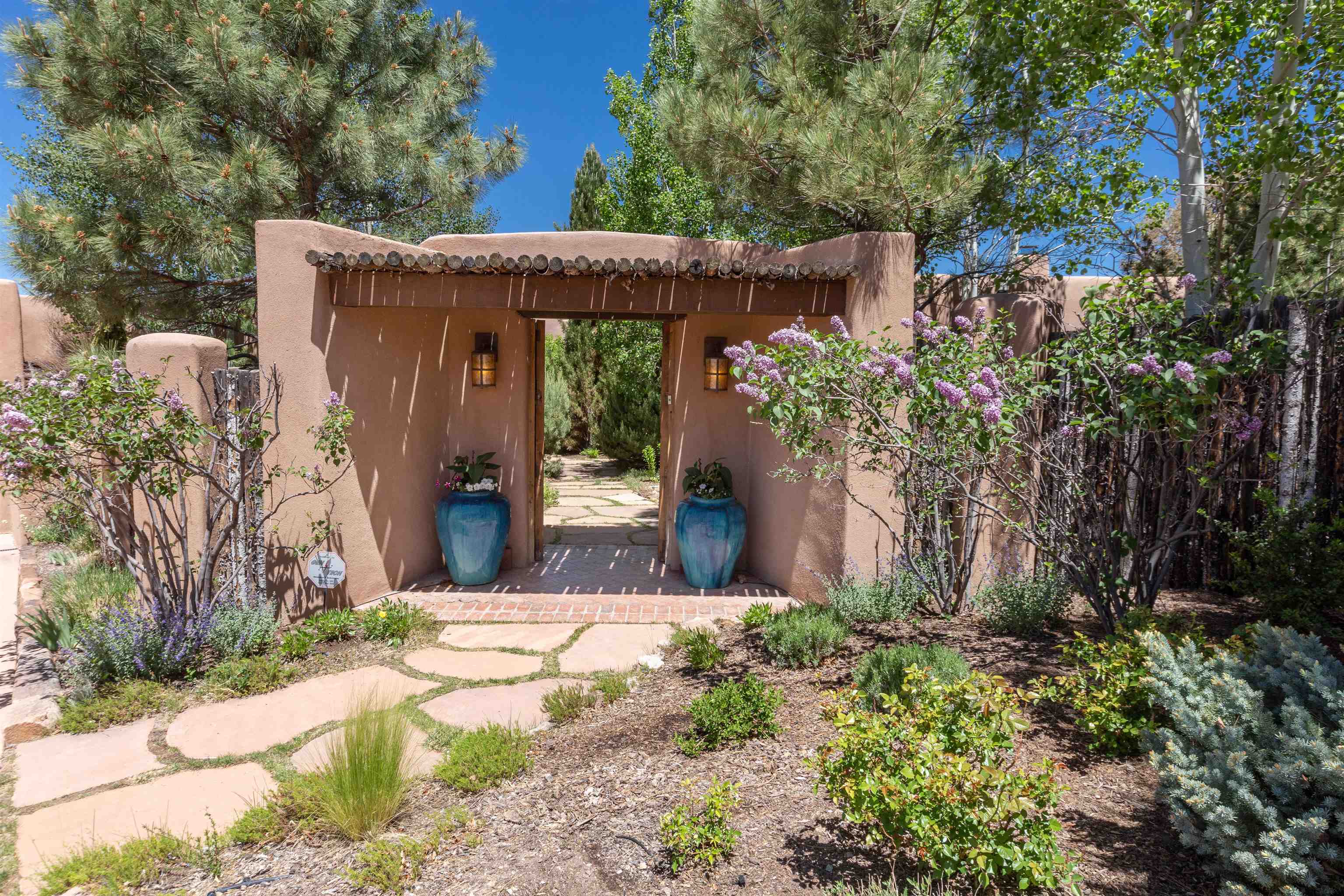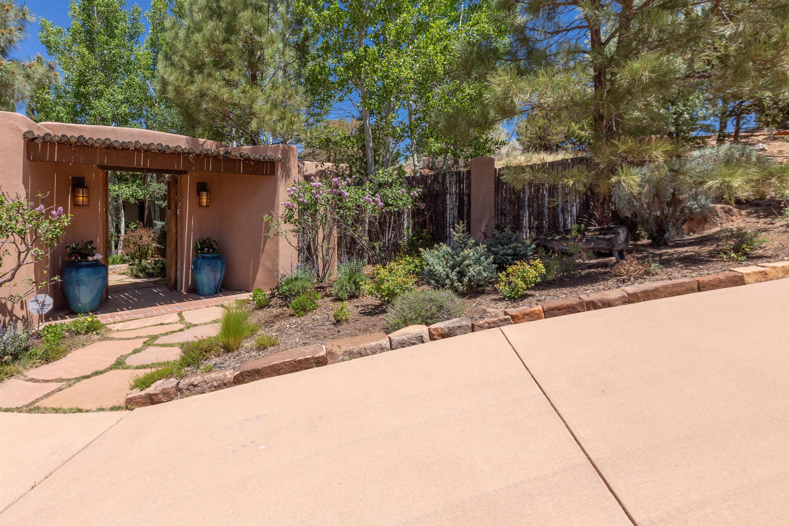 Minutes from the Plaza and above the historic Eastside this inviting home captures magnificent mountain and city light views all behind the gated sought after community of Ocaso Del Sol. Enter through a lovely gated entrance into lush Courtyard with a stream cascading through rocks and under the entry walk way. The main pueblo home has rich finishes of plaster walls, tile floors, and fabulous ceiling treatments throughout with beams, corbels & vigas. This estate exudes timeless old-world style such as the shepherd fireplace in the formal living room. The main house has a desirable floorplan with 3 bedrooms each ensuite with fireplaces offering privacy and French doors to wonderful outdoor living spaces. Live comfortably in the many lovely informal and formal rooms including an office. Enjoy the extensive West portal with custom kiva fireplace, built in bancos, built in grill and exceptional views, perfect for entertaining. Also accessed through the entry courtyard is the separate, fully appointed, one bedroom guest house. The style continues with a river rock fireplace, wood floors, kitchen and spacious bath. Off the west portal there is a studio with its own comfortable portal and separate entrance. Mature landscaping, a 3-car heated garage and so much ambiance...it's all here!