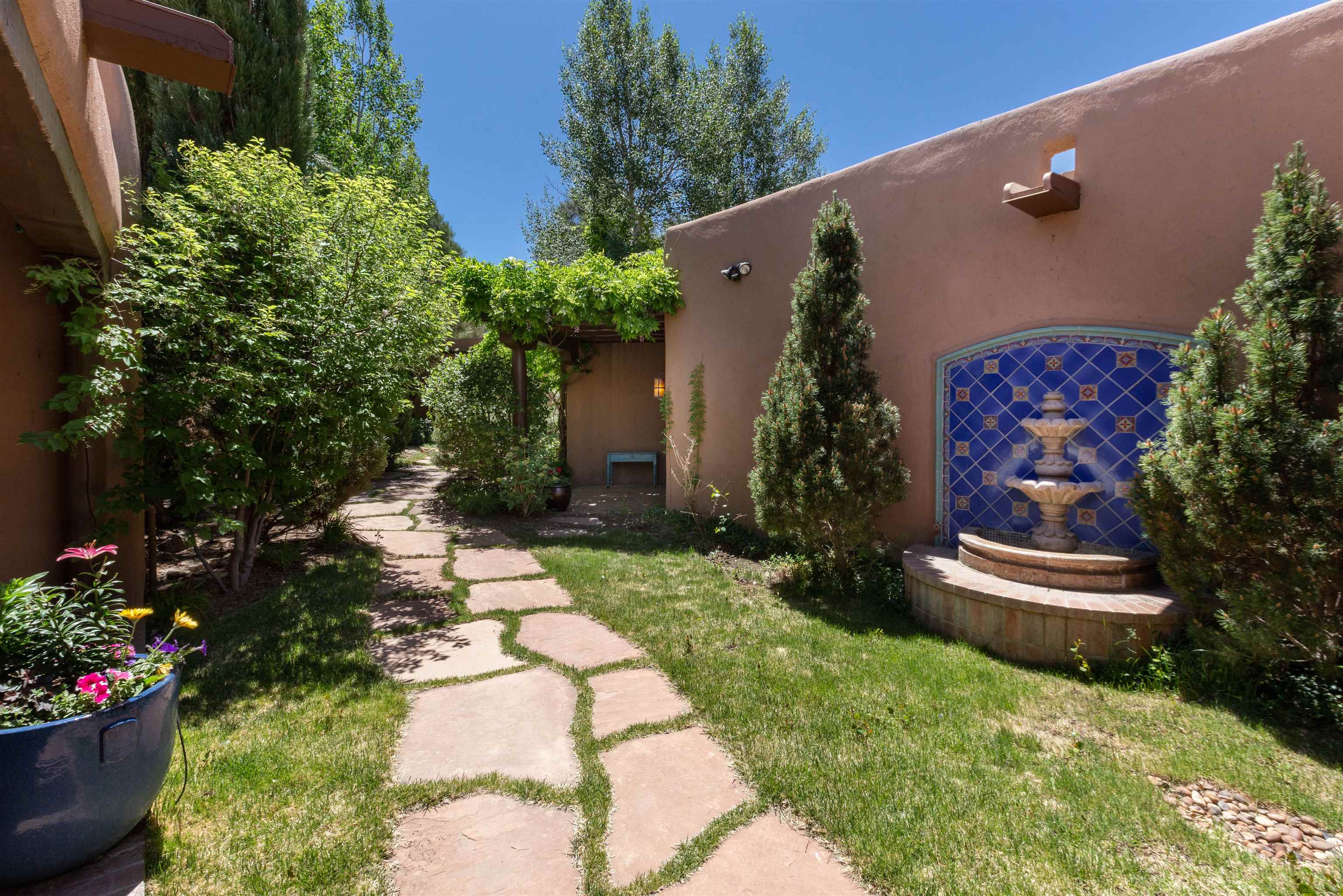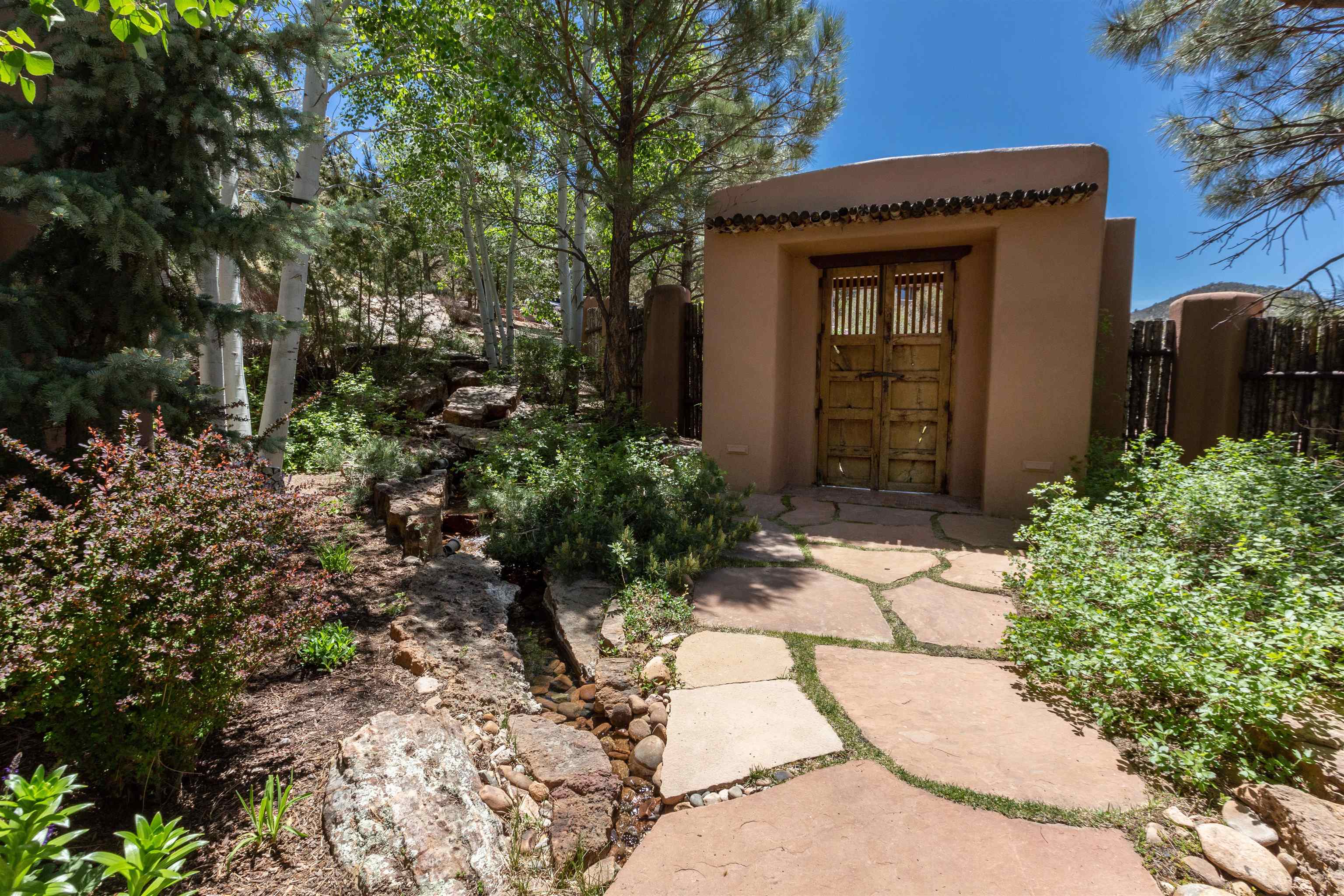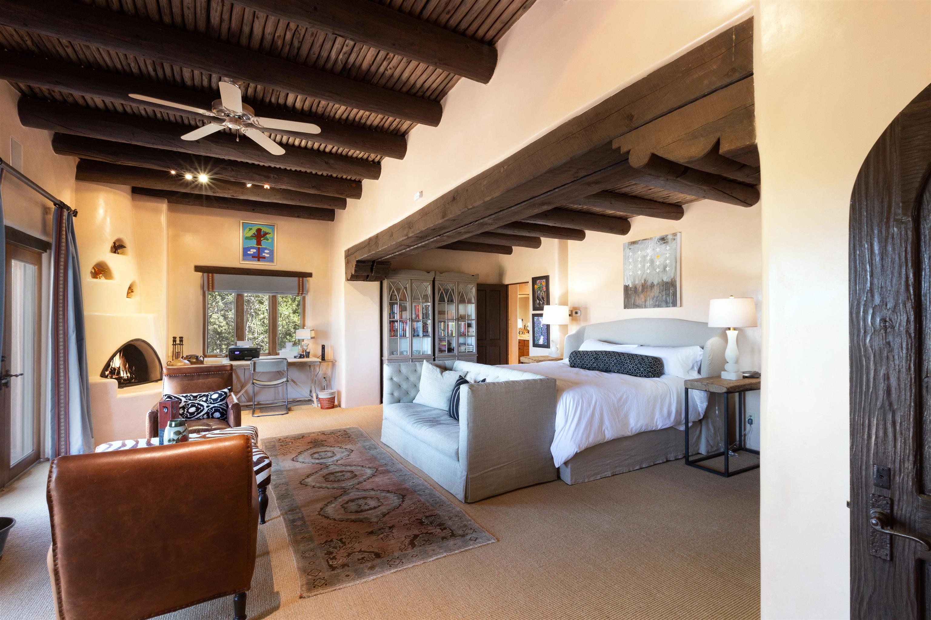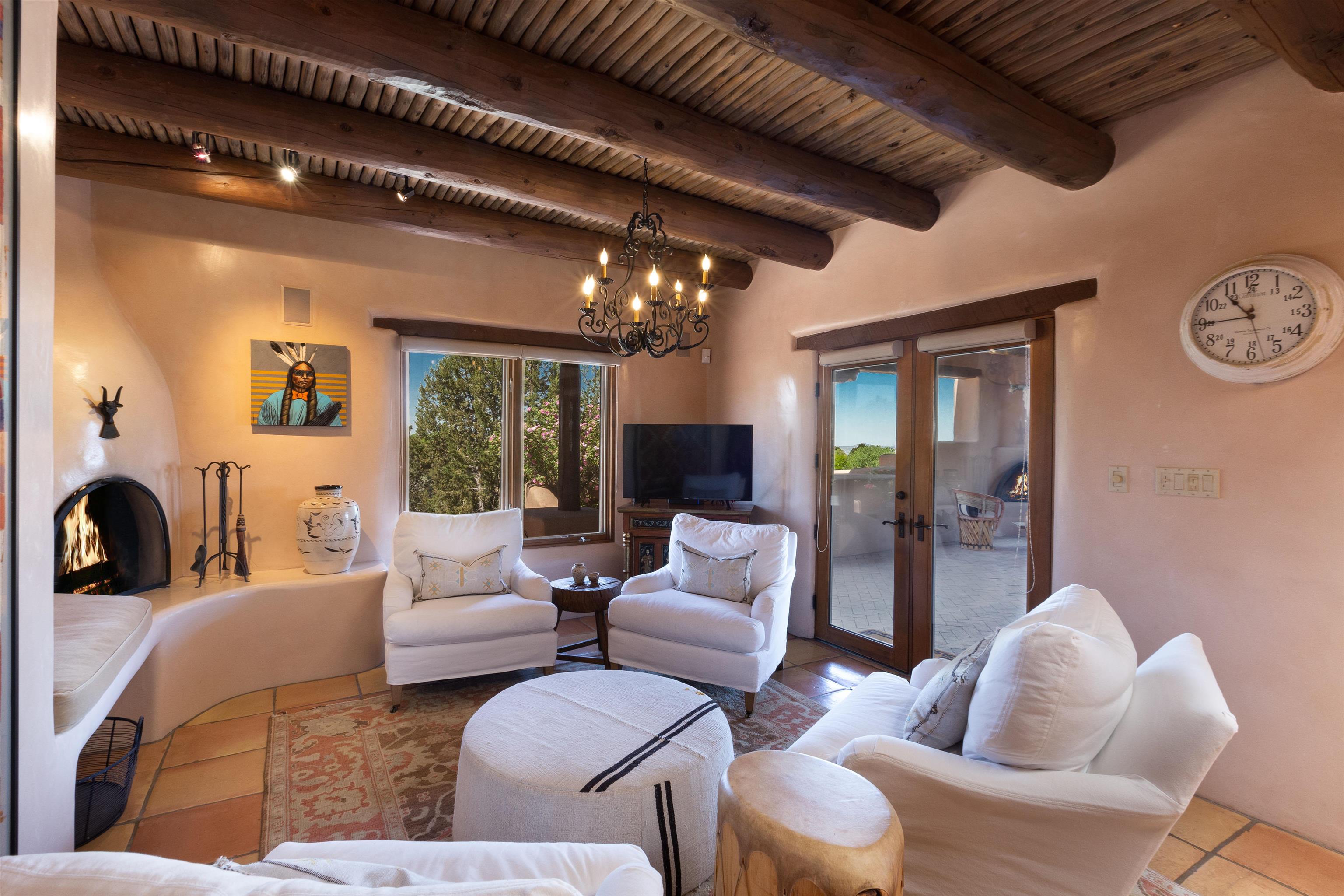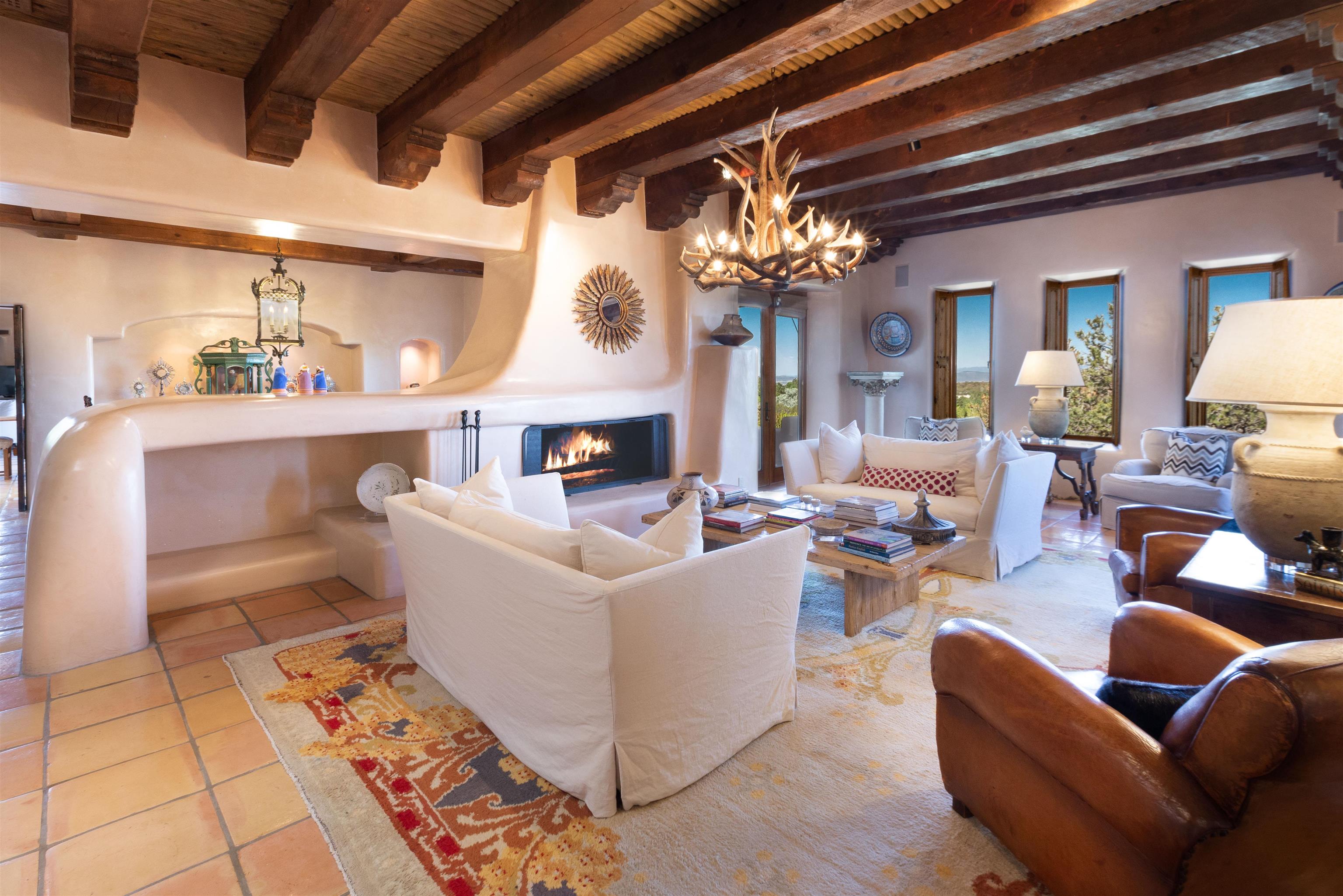 Minutes from the Plaza and above the historic Eastside this inviting home captures magnificent mountain and city light views all behind the gated sought after community of Ocaso Del Sol. Enter through a lovely gated entrance into lush Courtyard with a stream cascading through rocks and under the entry walk way. The main pueblo home has rich finishes of plaster walls, tile floors, and fabulous ceiling treatments throughout with beams, corbels & vigas. This estate exudes timeless old-world style such as the shepherd fireplace in the formal living room. The main house has a desirable floorplan with 3 bedrooms each ensuite with fireplaces offering privacy and French doors to wonderful outdoor living spaces. Live comfortably in the many lovely informal and formal rooms including an office. Enjoy the extensive West portal with custom kiva fireplace, built in bancos, built in grill and exceptional views, perfect for entertaining. Also accessed through the entry courtyard is the separate, fully appointed, one bedroom guest house. The style continues with a river rock fireplace, wood floors, kitchen and spacious bath. Off the west portal there is a studio with its own comfortable portal and separate entrance. Mature landscaping, a 3-car heated garage and so much ambiance...it's all here!