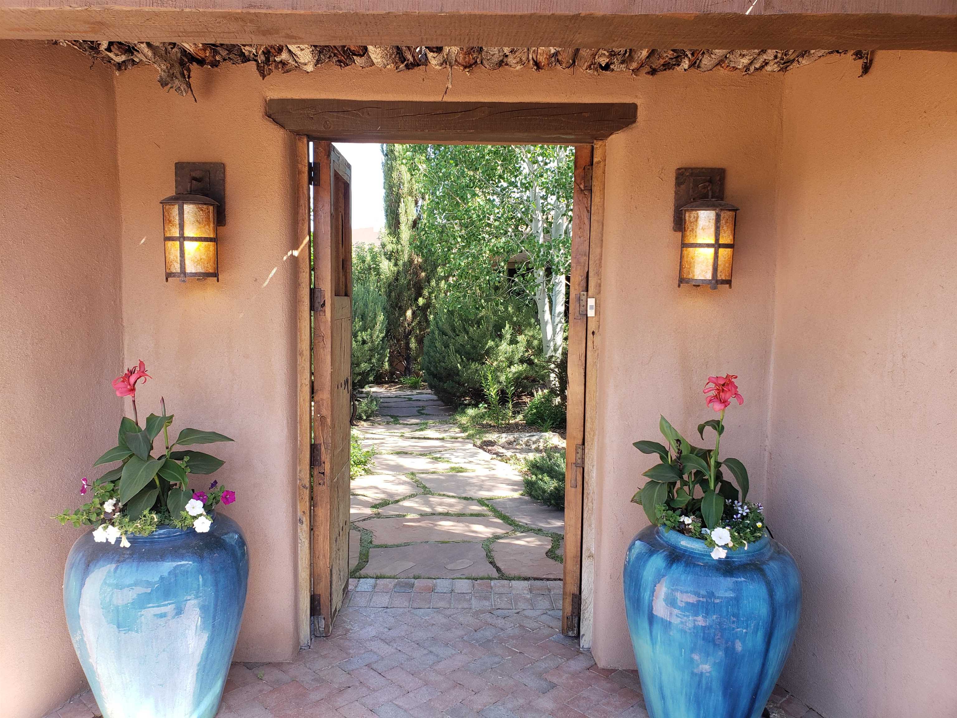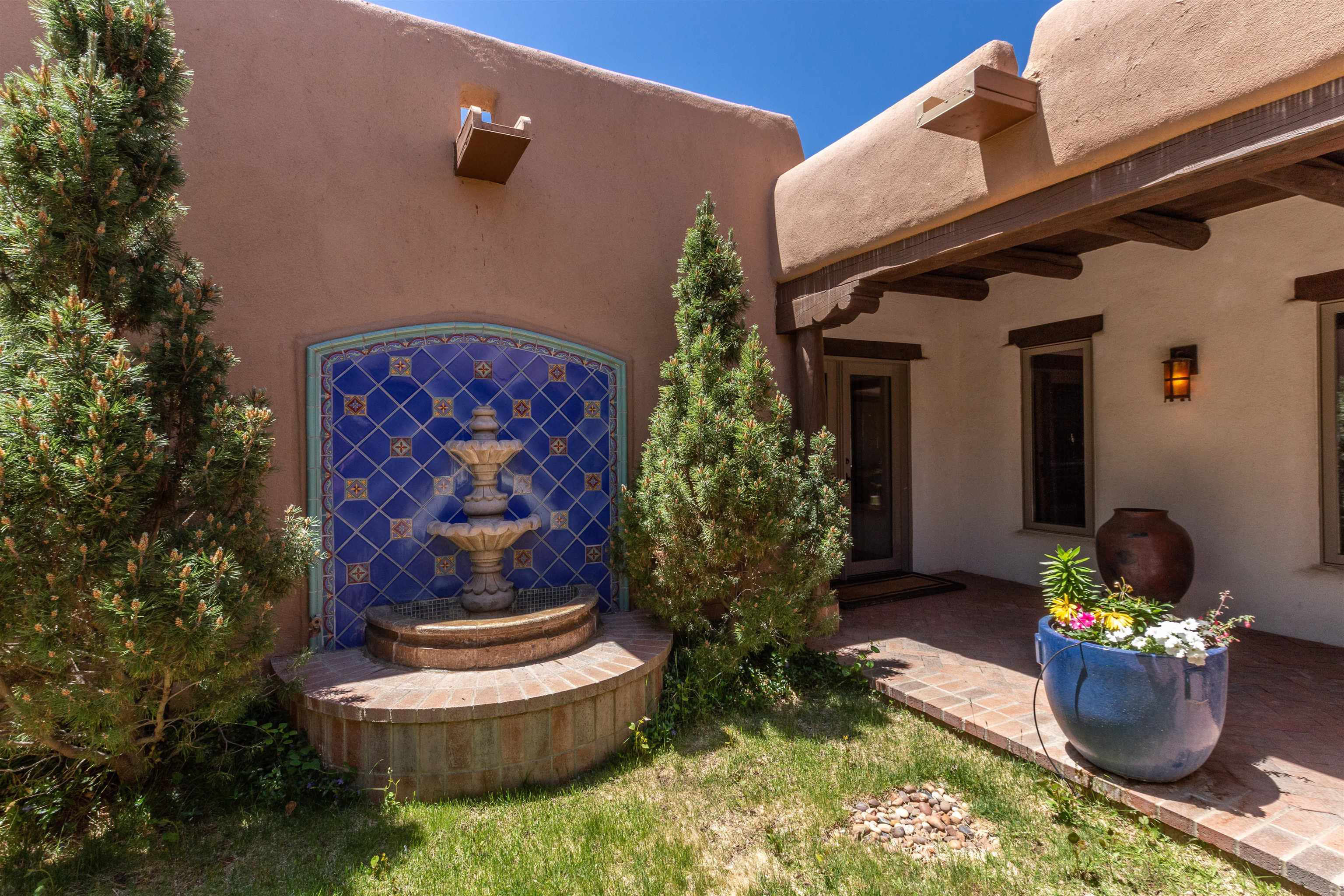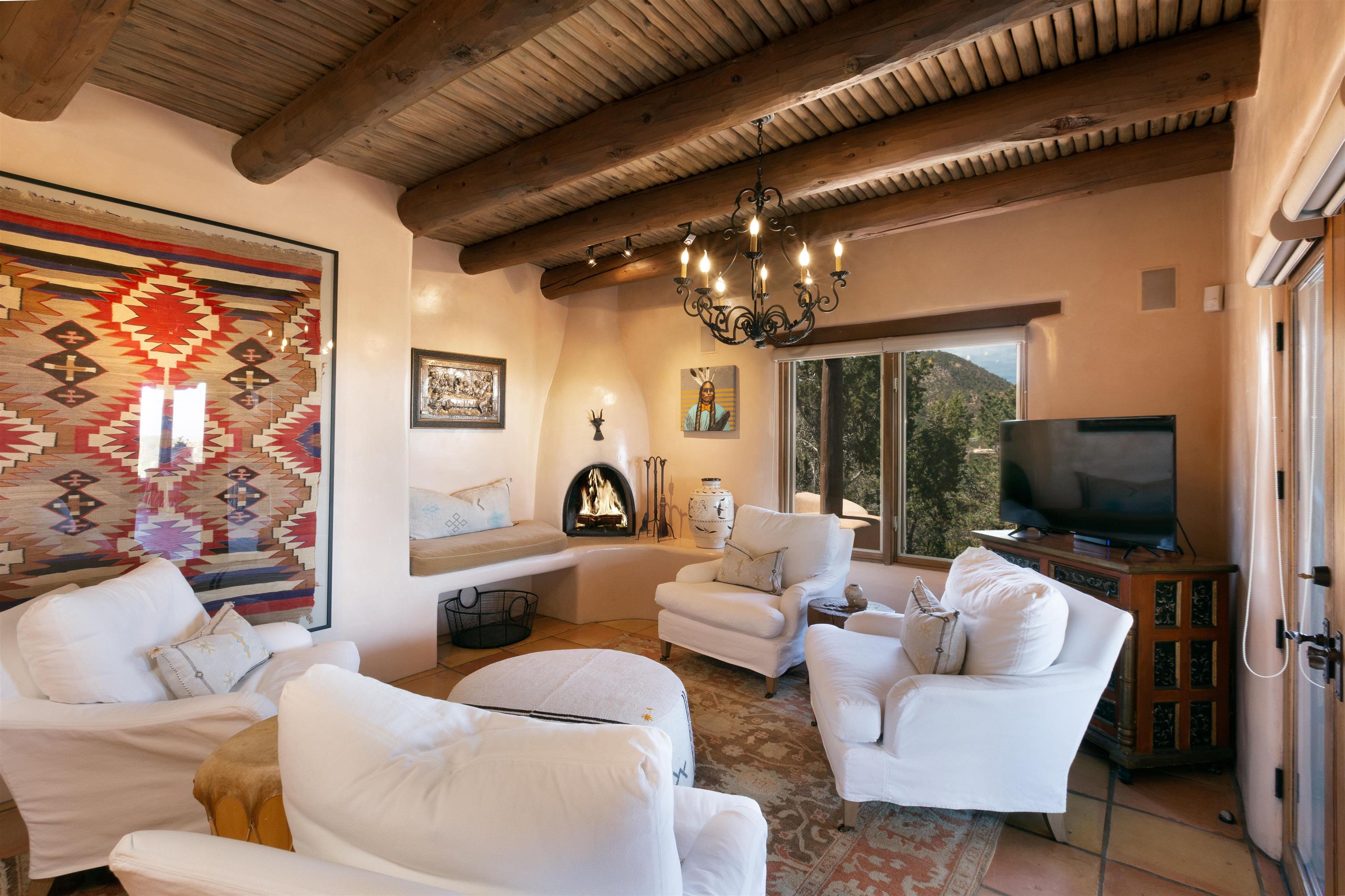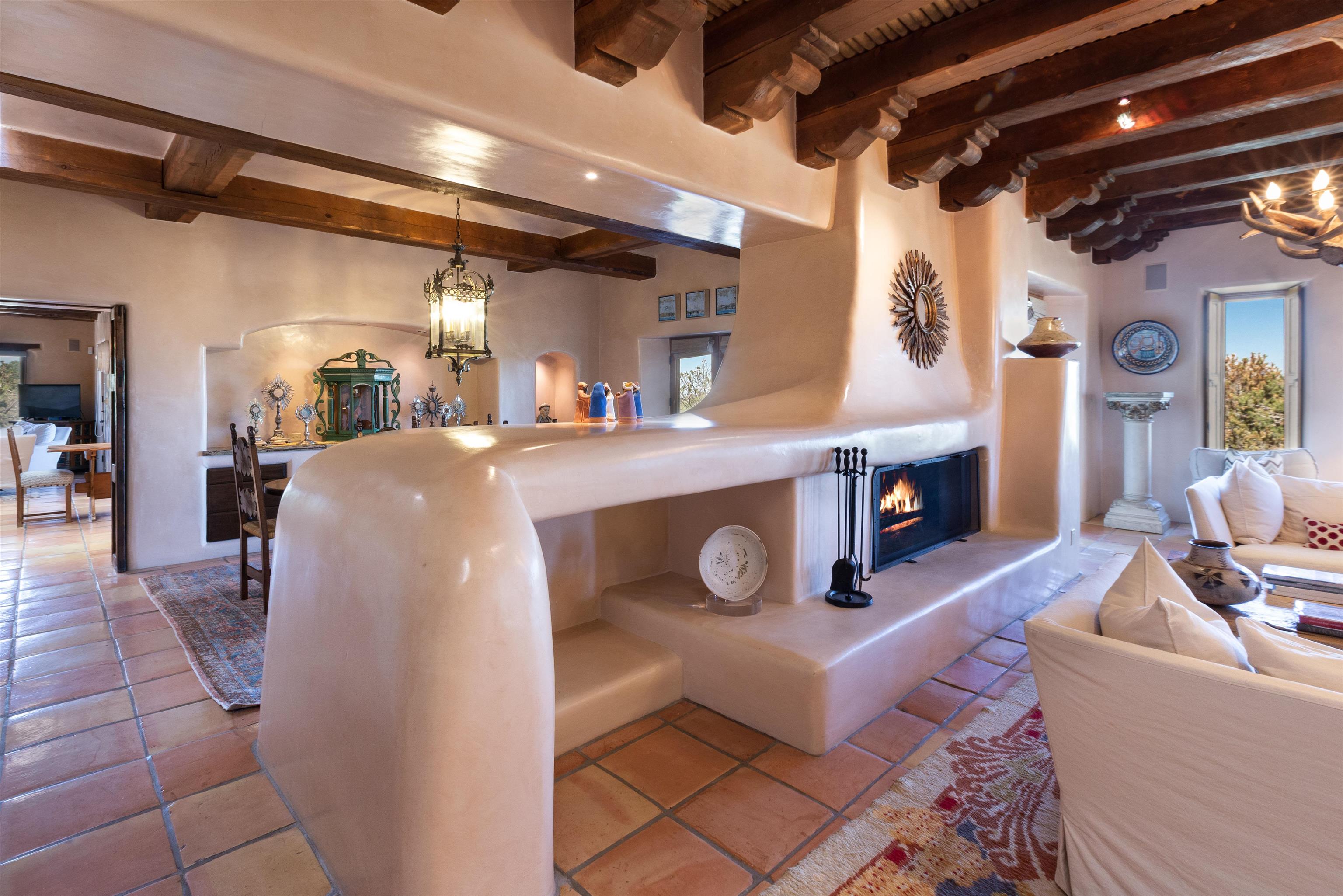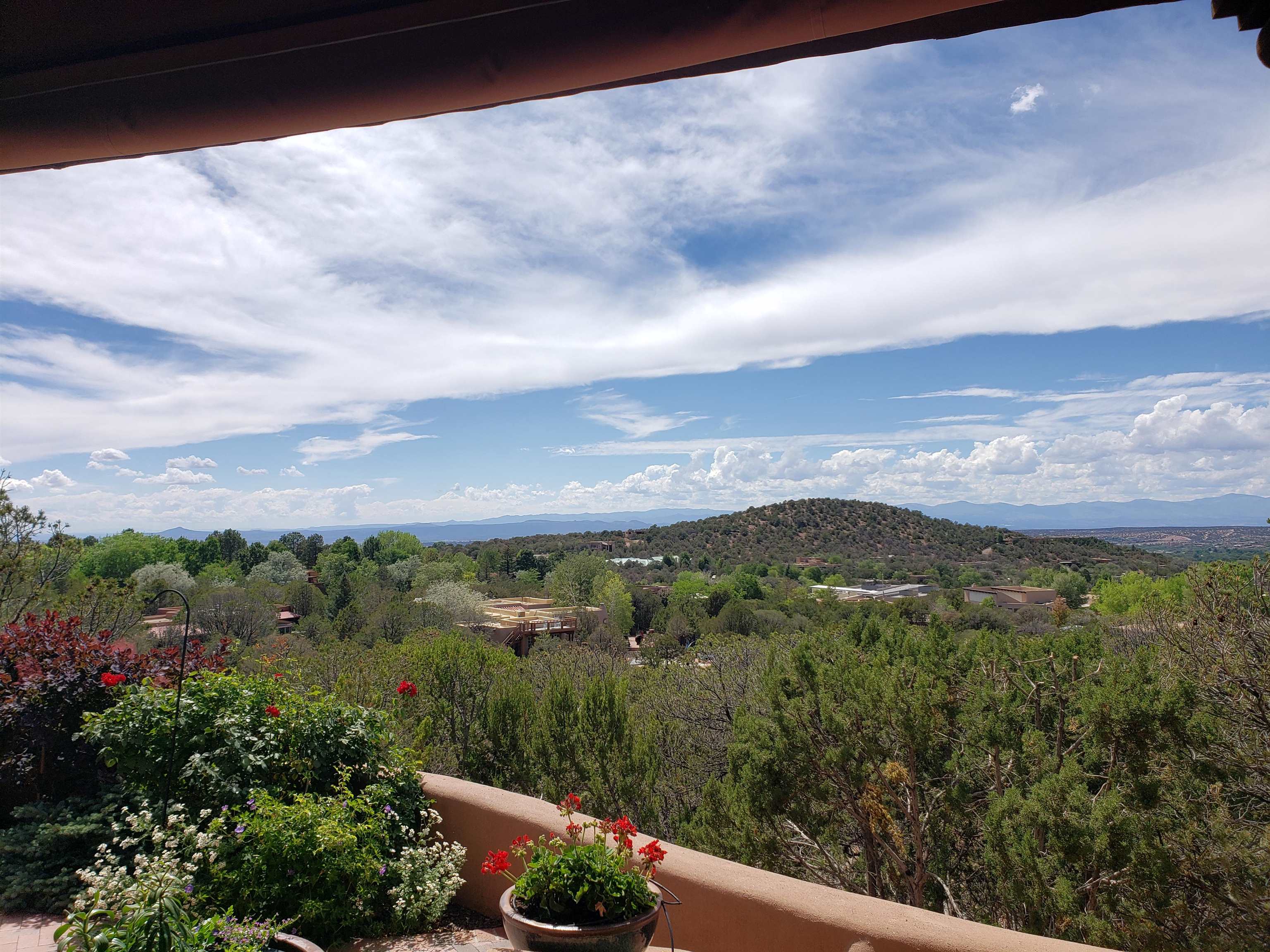 Minutes from the Plaza and above the historic Eastside this inviting home captures magnificent mountain and city light views all behind the gated sought after community of Ocaso Del Sol. Enter through a lovely gated entrance into lush Courtyard with a stream cascading through rocks and under the entry walk way. The main pueblo home has rich finishes of plaster walls, tile floors, and fabulous ceiling treatments throughout with beams, corbels & vigas. This estate exudes timeless old-world style such as the shepherd fireplace in the formal living room. The main house has a desirable floorplan with 3 bedrooms each ensuite with fireplaces offering privacy and French doors to wonderful outdoor living spaces. Live comfortably in the many lovely informal and formal rooms including an office. Enjoy the extensive West portal with custom kiva fireplace, built in bancos, built in grill and exceptional views, perfect for entertaining. Also accessed through the entry courtyard is the separate, fully appointed, one bedroom guest house. The style continues with a river rock fireplace, wood floors, kitchen and spacious bath. Off the west portal there is a studio with its own comfortable portal and separate entrance. Mature landscaping, a 3-car heated garage and so much ambiance...it's all here!