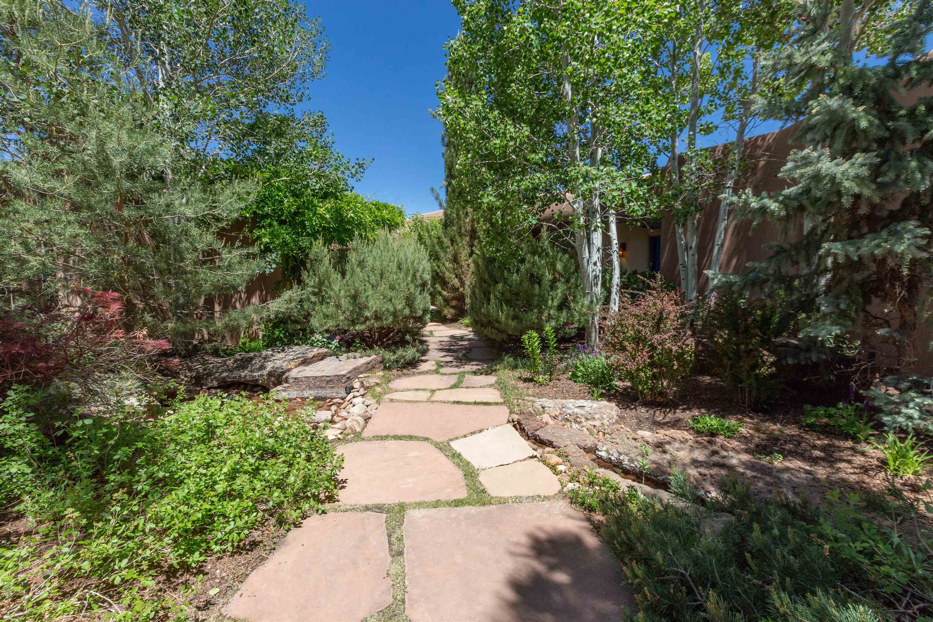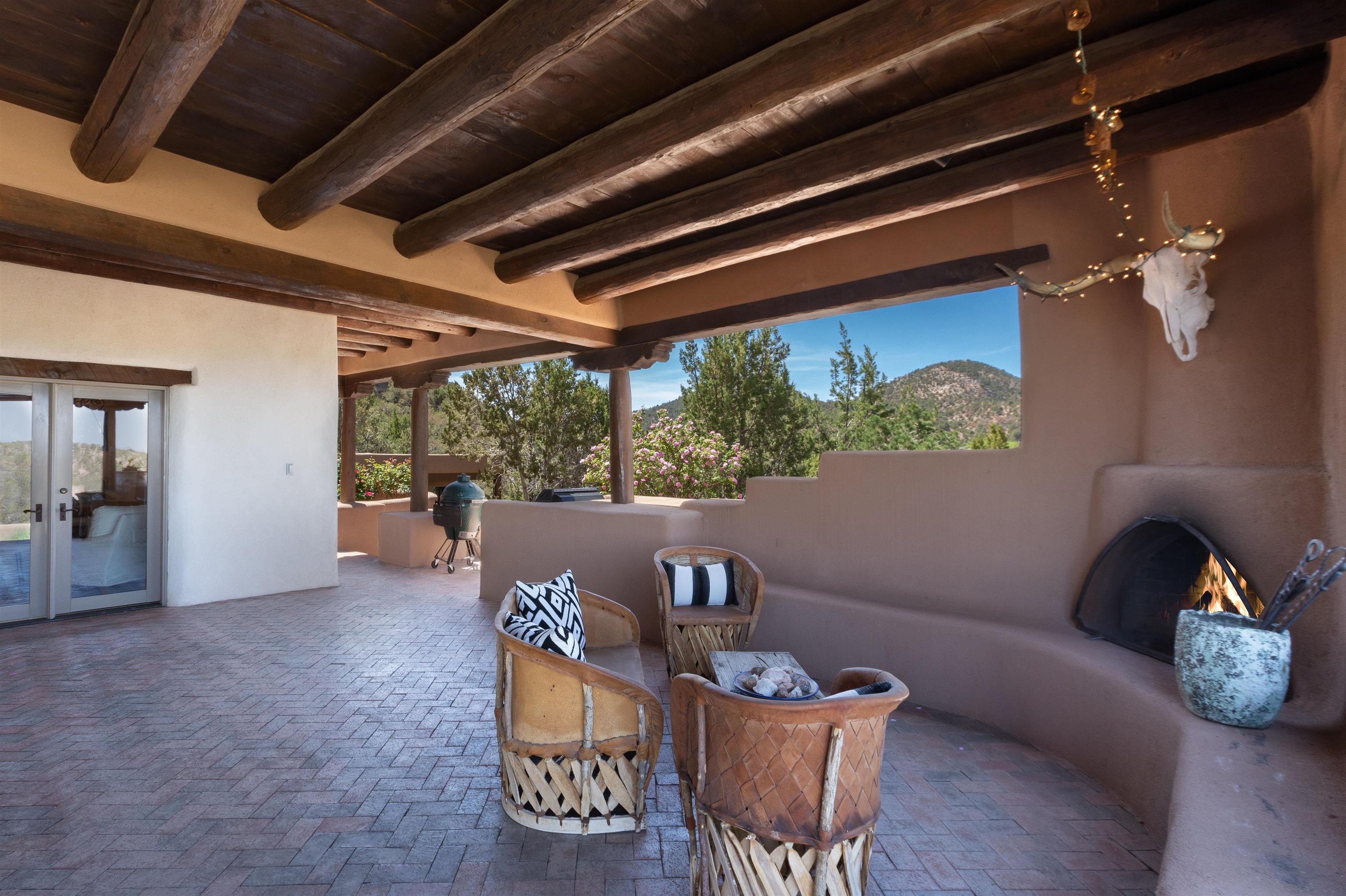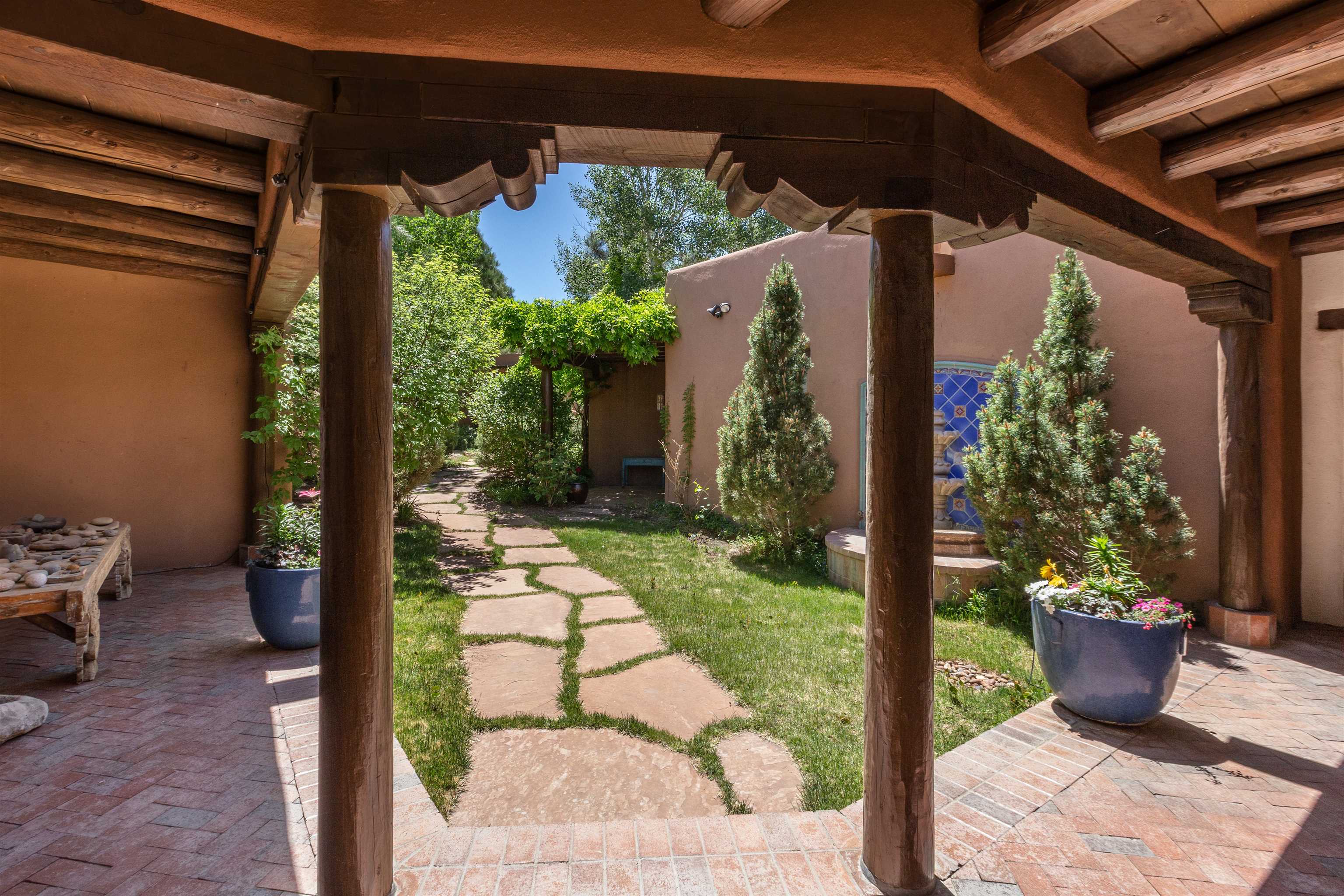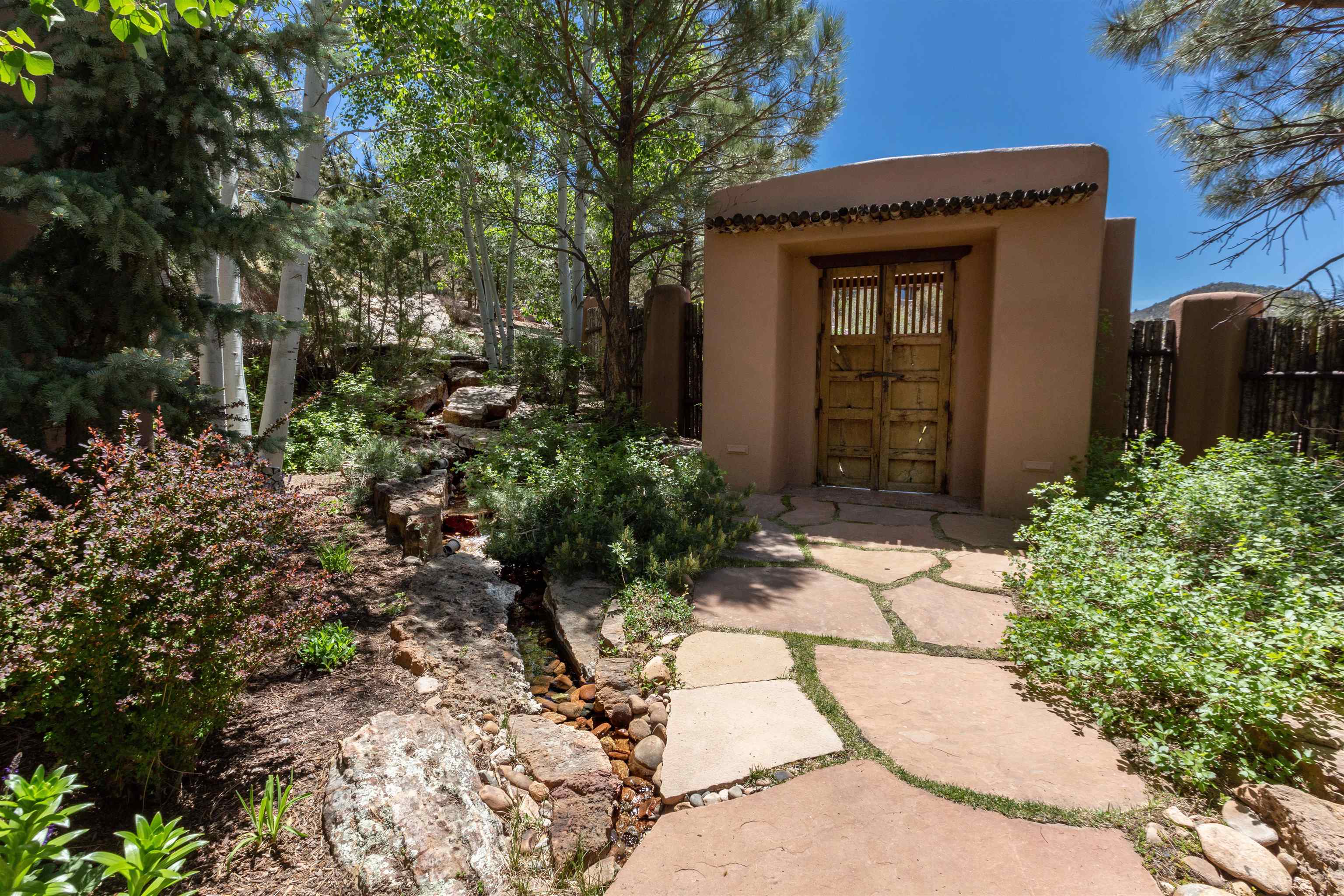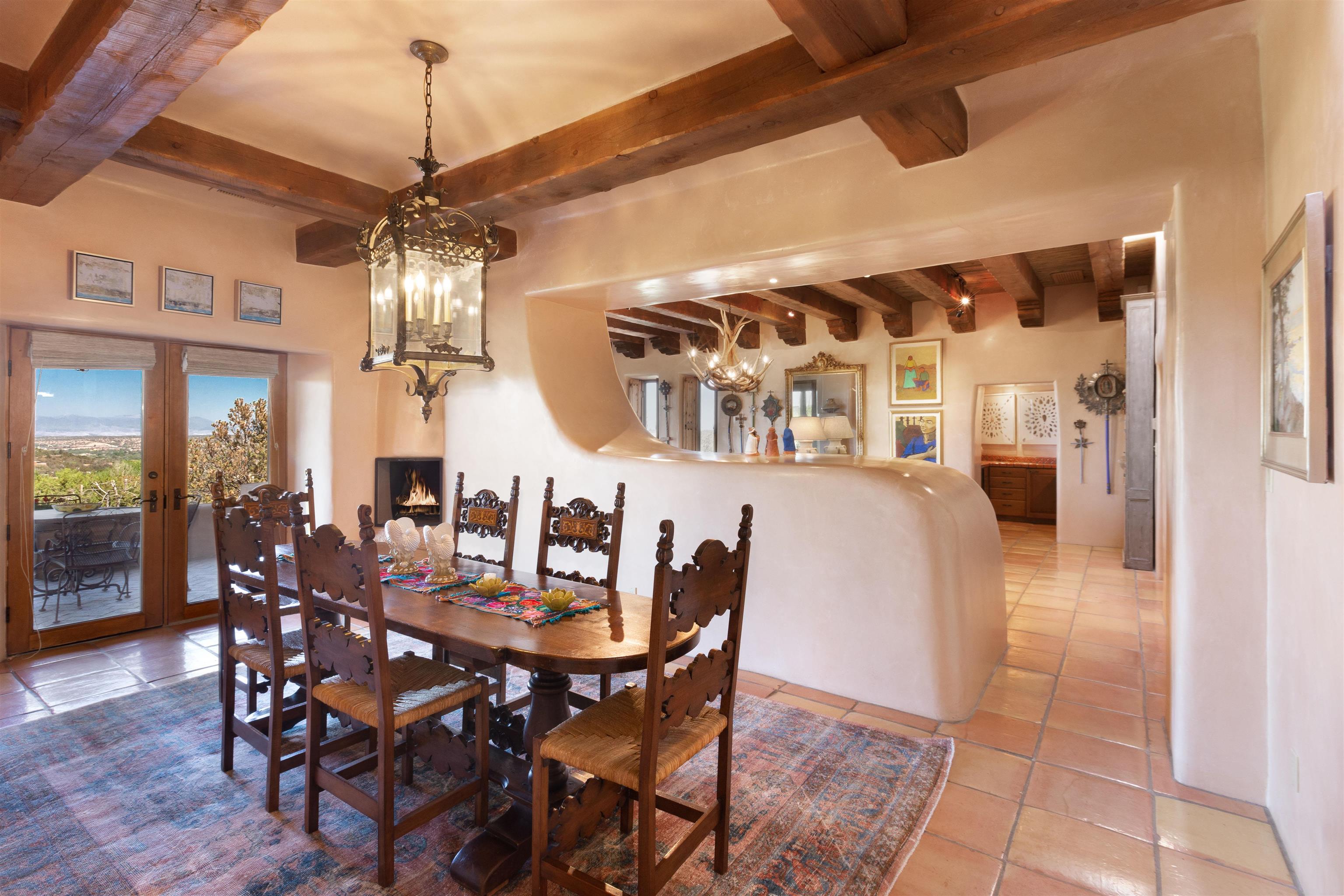 Minutes from the Plaza and above the historic Eastside this inviting home captures magnificent mountain and city light views all behind the gated sought after community of Ocaso Del Sol. Enter through a lovely gated entrance into lush Courtyard with a stream cascading through rocks and under the entry walk way. The main pueblo home has rich finishes of plaster walls, tile floors, and fabulous ceiling treatments throughout with beams, corbels & vigas. This estate exudes timeless old-world style such as the shepherd fireplace in the formal living room. The main house has a desirable floorplan with 3 bedrooms each ensuite with fireplaces offering privacy and French doors to wonderful outdoor living spaces. Live comfortably in the many lovely informal and formal rooms including an office. Enjoy the extensive West portal with custom kiva fireplace, built in bancos, built in grill and exceptional views, perfect for entertaining. Also accessed through the entry courtyard is the separate, fully appointed, one bedroom guest house. The style continues with a river rock fireplace, wood floors, kitchen and spacious bath. Off the west portal there is a studio with its own comfortable portal and separate entrance. Mature landscaping, a 3-car heated garage and so much ambiance...it's all here!