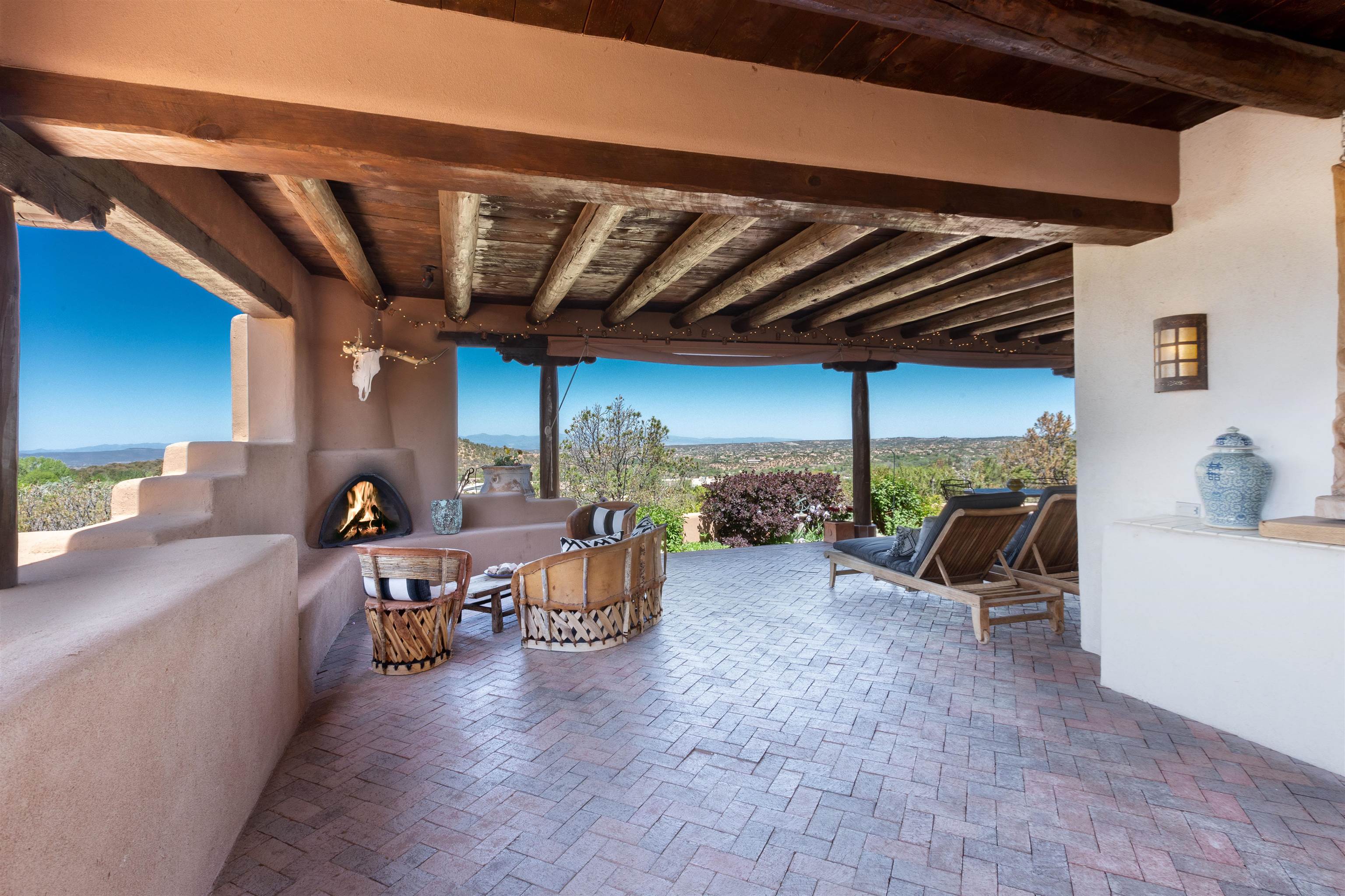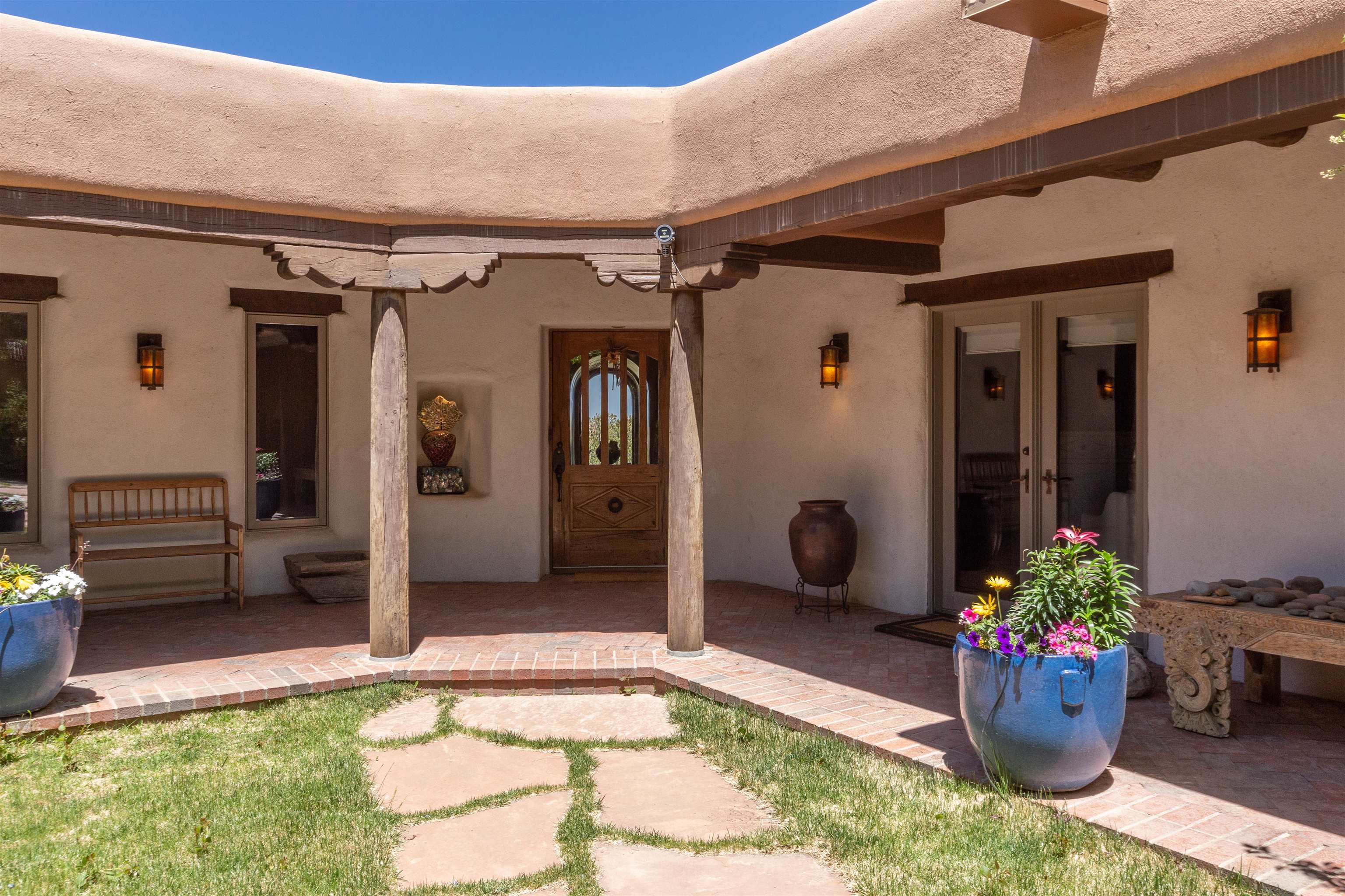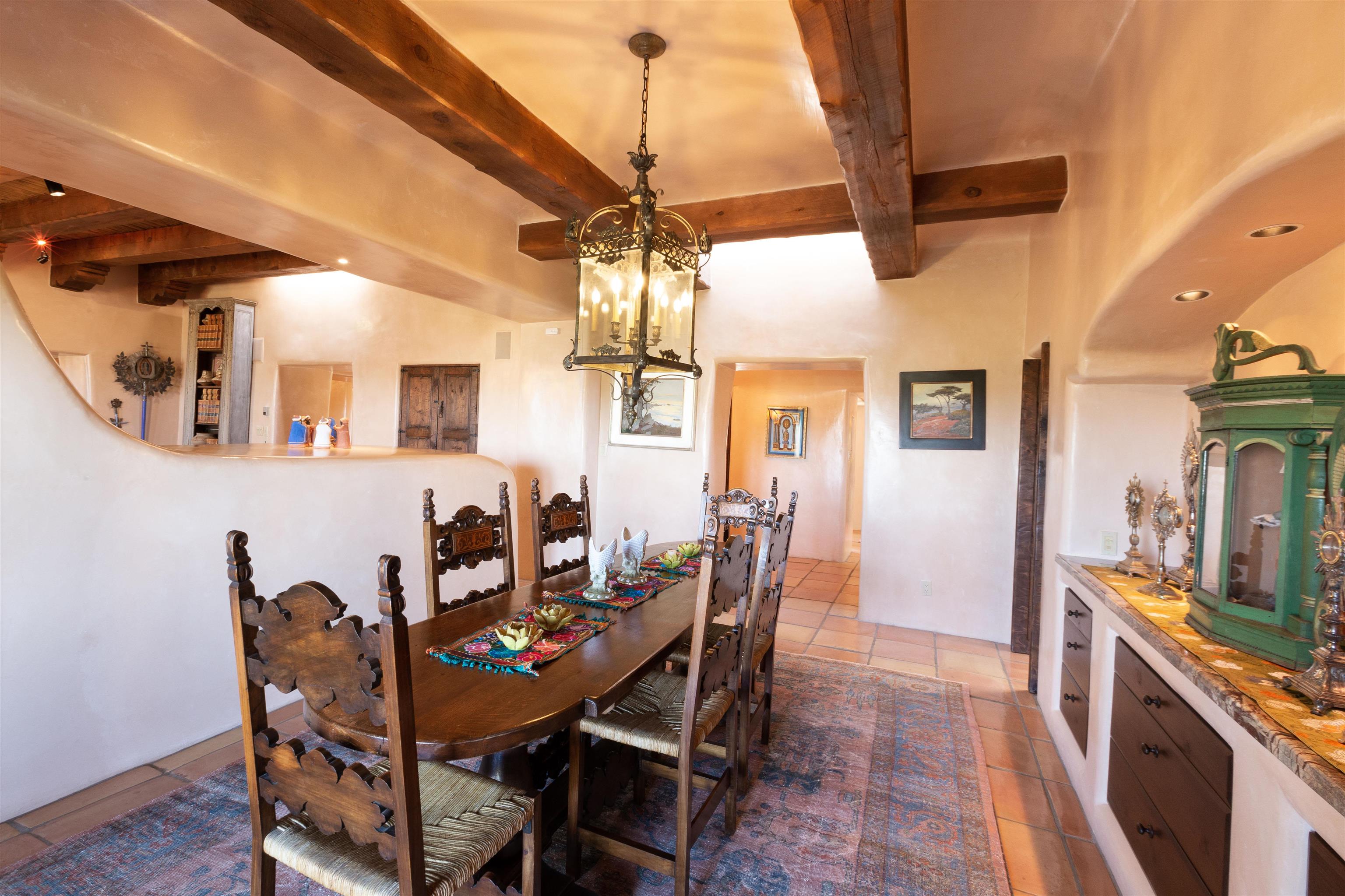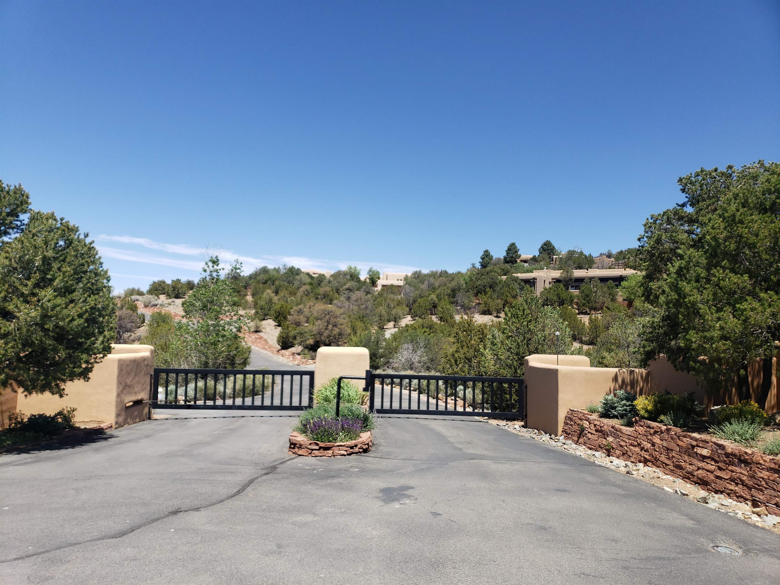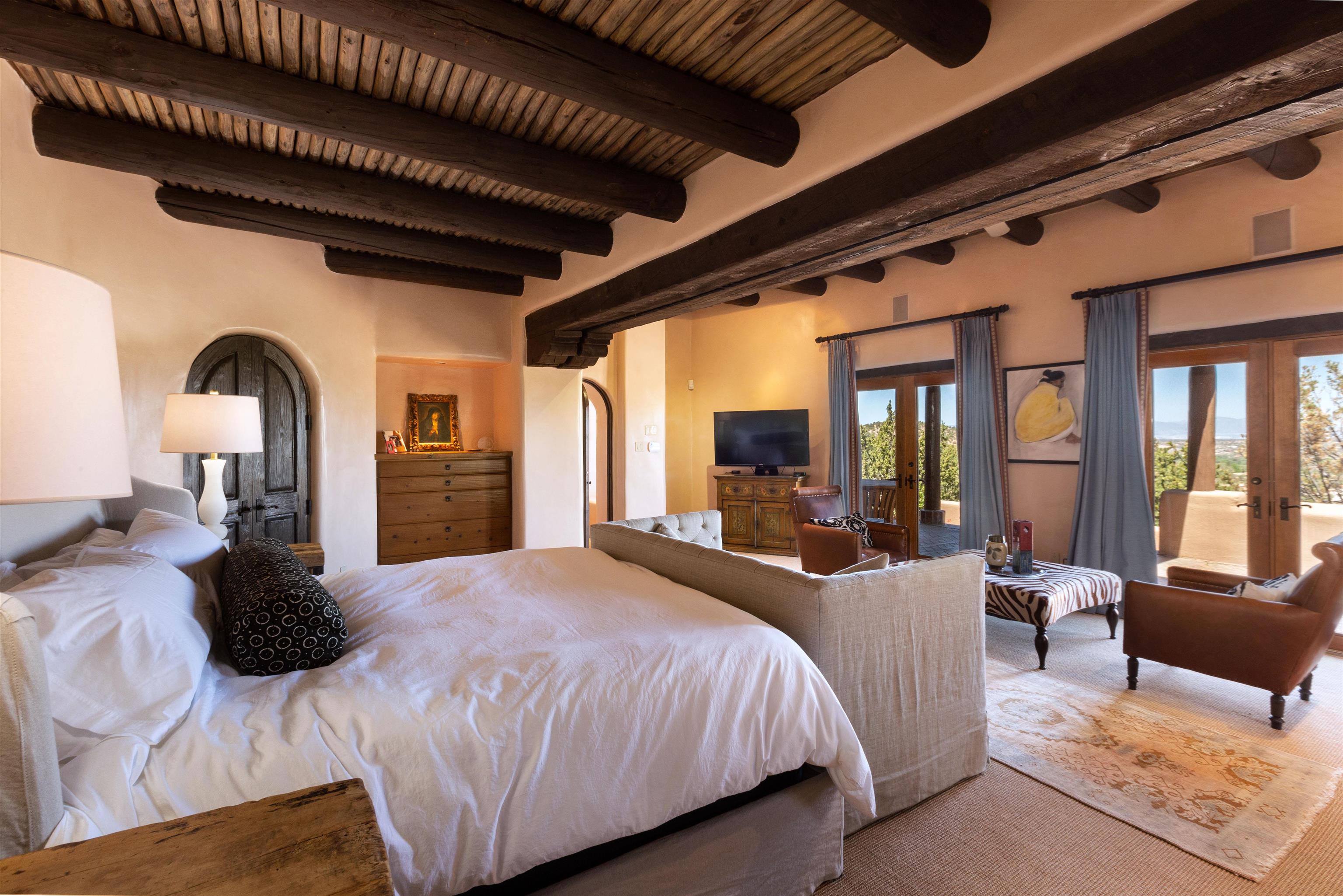Minutes from the Plaza and above the historic Eastside this inviting home captures magnificent mountain and city light views all behind the gated sought after community of Ocaso Del Sol. Enter through a lovely gated entrance into lush Courtyard with a stream cascading through rocks and under the entry walk way. The main pueblo home has rich finishes of plaster walls, tile floors, and fabulous ceiling treatments throughout with beams, corbels & vigas. This estate exudes timeless old-world style such as the shepherd fireplace in the formal living room. The main house has a desirable floorplan with 3 bedrooms each ensuite with fireplaces offering privacy and French doors to wonderful outdoor living spaces. Live comfortably in the many lovely informal and formal rooms including an office. Enjoy the extensive West portal with custom kiva fireplace, built in bancos, built in grill and exceptional views, perfect for entertaining. Also accessed through the entry courtyard is the separate, fully appointed, one bedroom guest house. The style continues with a river rock fireplace, wood floors, kitchen and spacious bath. Off the west portal there is a studio with its own comfortable portal and separate entrance. Mature landscaping, a 3-car heated garage and so much ambiance...it's all here!