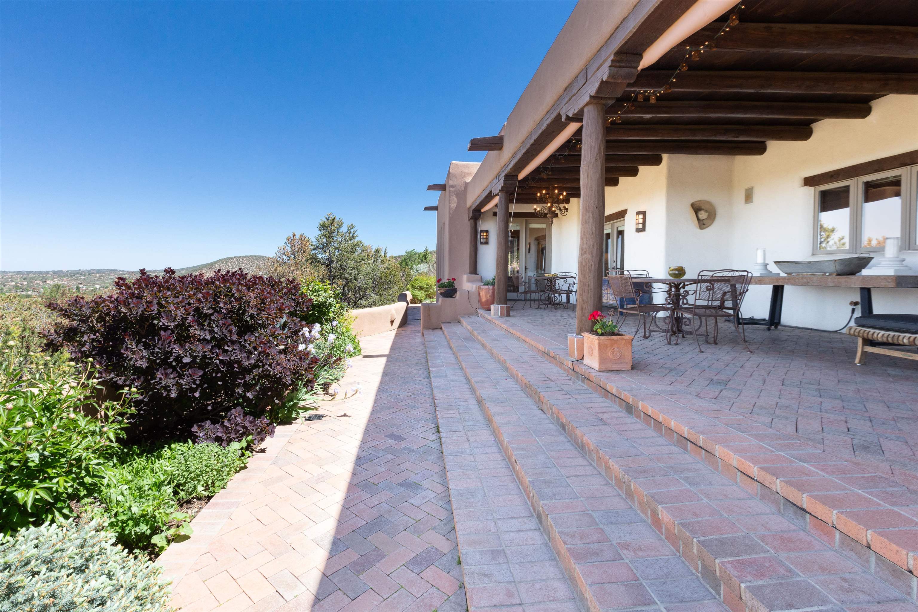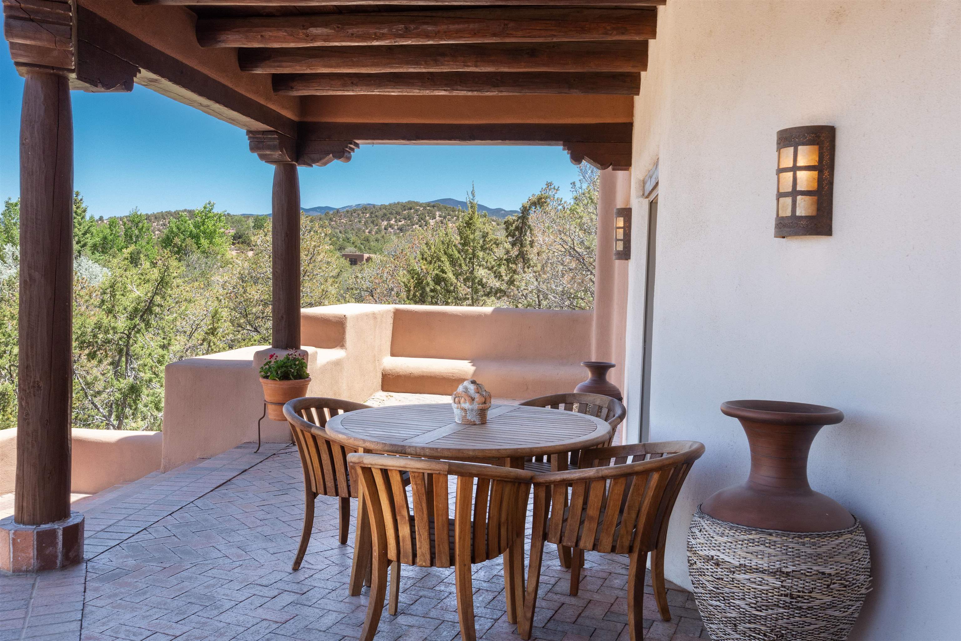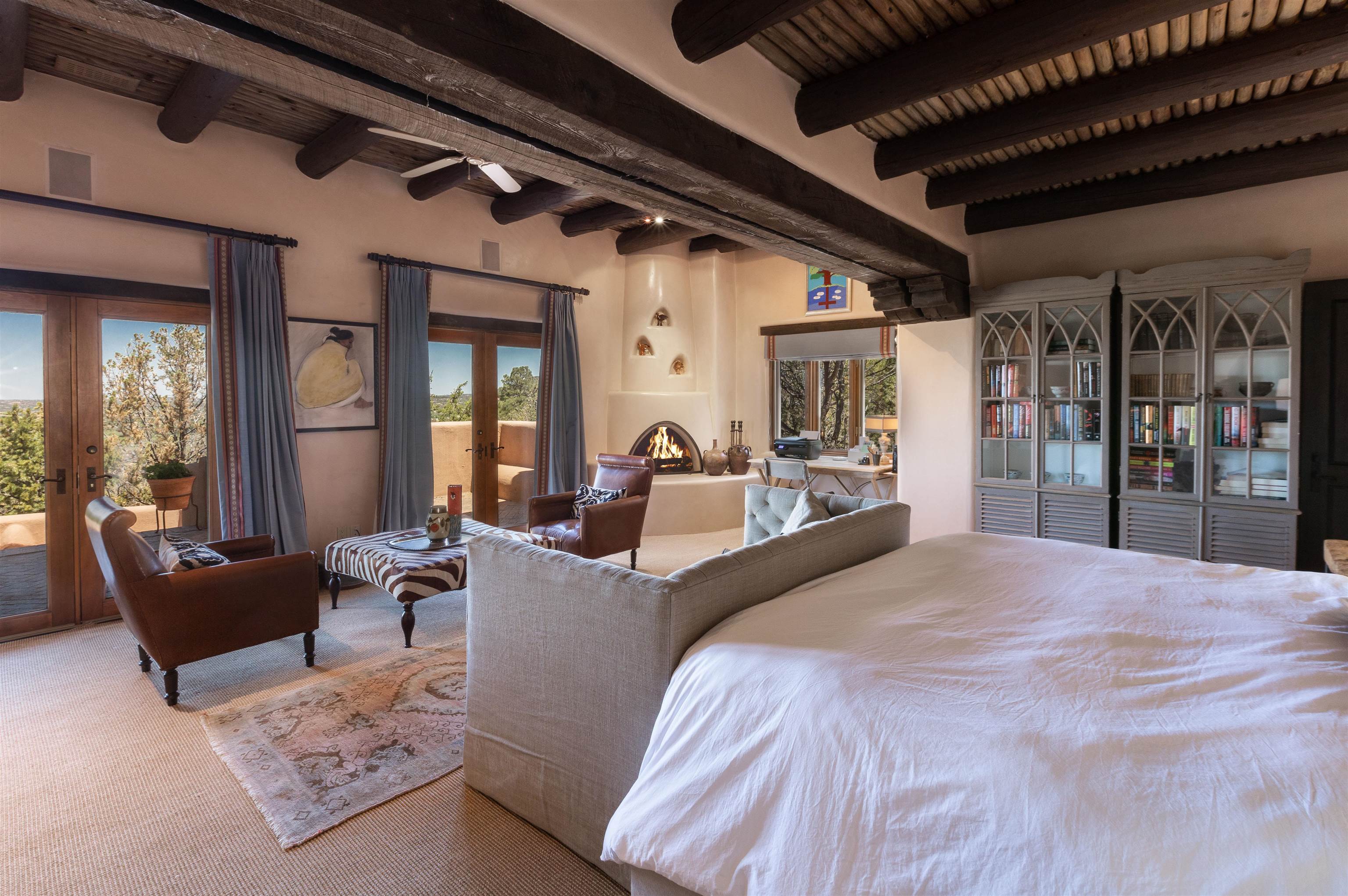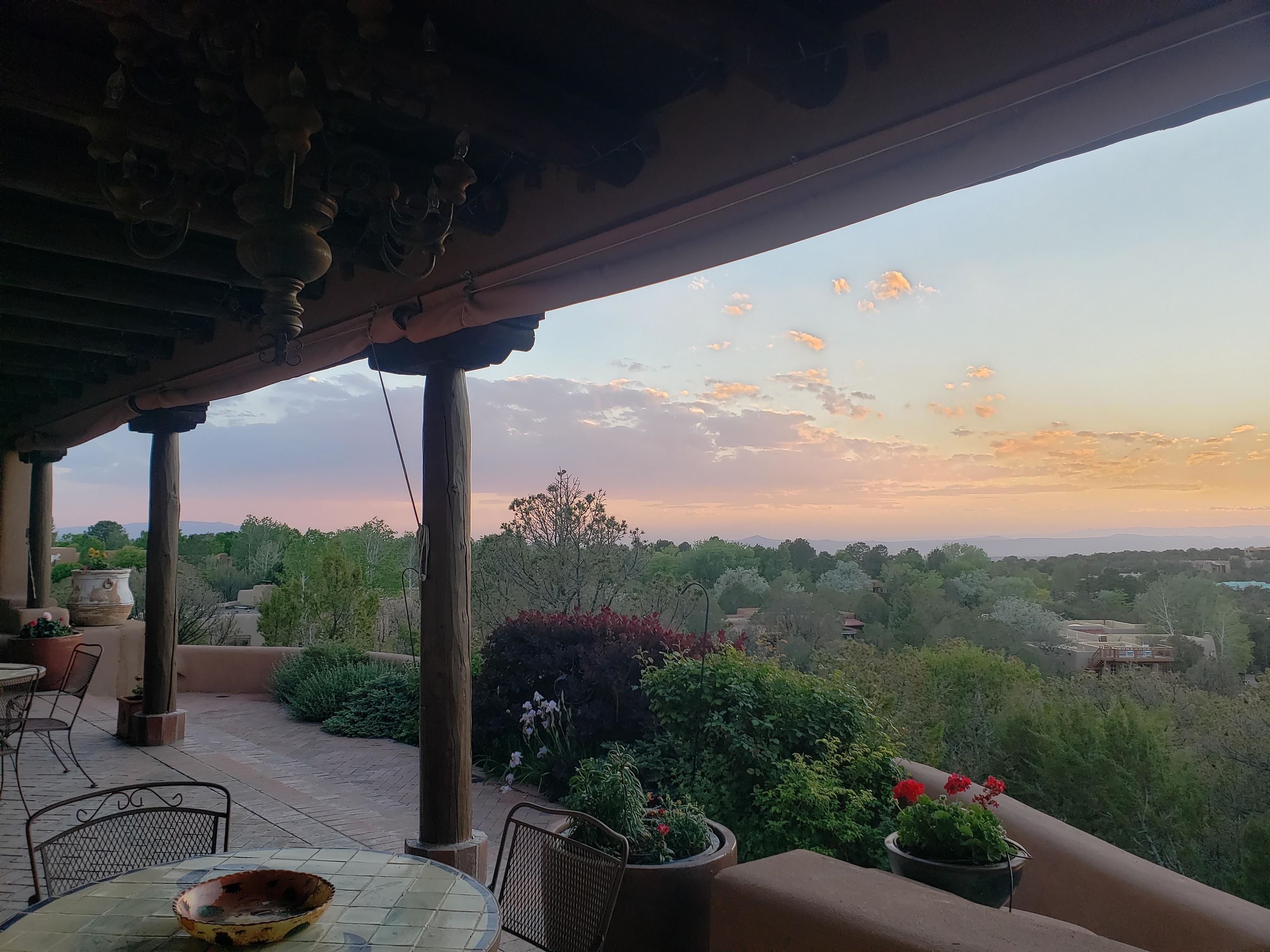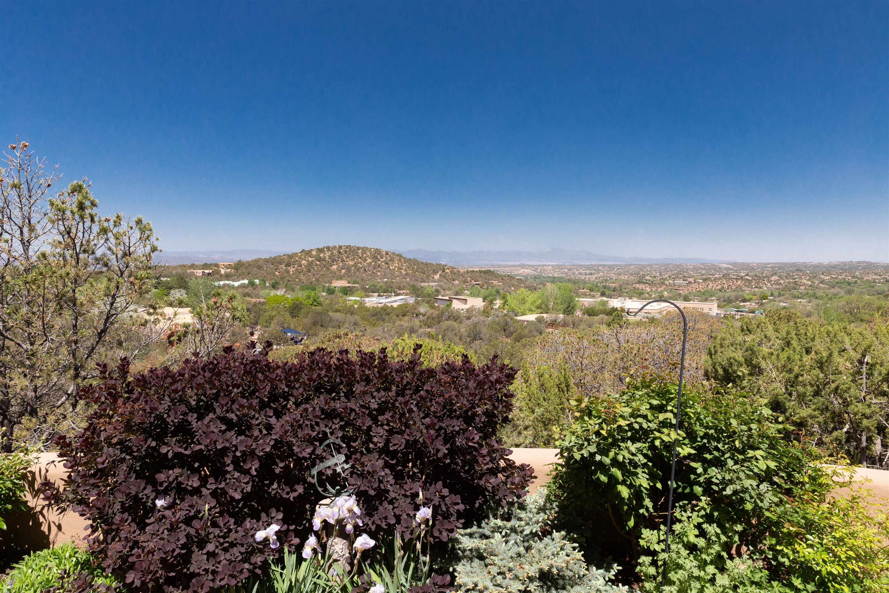 Minutes from the Plaza and above the historic Eastside this inviting home captures magnificent mountain and city light views all behind the gated sought after community of Ocaso Del Sol. Enter through a lovely gated entrance into lush Courtyard with a stream cascading through rocks and under the entry walk way. The main pueblo home has rich finishes of plaster walls, tile floors, and fabulous ceiling treatments throughout with beams, corbels & vigas. This estate exudes timeless old-world style such as the shepherd fireplace in the formal living room. The main house has a desirable floorplan with 3 bedrooms each ensuite with fireplaces offering privacy and French doors to wonderful outdoor living spaces. Live comfortably in the many lovely informal and formal rooms including an office. Enjoy the extensive West portal with custom kiva fireplace, built in bancos, built in grill and exceptional views, perfect for entertaining. Also accessed through the entry courtyard is the separate, fully appointed, one bedroom guest house. The style continues with a river rock fireplace, wood floors, kitchen and spacious bath. Off the west portal there is a studio with its own comfortable portal and separate entrance. Mature landscaping, a 3-car heated garage and so much ambiance...it's all here!