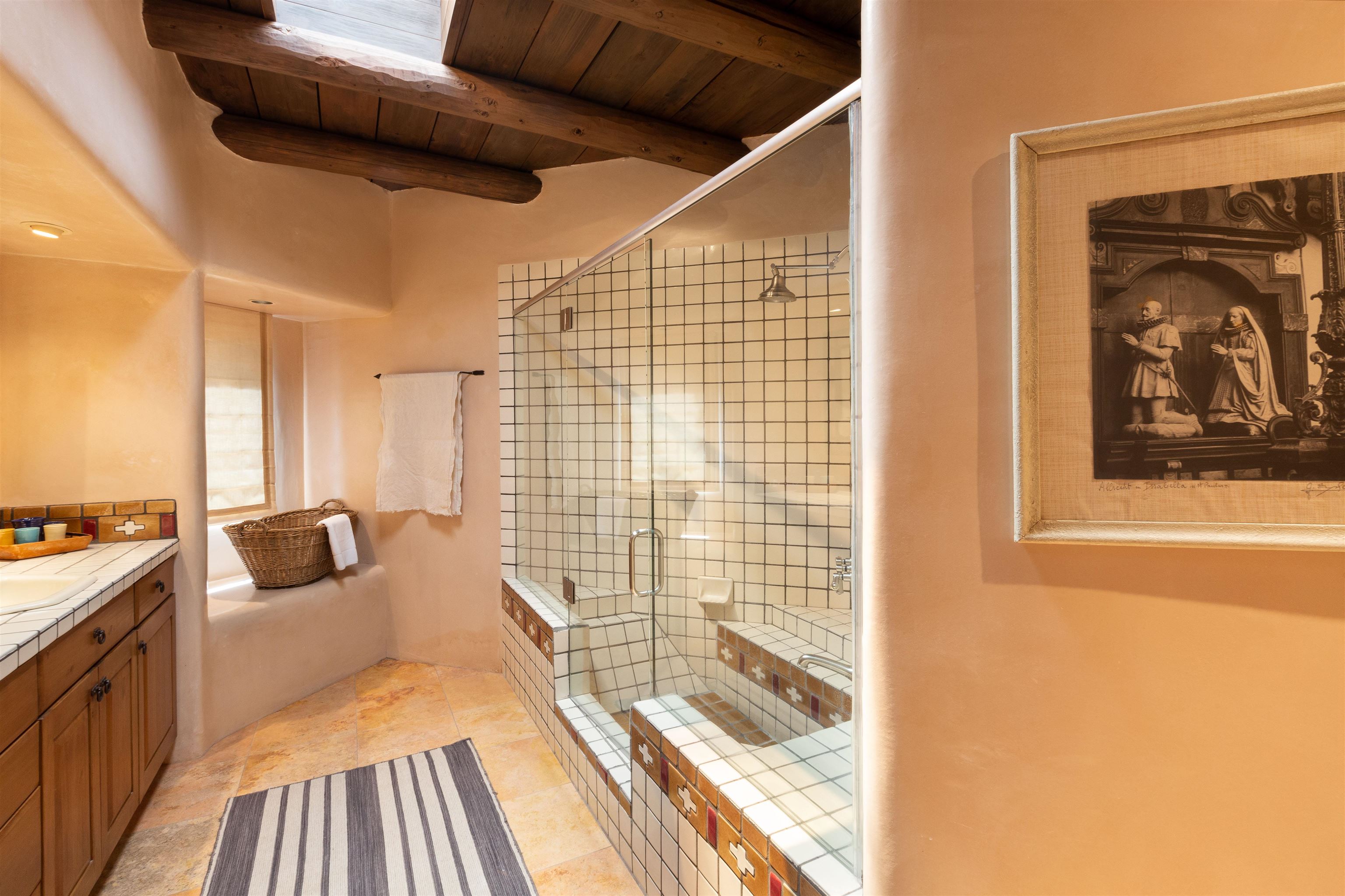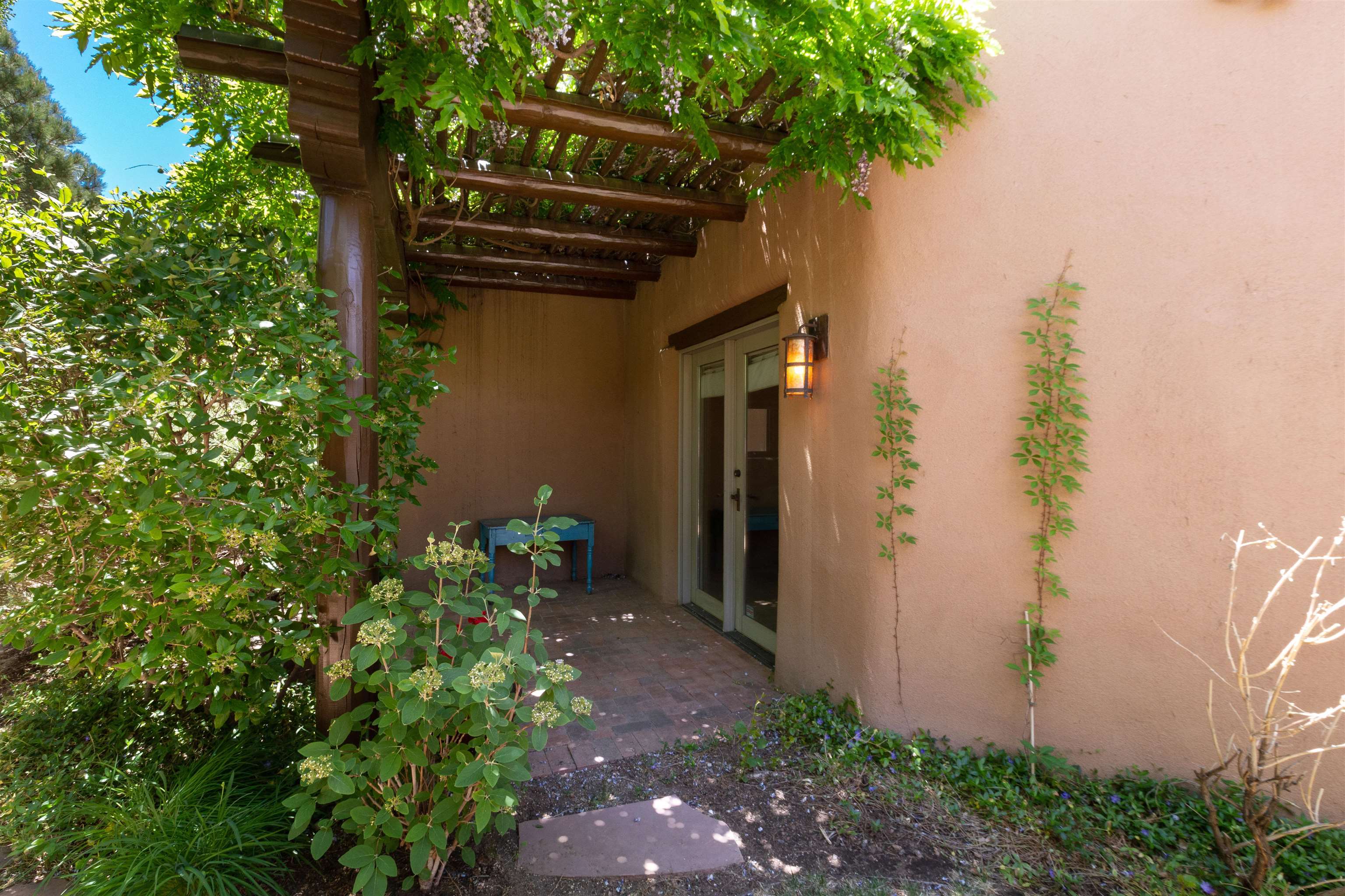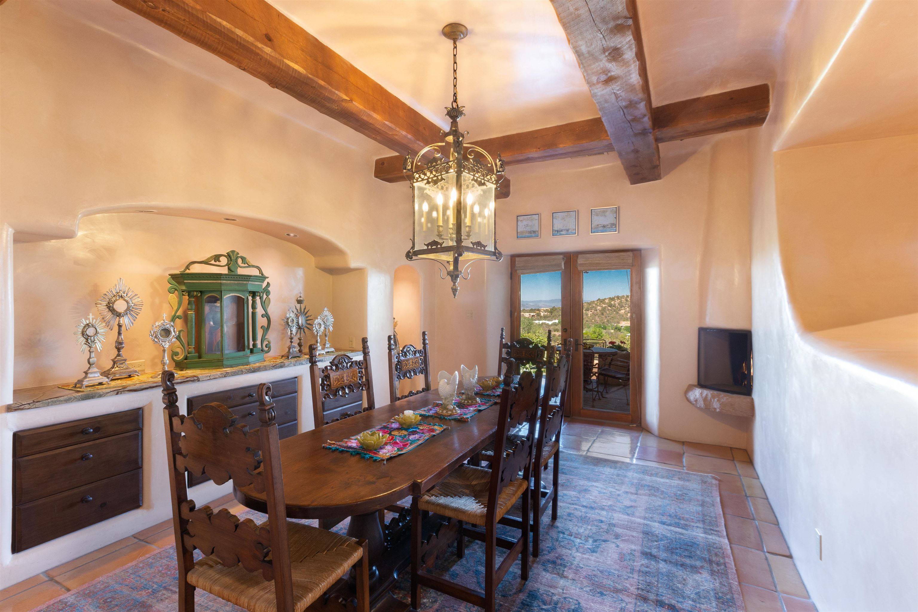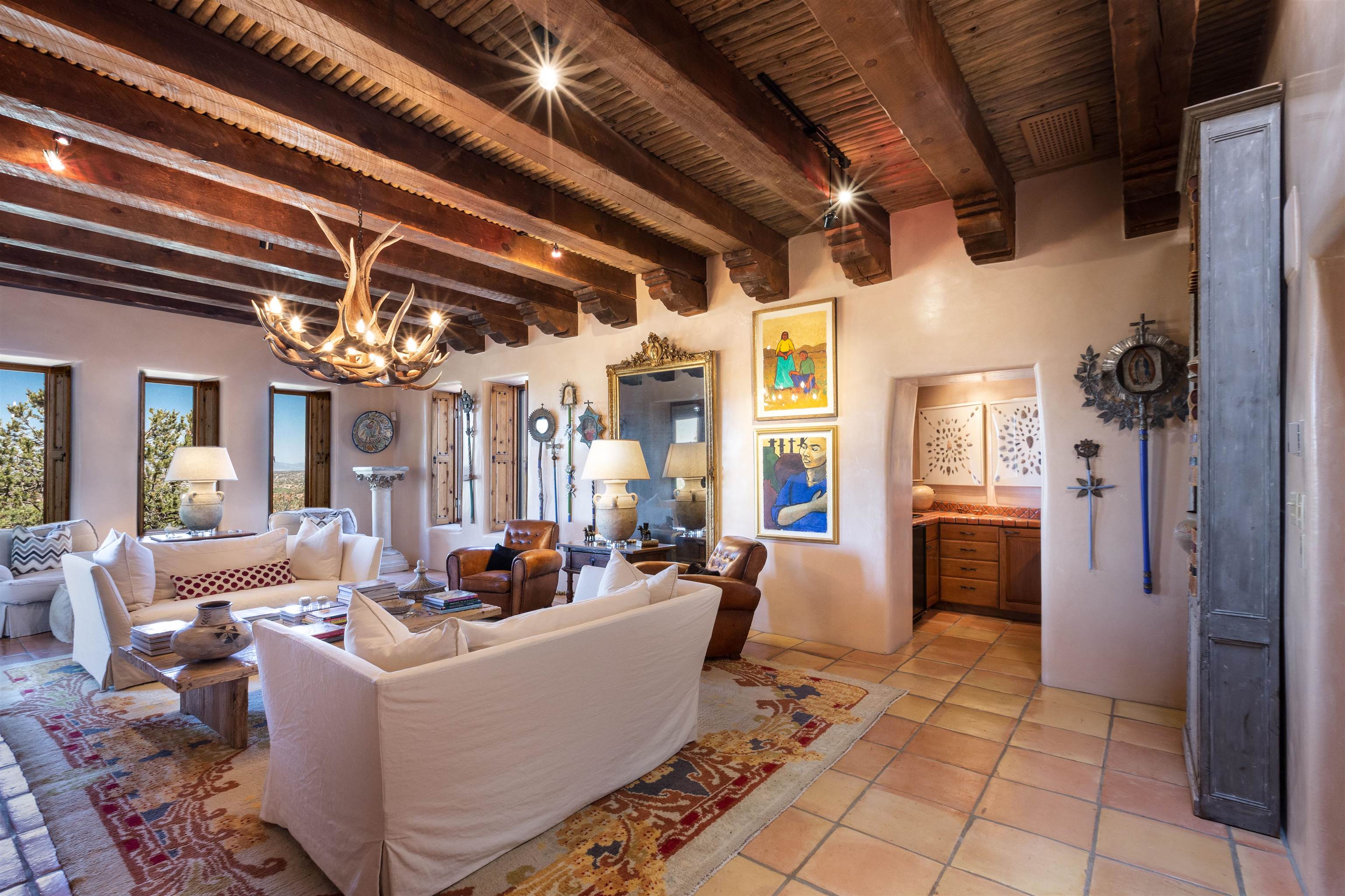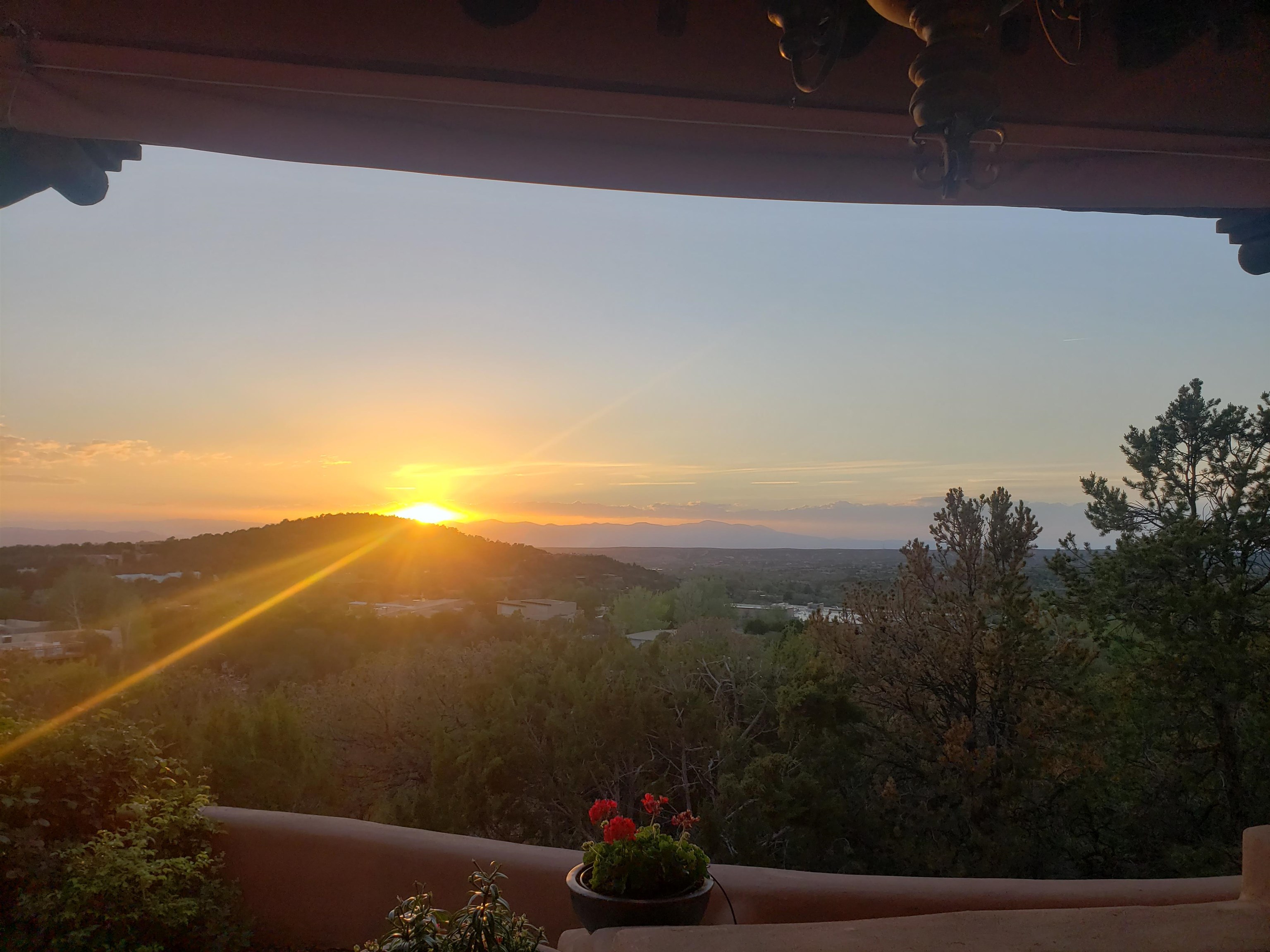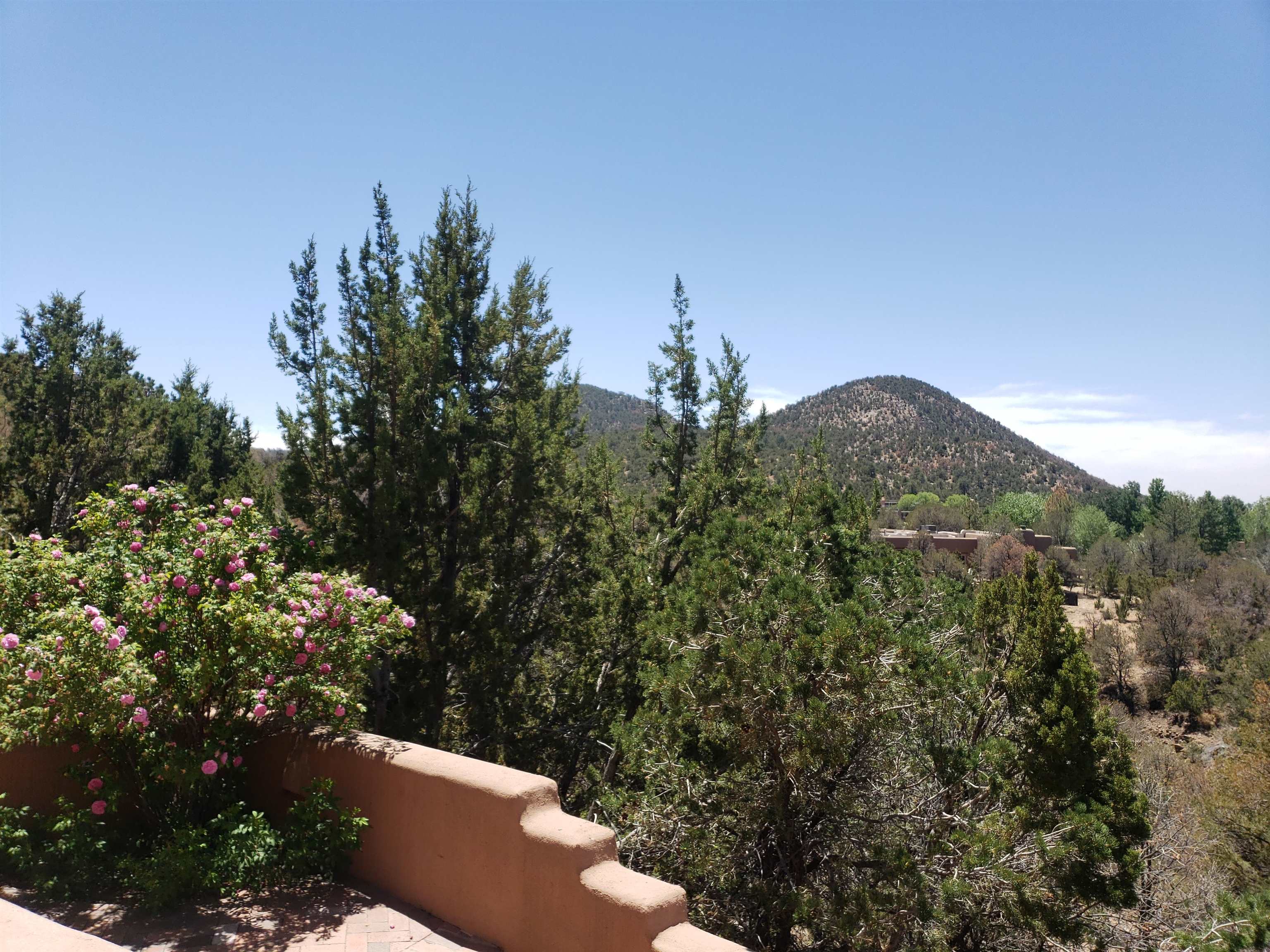 Minutes from the Plaza and above the historic Eastside this inviting home captures magnificent mountain and city light views all behind the gated sought after community of Ocaso Del Sol. Enter through a lovely gated entrance into lush Courtyard with a stream cascading through rocks and under the entry walk way. The main pueblo home has rich finishes of plaster walls, tile floors, and fabulous ceiling treatments throughout with beams, corbels & vigas. This estate exudes timeless old-world style such as the shepherd fireplace in the formal living room. The main house has a desirable floorplan with 3 bedrooms each ensuite with fireplaces offering privacy and French doors to wonderful outdoor living spaces. Live comfortably in the many lovely informal and formal rooms including an office. Enjoy the extensive West portal with custom kiva fireplace, built in bancos, built in grill and exceptional views, perfect for entertaining. Also accessed through the entry courtyard is the separate, fully appointed, one bedroom guest house. The style continues with a river rock fireplace, wood floors, kitchen and spacious bath. Off the west portal there is a studio with its own comfortable portal and separate entrance. Mature landscaping, a 3-car heated garage and so much ambiance...it's all here!