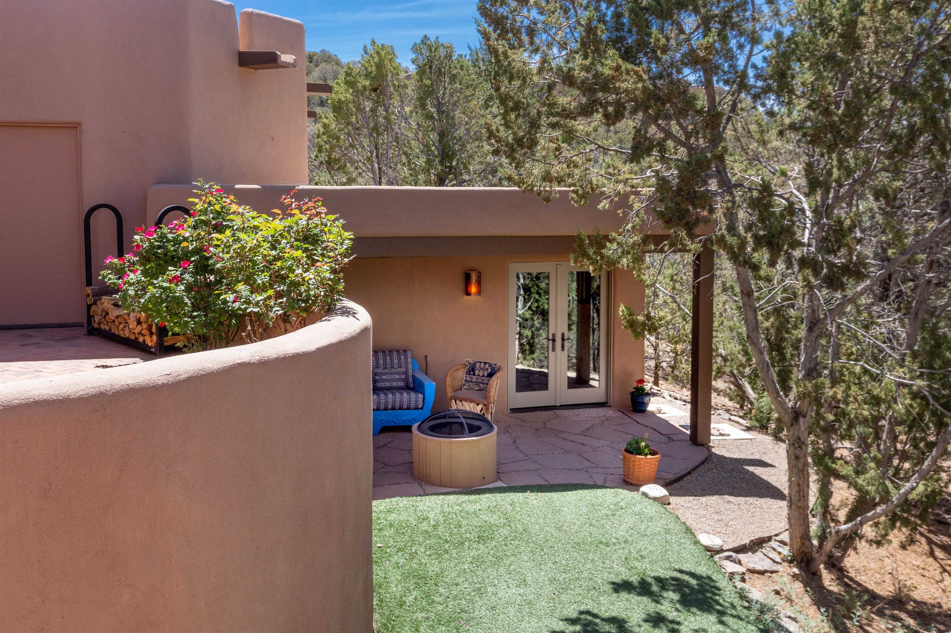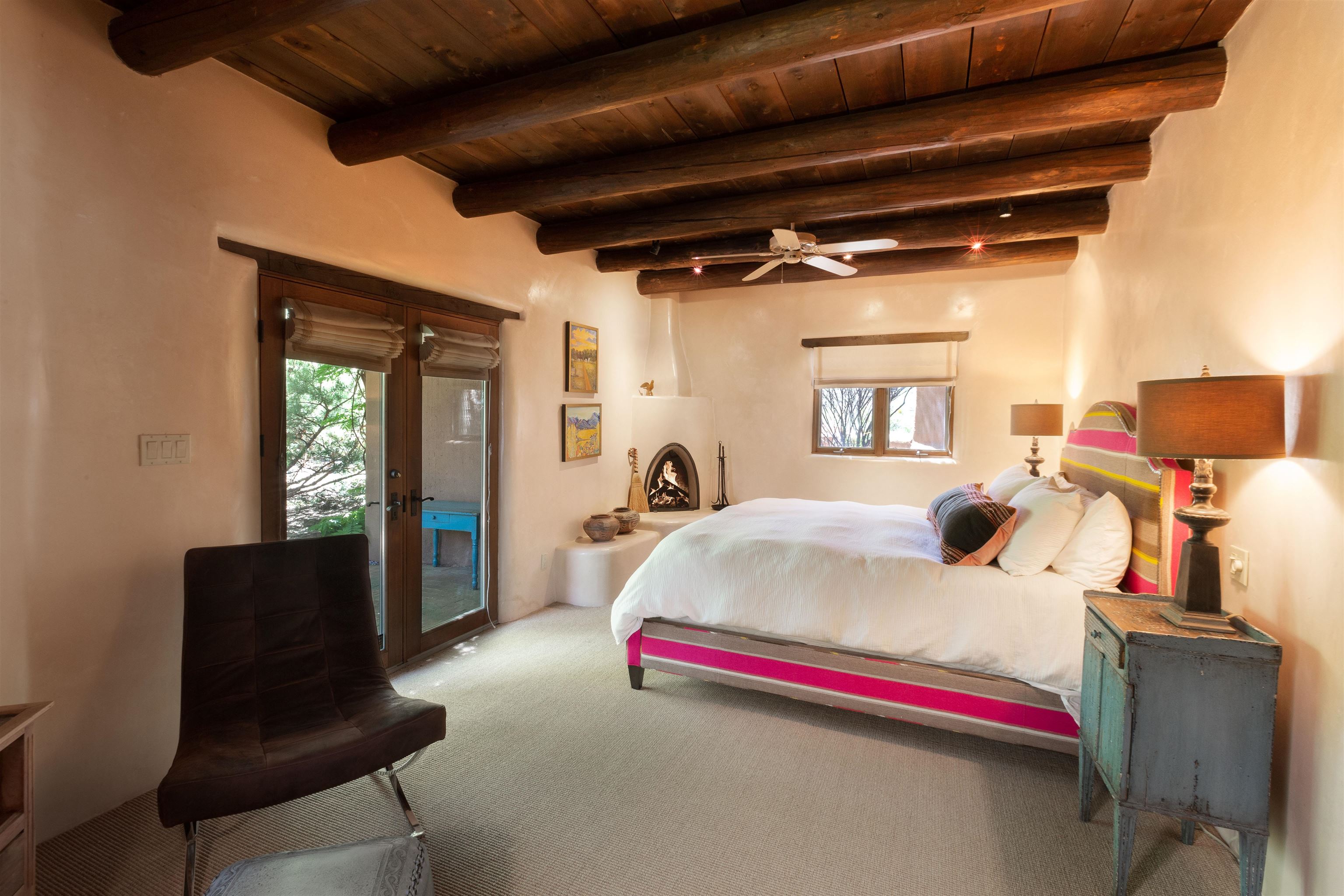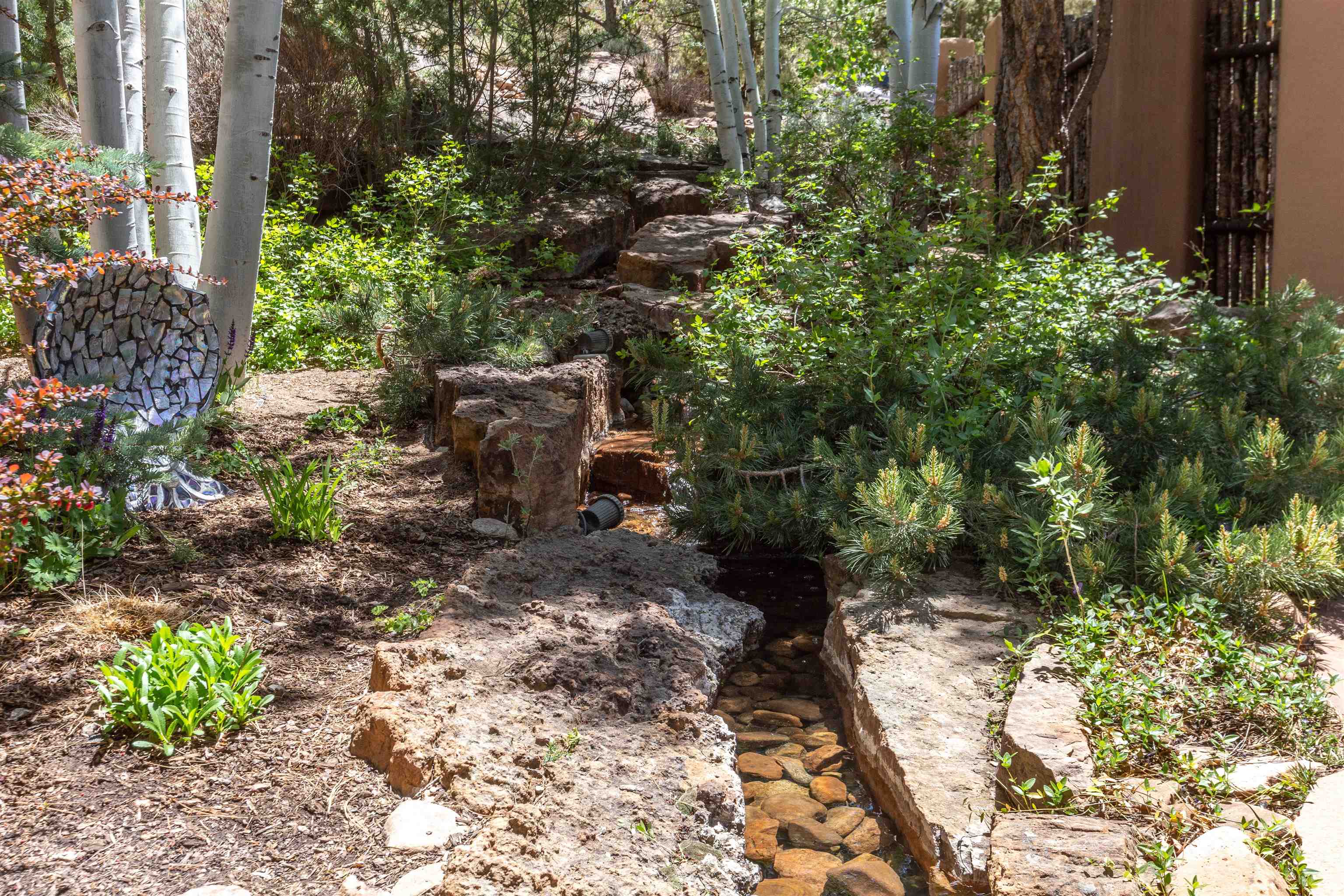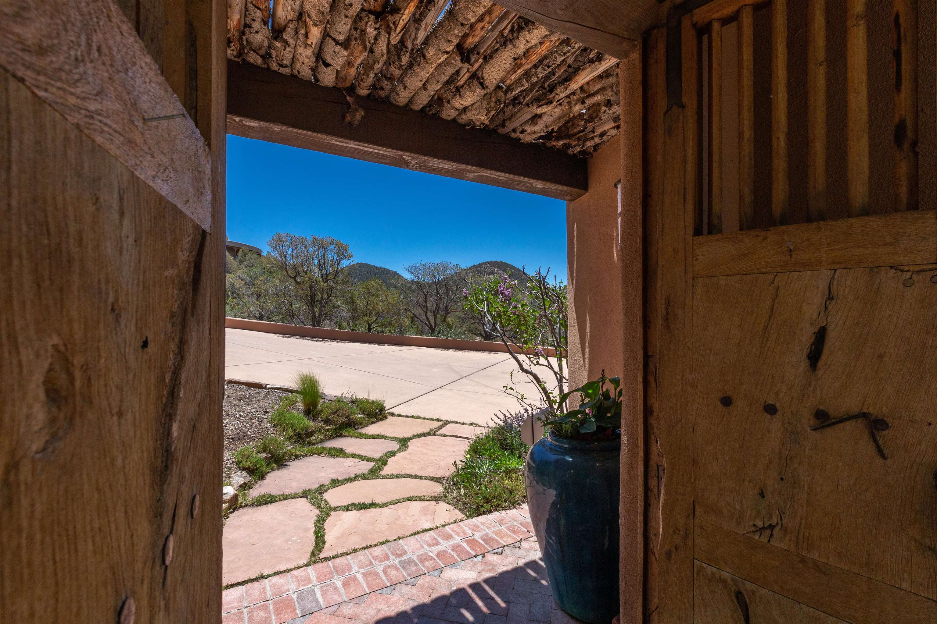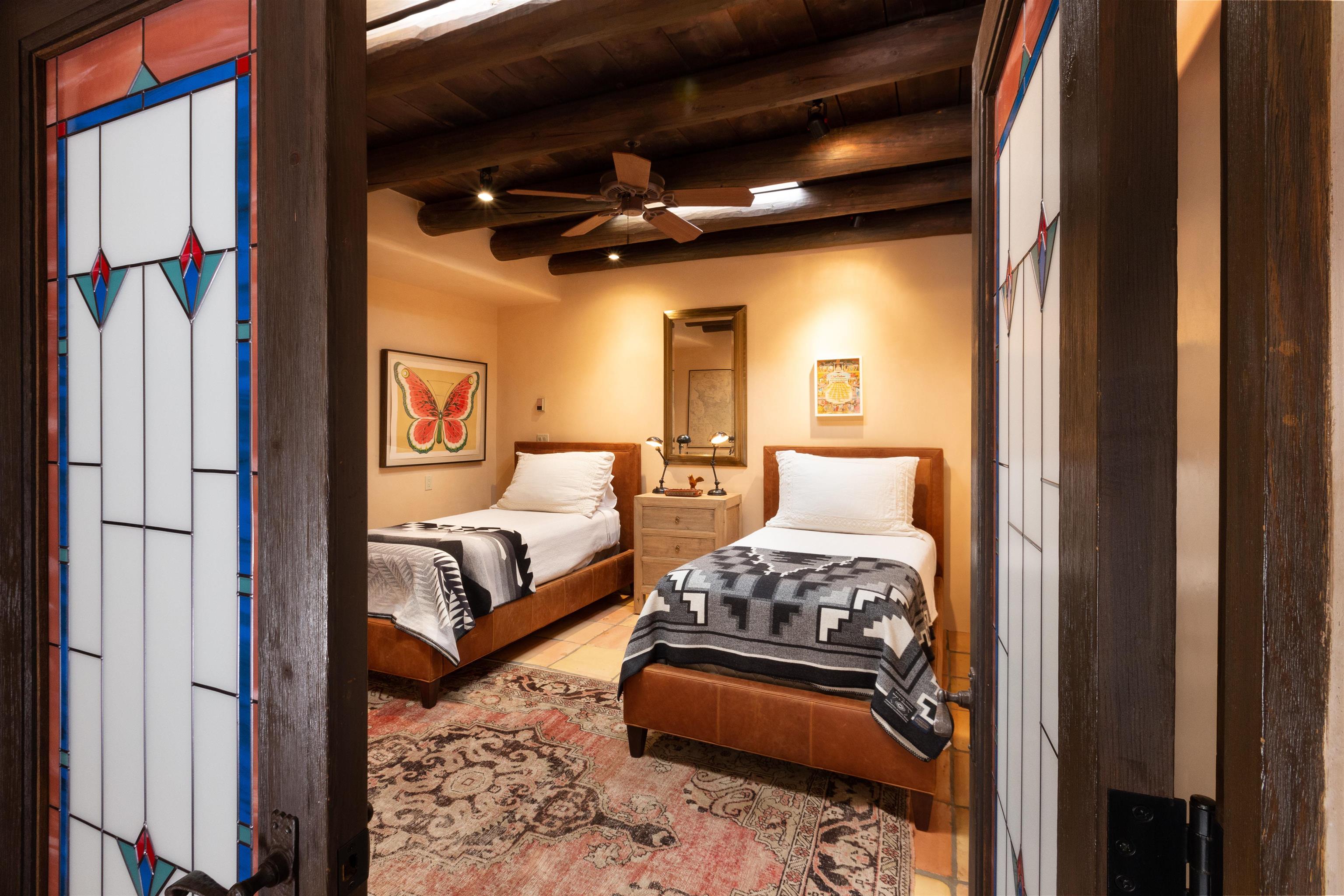 Minutes from the Plaza and above the historic Eastside this inviting home captures magnificent mountain and city light views all behind the gated sought after community of Ocaso Del Sol. Enter through a lovely gated entrance into lush Courtyard with a stream cascading through rocks and under the entry walk way. The main pueblo home has rich finishes of plaster walls, tile floors, and fabulous ceiling treatments throughout with beams, corbels & vigas. This estate exudes timeless old-world style such as the shepherd fireplace in the formal living room. The main house has a desirable floorplan with 3 bedrooms each ensuite with fireplaces offering privacy and French doors to wonderful outdoor living spaces. Live comfortably in the many lovely informal and formal rooms including an office. Enjoy the extensive West portal with custom kiva fireplace, built in bancos, built in grill and exceptional views, perfect for entertaining. Also accessed through the entry courtyard is the separate, fully appointed, one bedroom guest house. The style continues with a river rock fireplace, wood floors, kitchen and spacious bath. Off the west portal there is a studio with its own comfortable portal and separate entrance. Mature landscaping, a 3-car heated garage and so much ambiance...it's all here!