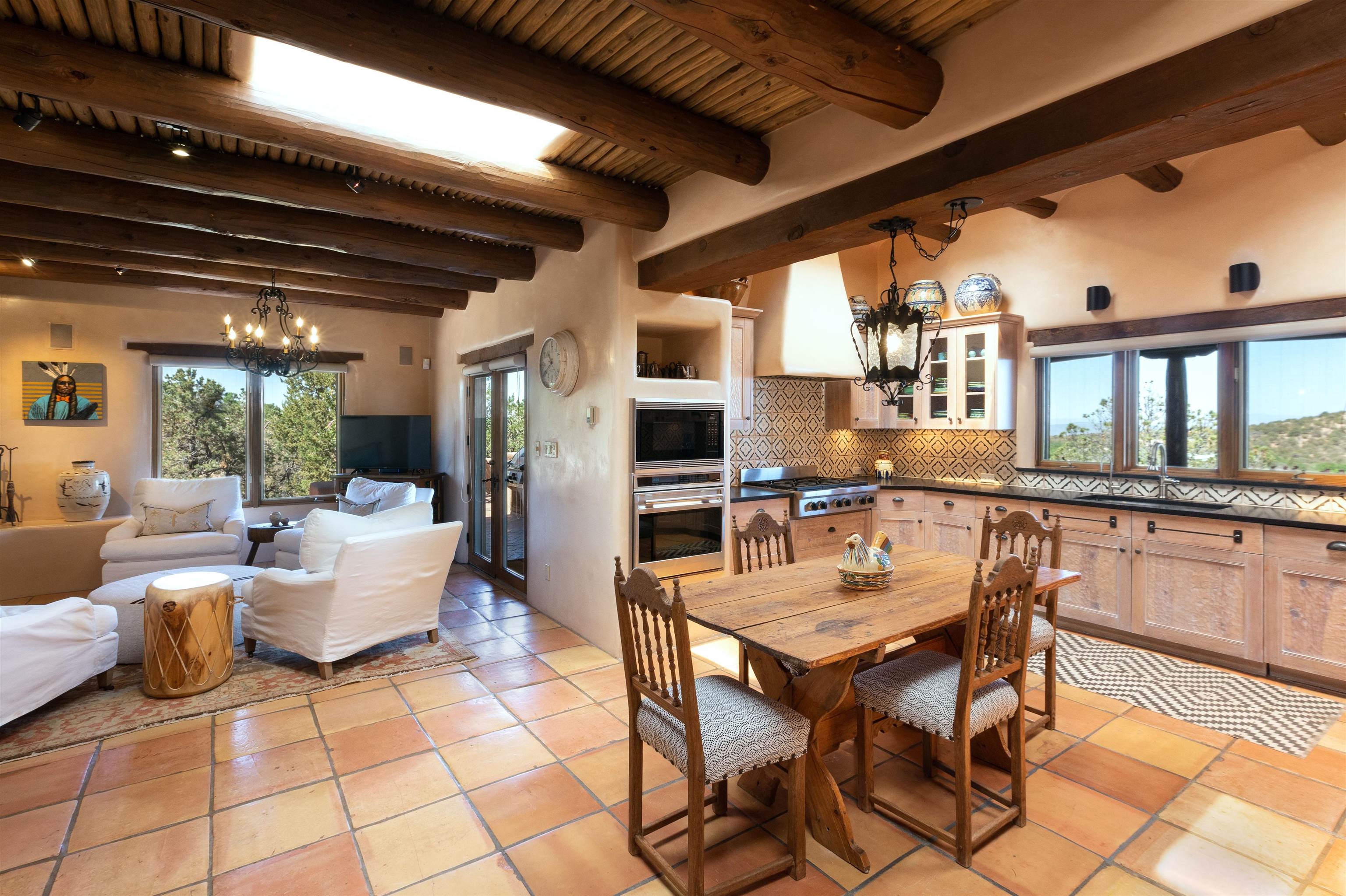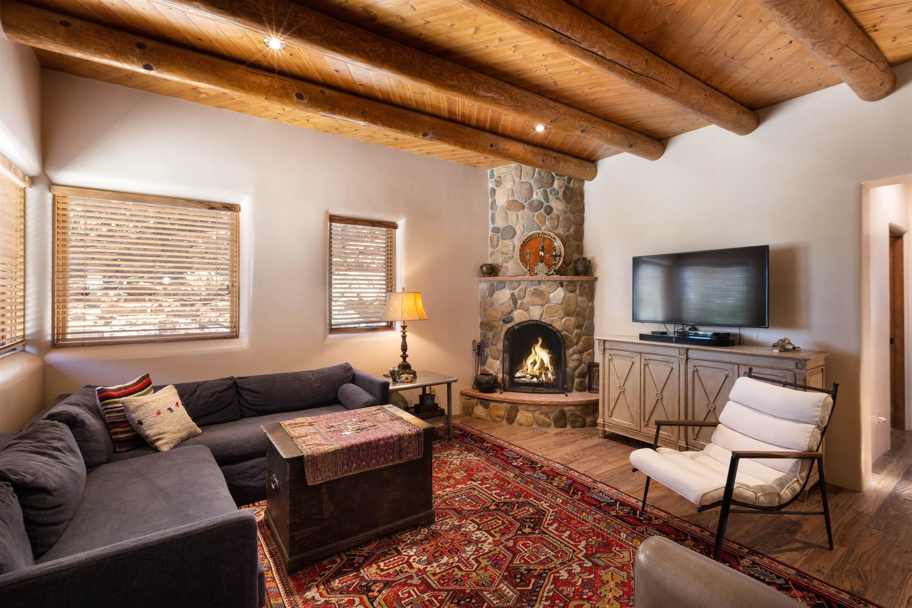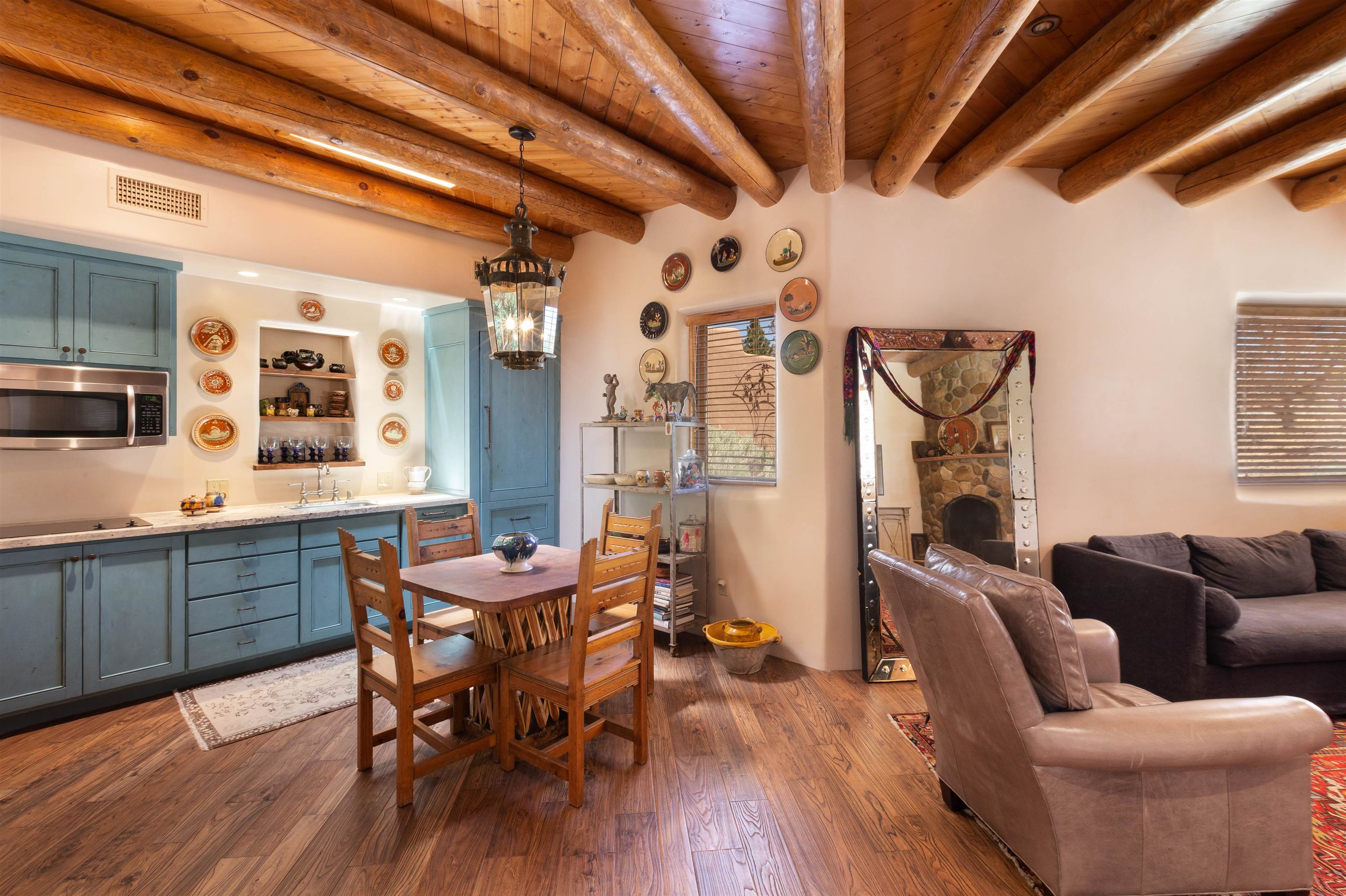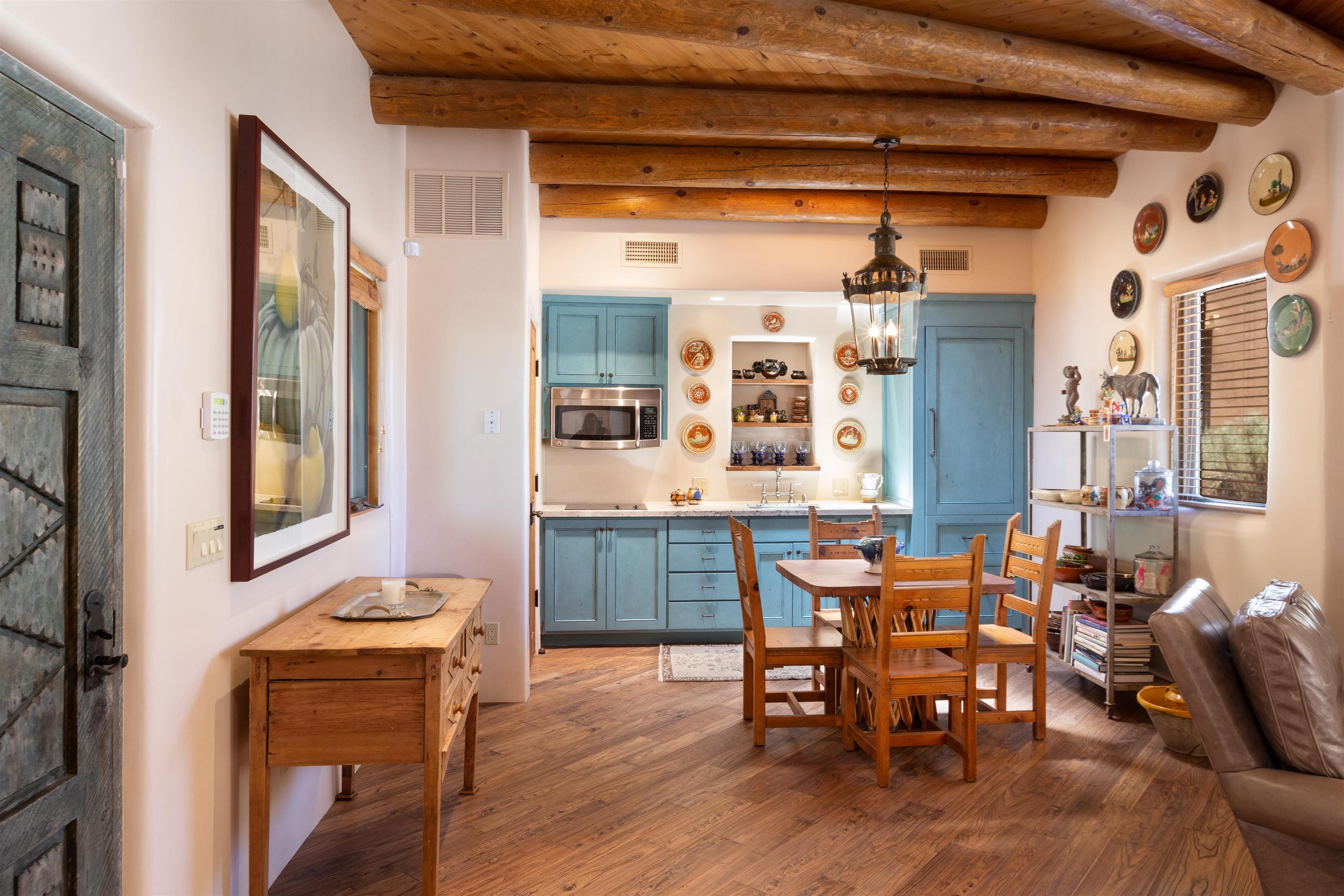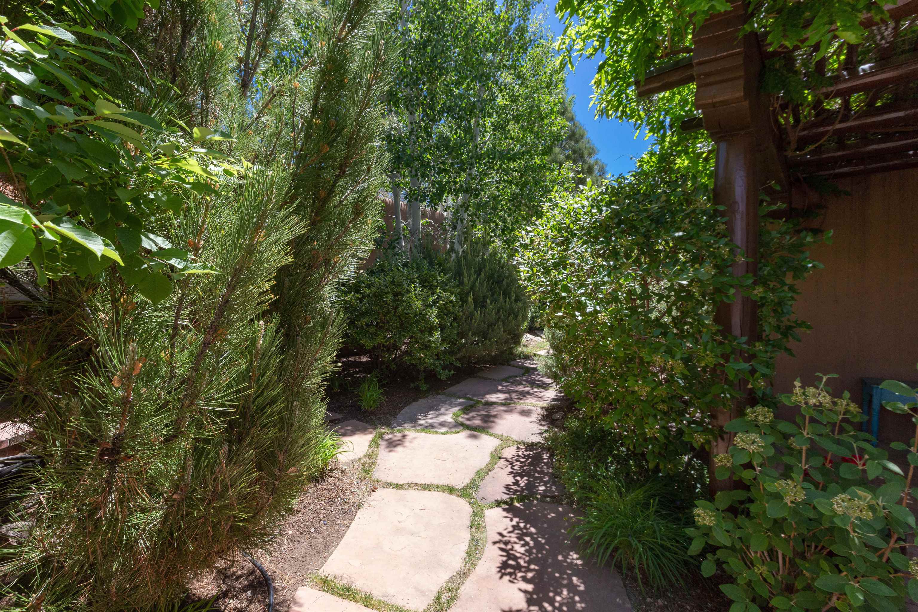 Minutes from the Plaza and above the historic Eastside this inviting home captures magnificent mountain and city light views all behind the gated sought after community of Ocaso Del Sol. Enter through a lovely gated entrance into lush Courtyard with a stream cascading through rocks and under the entry walk way. The main pueblo home has rich finishes of plaster walls, tile floors, and fabulous ceiling treatments throughout with beams, corbels & vigas. This estate exudes timeless old-world style such as the shepherd fireplace in the formal living room. The main house has a desirable floorplan with 3 bedrooms each ensuite with fireplaces offering privacy and French doors to wonderful outdoor living spaces. Live comfortably in the many lovely informal and formal rooms including an office. Enjoy the extensive West portal with custom kiva fireplace, built in bancos, built in grill and exceptional views, perfect for entertaining. Also accessed through the entry courtyard is the separate, fully appointed, one bedroom guest house. The style continues with a river rock fireplace, wood floors, kitchen and spacious bath. Off the west portal there is a studio with its own comfortable portal and separate entrance. Mature landscaping, a 3-car heated garage and so much ambiance...it's all here!