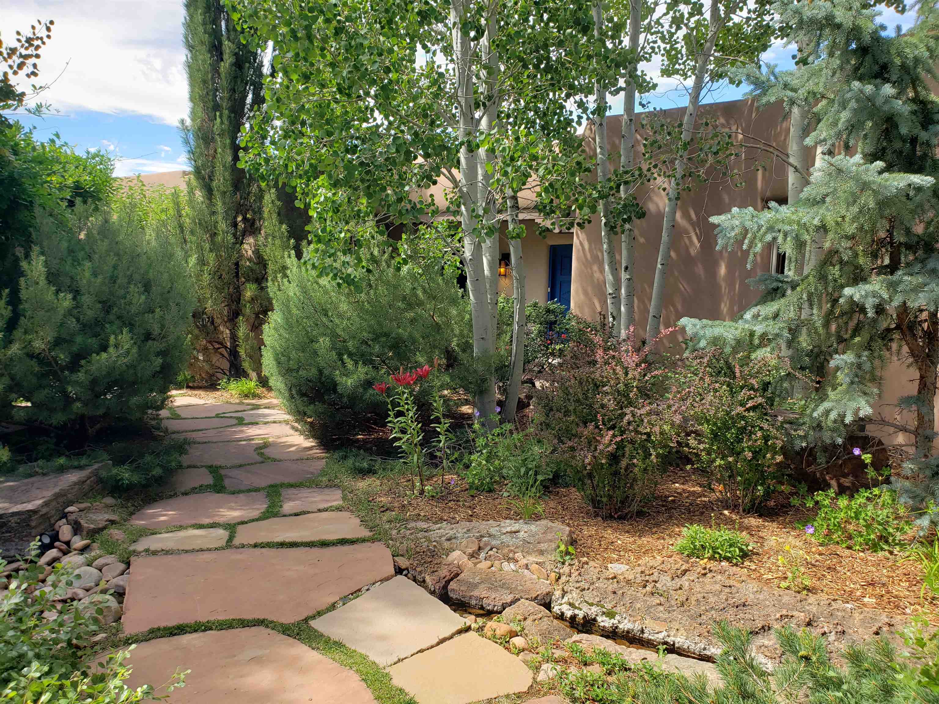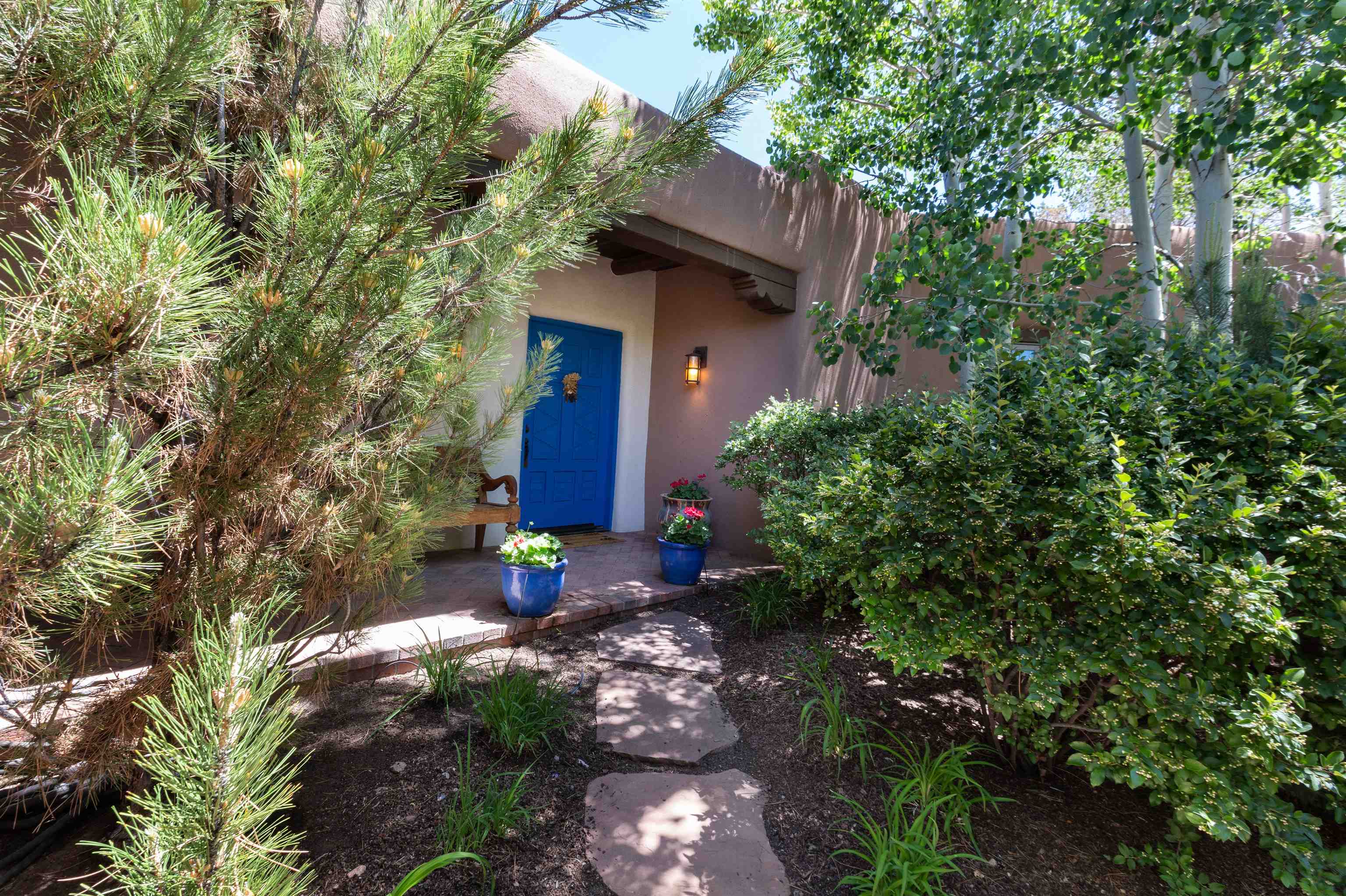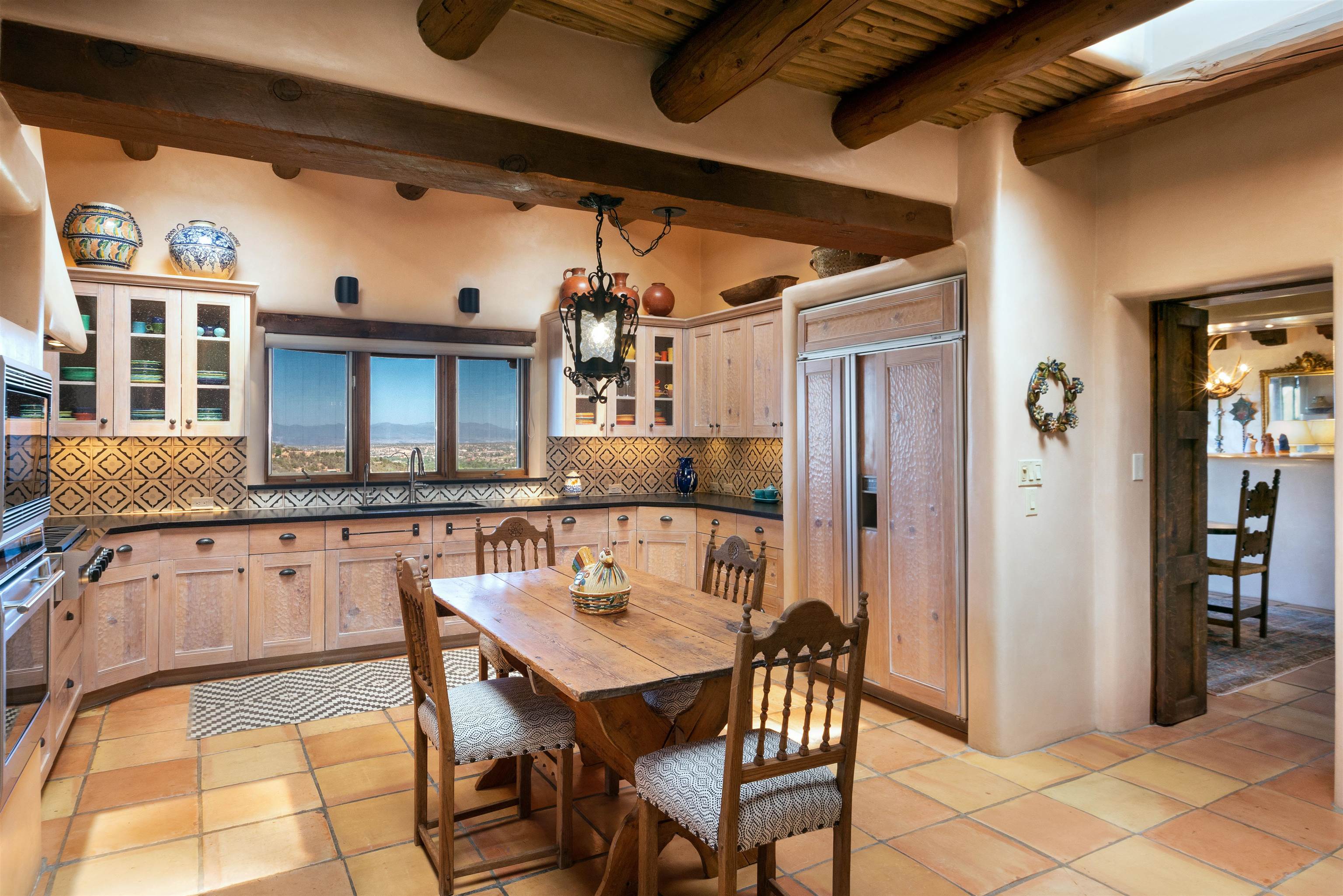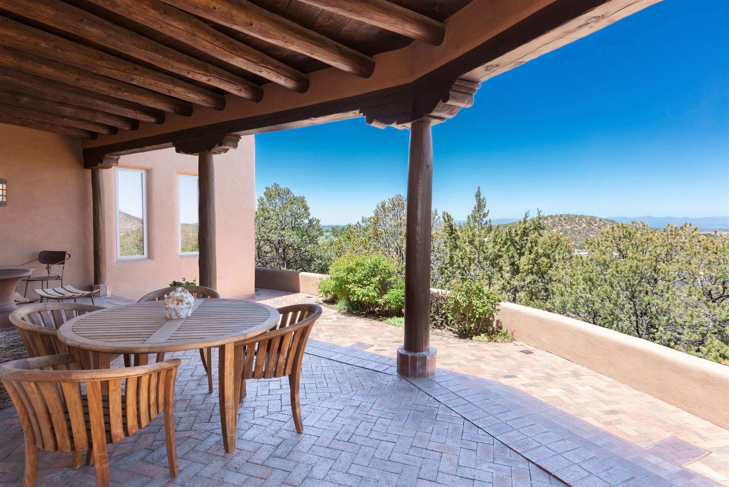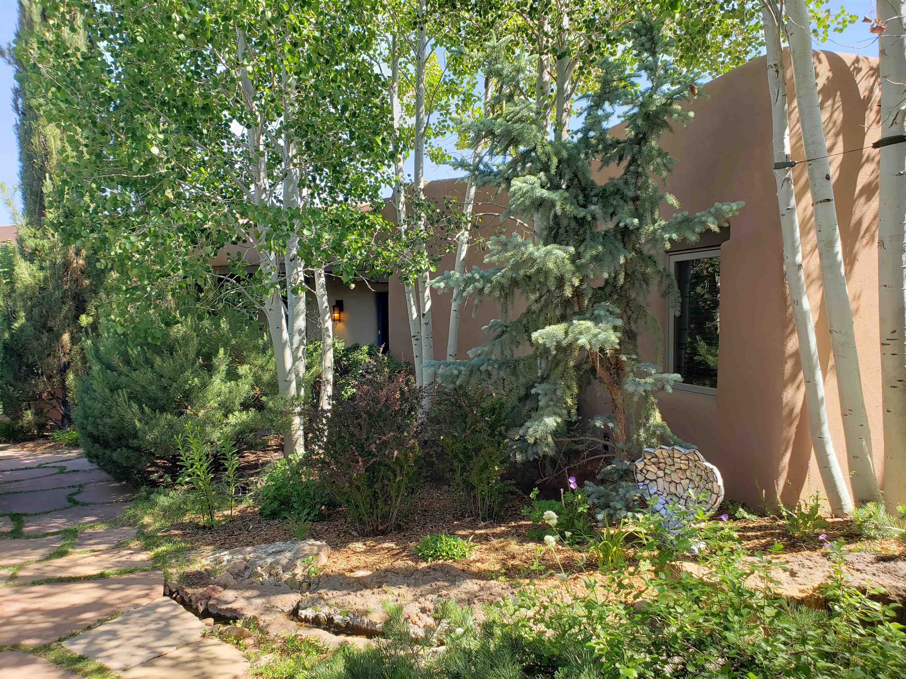Minutes from the Plaza and above the historic Eastside this inviting home captures magnificent mountain and city light views all behind the gated sought after community of Ocaso Del Sol. Enter through a lovely gated entrance into lush Courtyard with a stream cascading through rocks and under the entry walk way. The main pueblo home has rich finishes of plaster walls, tile floors, and fabulous ceiling treatments throughout with beams, corbels & vigas. This estate exudes timeless old-world style such as the shepherd fireplace in the formal living room. The main house has a desirable floorplan with 3 bedrooms each ensuite with fireplaces offering privacy and French doors to wonderful outdoor living spaces. Live comfortably in the many lovely informal and formal rooms including an office. Enjoy the extensive West portal with custom kiva fireplace, built in bancos, built in grill and exceptional views, perfect for entertaining. Also accessed through the entry courtyard is the separate, fully appointed, one bedroom guest house. The style continues with a river rock fireplace, wood floors, kitchen and spacious bath. Off the west portal there is a studio with its own comfortable portal and separate entrance. Mature landscaping, a 3-car heated garage and so much ambiance...it's all here!
