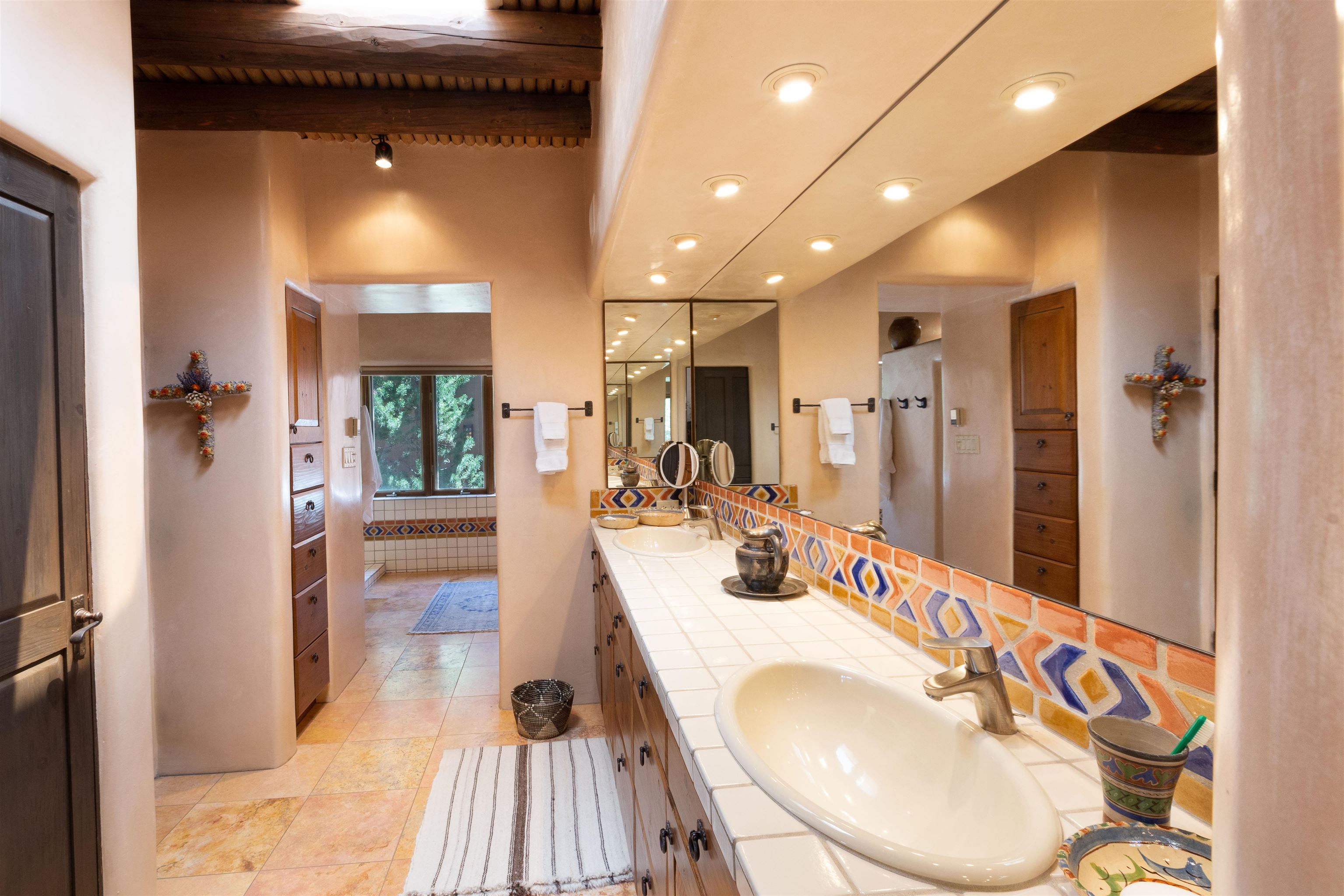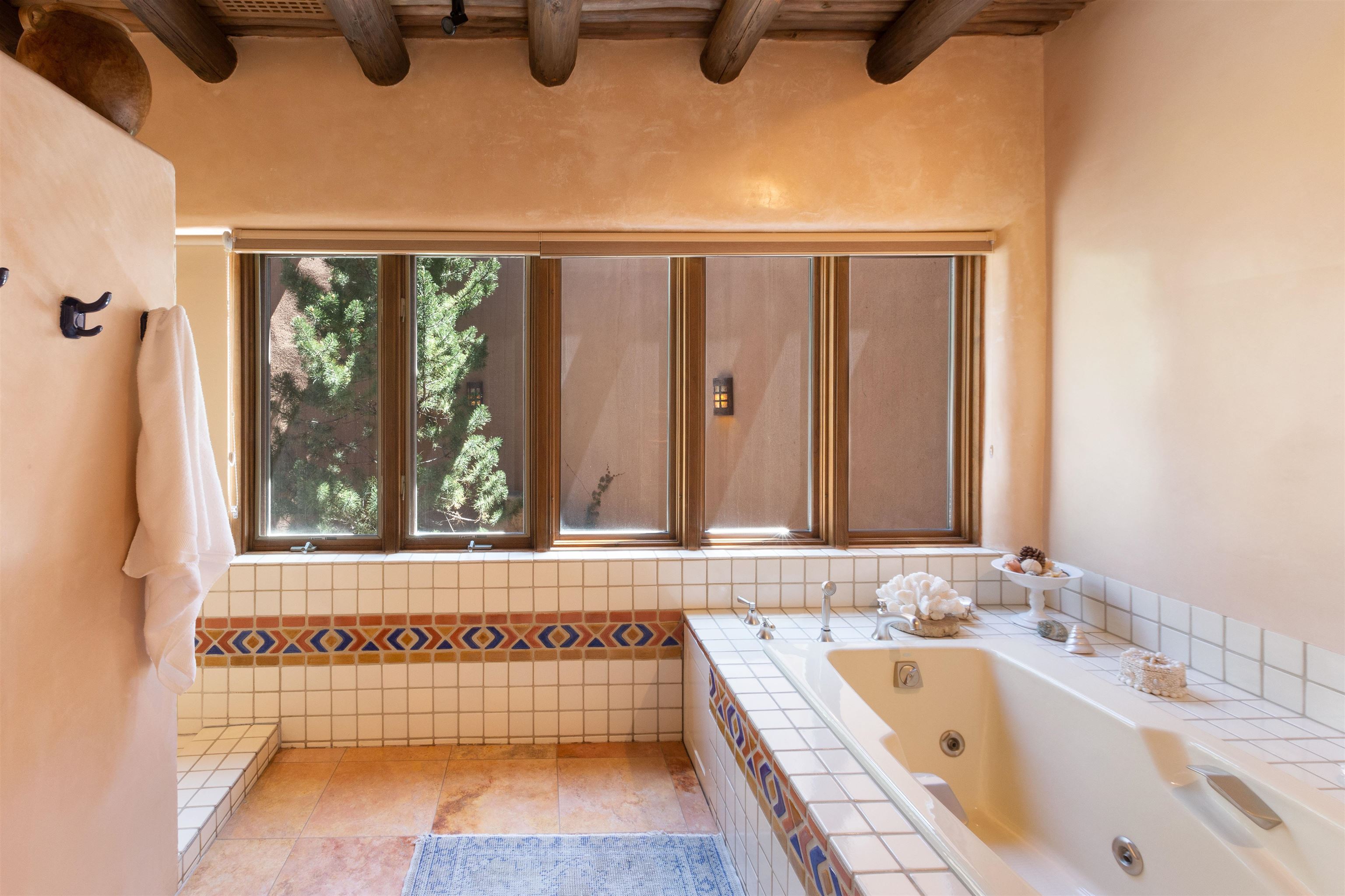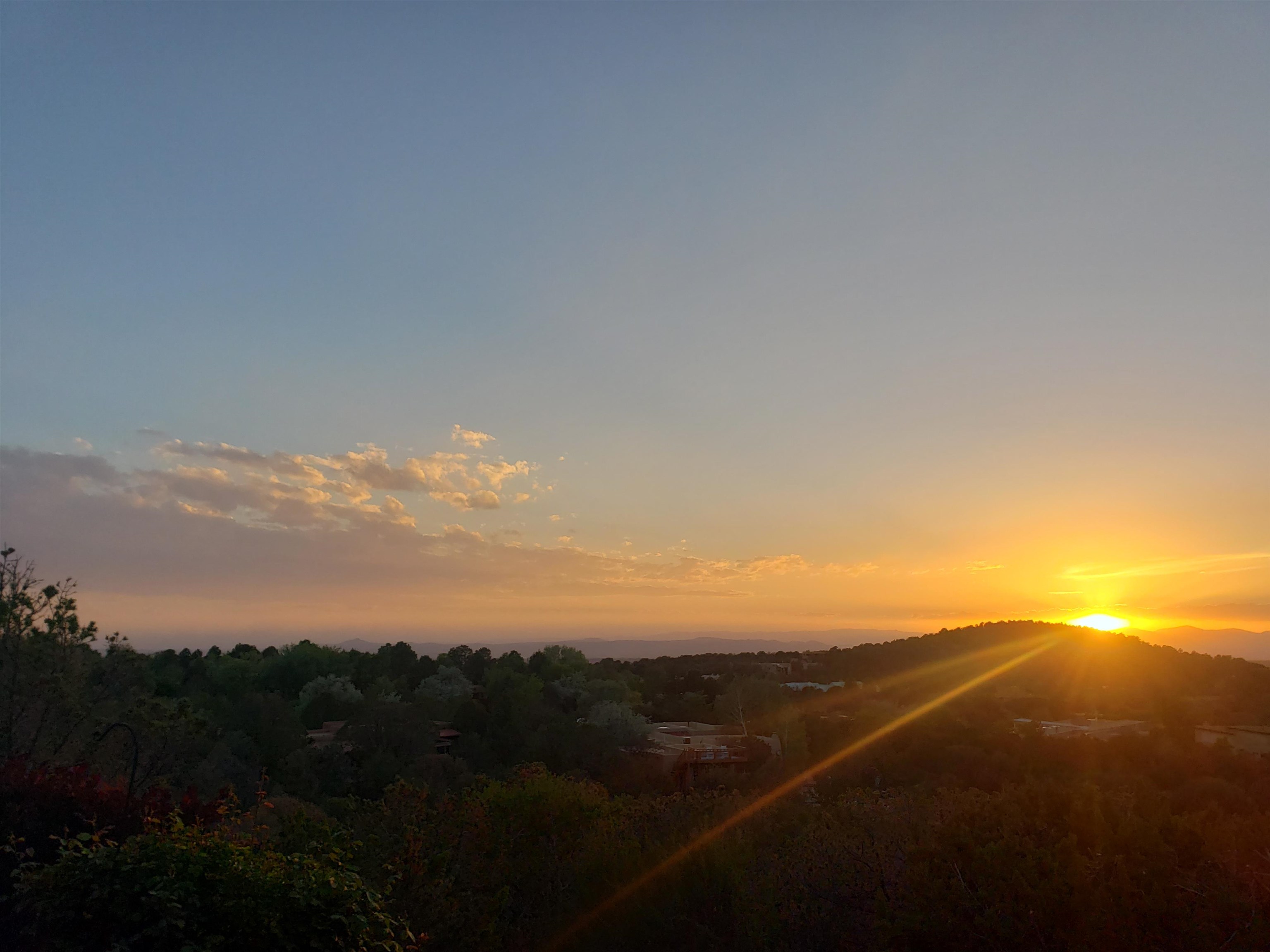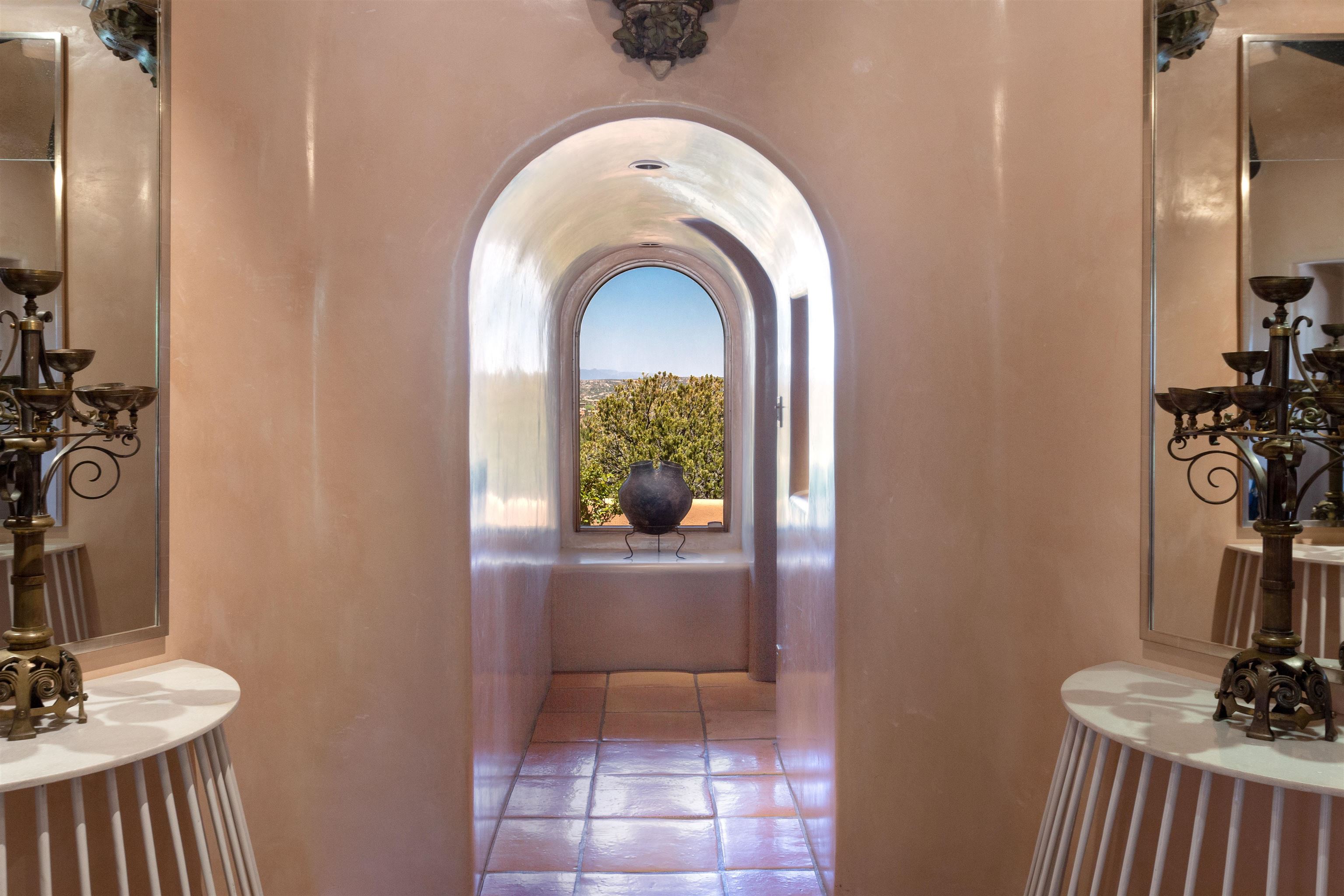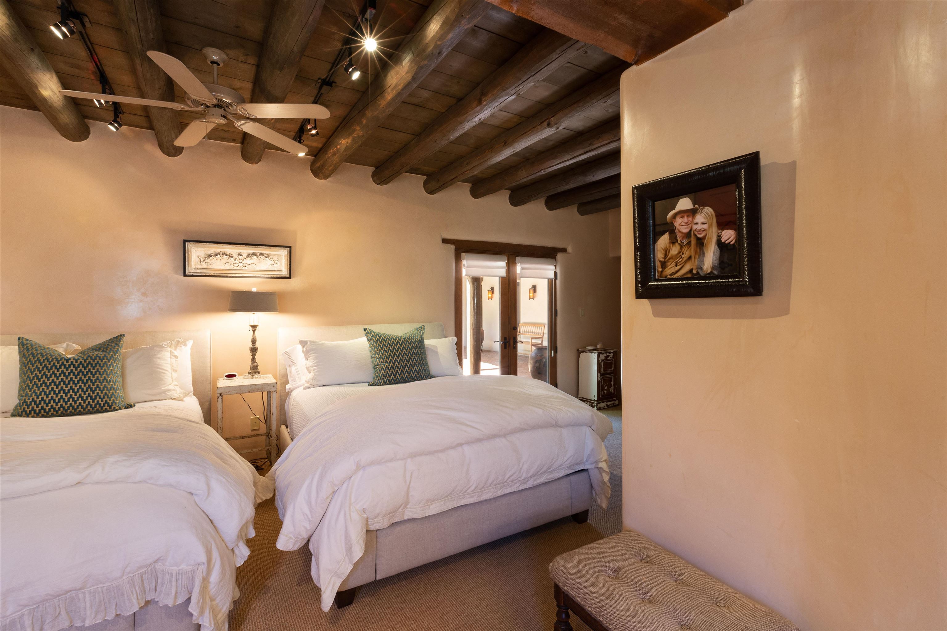 Minutes from the Plaza and above the historic Eastside this inviting home captures magnificent mountain and city light views all behind the gated sought after community of Ocaso Del Sol. Enter through a lovely gated entrance into lush Courtyard with a stream cascading through rocks and under the entry walk way. The main pueblo home has rich finishes of plaster walls, tile floors, and fabulous ceiling treatments throughout with beams, corbels & vigas. This estate exudes timeless old-world style such as the shepherd fireplace in the formal living room. The main house has a desirable floorplan with 3 bedrooms each ensuite with fireplaces offering privacy and French doors to wonderful outdoor living spaces. Live comfortably in the many lovely informal and formal rooms including an office. Enjoy the extensive West portal with custom kiva fireplace, built in bancos, built in grill and exceptional views, perfect for entertaining. Also accessed through the entry courtyard is the separate, fully appointed, one bedroom guest house. The style continues with a river rock fireplace, wood floors, kitchen and spacious bath. Off the west portal there is a studio with its own comfortable portal and separate entrance. Mature landscaping, a 3-car heated garage and so much ambiance...it's all here!