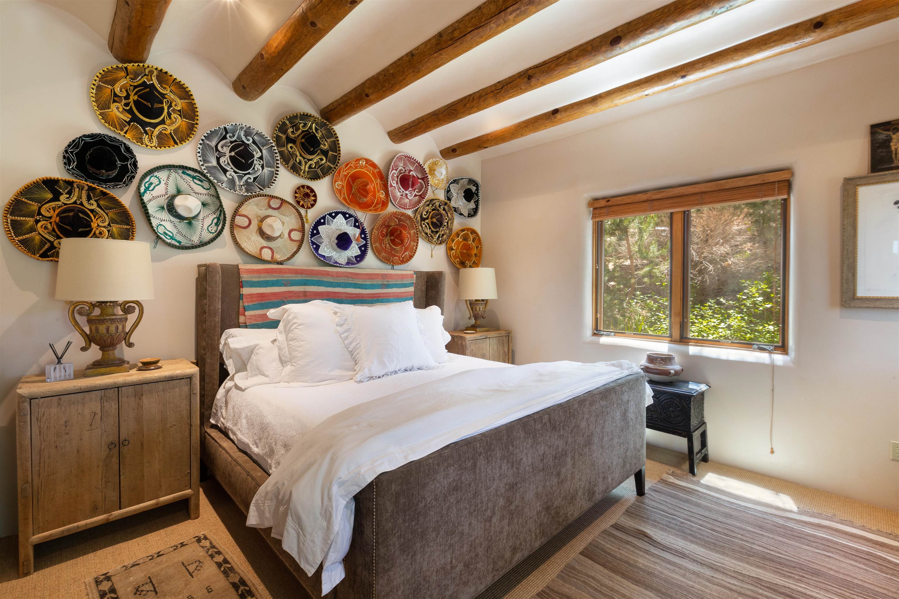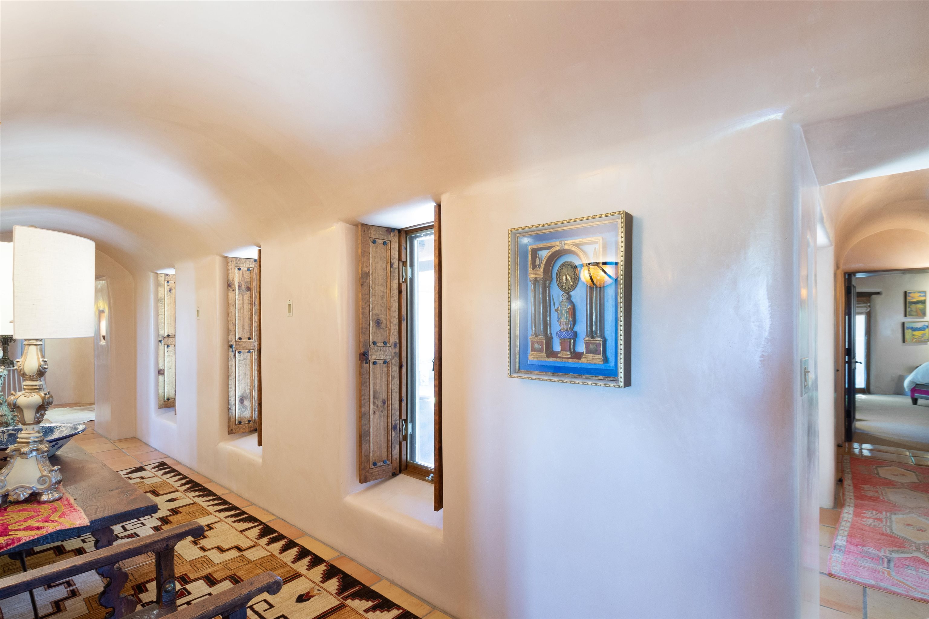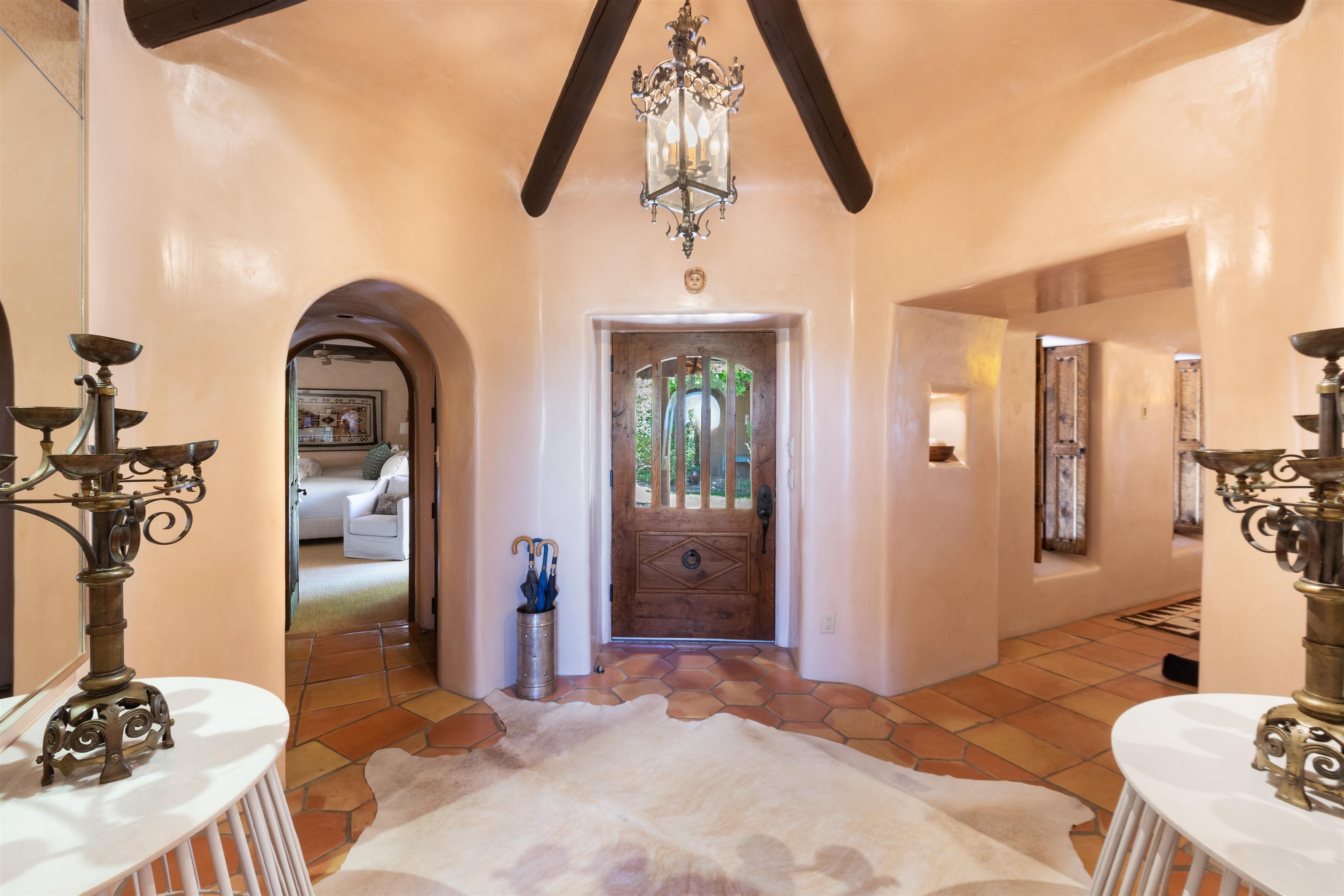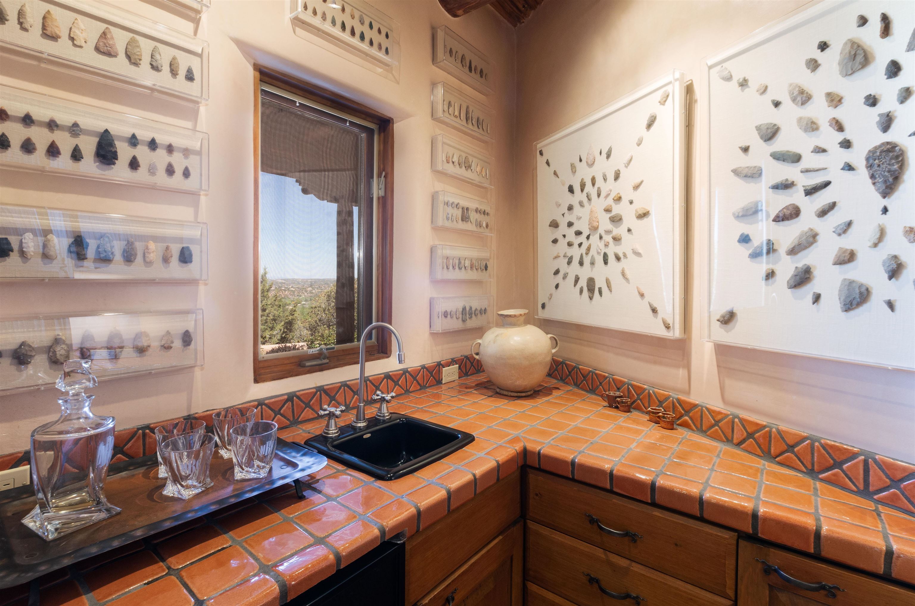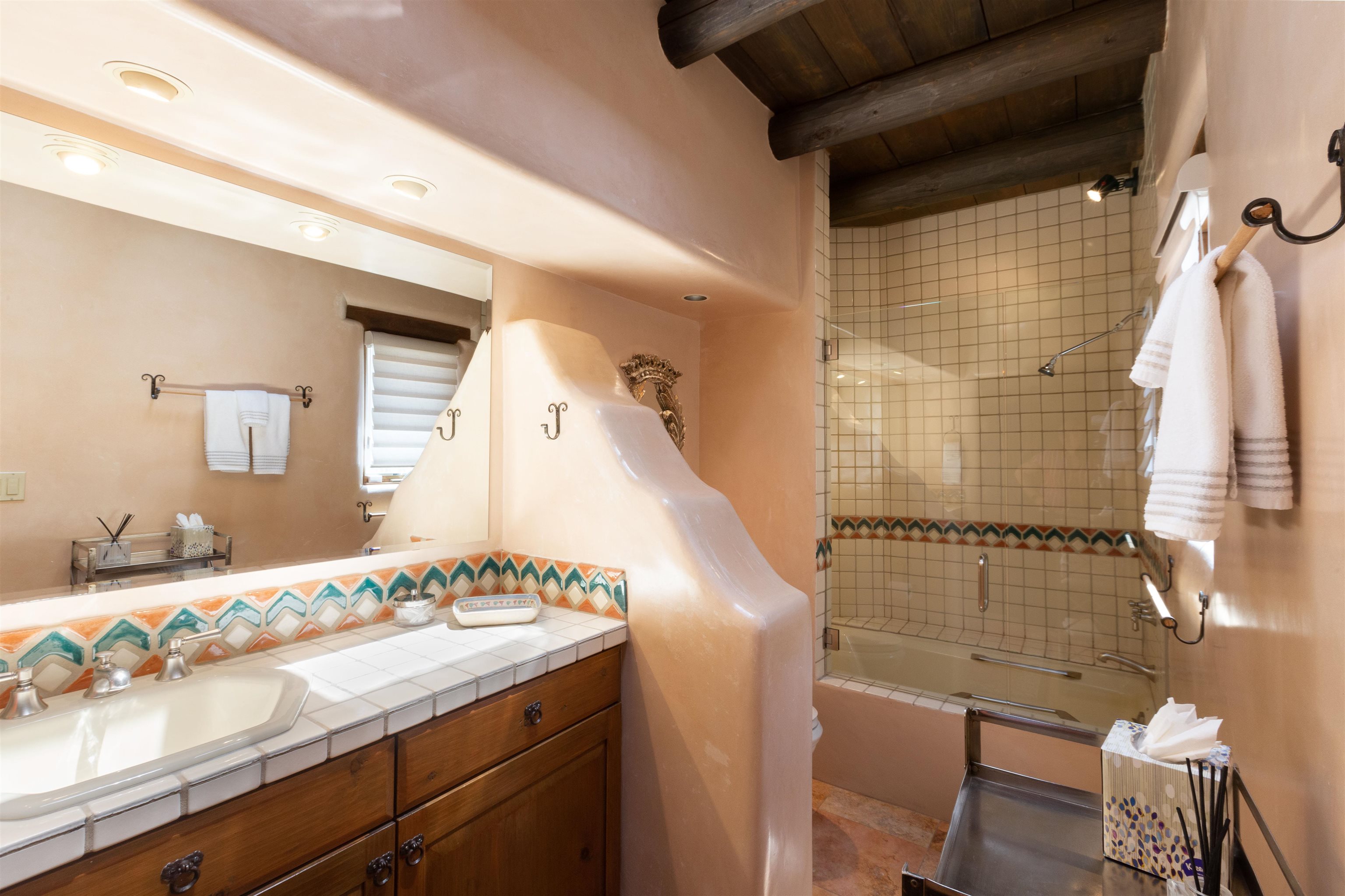 Minutes from the Plaza and above the historic Eastside this inviting home captures magnificent mountain and city light views all behind the gated sought after community of Ocaso Del Sol. Enter through a lovely gated entrance into lush Courtyard with a stream cascading through rocks and under the entry walk way. The main pueblo home has rich finishes of plaster walls, tile floors, and fabulous ceiling treatments throughout with beams, corbels & vigas. This estate exudes timeless old-world style such as the shepherd fireplace in the formal living room. The main house has a desirable floorplan with 3 bedrooms each ensuite with fireplaces offering privacy and French doors to wonderful outdoor living spaces. Live comfortably in the many lovely informal and formal rooms including an office. Enjoy the extensive West portal with custom kiva fireplace, built in bancos, built in grill and exceptional views, perfect for entertaining. Also accessed through the entry courtyard is the separate, fully appointed, one bedroom guest house. The style continues with a river rock fireplace, wood floors, kitchen and spacious bath. Off the west portal there is a studio with its own comfortable portal and separate entrance. Mature landscaping, a 3-car heated garage and so much ambiance...it's all here!