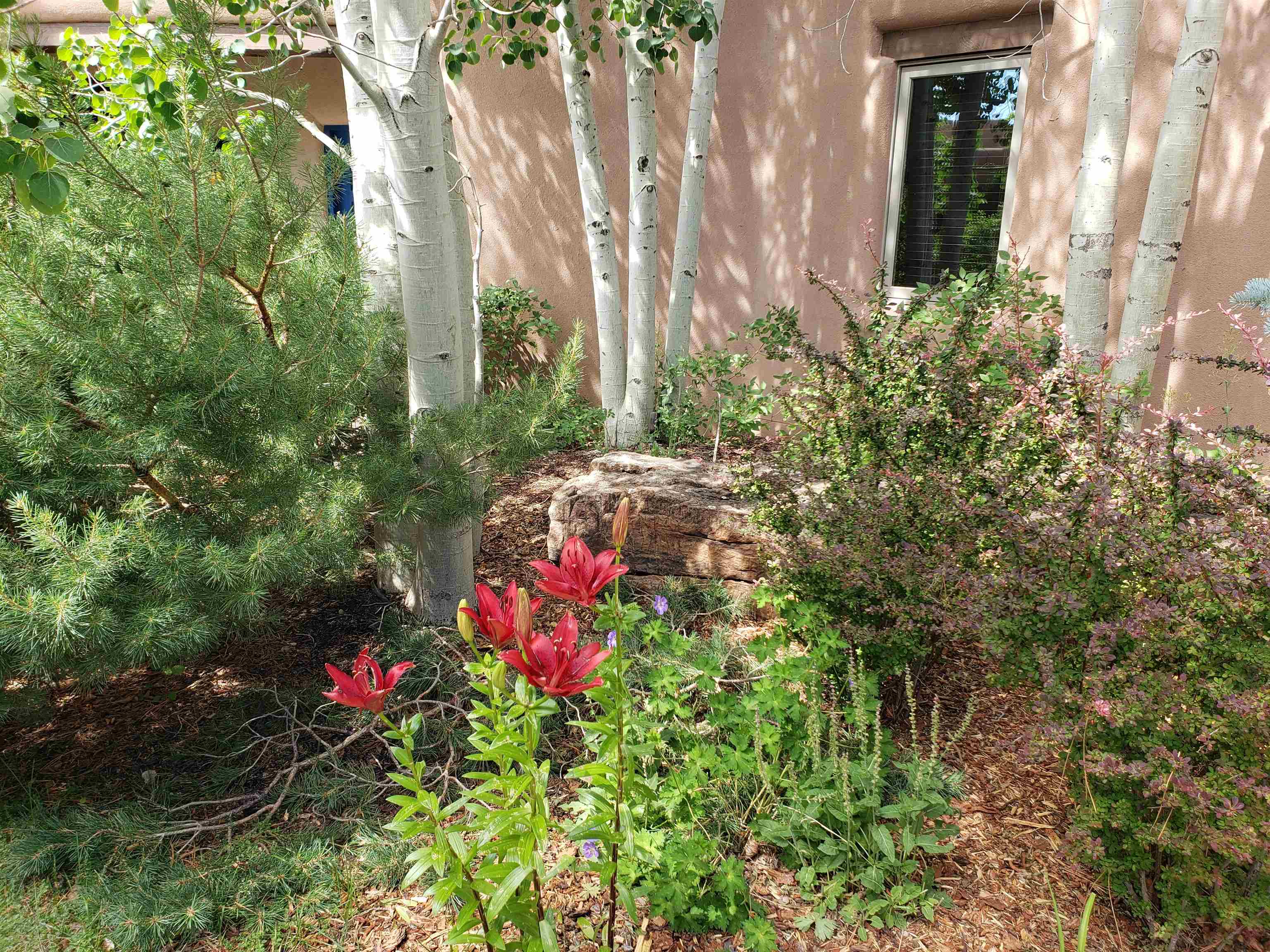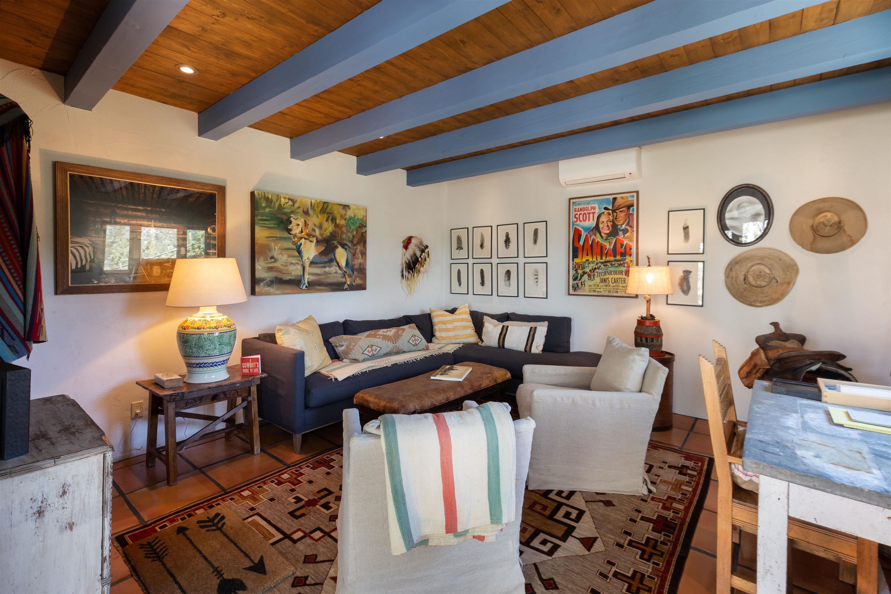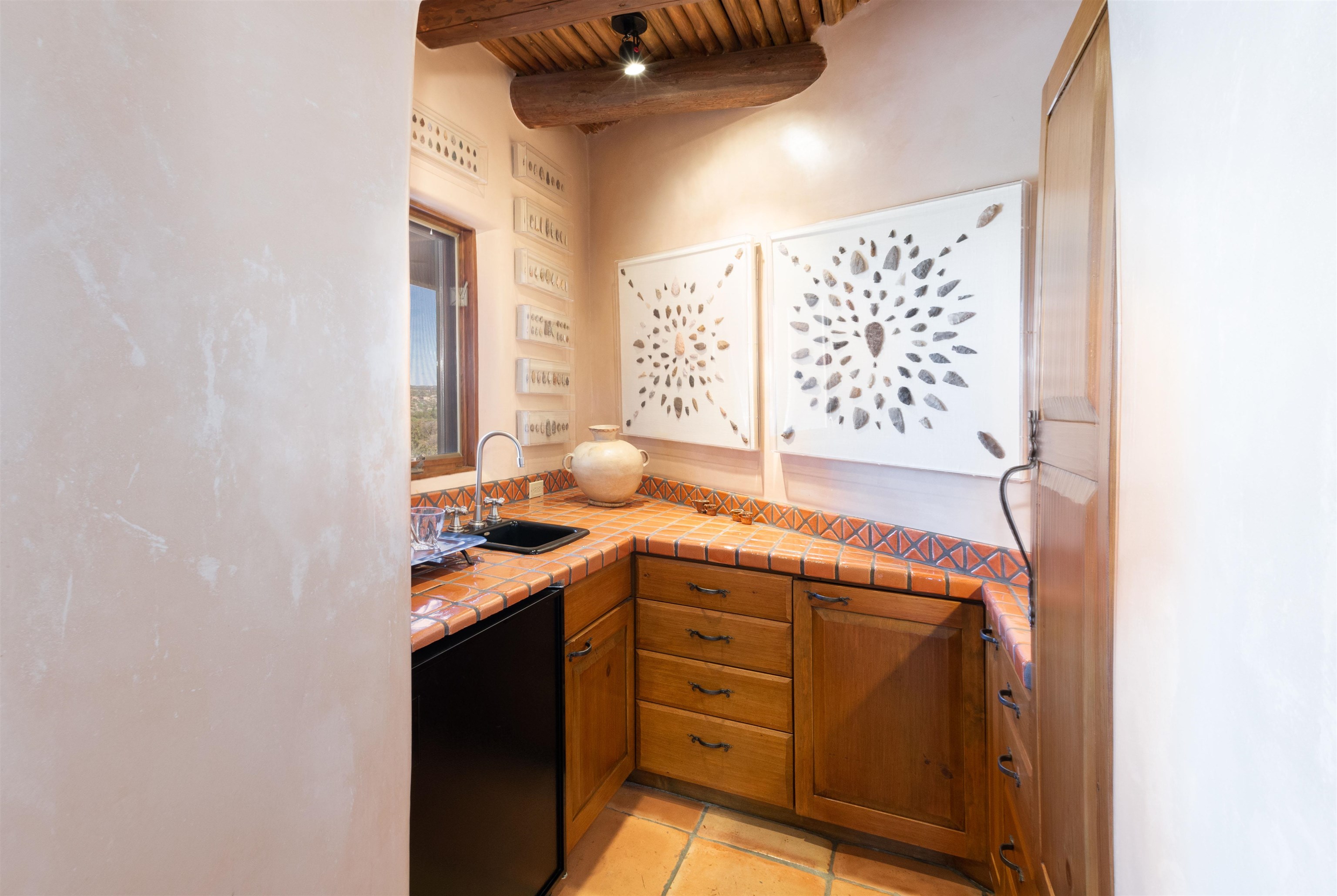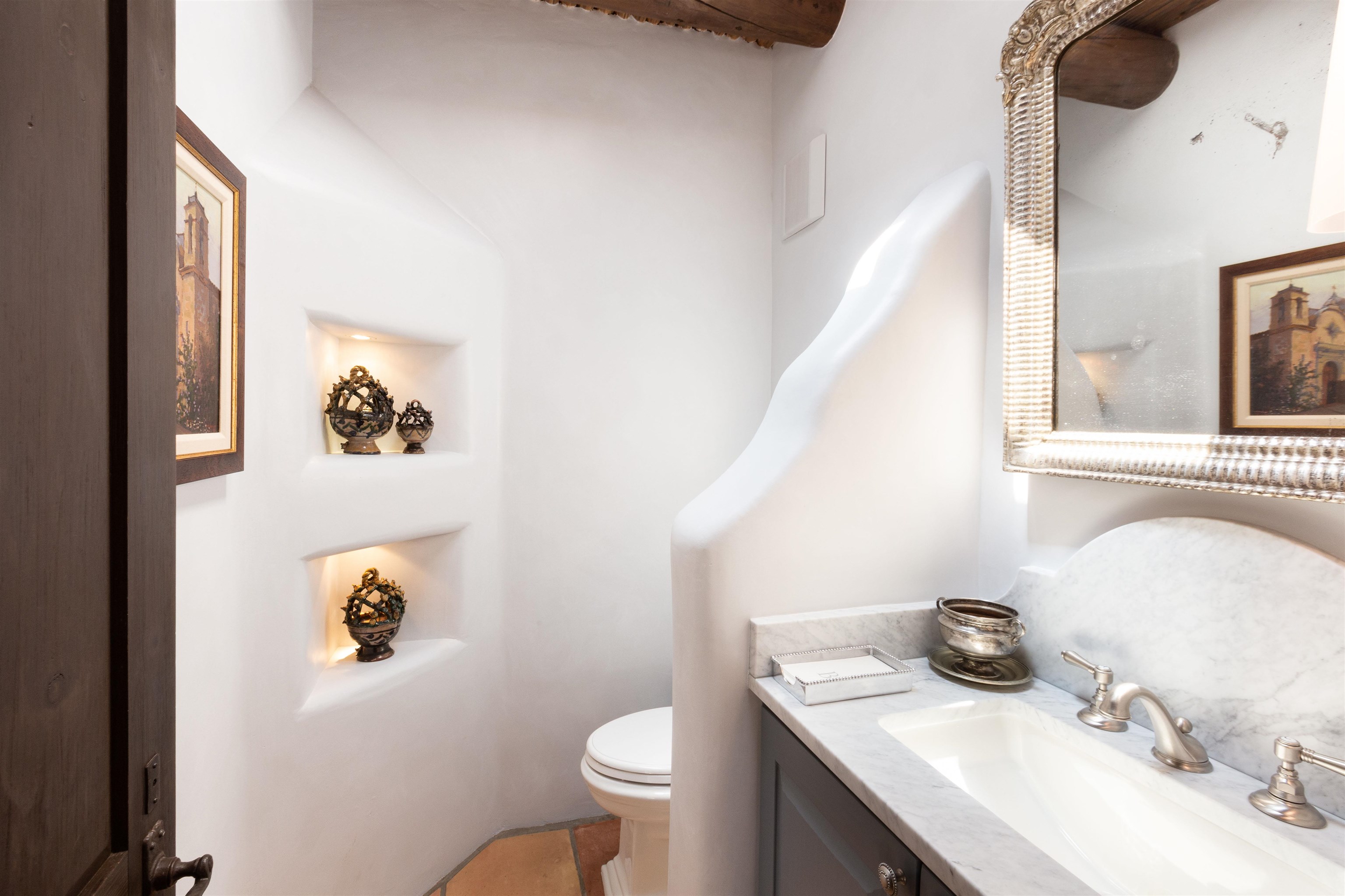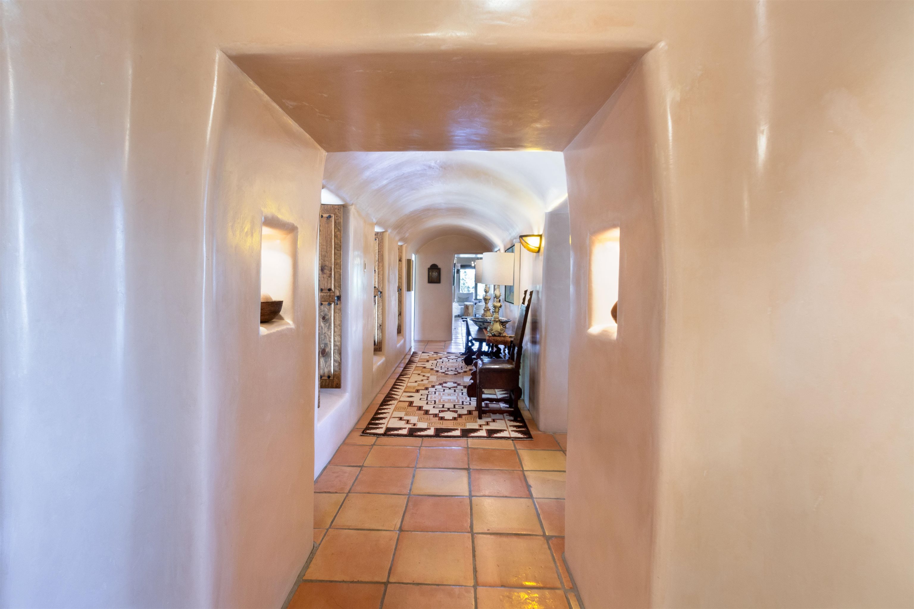 Minutes from the Plaza and above the historic Eastside this inviting home captures magnificent mountain and city light views all behind the gated sought after community of Ocaso Del Sol. Enter through a lovely gated entrance into lush Courtyard with a stream cascading through rocks and under the entry walk way. The main pueblo home has rich finishes of plaster walls, tile floors, and fabulous ceiling treatments throughout with beams, corbels & vigas. This estate exudes timeless old-world style such as the shepherd fireplace in the formal living room. The main house has a desirable floorplan with 3 bedrooms each ensuite with fireplaces offering privacy and French doors to wonderful outdoor living spaces. Live comfortably in the many lovely informal and formal rooms including an office. Enjoy the extensive West portal with custom kiva fireplace, built in bancos, built in grill and exceptional views, perfect for entertaining. Also accessed through the entry courtyard is the separate, fully appointed, one bedroom guest house. The style continues with a river rock fireplace, wood floors, kitchen and spacious bath. Off the west portal there is a studio with its own comfortable portal and separate entrance. Mature landscaping, a 3-car heated garage and so much ambiance...it's all here!