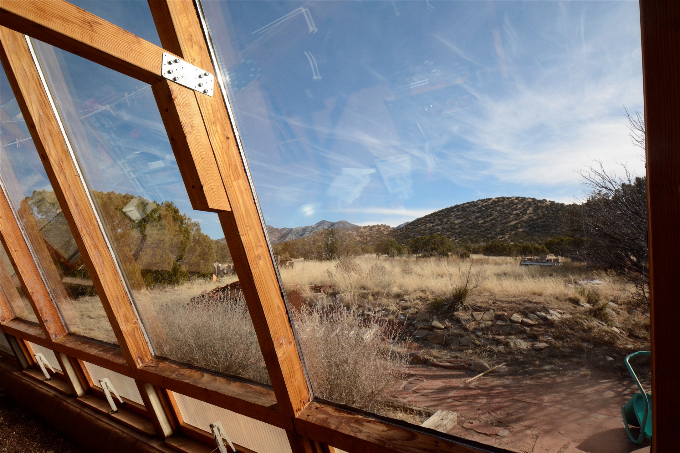 Nestled among the mountains along the Turquoise Trail south of Santa Fe is a private country living dream. Twenty acres of fenced land supports a sustainable complex that provides views, views, views and off grid existence. Horses? One can ride tremendous distances through endless beauty, directly from the property. The main house includes two bedrooms, an attached greenhouse for growing all year long, a SAUNA, and lovely adobe construction and detail. A _______ square foot Studio is also attached and heated with a large wood burning stove. An office is an extension of that space.An oversized garage is perfect for utilization of additional studio space, car storage, or eventual development for another living area or apartment (mother-in law, renters, caretakers?) This property offers so many choices for expansion. Imagination runs wild!