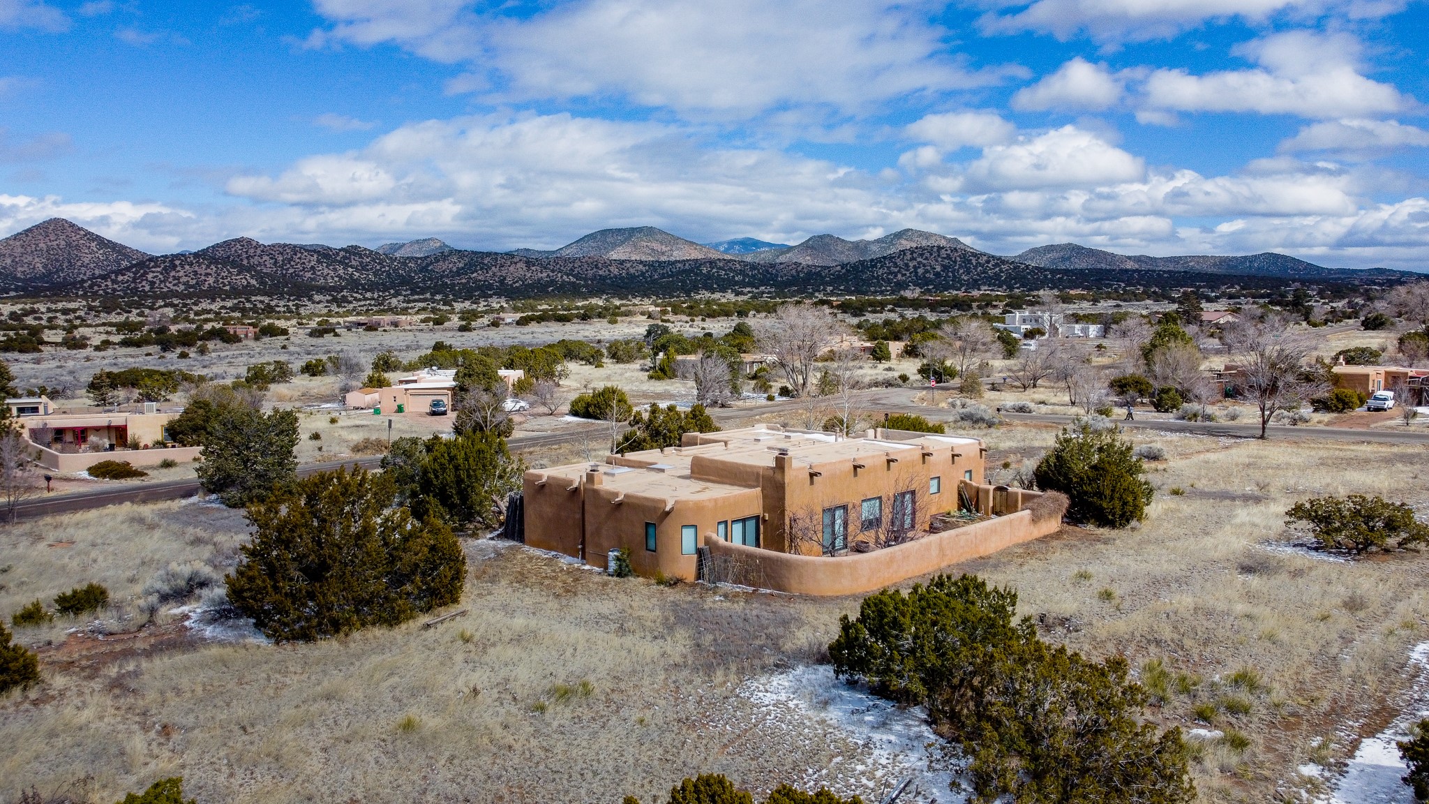 Gorgeous Eldorado home full of Santa Fe Charm is situated on a corner lot with views! The thoughtful floor plan includes three bedrooms, two and a half bathrooms, and a dedicated office. The living room and formal dining area are at the heart of the home, featuring soaring ceilings with vigas, large beams, spiral-carved columns, a grand kiva fireplace, large south-facing windows, and sliding glass doors, as well as a half-bath for guests. The adjacent kitchen is spacious with a large breakfast nook/sitting area, a newer stainless-steel refrigerator and electric range, coved ceilings with vigas, and has access to the East-facing deck, laundry/mudroom, and the dedicated office/library. The thoughtfully separated primary suite has its own kiva fireplace, ceilings with vigas, and access to the south-facing courtyard. The ensuite bathroom includes a double vanity, a walk-in closet, a shower, and a separate jetted soaking tub. There are two additional bedrooms located off of the main hall with their own full bathroom. Other features include a large walled courtyard spanning the South side of the home with drought tolerant landscaping, a coyote-fenced entrance courtyard, radiant in-floor heat, ( seller states that its Wirsbo/PEX), Saltillo tile floors, skylights and newer windows with custom wood windowsills.Come see what this light & bright Eldorado Charmer has to offer! By appointment only.