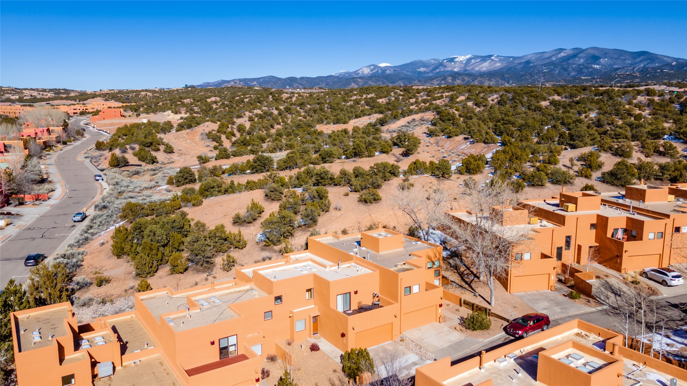 Come live in Zocalo, a modern interpretation of Pueblo Indian architecture conceived by award winning and master architect, Ricardo Legorreta whose use of wall planes, light, scale, geometry, and color all come together for sensational modern living. This unit has a new roof and new mini splits along with upgraded wood floors and new carpet in the primary suite. The living and dining areas offer wood ceilings with a dual-sided fireplace, an open kitchen, and private outdoor deck backing to open space. The primary suite also opens to the private deck and features a large and well-appointed bath with separate tub and walk-in shower, plus dual vanities. There is great bedroom separation in this unit with a junior suite located upstairs. The community amenities include a huge clubhouse with luxurious appointments including a grand foyer and fireplace. There is also a fitness center, swimming pool, spa/jacuzzi, club room, conference room and catering kitchen. This fantastic and modern community built upon 46 acres of rolling hills in North Santa Fe is 5 minutes to downtown Santa Fe and the Plaza with plenty of restaurants and shopping. Open Sunday, March 12th from 1-3pm.