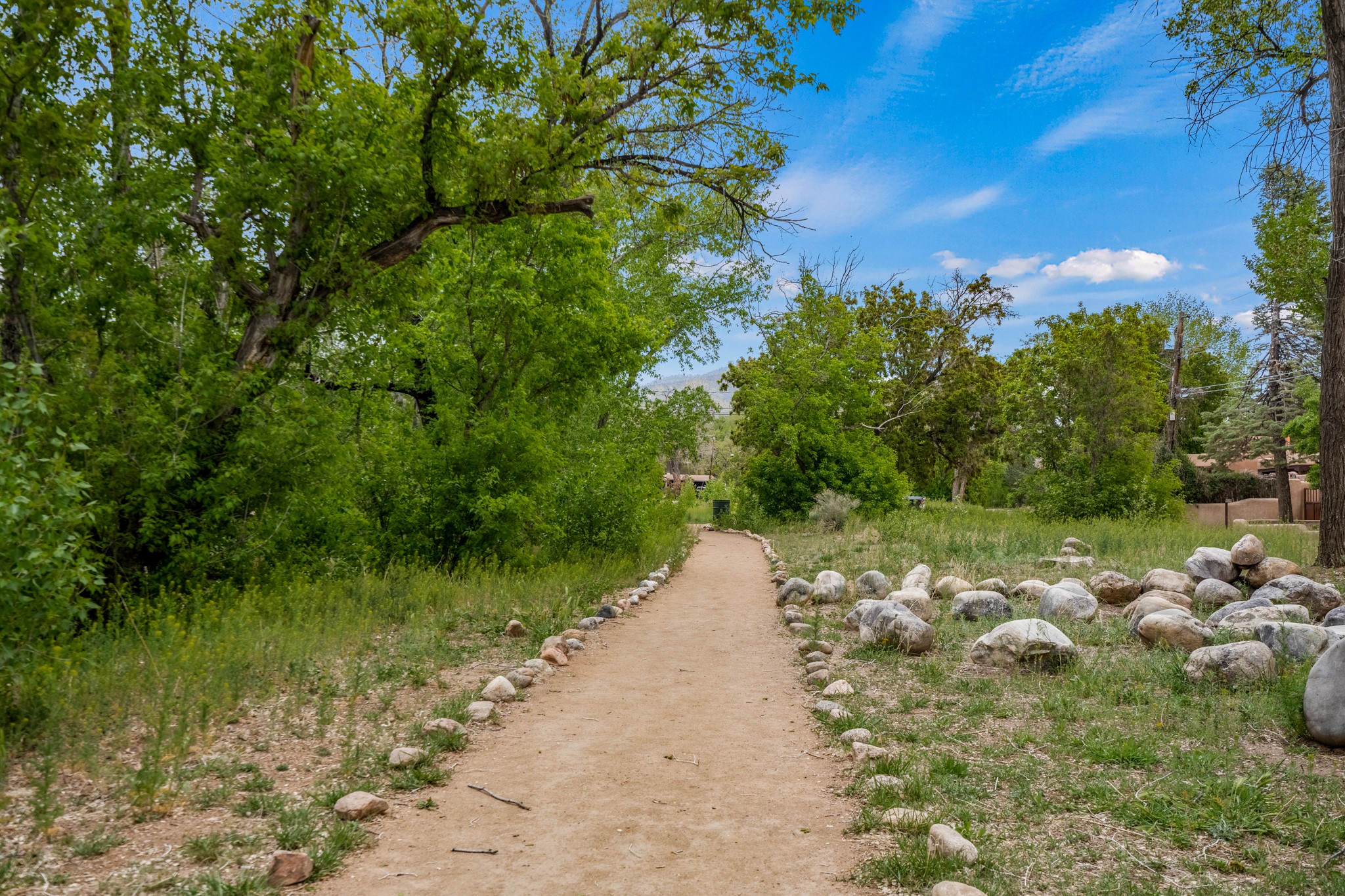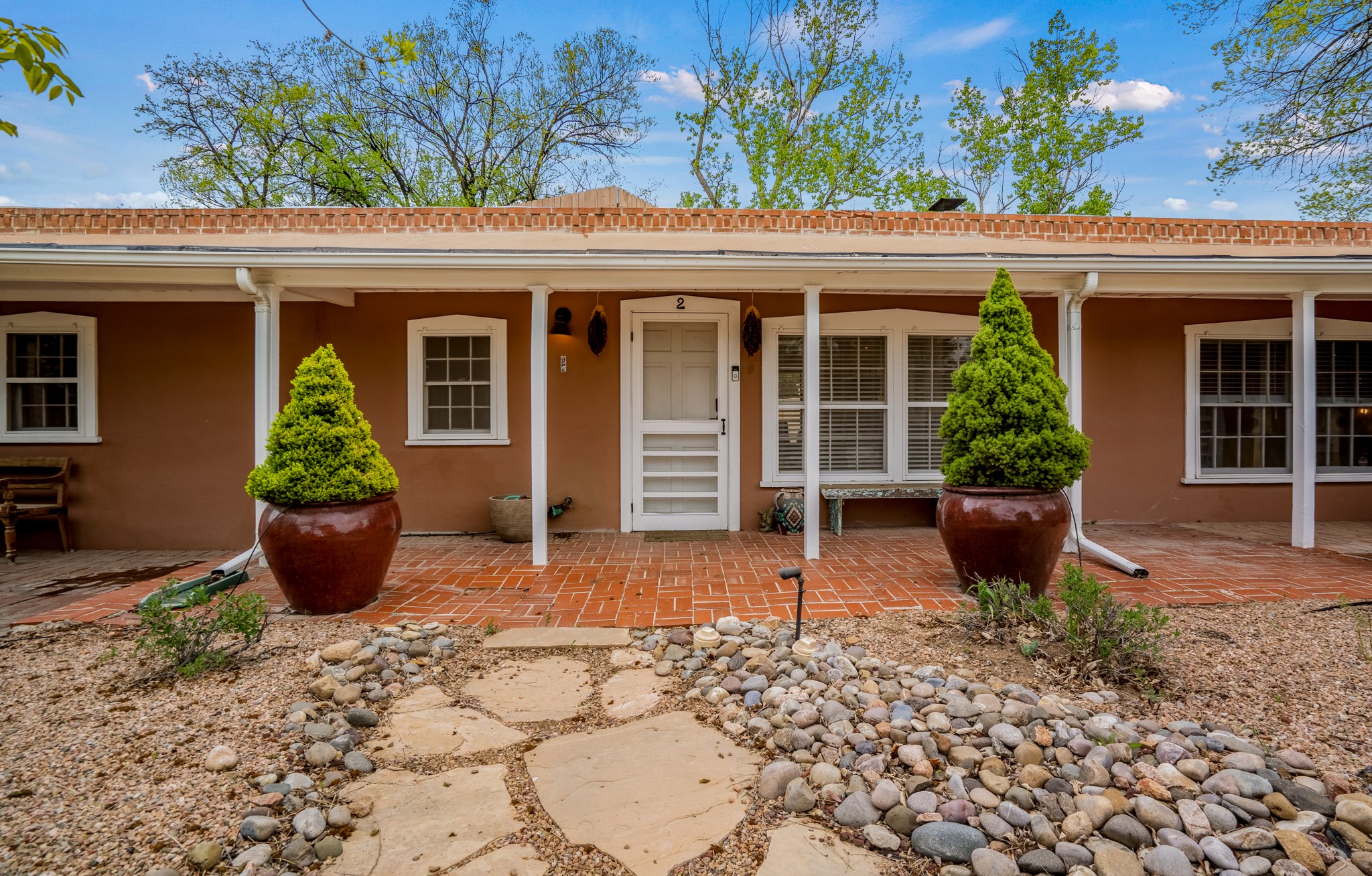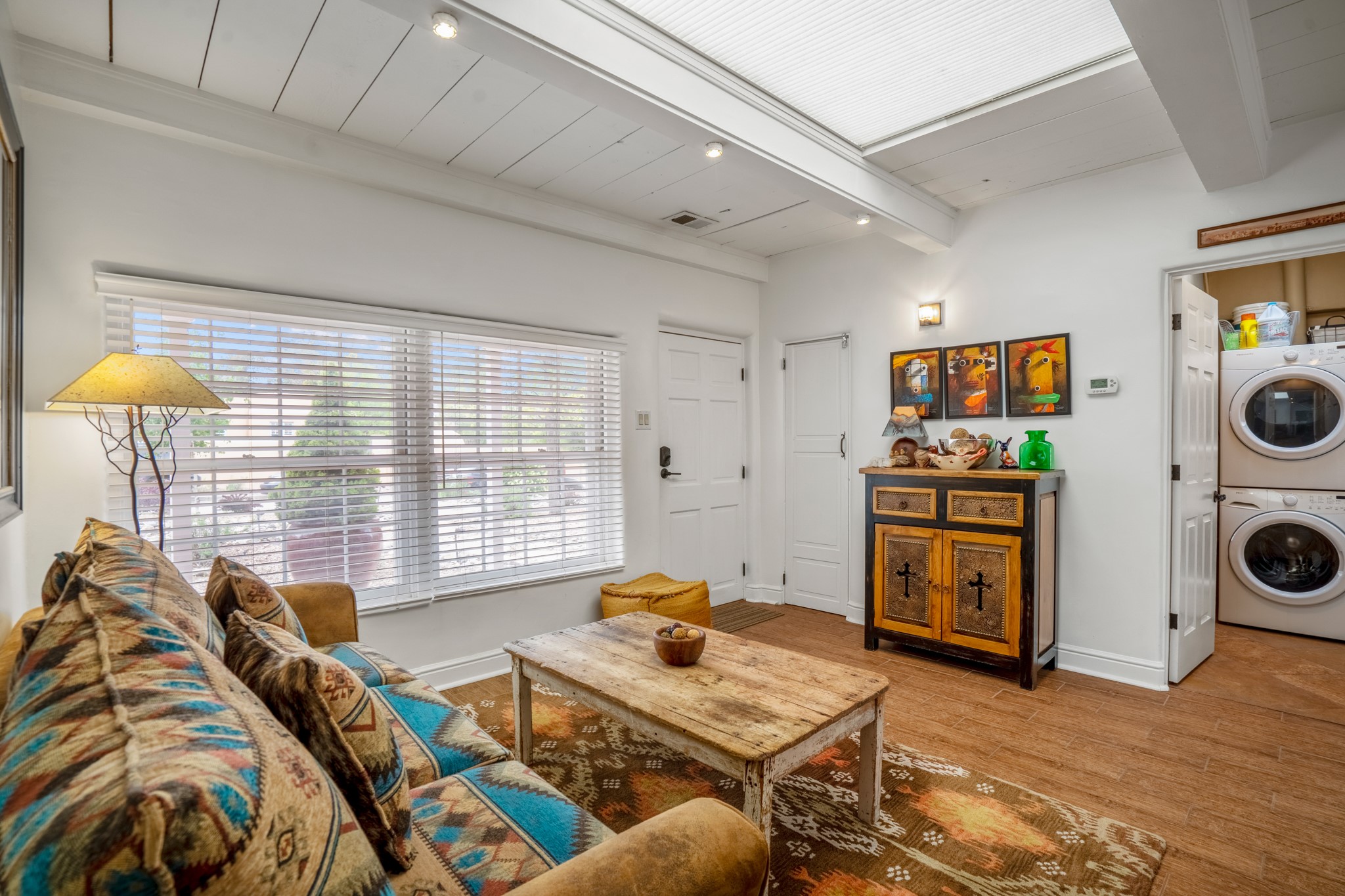 LOCATION, LOCATION, LOCATION! On a quiet lane between Canyon Road and the Santa Fe River, the perfect pied--terre awaits. This rare gem is part of a compound of 5. The fully equipped and furnished studio is +/-620sqft has abundant natural light pouring in from skylights and large windows - truly TURNKEY. Features include a spacious kitchen with stone countertops and stainless appliances, beamed ceilings, a wood burning fireplace, and an ultra private rear courtyard. The floor plan accommodates a king bed with movable curtain for added privacy, a luxurious bathroom, hallway storage and in-unit washer/dryer combo. Tile floors & A/C round out the package. Your own secluded oasis is right in the middle of everything that Santa Fe has to offer.