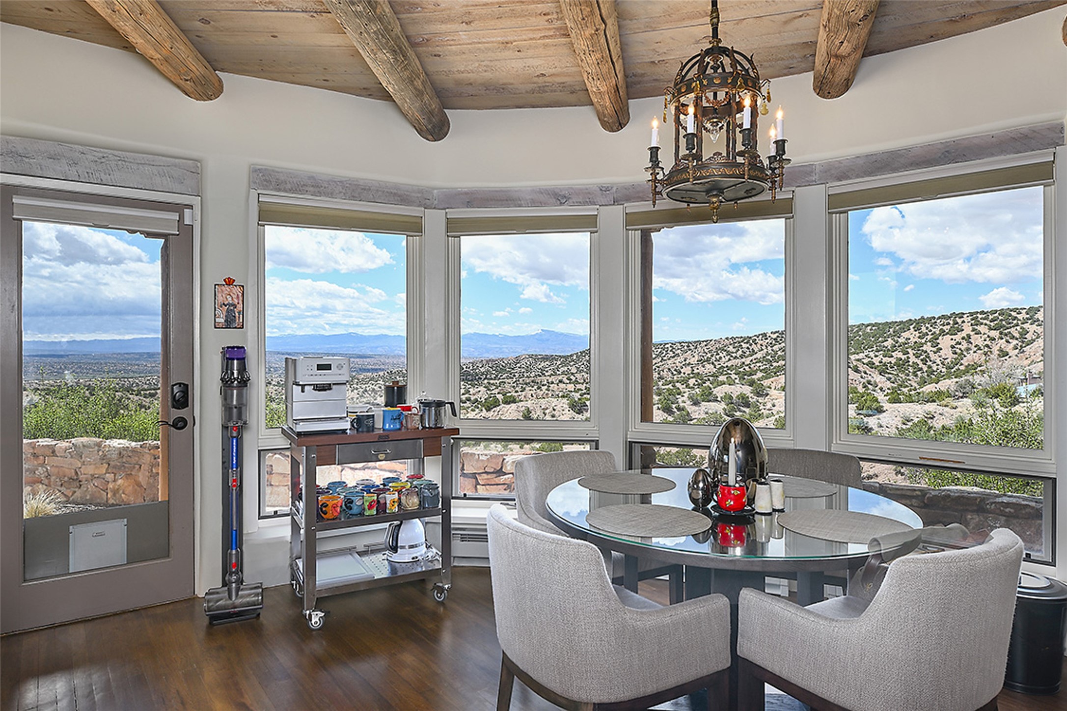 Rare opportunity to own this special 3-bedroom, 3 bath pueblo-style home in Tesuque. Enjoy spectacular mountain views and unparalleled scenery. Additional vacant lot included. Expansive contemporary kitchen and dining area is surrounded by large windows to capture views in multiple directions. A complete renovation in 2015 tastefully melds the original adobe style with a modern sensibility. The kitchen is light and white with elegant wood cabinetry and honed-granite artisanal island. The master suite overlooking the Jemez Mountain range has a sitting area, new stacked washer/dryer, walk-in closet with built-in dressers/ shelving. Master bath has a custom-crafted dual vanity, heated tile, and a glass-walled shower with views of the opera. Saltillo and hardwood flooring, niches, custom wrought iron railings/ balusters and vigas are throughout. Patios with pergola, outdoor kiva fireplace, masonry gas fire pit and grill provide space for al fresco dining and entertaining. Separate studio can double as a library, or office. Special features include wine cellar, media room with built-in 5:1 surround sound, built-in speakers inside/outside, irrigation system with mobile app, whole house water softener and 2 car garage. New retaining wall, coyote fencing, fully insulated kennel with A/C. Superb location less than a mile from the Four Seasons Resort, close to Tesuque Market and a short drive from both the Santa Fe Plaza and the Santa Fe Opera