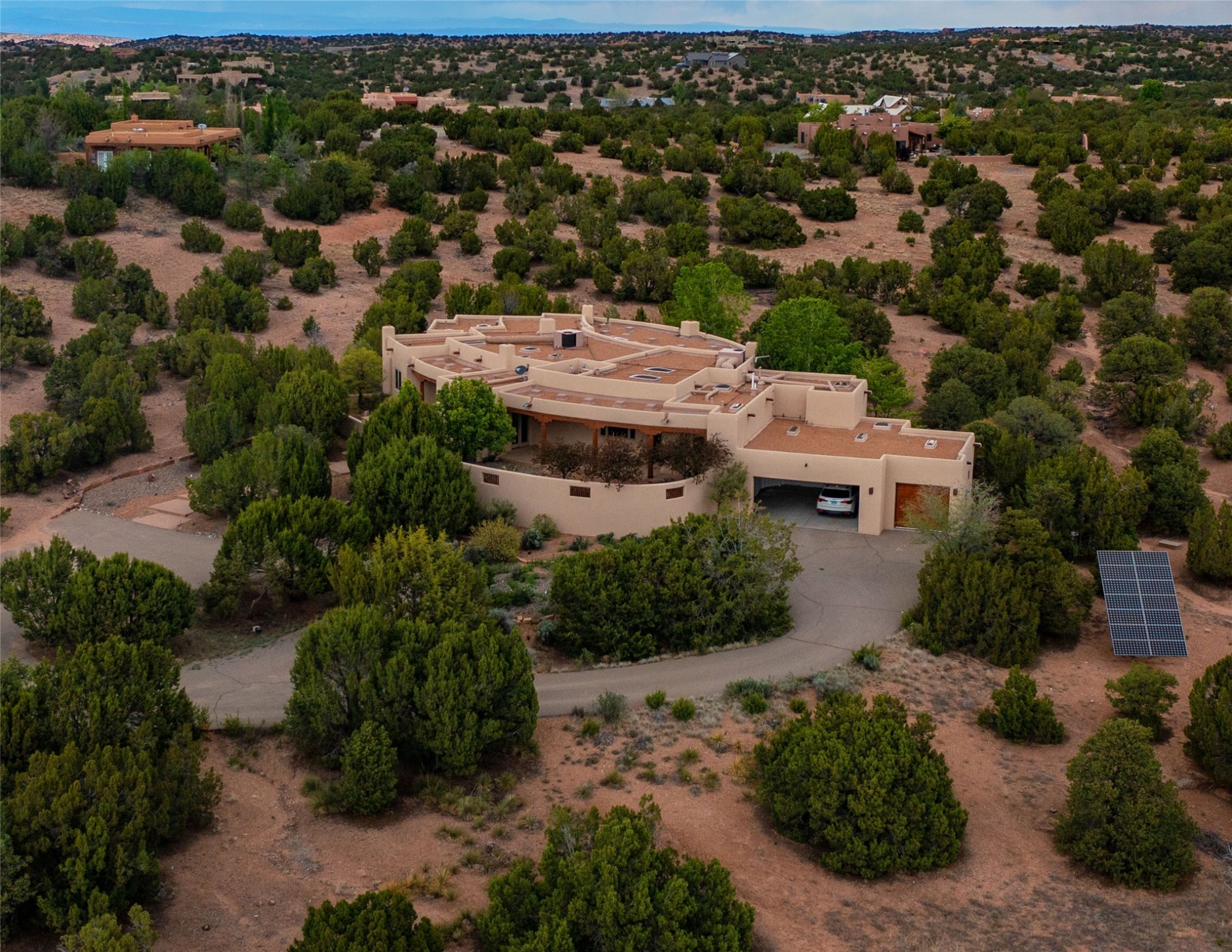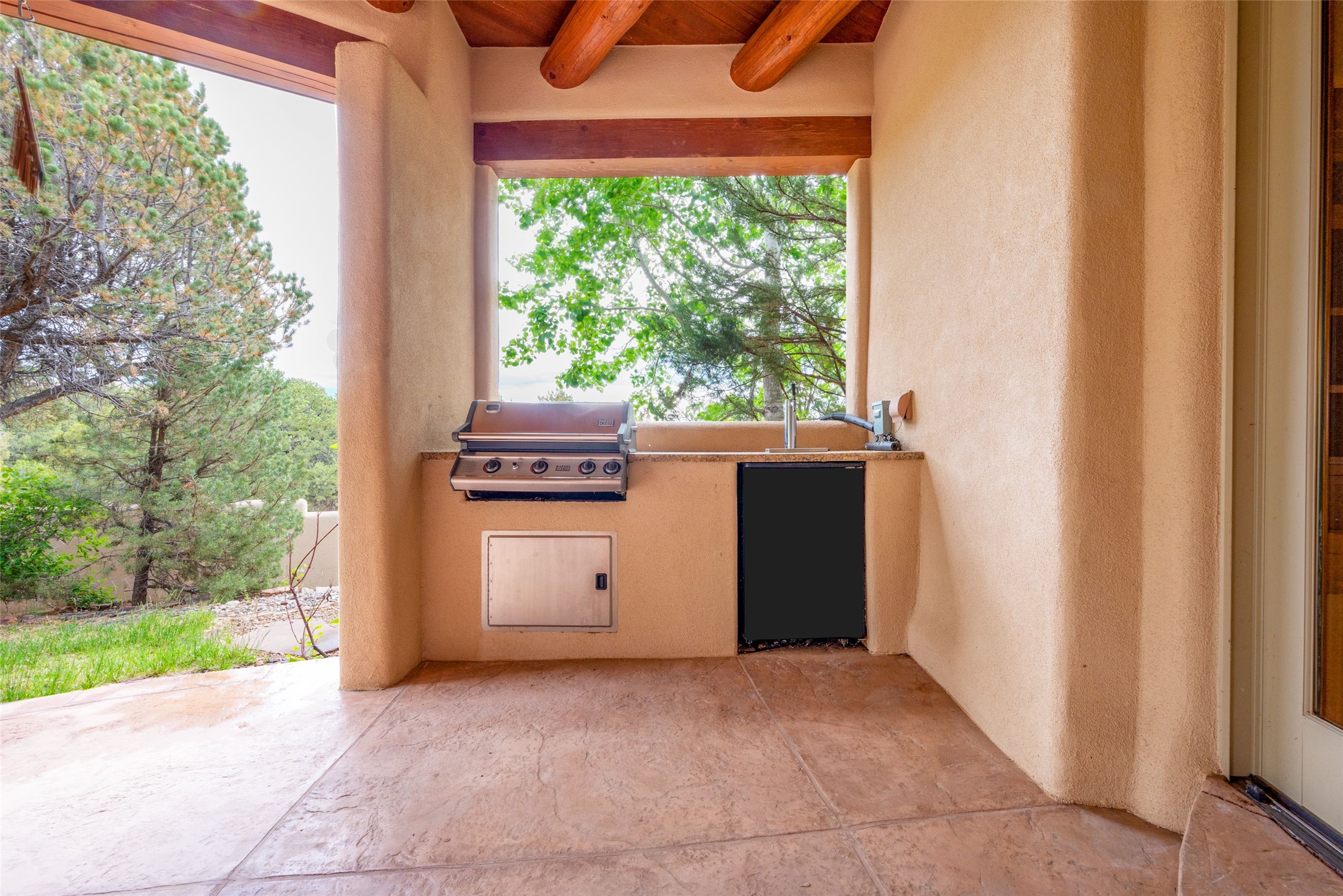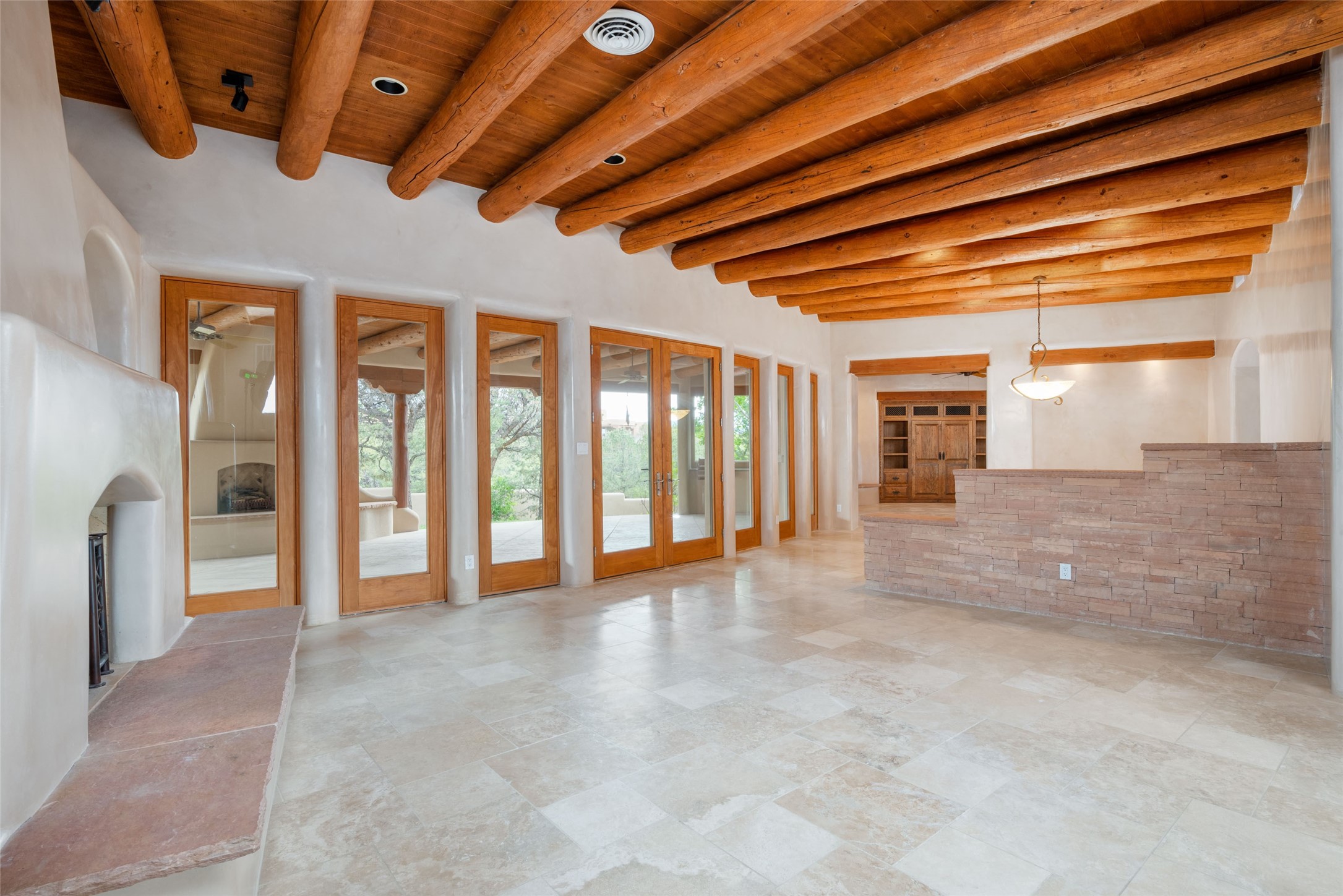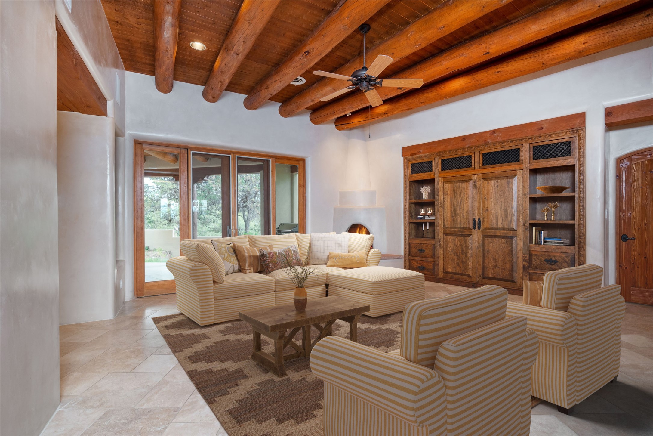 Minutes to downtown Santa Fe, this 4393 sqft single level 4 bedroom 3 1/2 bath home is sited on 2.5 acres. The open floor plan, plaster walls, vigas, and high ceilings welcome you into this traditional Santa Fe style home. A wine room, 4 interior and 2 exterior gas viga fireplaces, as well as skylights throughout, add to its charm. The covered portal is designed as an extension of the living areas and is accessible through multiple glass doors along the north side of the home. It includes a kiva fireplace, built-in Bar-B-Q, and refrigerator. The kitchen is spacious, open, and bright with a south-facing window that overlooks a private courtyard with forever views. This home also has a 9 ft bar that adjoins the family room with additional beautiful built-in custom cabinetry. The walk-in pantry has floor-to-ceiling shelving and is conveniently located off the kitchen. The primary bedroom suite includes a large bath with his & her vanities, jetted tub, oversized shower and walk-in closet. The suite also has a fully walled courtyard for a private retreat. There are two ensuite bedrooms with private baths and walk-in closets, as well as an additional bedroom that can be used as an office. This solar-powered home includes a 3 car garage, radiant heat and two HVAC units for additional heating and refrigerated air. County Assessor shows the square footage at 4393 which differs from the floor plan provided. Neither Listing Brokers nor Seller warrant the square footage of the home or lot. If size of the home or lot are of material consideration to the Buyer, then the Buyer should have them measured. Tax Levy is from the Assessor website. All fires depicted are photo-shopped. Buyer to verify functionality of the fireplaces.