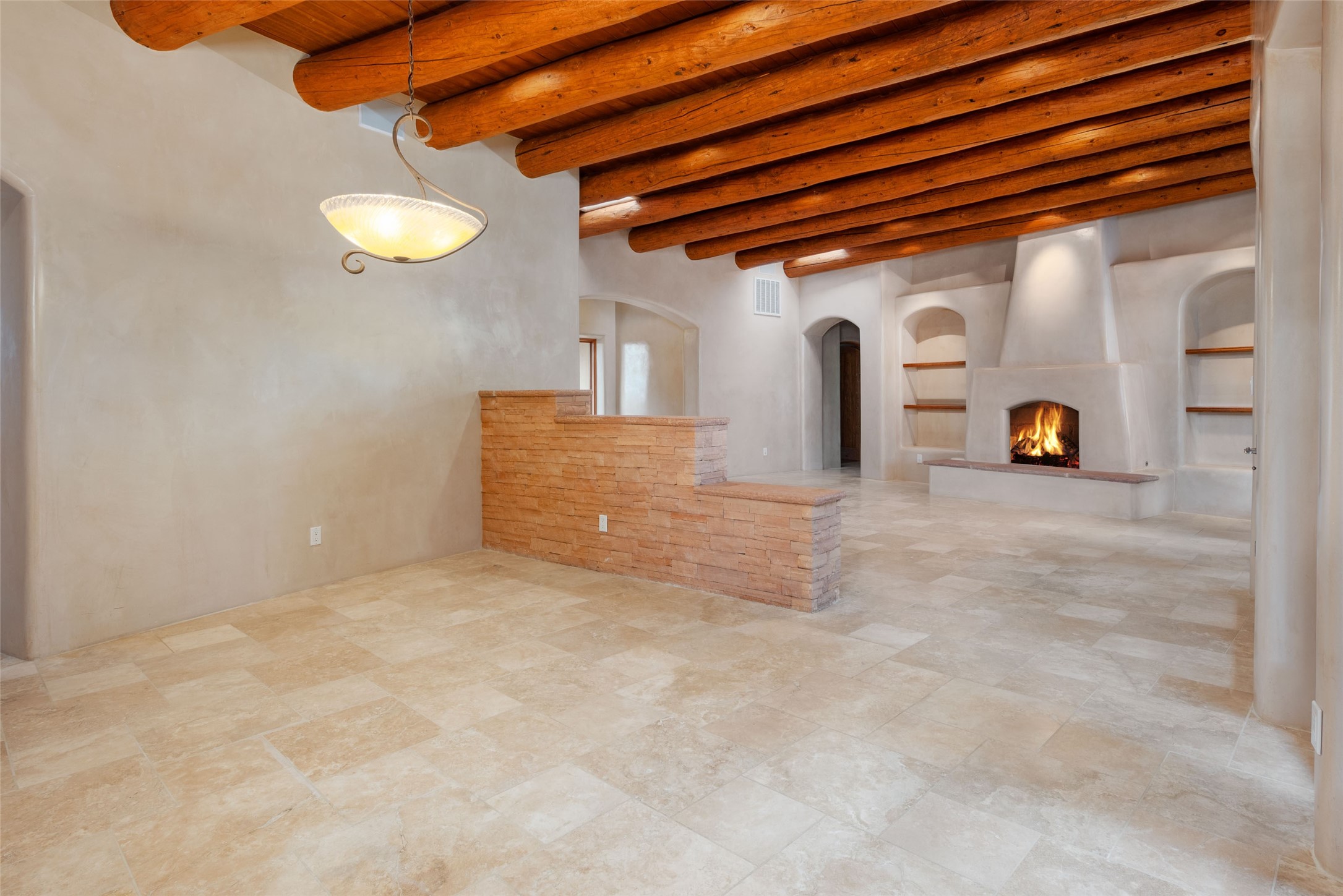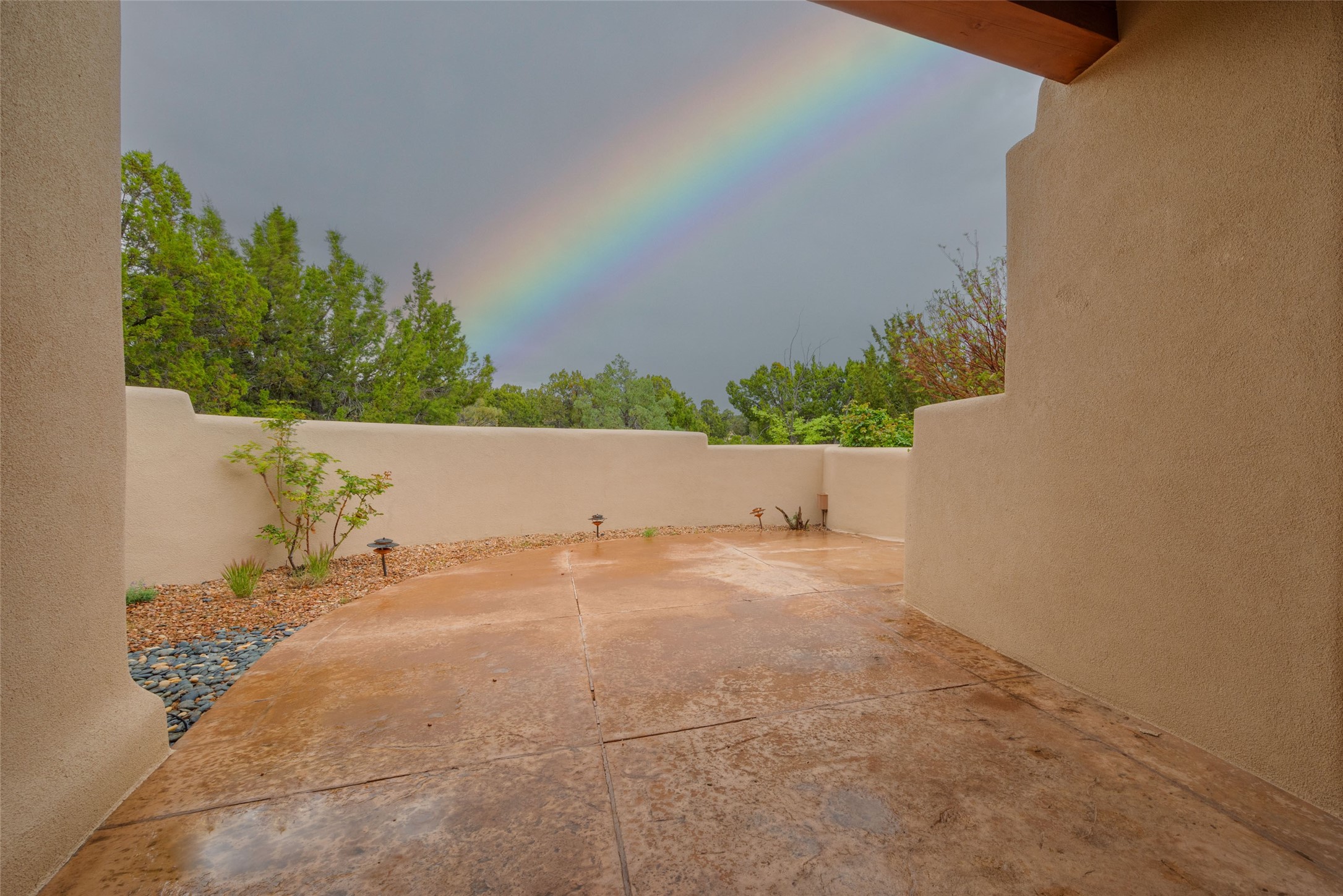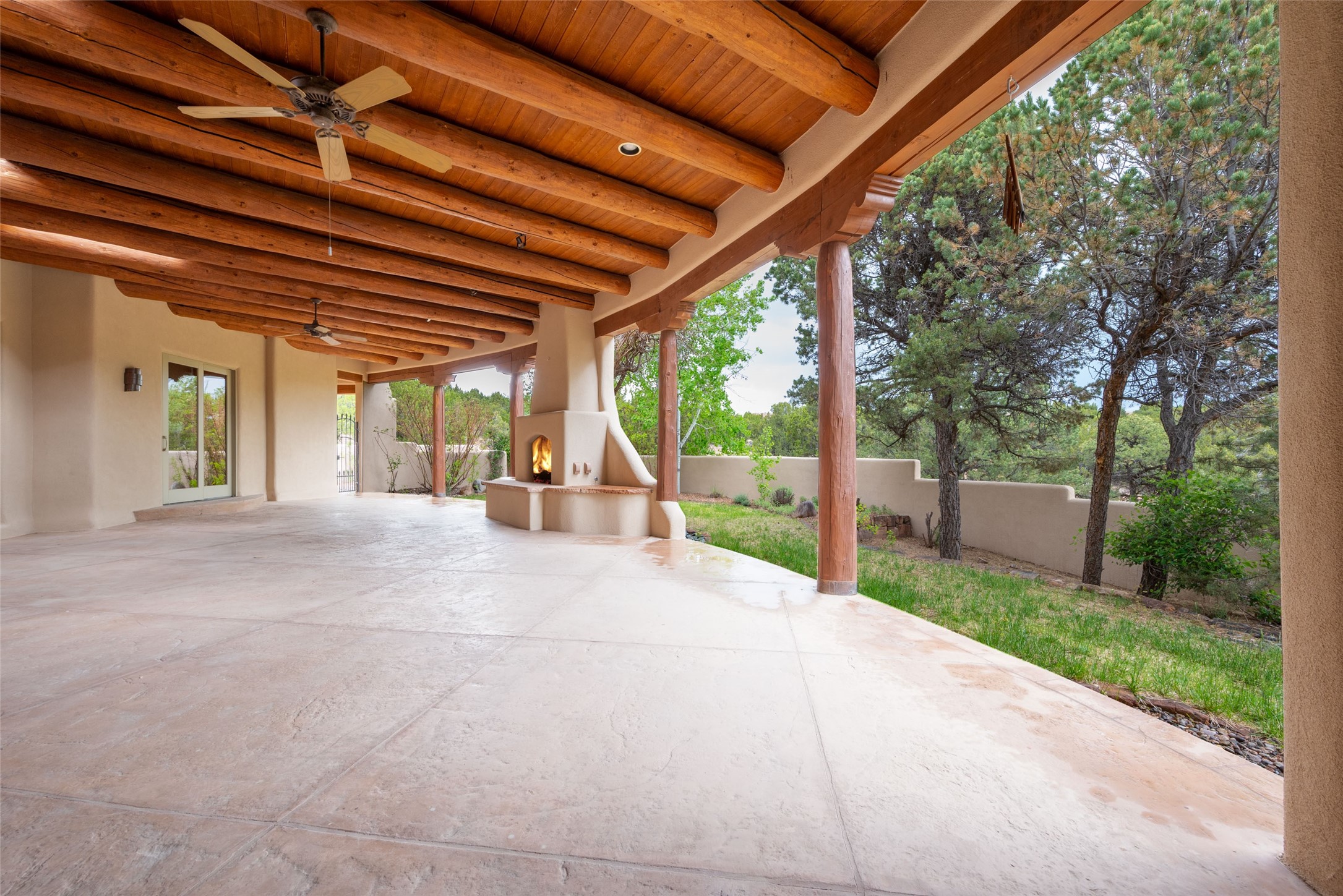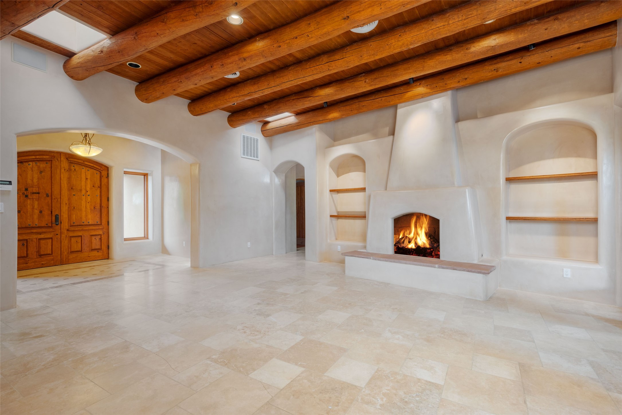 Minutes to downtown Santa Fe, this 4393 sqft single level 4 bedroom 3 1/2 bath home is sited on 2.5 acres. The open floor plan, plaster walls, vigas, and high ceilings welcome you into this traditional Santa Fe style home. A wine room, 4 interior and 2 exterior gas viga fireplaces, as well as skylights throughout, add to its charm. The covered portal is designed as an extension of the living areas and is accessible through multiple glass doors along the north side of the home. It includes a kiva fireplace, built-in Bar-B-Q, and refrigerator. The kitchen is spacious, open, and bright with a south-facing window that overlooks a private courtyard with forever views. This home also has a 9 ft bar that adjoins the family room with additional beautiful built-in custom cabinetry. The walk-in pantry has floor-to-ceiling shelving and is conveniently located off the kitchen. The primary bedroom suite includes a large bath with his & her vanities, jetted tub, oversized shower and walk-in closet. The suite also has a fully walled courtyard for a private retreat. There are two ensuite bedrooms with private baths and walk-in closets, as well as an additional bedroom that can be used as an office. This solar-powered home includes a 3 car garage, radiant heat and two HVAC units for additional heating and refrigerated air. County Assessor shows the square footage at 4393 which differs from the floor plan provided. Neither Listing Brokers nor Seller warrant the square footage of the home or lot. If size of the home or lot are of material consideration to the Buyer, then the Buyer should have them measured. Tax Levy is from the Assessor website. All fires depicted are photo-shopped. Buyer to verify functionality of the fireplaces.