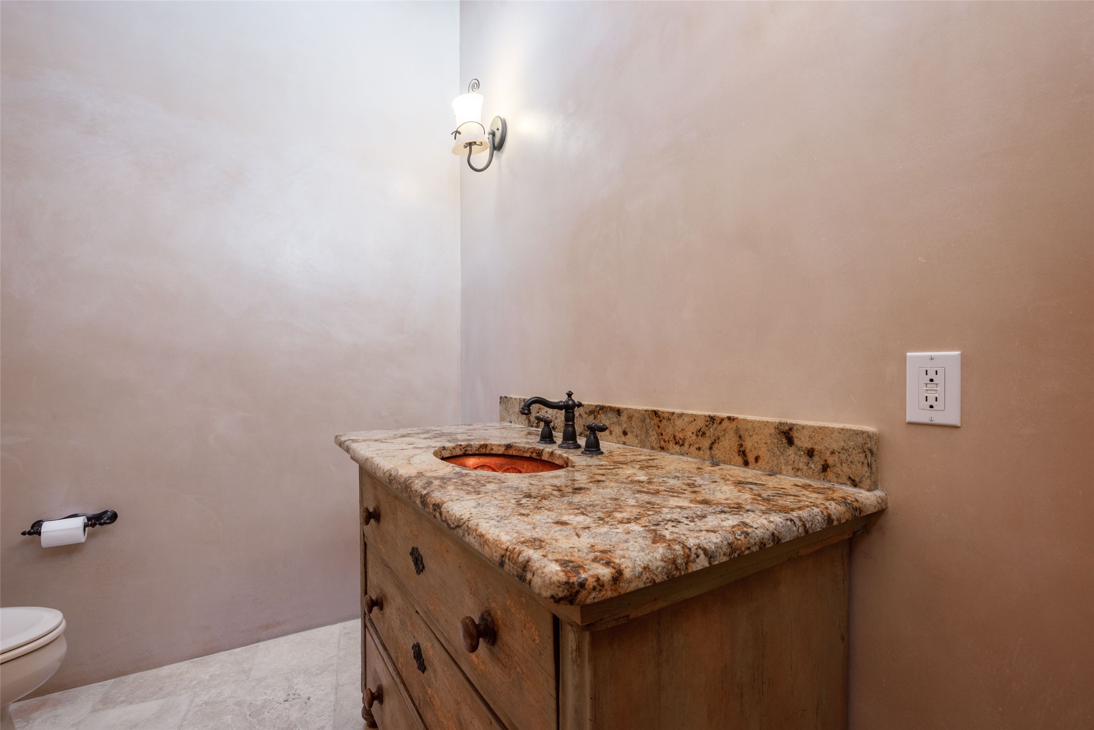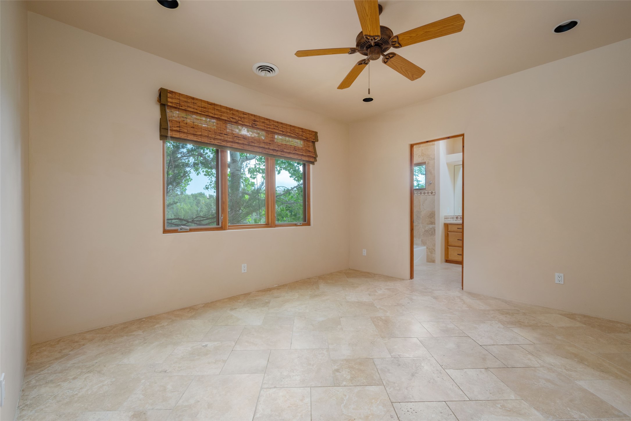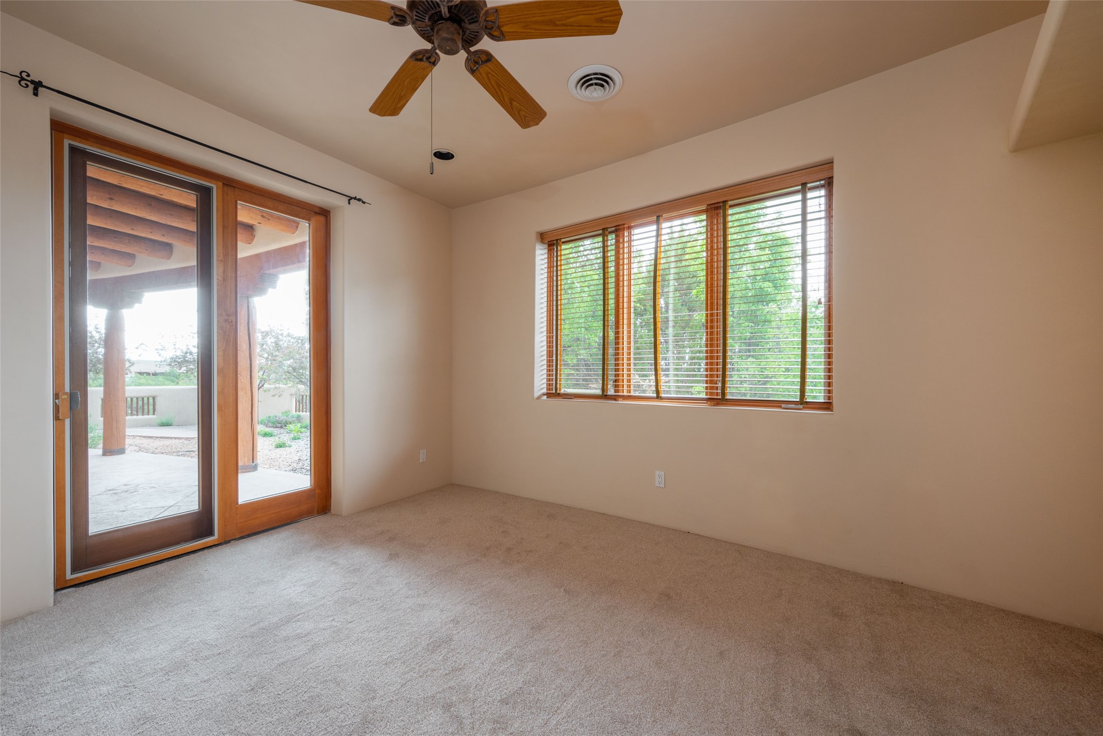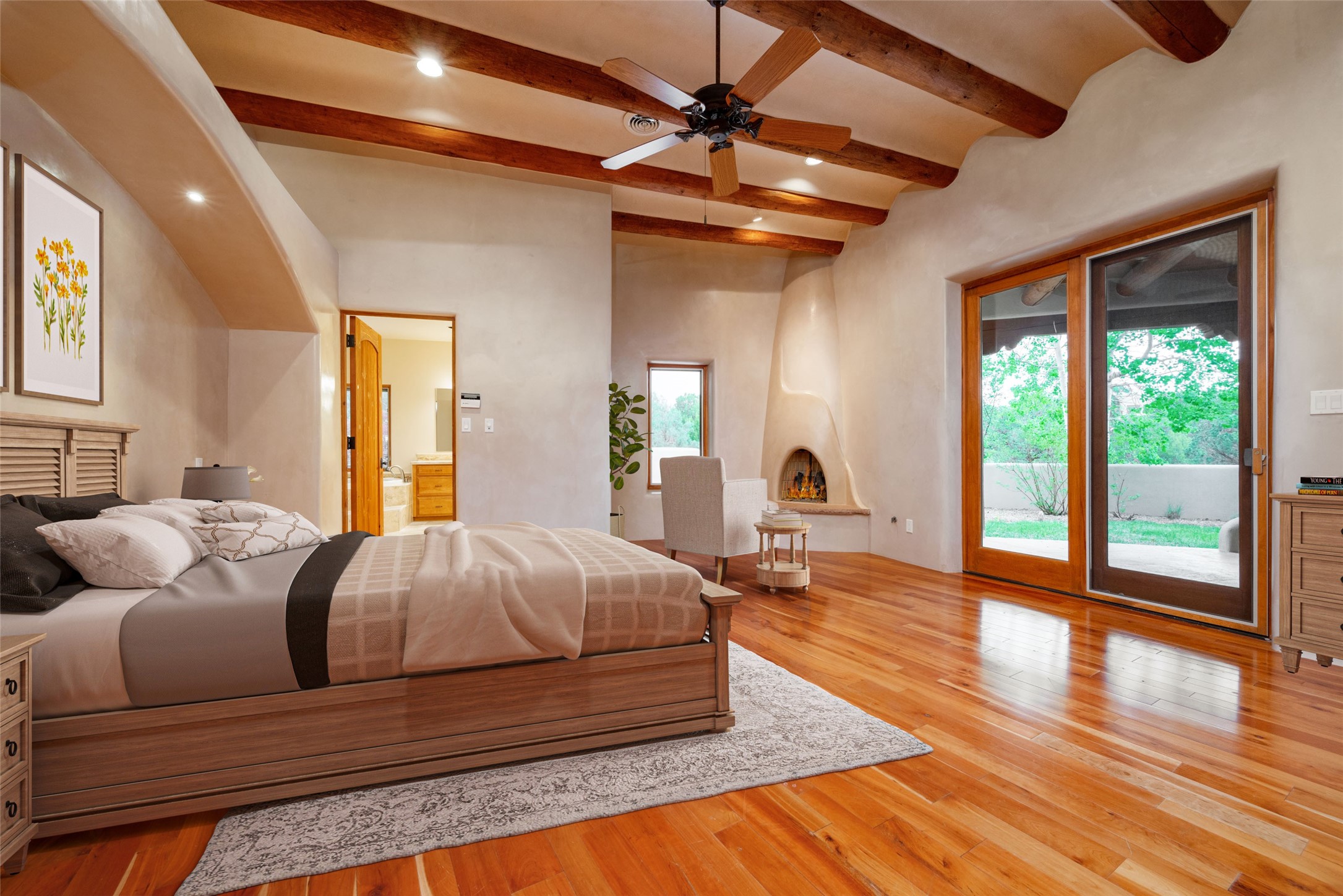 Minutes to downtown Santa Fe, this 4393 sqft single level 4 bedroom 3 1/2 bath home is sited on 2.5 acres. The open floor plan, plaster walls, vigas, and high ceilings welcome you into this traditional Santa Fe style home. A wine room, 4 interior and 2 exterior gas viga fireplaces, as well as skylights throughout, add to its charm. The covered portal is designed as an extension of the living areas and is accessible through multiple glass doors along the north side of the home. It includes a kiva fireplace, built-in Bar-B-Q, and refrigerator. The kitchen is spacious, open, and bright with a south-facing window that overlooks a private courtyard with forever views. This home also has a 9 ft bar that adjoins the family room with additional beautiful built-in custom cabinetry. The walk-in pantry has floor-to-ceiling shelving and is conveniently located off the kitchen. The primary bedroom suite includes a large bath with his & her vanities, jetted tub, oversized shower and walk-in closet. The suite also has a fully walled courtyard for a private retreat. There are two ensuite bedrooms with private baths and walk-in closets, as well as an additional bedroom that can be used as an office. This solar-powered home includes a 3 car garage, radiant heat and two HVAC units for additional heating and refrigerated air. County Assessor shows the square footage at 4393 which differs from the floor plan provided. Neither Listing Brokers nor Seller warrant the square footage of the home or lot. If size of the home or lot are of material consideration to the Buyer, then the Buyer should have them measured. Tax Levy is from the Assessor website. All fires depicted are photo-shopped. Buyer to verify functionality of the fireplaces.