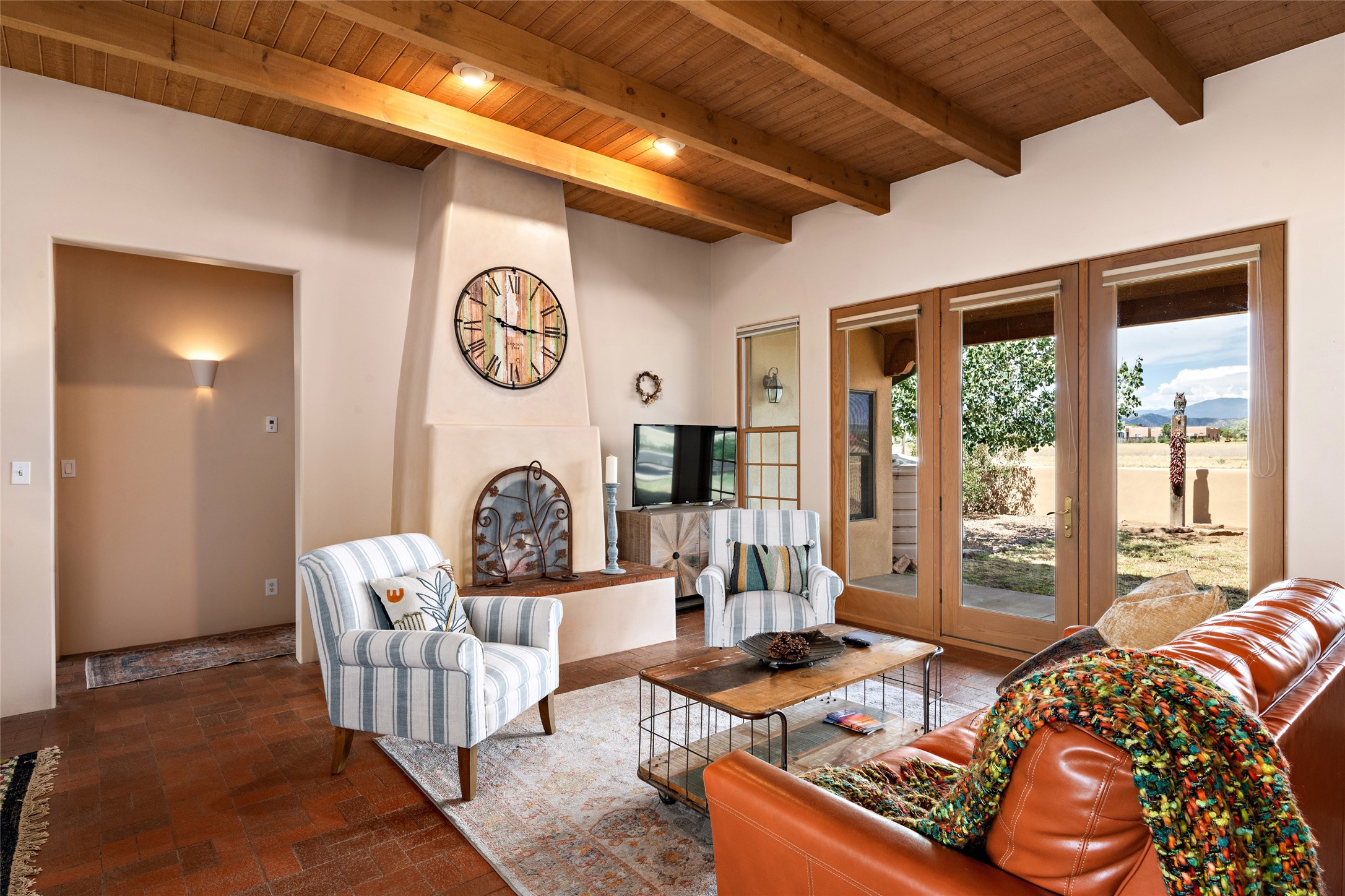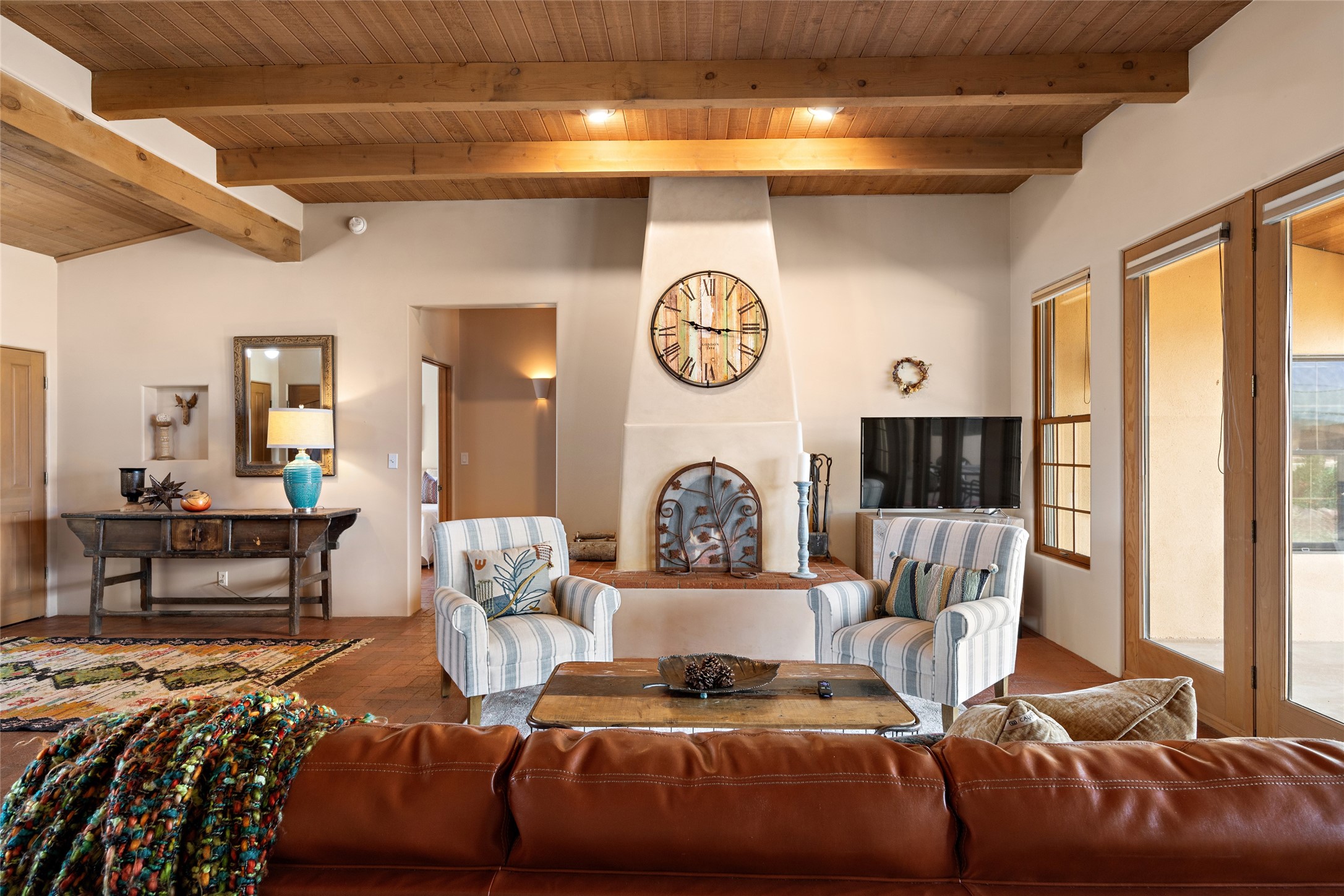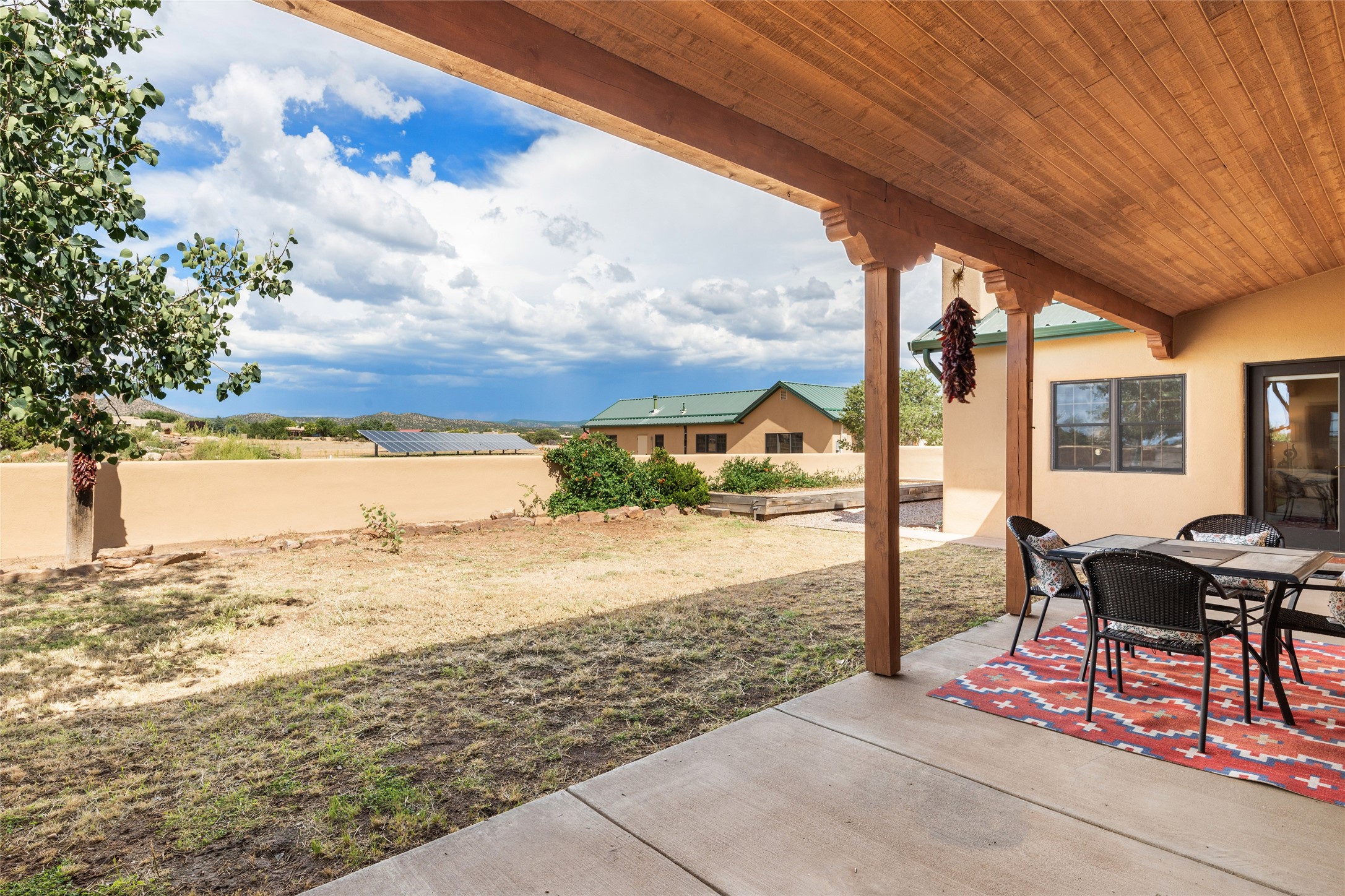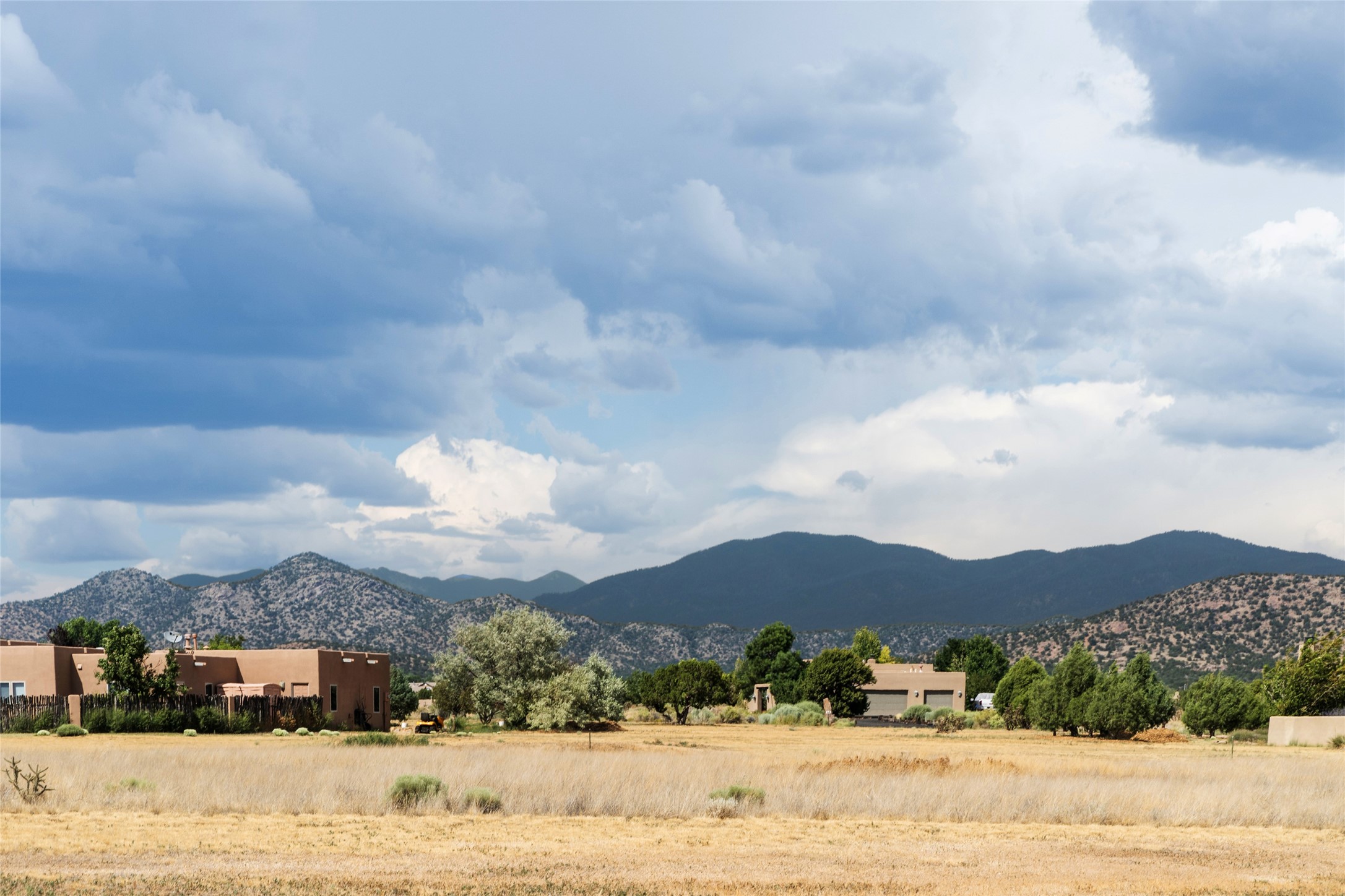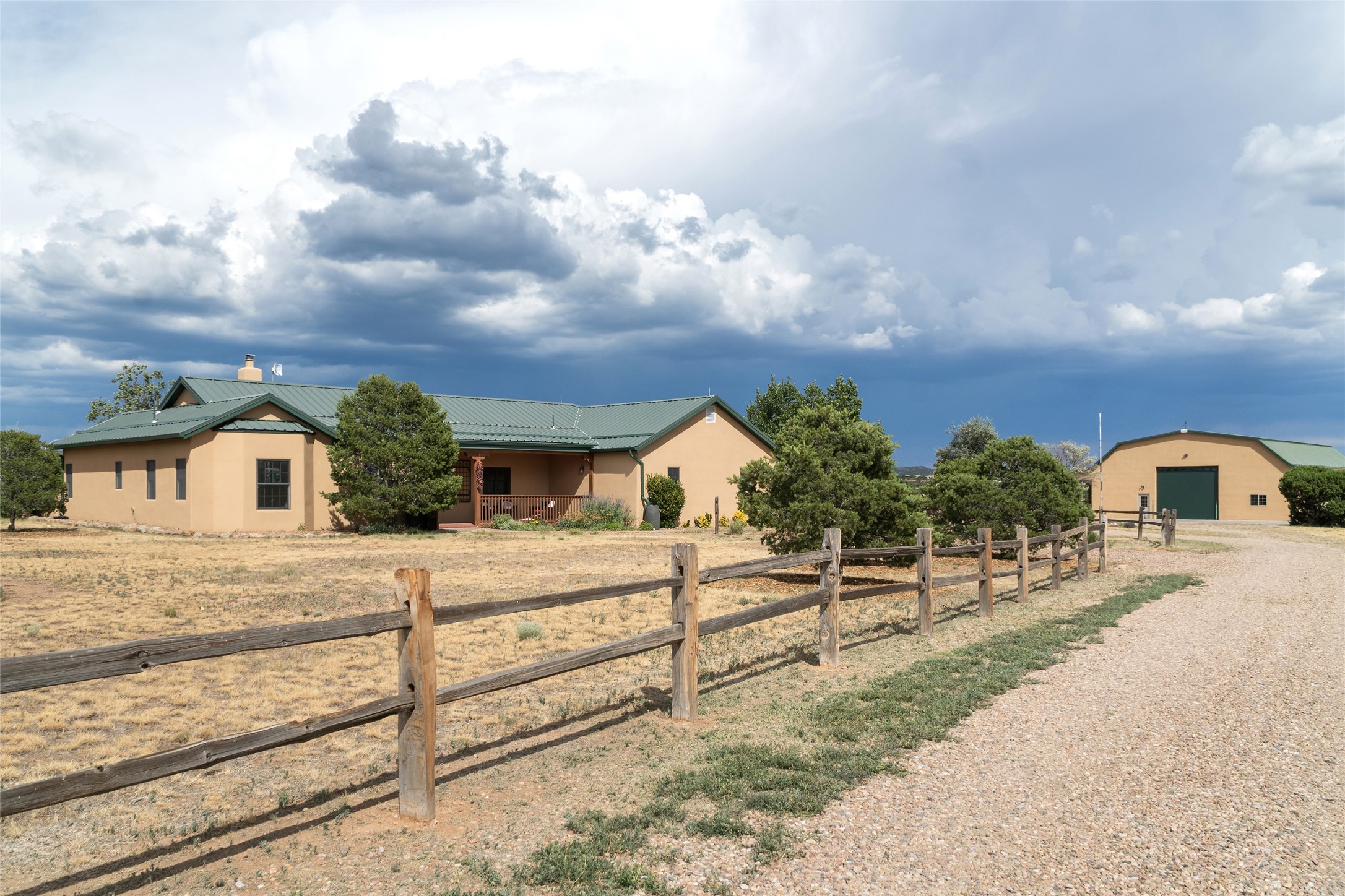 Vistas in every direction can be enjoyed from this lovely ranchette located on 10 acres in desirable Los Caballos. The 1,816 SqFt home lives large due to its open floor plan, gracious bedroom separation and beautiful finish quality throughout including brick floors, beamed & planked ceilings, elegant fireplaces and numerous windows filling the spaces with natural light. The primary bedroom opens onto the north-facing portal and hosts a double vanity and walk-in closet. A separate 1,700 SqFt. 1 bed/1 bath casita is privately sited and includes a spacious, multi-purpose living room, plus a kitchen/dining area. Ample storage and hobby space are available in both the heated 3-car garage and the 3,000 SqFt studio/shop/garage which includes a heated office and half bath, two EV chargers and three RV hookups. This well-maintained property has the advantages of solar power, water catchment, two septic systems and a pitched metal roof. Located near the amenities offered in the Agora shopping center, the trails in the Galisteo Basin Preserve and only 20 minutes to Historic Santa Fe.