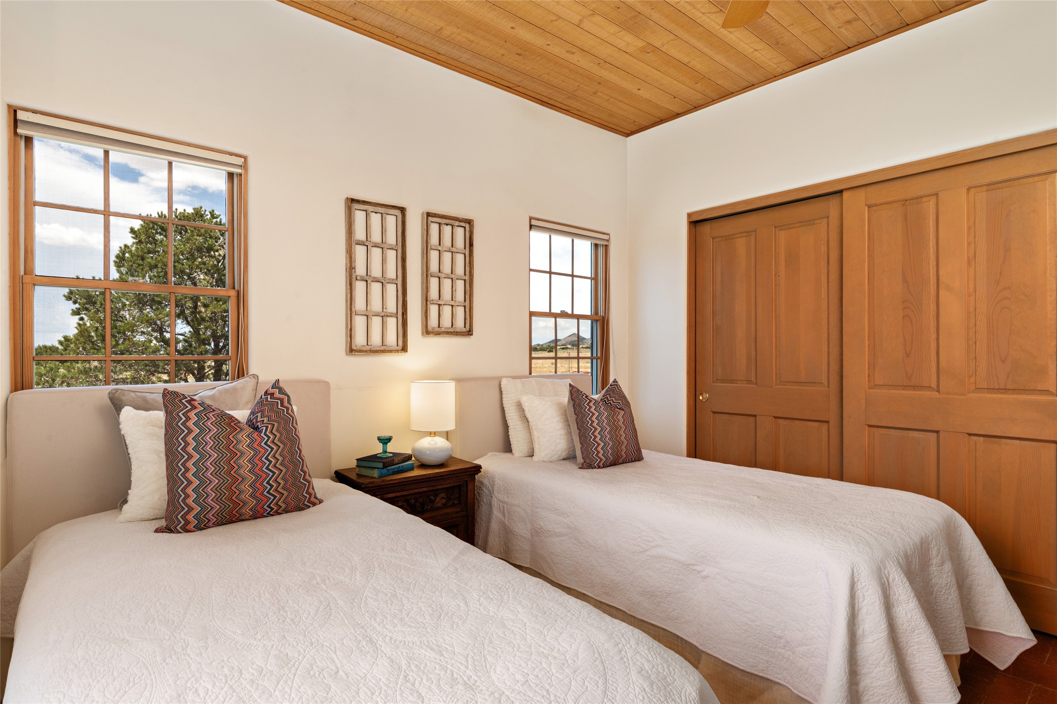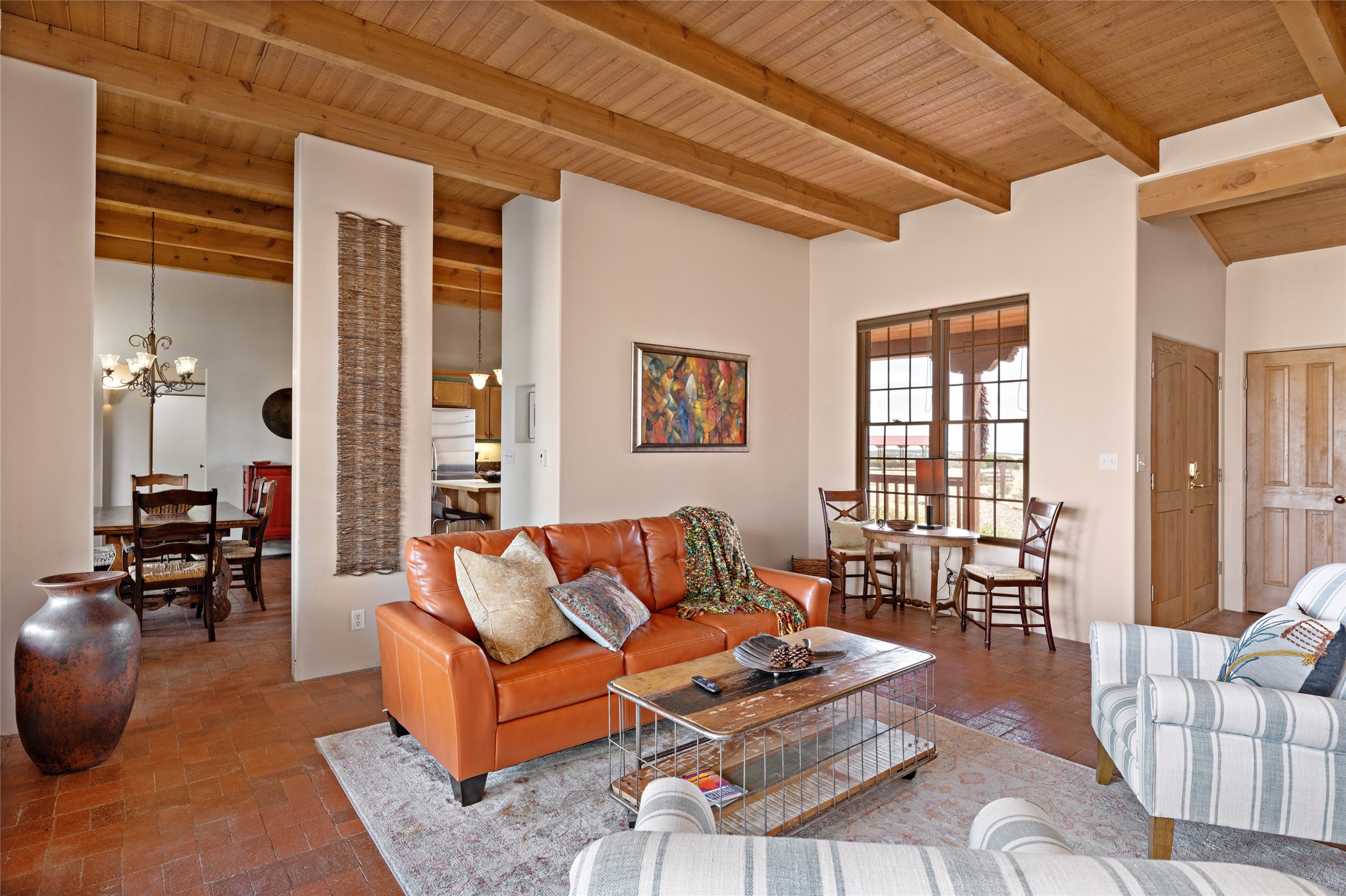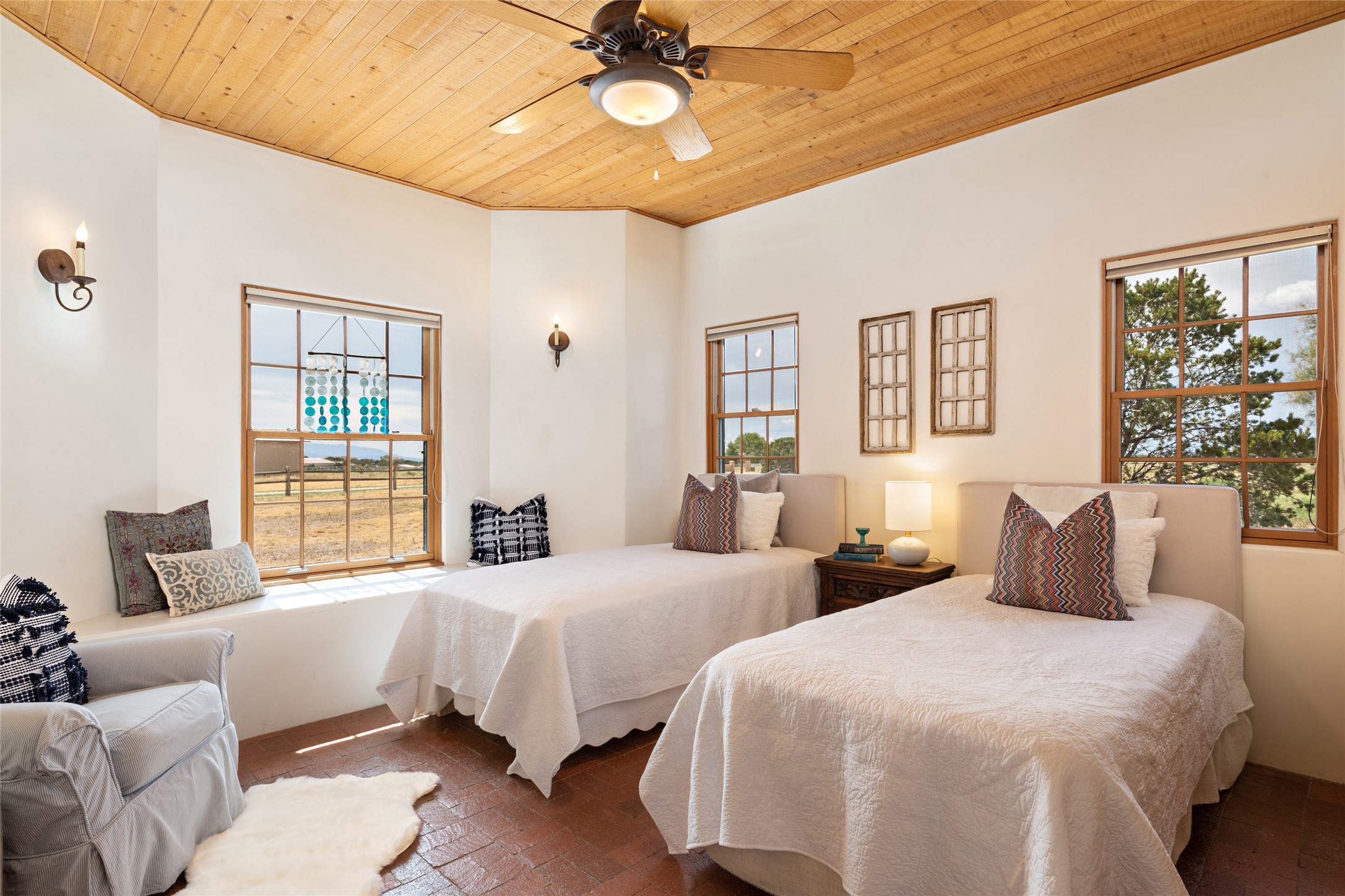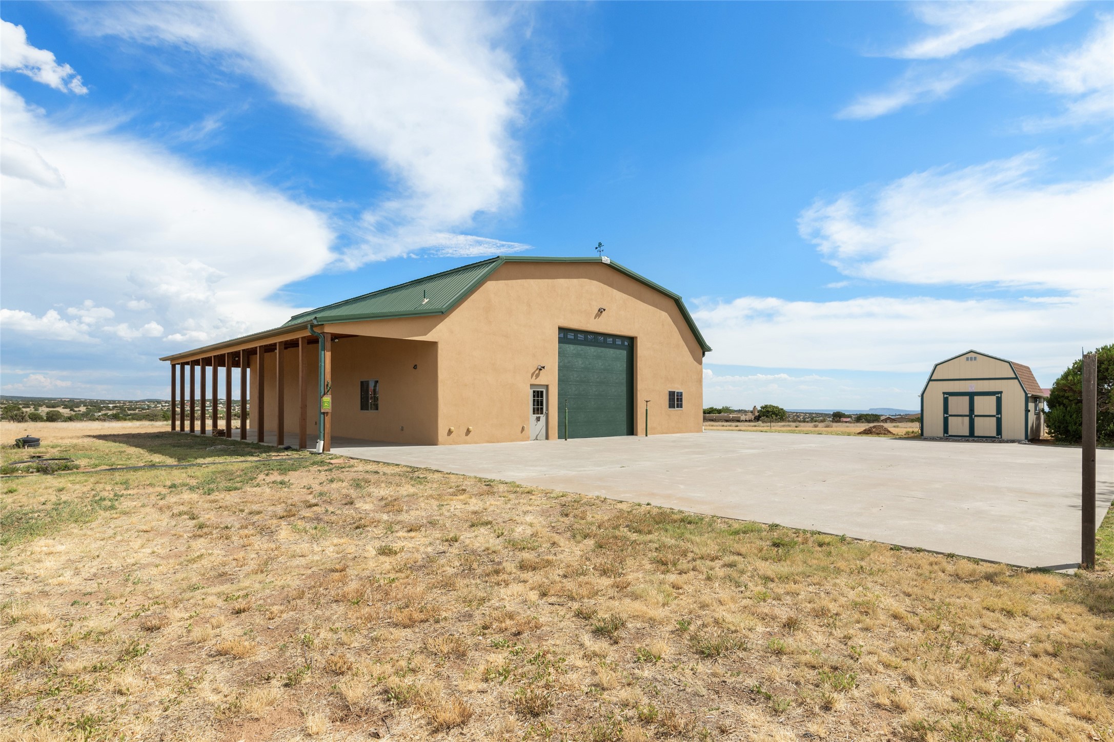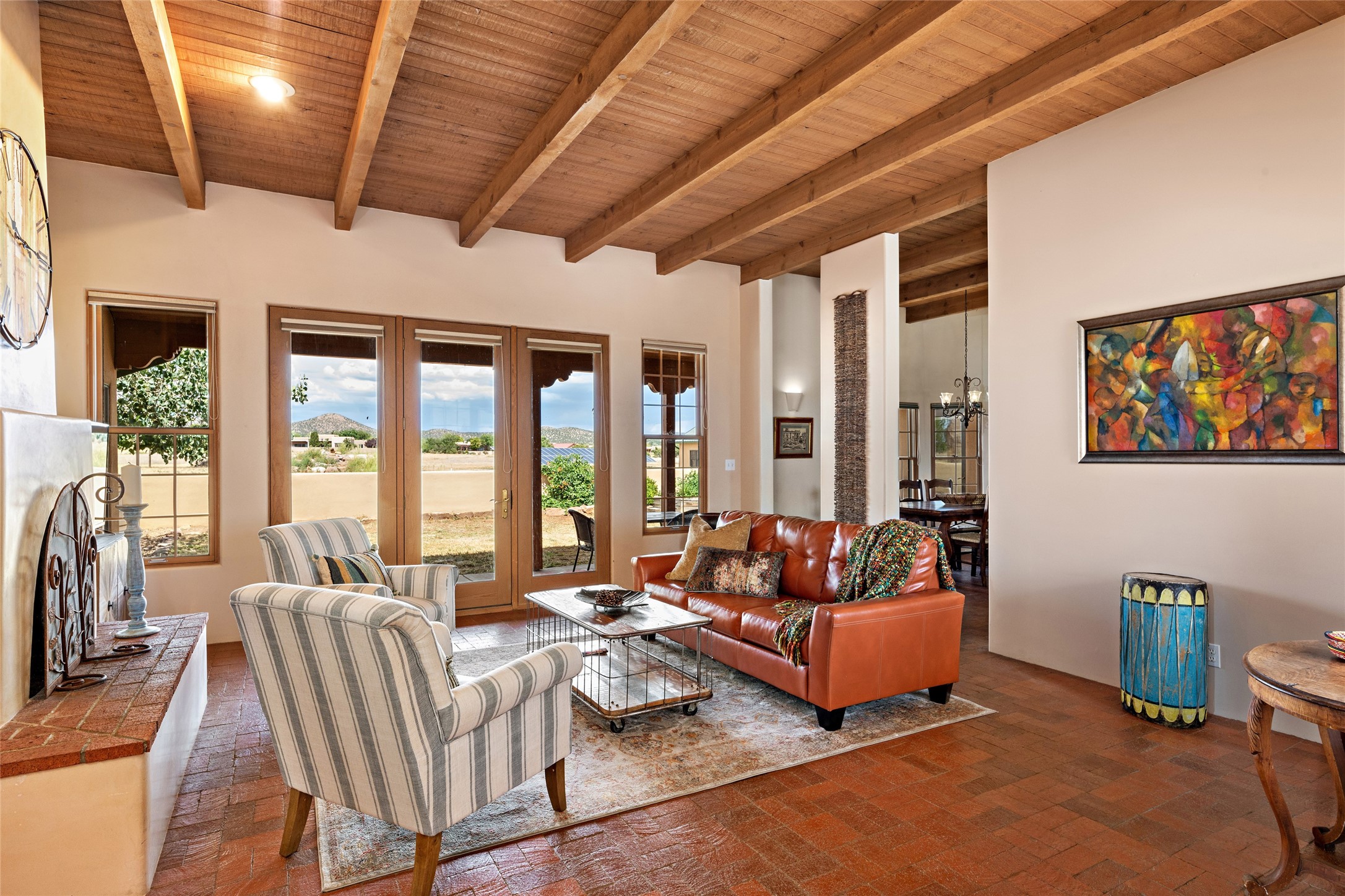 Vistas in every direction can be enjoyed from this lovely ranchette located on 10 acres in desirable Los Caballos. The 1,816 SqFt home lives large due to its open floor plan, gracious bedroom separation and beautiful finish quality throughout including brick floors, beamed & planked ceilings, elegant fireplaces and numerous windows filling the spaces with natural light. The primary bedroom opens onto the north-facing portal and hosts a double vanity and walk-in closet. A separate 1,700 SqFt. 1 bed/1 bath casita is privately sited and includes a spacious, multi-purpose living room, plus a kitchen/dining area. Ample storage and hobby space are available in both the heated 3-car garage and the 3,000 SqFt studio/shop/garage which includes a heated office and half bath, two EV chargers and three RV hookups. This well-maintained property has the advantages of solar power, water catchment, two septic systems and a pitched metal roof. Located near the amenities offered in the Agora shopping center, the trails in the Galisteo Basin Preserve and only 20 minutes to Historic Santa Fe.