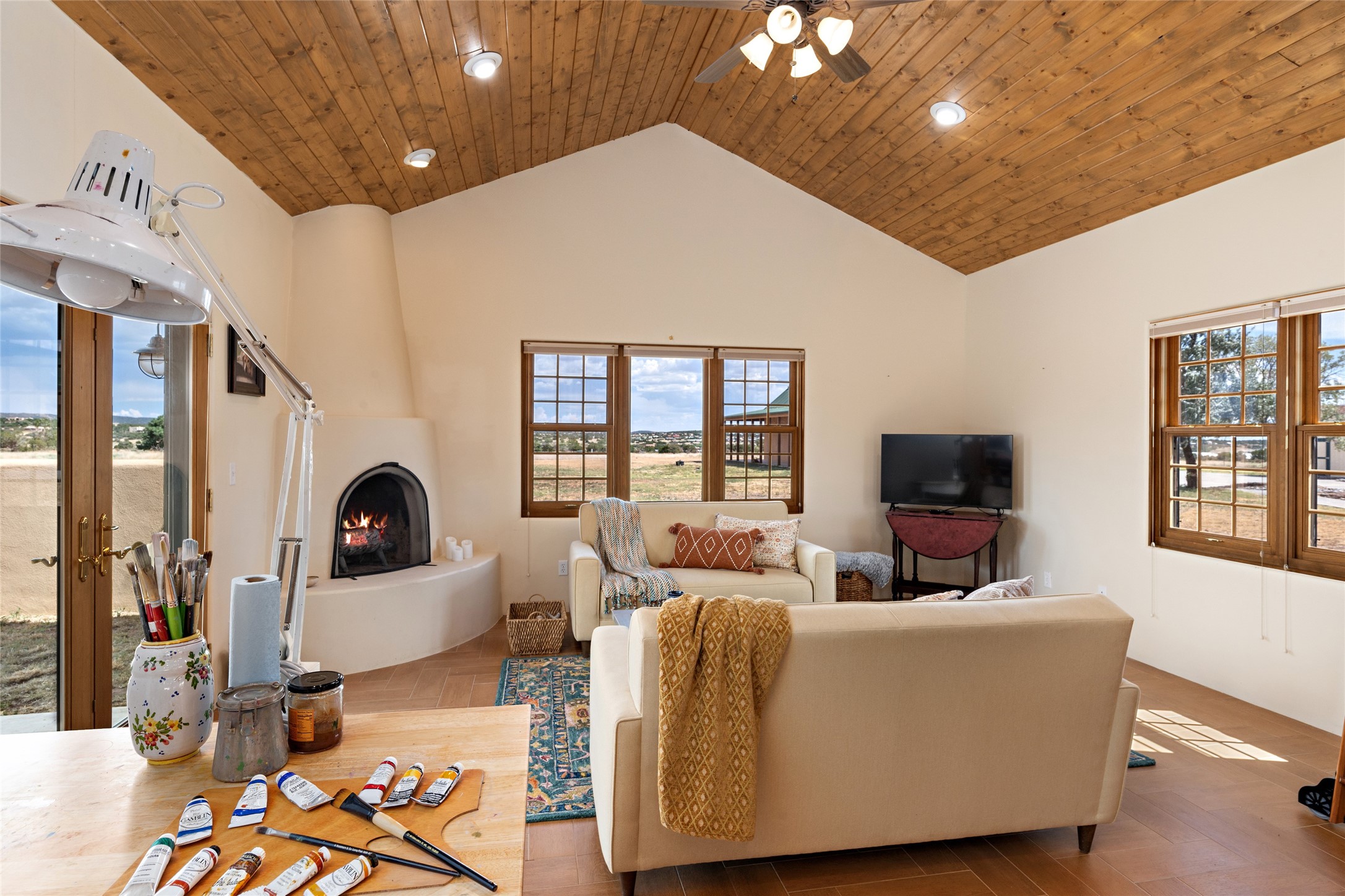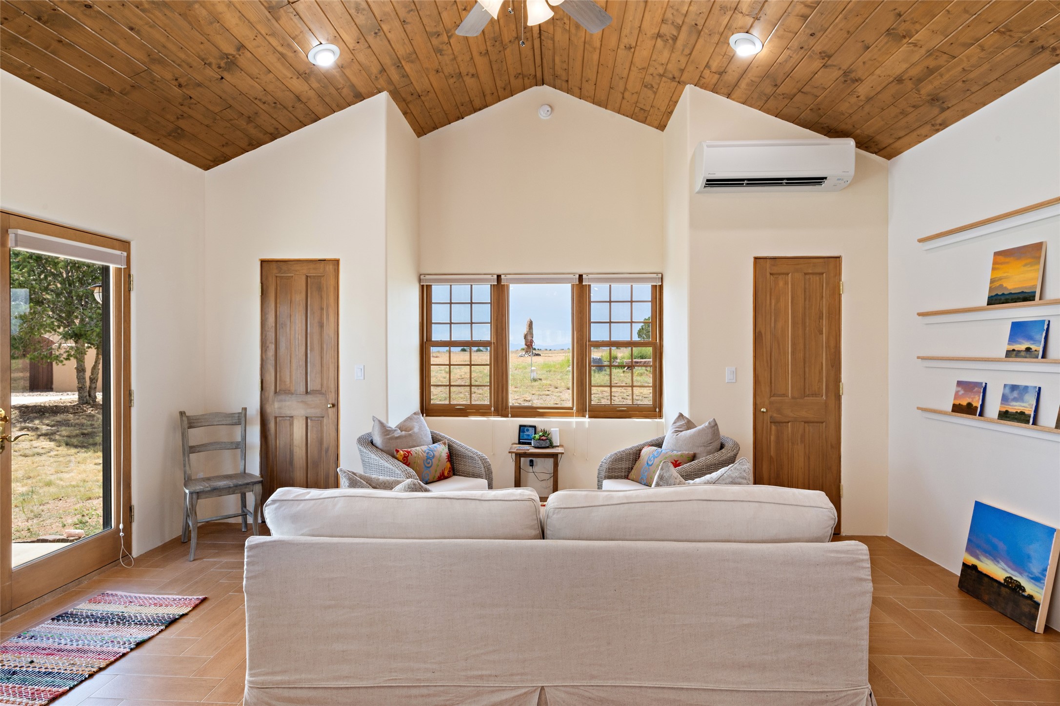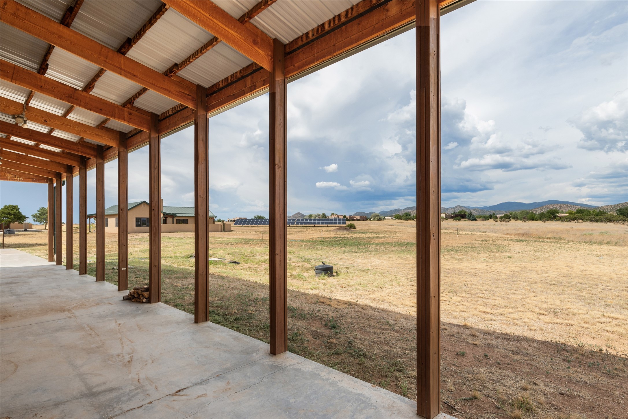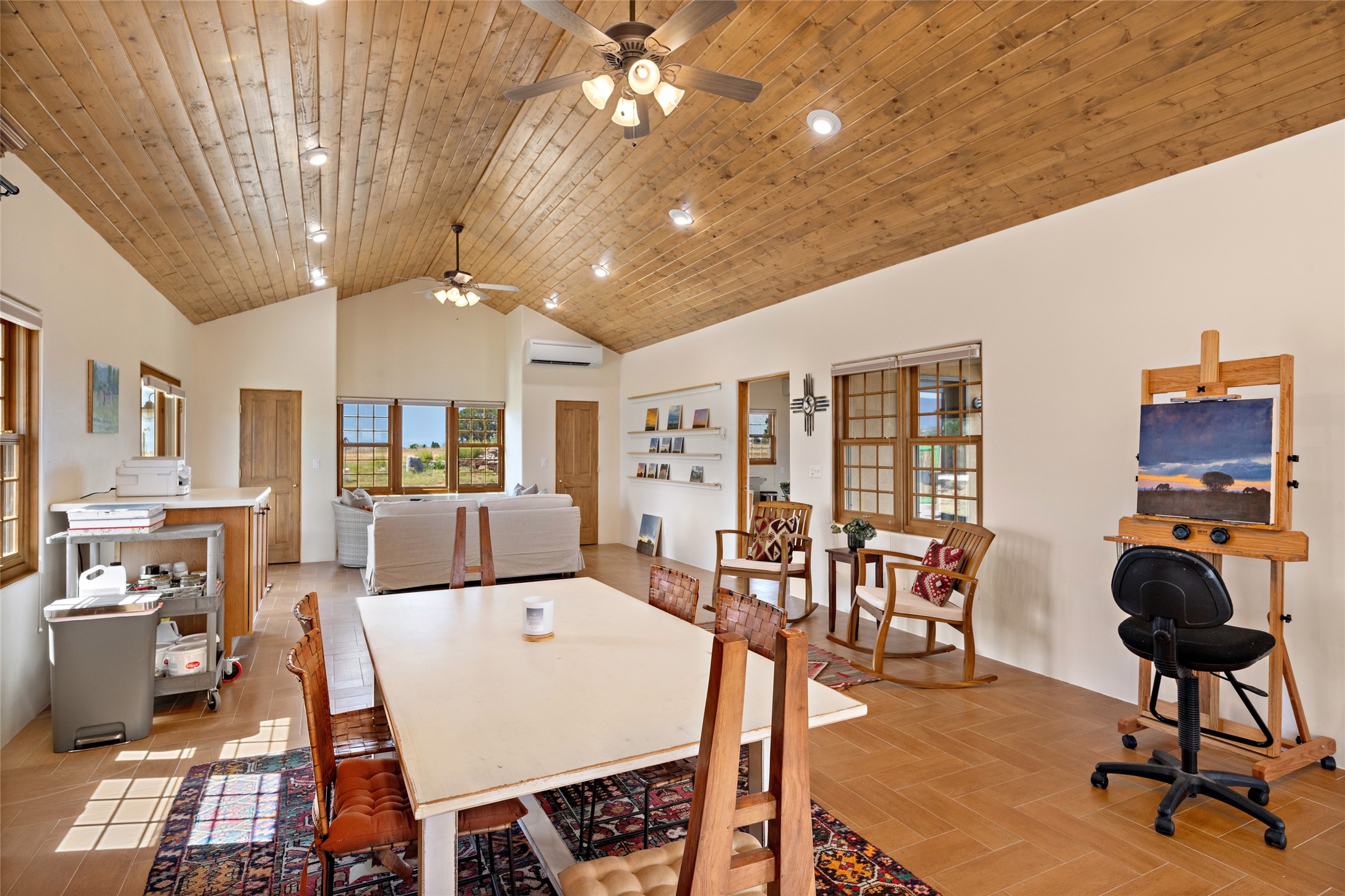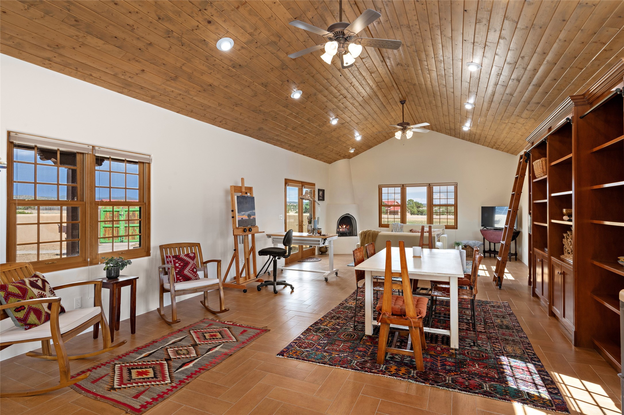 Vistas in every direction can be enjoyed from this lovely ranchette located on 10 acres in desirable Los Caballos. The 1,816 SqFt home lives large due to its open floor plan, gracious bedroom separation and beautiful finish quality throughout including brick floors, beamed & planked ceilings, elegant fireplaces and numerous windows filling the spaces with natural light. The primary bedroom opens onto the north-facing portal and hosts a double vanity and walk-in closet. A separate 1,700 SqFt. 1 bed/1 bath casita is privately sited and includes a spacious, multi-purpose living room, plus a kitchen/dining area. Ample storage and hobby space are available in both the heated 3-car garage and the 3,000 SqFt studio/shop/garage which includes a heated office and half bath, two EV chargers and three RV hookups. This well-maintained property has the advantages of solar power, water catchment, two septic systems and a pitched metal roof. Located near the amenities offered in the Agora shopping center, the trails in the Galisteo Basin Preserve and only 20 minutes to Historic Santa Fe.