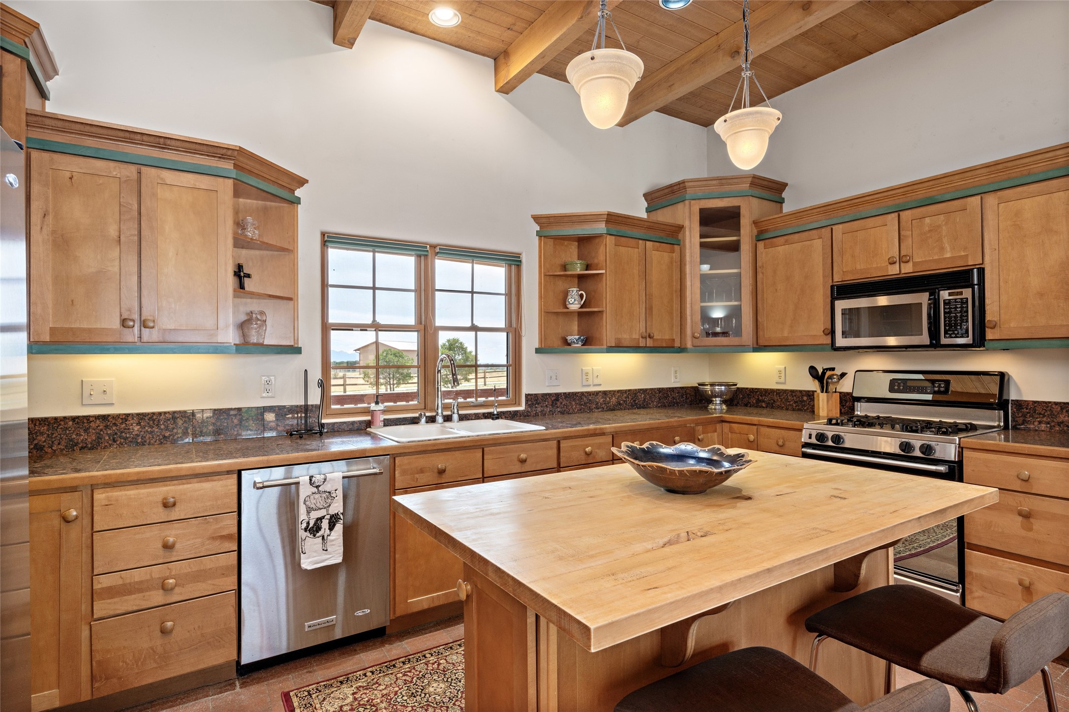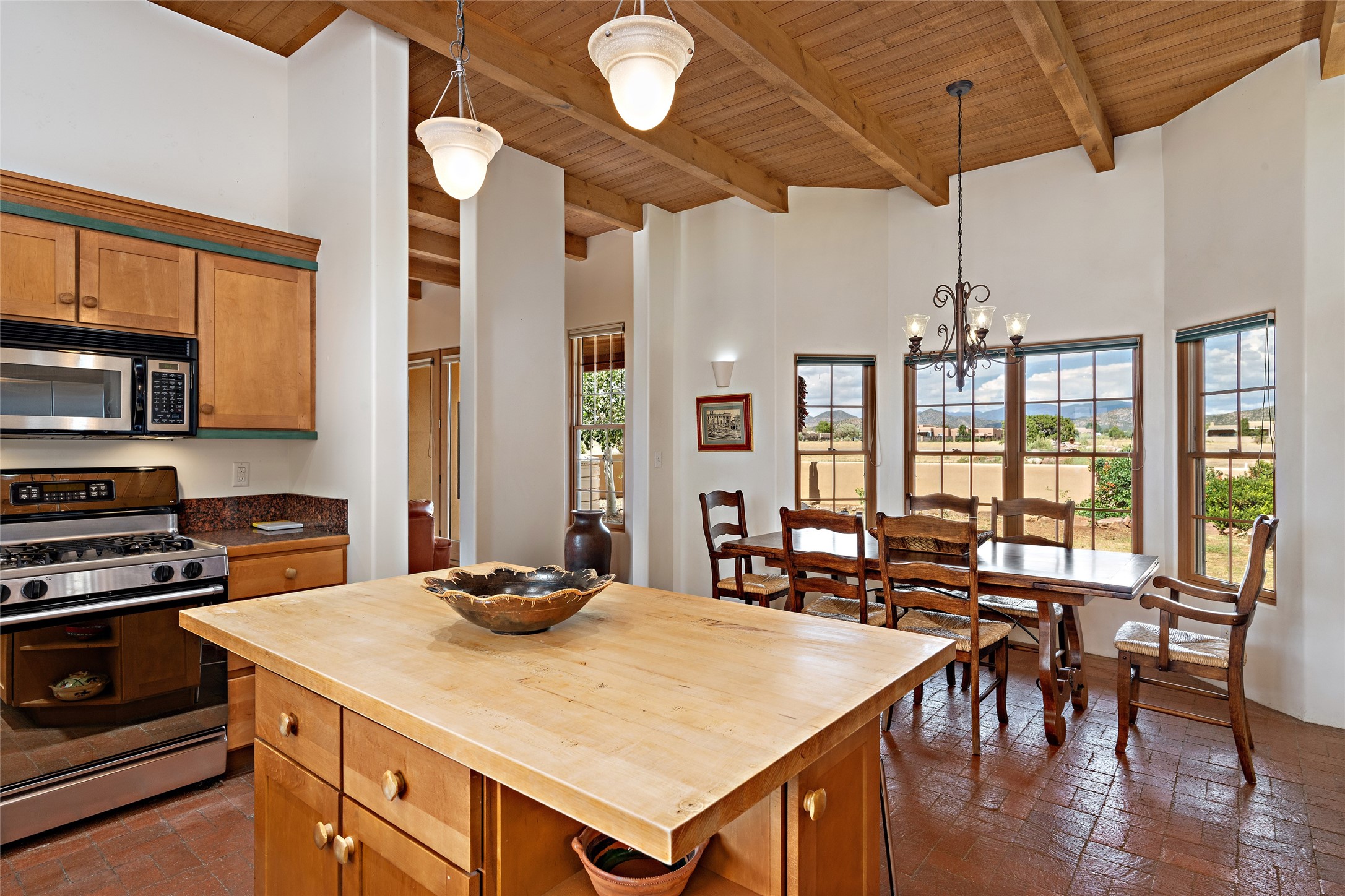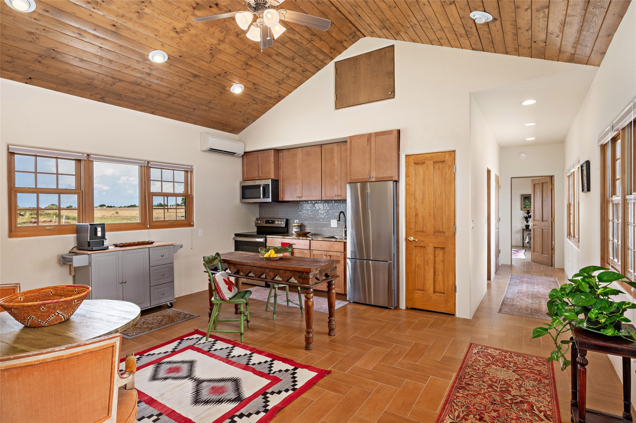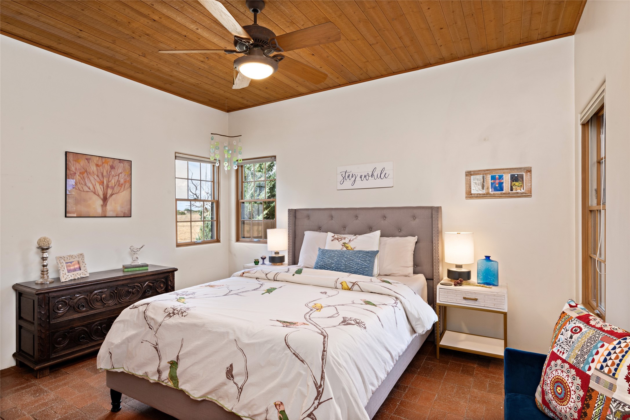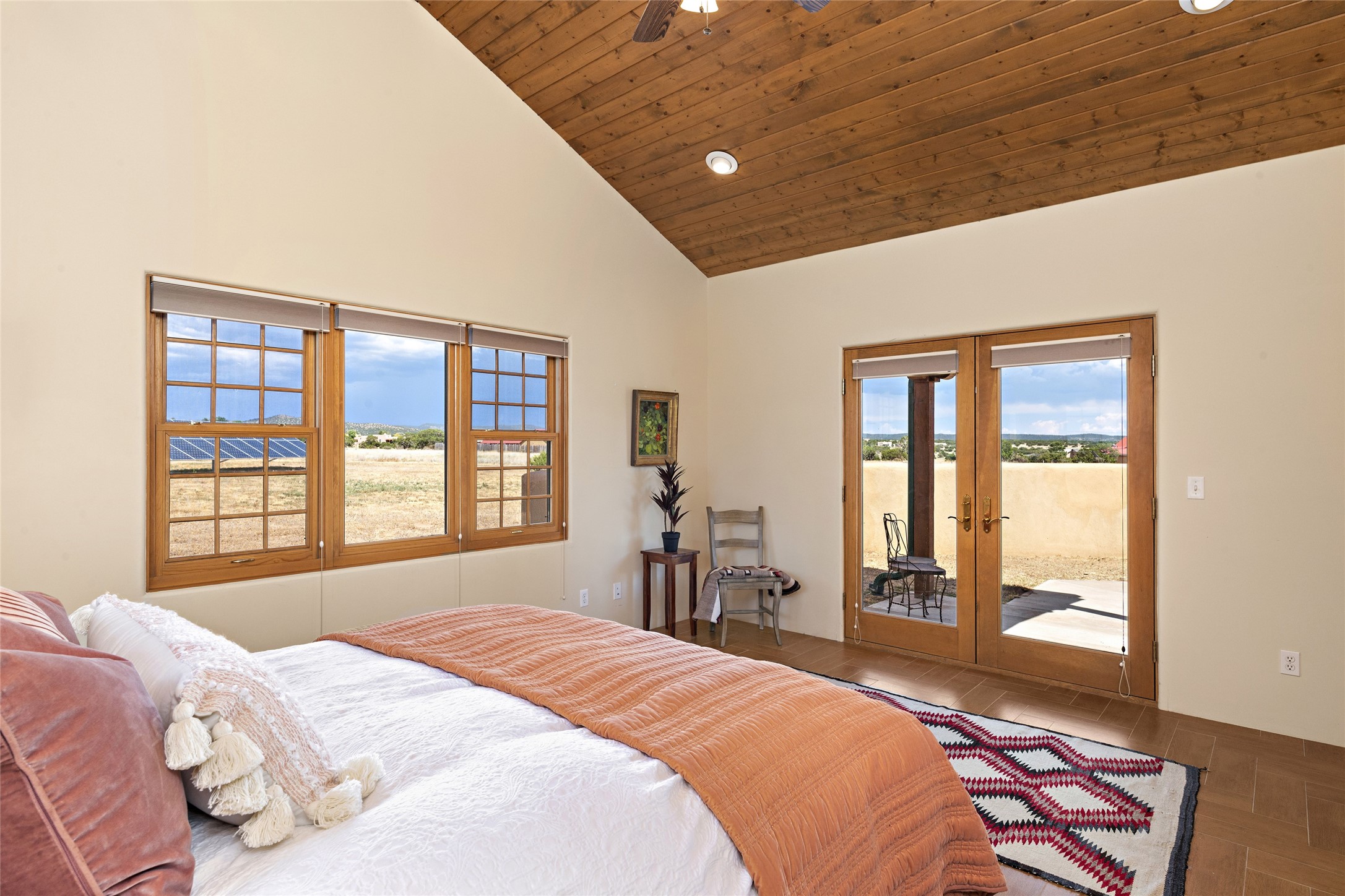 Vistas in every direction can be enjoyed from this lovely ranchette located on 10 acres in desirable Los Caballos. The 1,816 SqFt home lives large due to its open floor plan, gracious bedroom separation and beautiful finish quality throughout including brick floors, beamed & planked ceilings, elegant fireplaces and numerous windows filling the spaces with natural light. The primary bedroom opens onto the north-facing portal and hosts a double vanity and walk-in closet. A separate 1,700 SqFt. 1 bed/1 bath casita is privately sited and includes a spacious, multi-purpose living room, plus a kitchen/dining area. Ample storage and hobby space are available in both the heated 3-car garage and the 3,000 SqFt studio/shop/garage which includes a heated office and half bath, two EV chargers and three RV hookups. This well-maintained property has the advantages of solar power, water catchment, two septic systems and a pitched metal roof. Located near the amenities offered in the Agora shopping center, the trails in the Galisteo Basin Preserve and only 20 minutes to Historic Santa Fe.