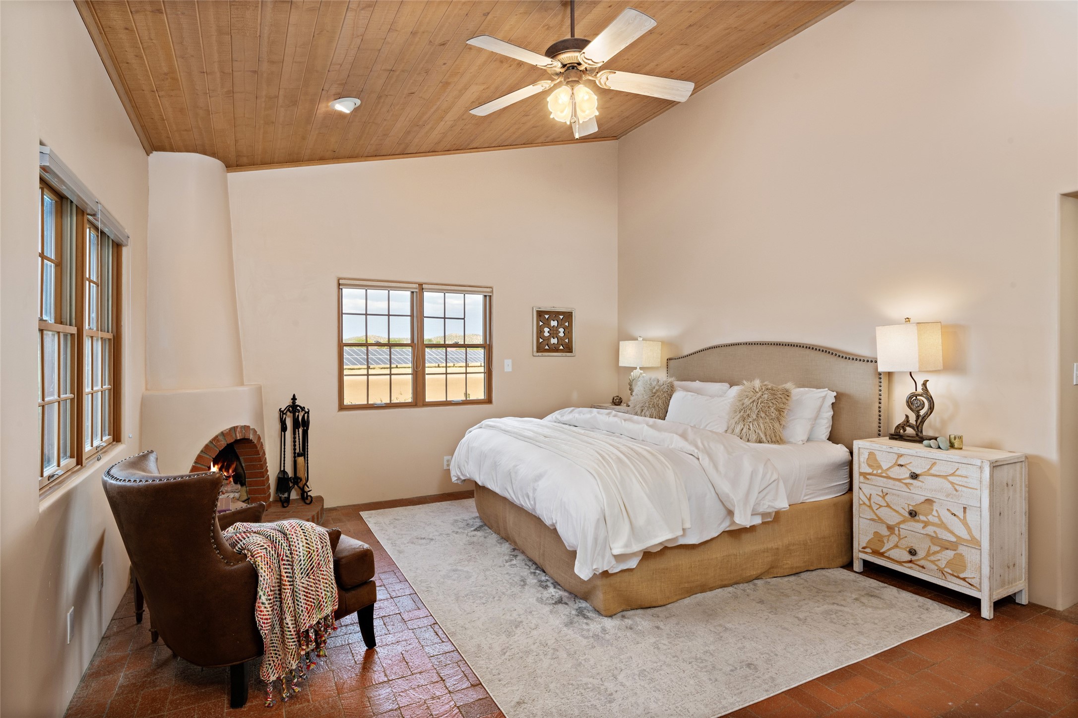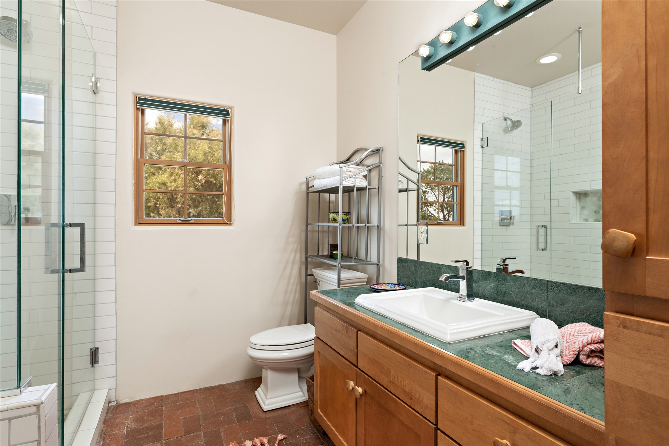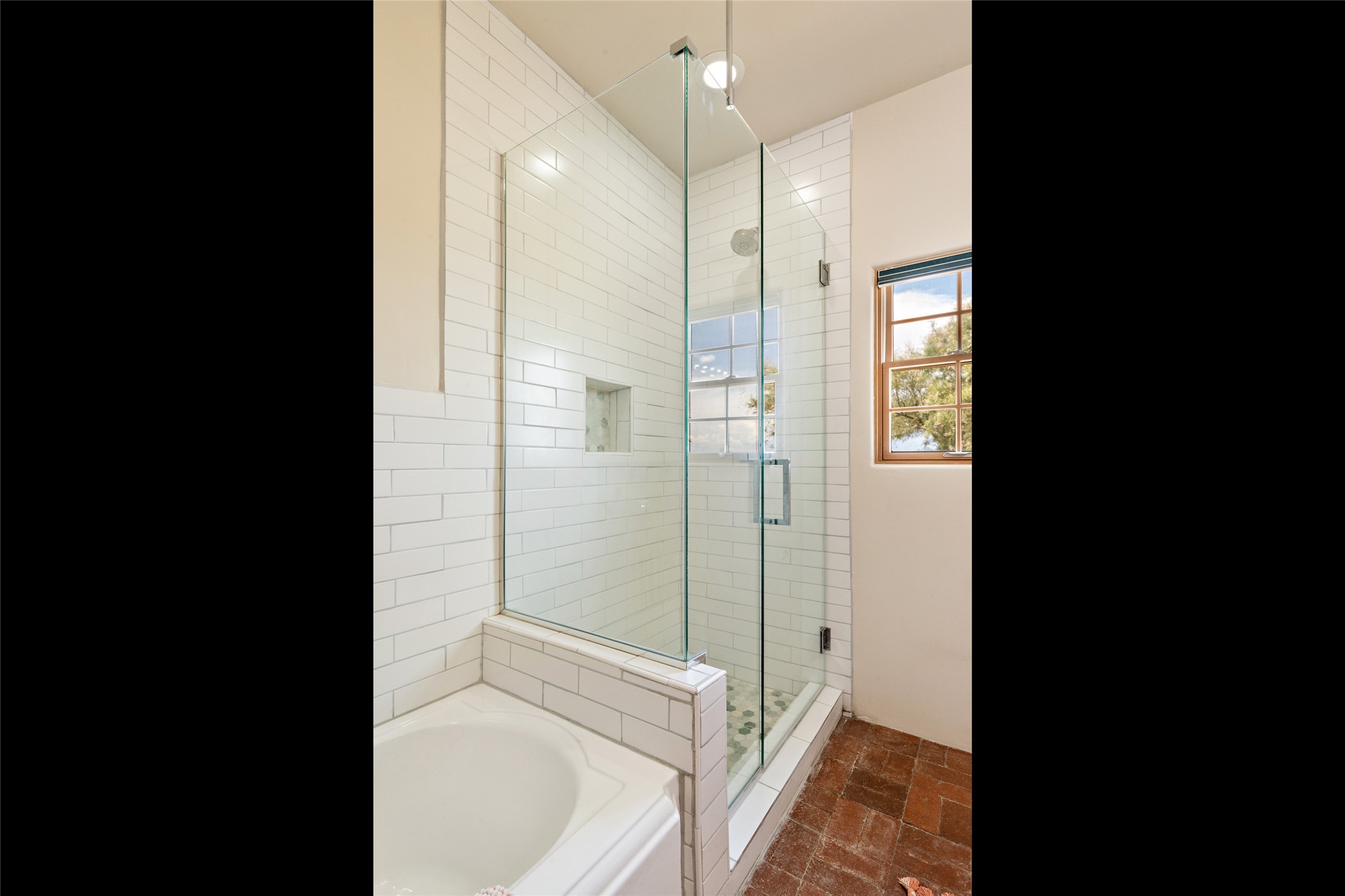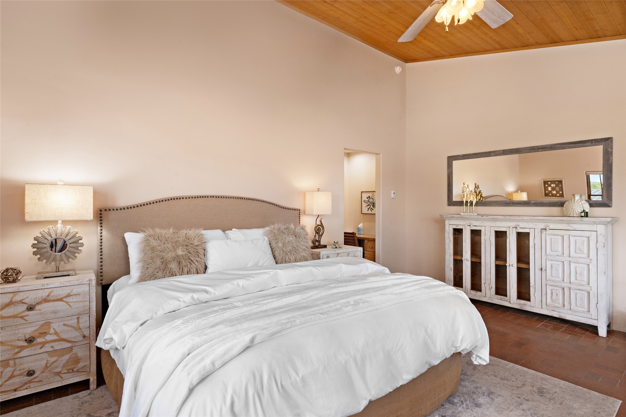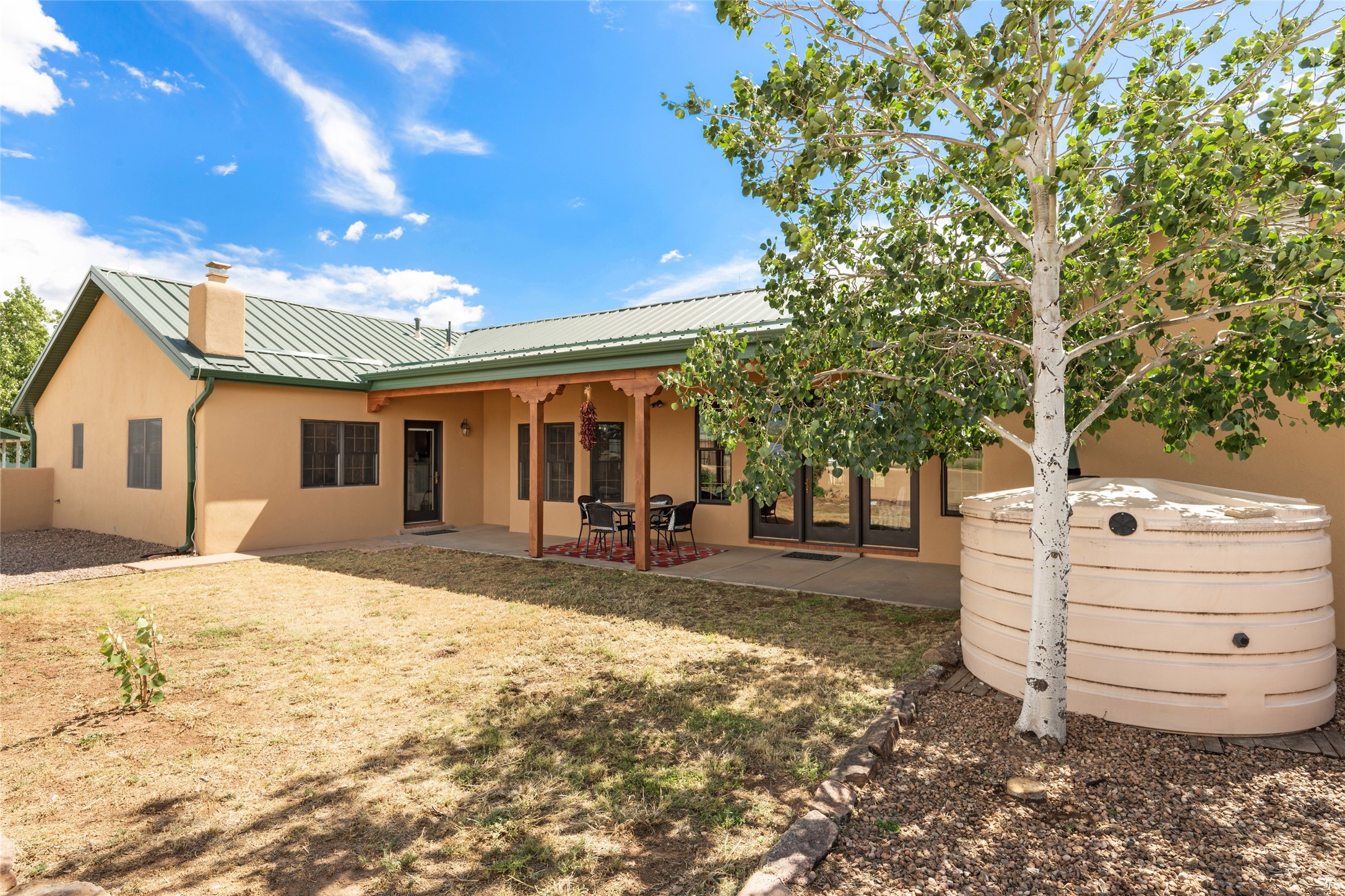 Vistas in every direction can be enjoyed from this lovely ranchette located on 10 acres in desirable Los Caballos. The 1,816 SqFt home lives large due to its open floor plan, gracious bedroom separation and beautiful finish quality throughout including brick floors, beamed & planked ceilings, elegant fireplaces and numerous windows filling the spaces with natural light. The primary bedroom opens onto the north-facing portal and hosts a double vanity and walk-in closet. A separate 1,700 SqFt. 1 bed/1 bath casita is privately sited and includes a spacious, multi-purpose living room, plus a kitchen/dining area. Ample storage and hobby space are available in both the heated 3-car garage and the 3,000 SqFt studio/shop/garage which includes a heated office and half bath, two EV chargers and three RV hookups. This well-maintained property has the advantages of solar power, water catchment, two septic systems and a pitched metal roof. Located near the amenities offered in the Agora shopping center, the trails in the Galisteo Basin Preserve and only 20 minutes to Historic Santa Fe.