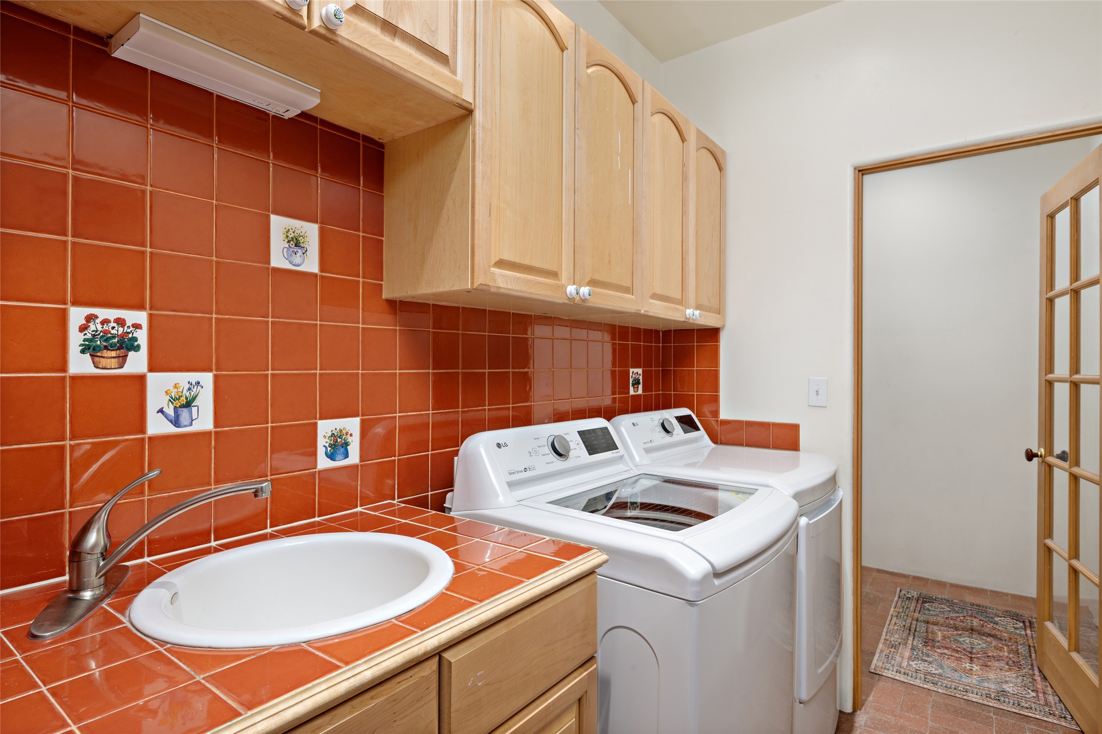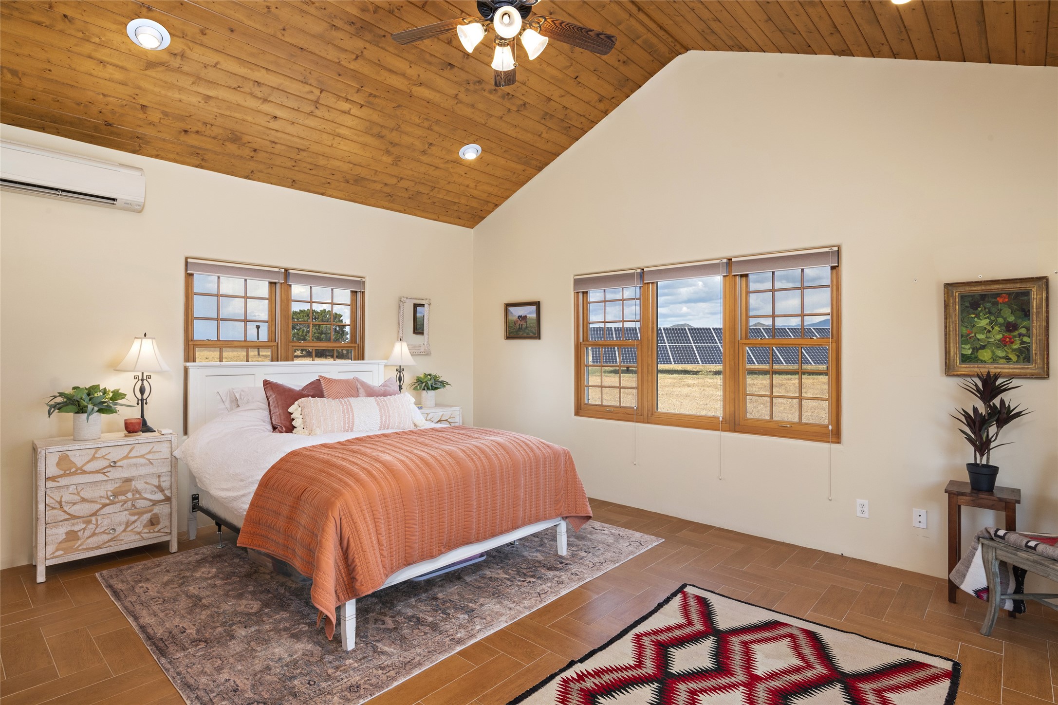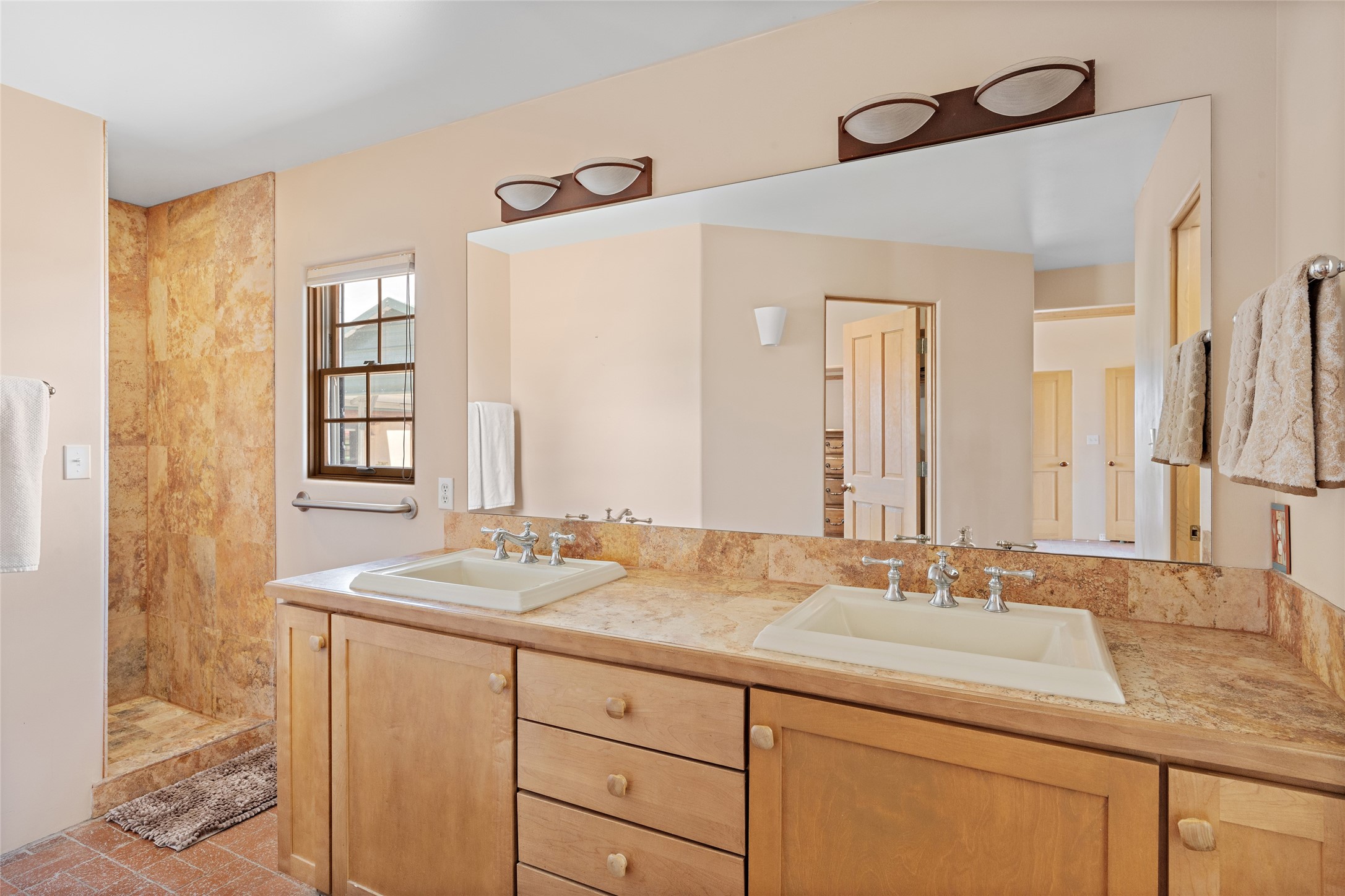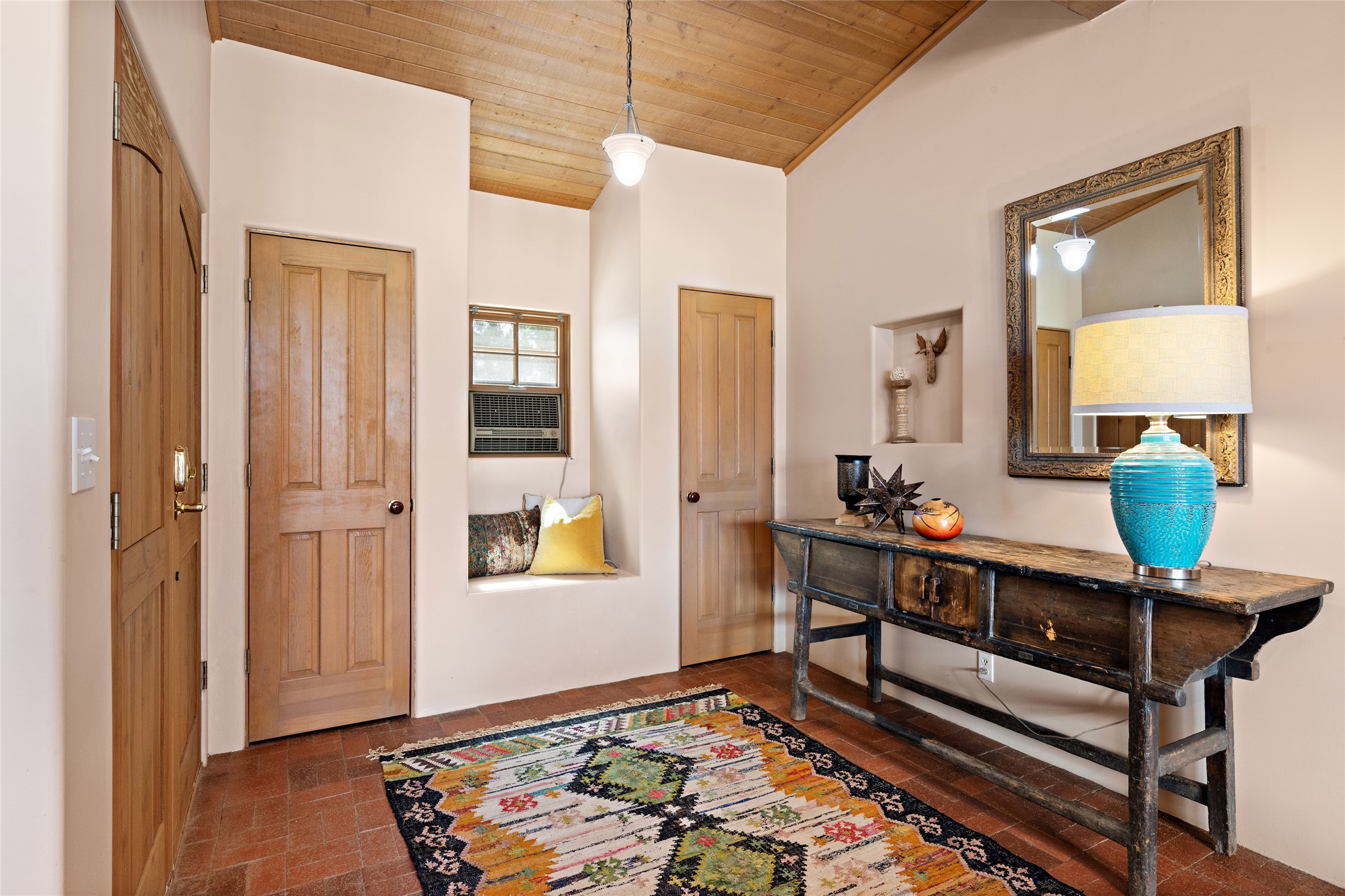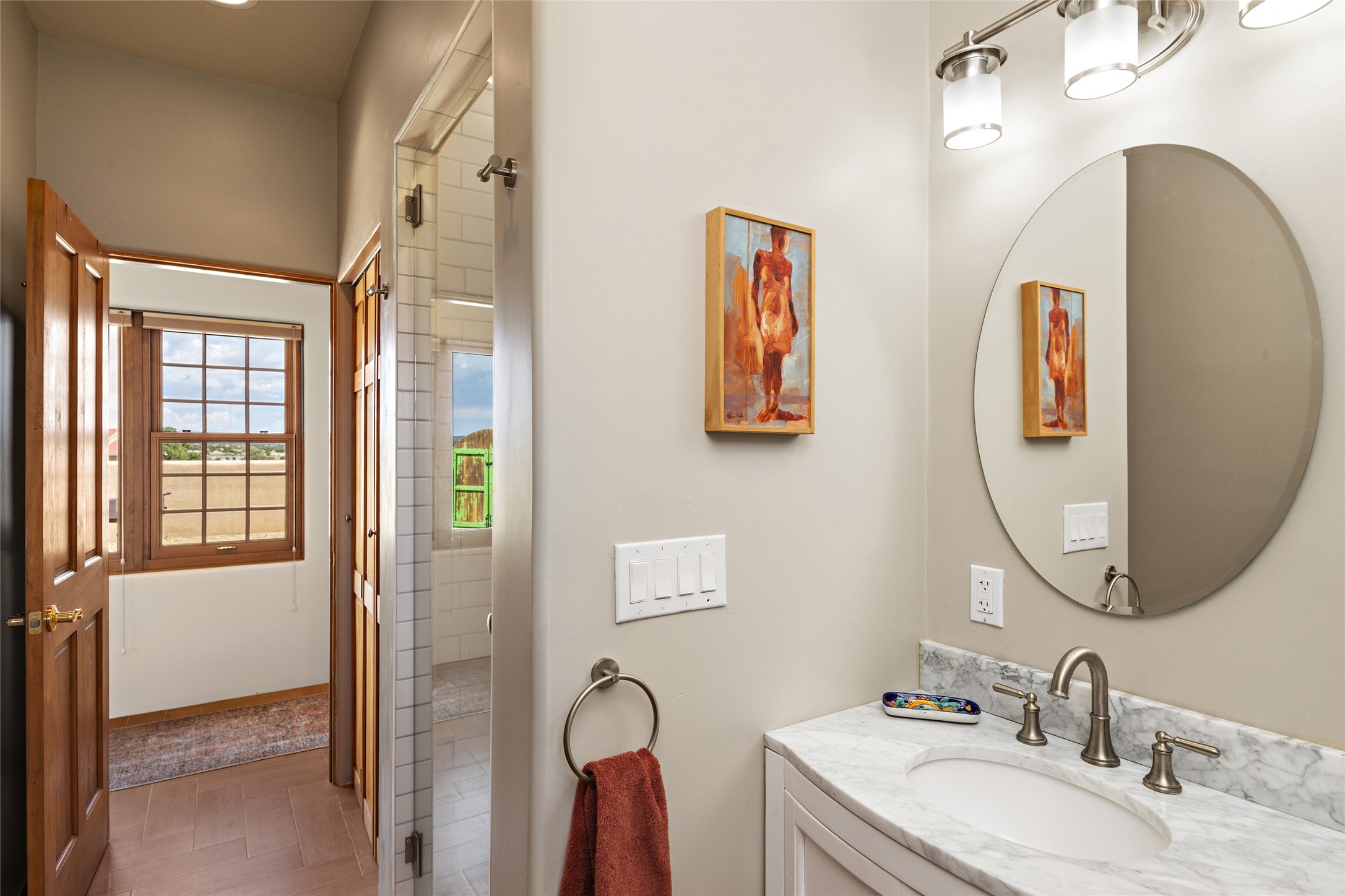 Vistas in every direction can be enjoyed from this lovely ranchette located on 10 acres in desirable Los Caballos. The 1,816 SqFt home lives large due to its open floor plan, gracious bedroom separation and beautiful finish quality throughout including brick floors, beamed & planked ceilings, elegant fireplaces and numerous windows filling the spaces with natural light. The primary bedroom opens onto the north-facing portal and hosts a double vanity and walk-in closet. A separate 1,700 SqFt. 1 bed/1 bath casita is privately sited and includes a spacious, multi-purpose living room, plus a kitchen/dining area. Ample storage and hobby space are available in both the heated 3-car garage and the 3,000 SqFt studio/shop/garage which includes a heated office and half bath, two EV chargers and three RV hookups. This well-maintained property has the advantages of solar power, water catchment, two septic systems and a pitched metal roof. Located near the amenities offered in the Agora shopping center, the trails in the Galisteo Basin Preserve and only 20 minutes to Historic Santa Fe.