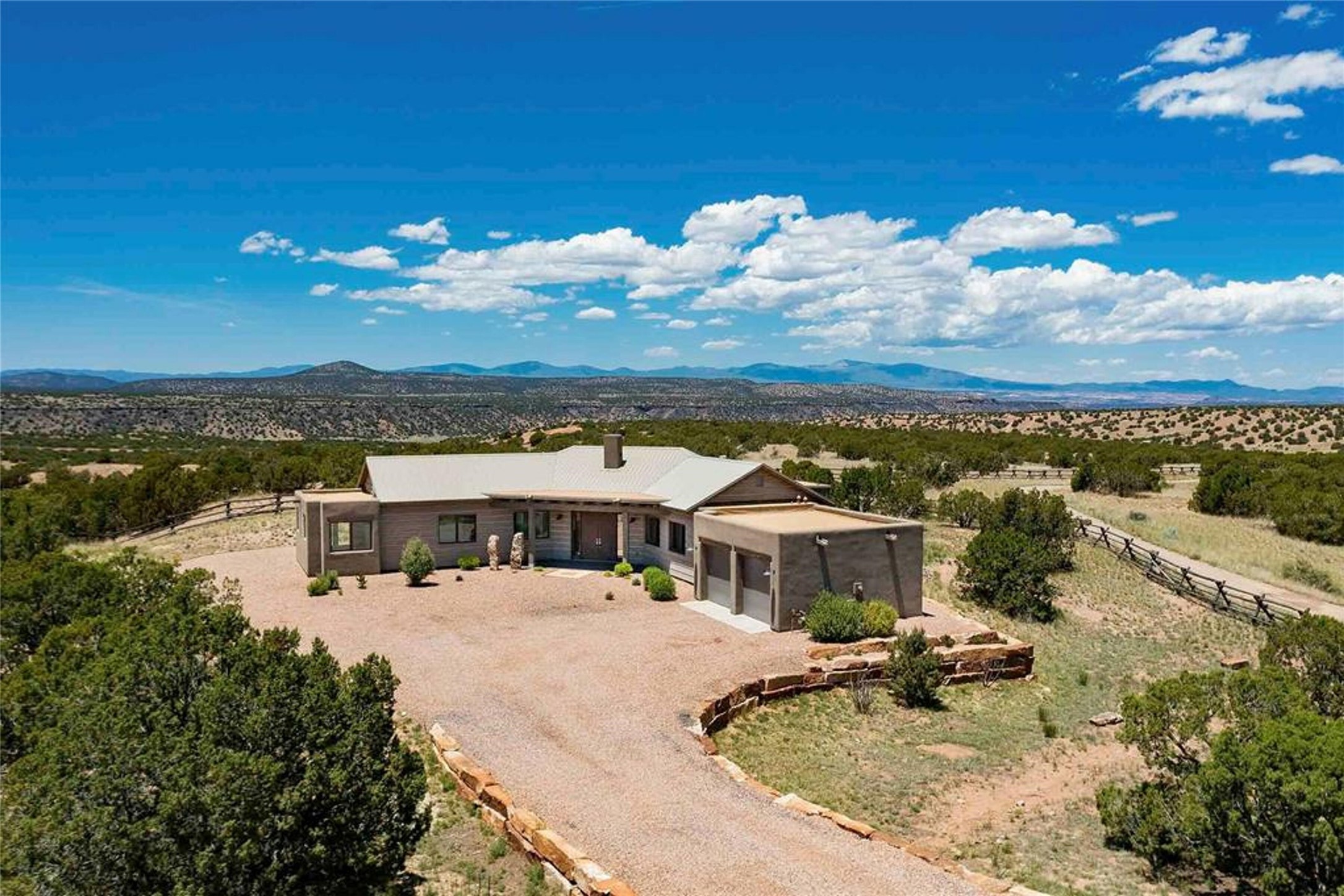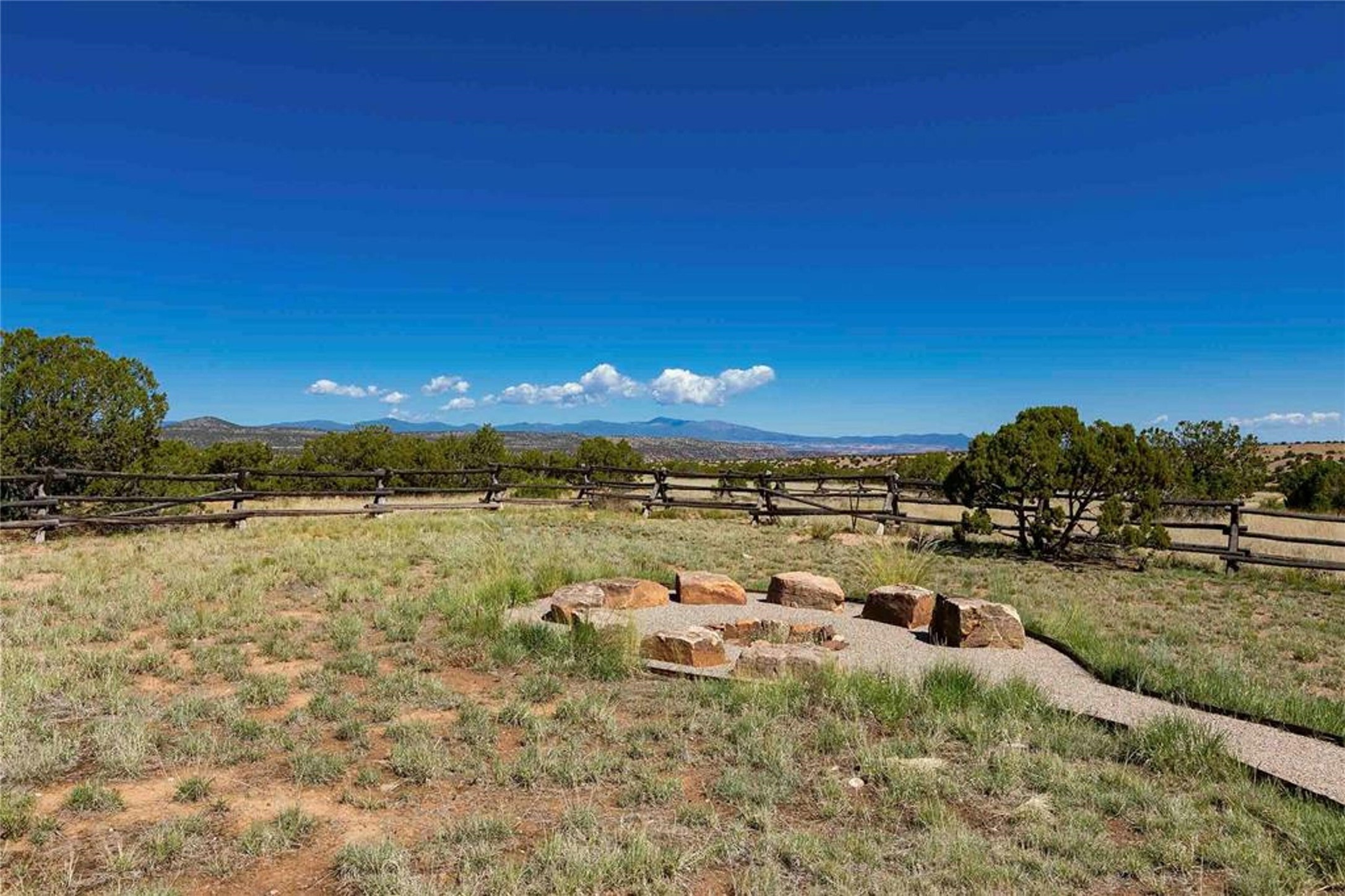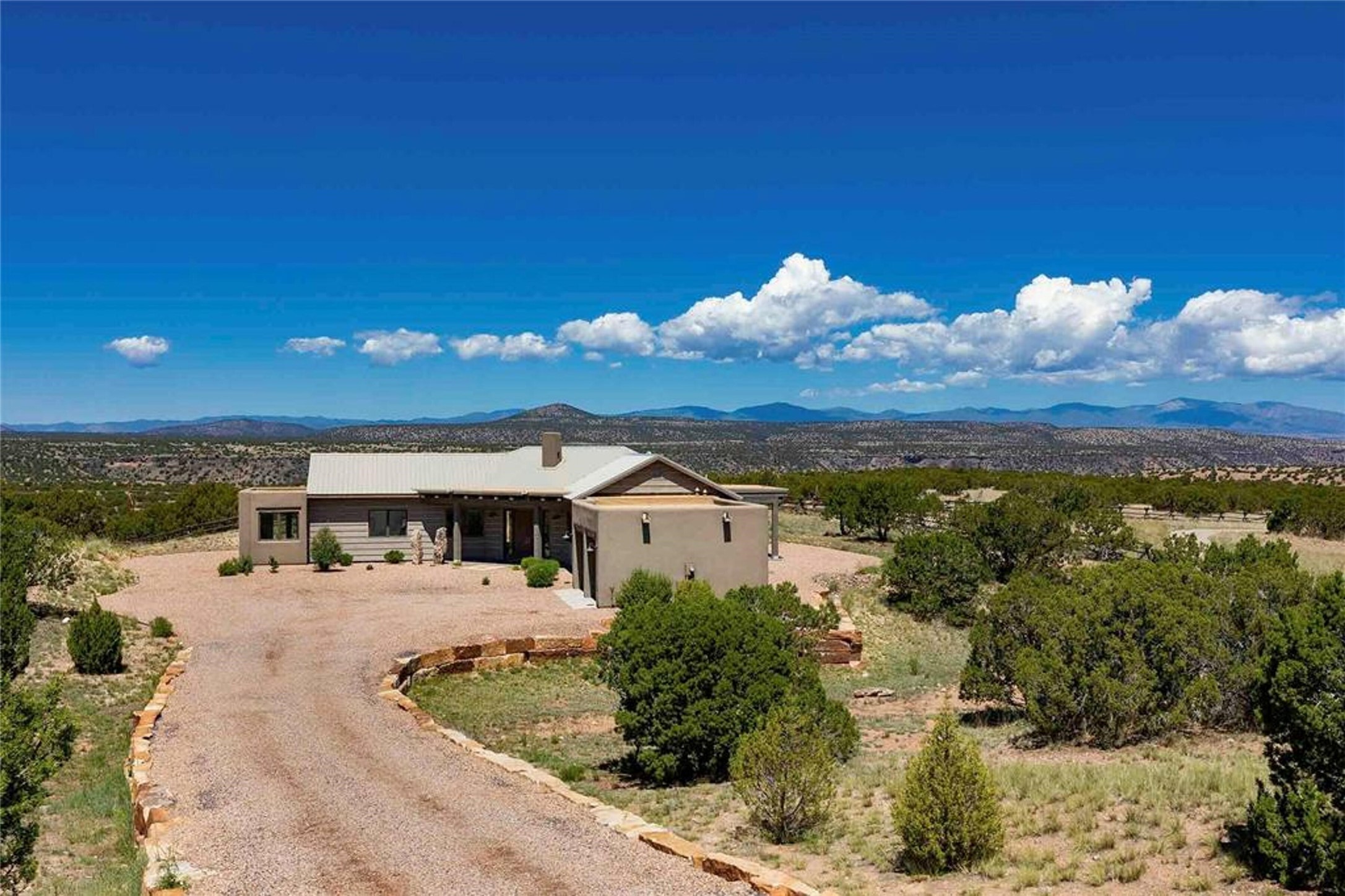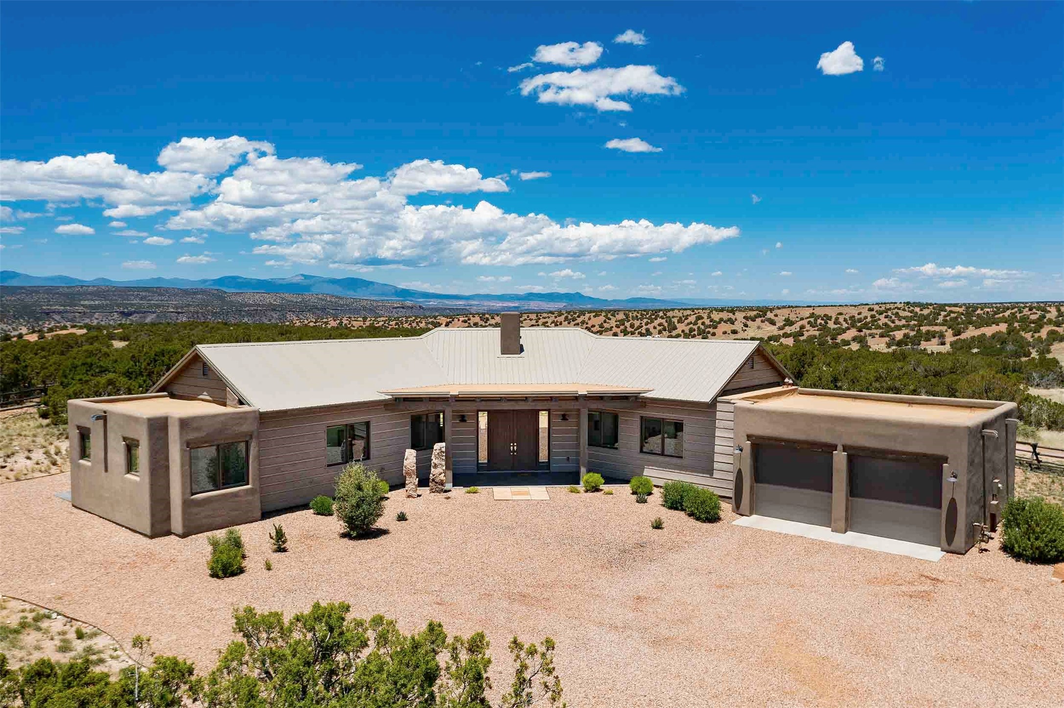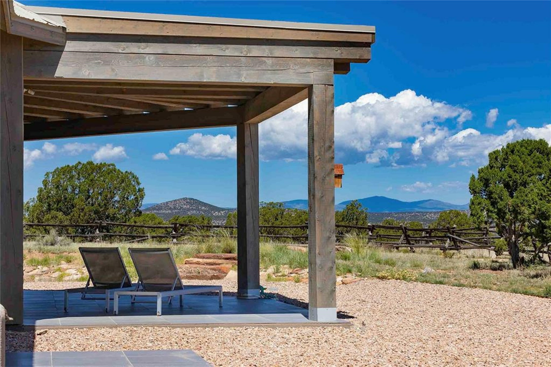 One of the rarest homes in all of Las Campanas, this exceptional contemporary, 2019-built home by Zachary & Sons, captivates with sophisticated log cabin architecture and stunning surround mountain views. Located within the Estancias of Las Campanas, this fabulous, single level home backs directly to BLM land and borders nearly 68,000 acres of open space, with endless Jemez Mountain and Sangre de Cristo Mountain views, and celebrates the true essence of the ultimate Santa Fe lifestyle. Design features include an open concept living room and dining room, ideal for entertaining with stunning views, back portal access through three sets of French doors, and a fireplace, all of which opens directly to the designer island kitchen with state of the art appliances, breakfast bar, views, and pantry. The owner's suite delights with portal access, Jemez views, an intimate seating area, and a modern bath complete with a walk-in shower, soaking tub, dual vanities and walk-in closet. Guests enjoy independence with a private ensuite bedroom and a secondary guest bedroom which is currently utilized as both a media room and office. Exceptional features include quality neutral finishes and soft natural light throughout, a generous two car garage with built-in storage, surround portals ideal for enjoying the ultimate outdoor living experience, and central air conditioning. Sited within close proximity to The Club at Las Campanas Clubhouse, (2) Jack Nicklaus Signature Golf Courses, Spa, Fitness and Tennis Center, and Equestrian Center, in addition to hiking trails and Diablo Canyon, this unique offering is truly a special opportunity. The owner's equity golf membership is available for purchase on a separate bill of sale.