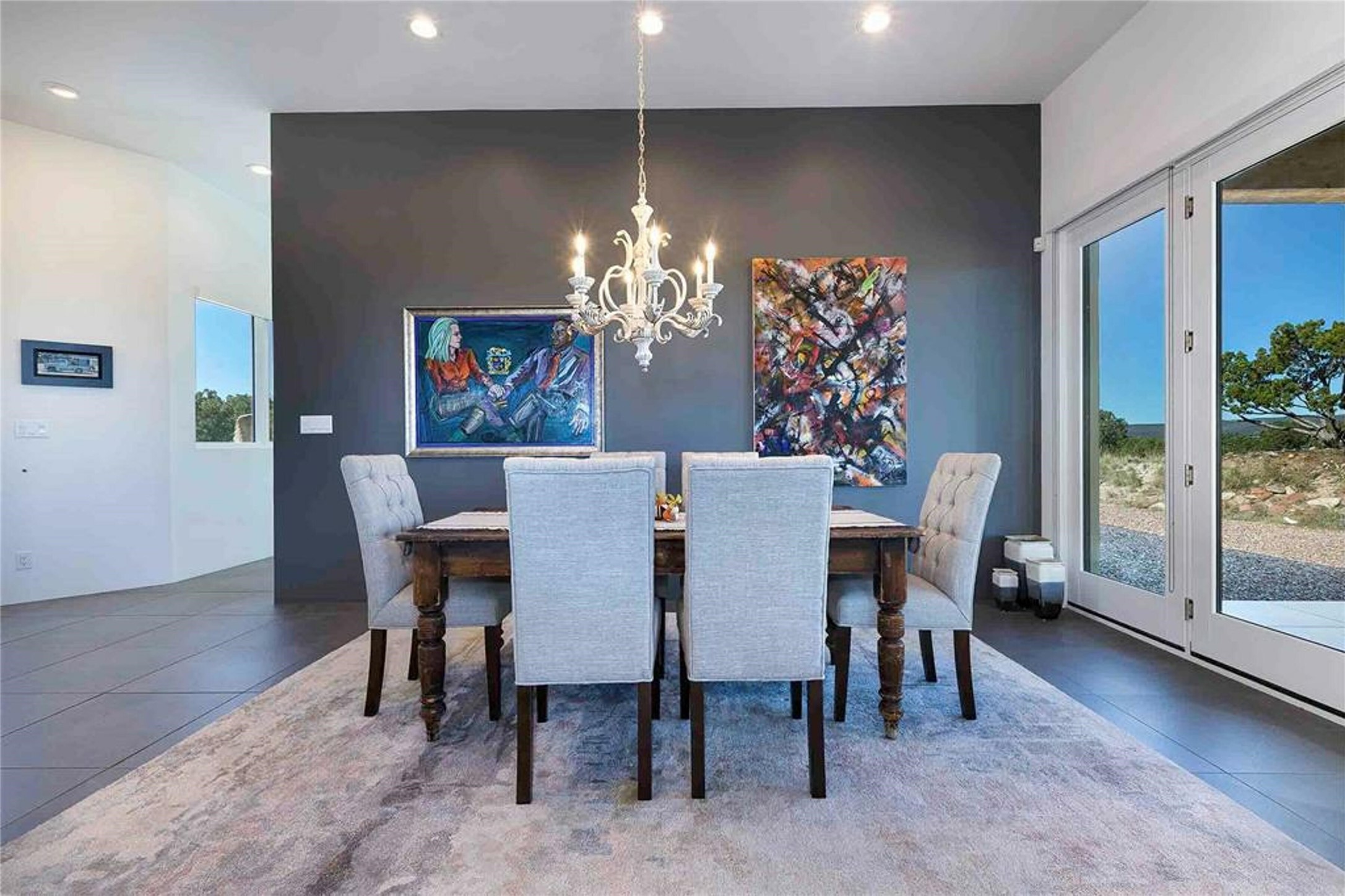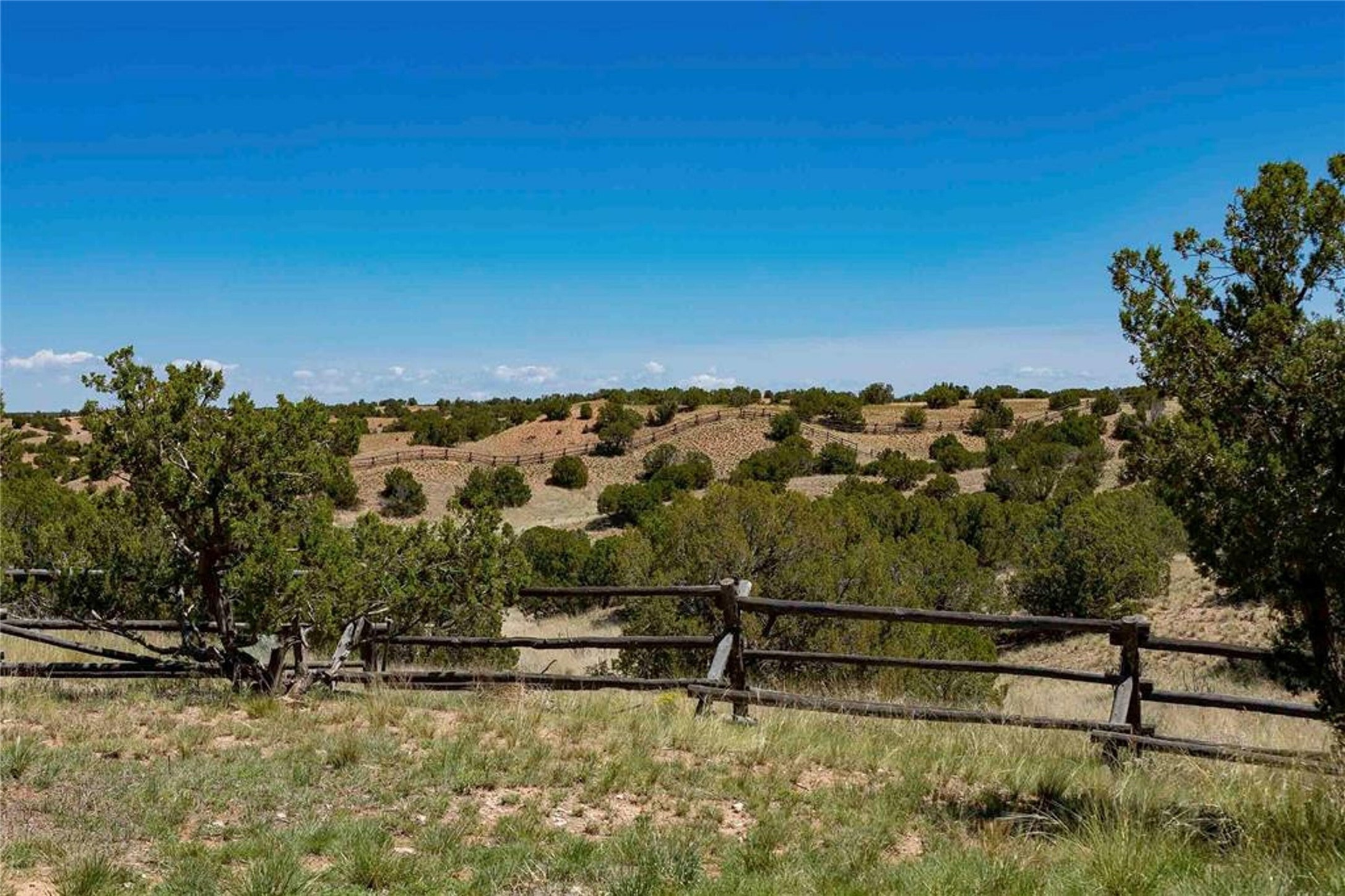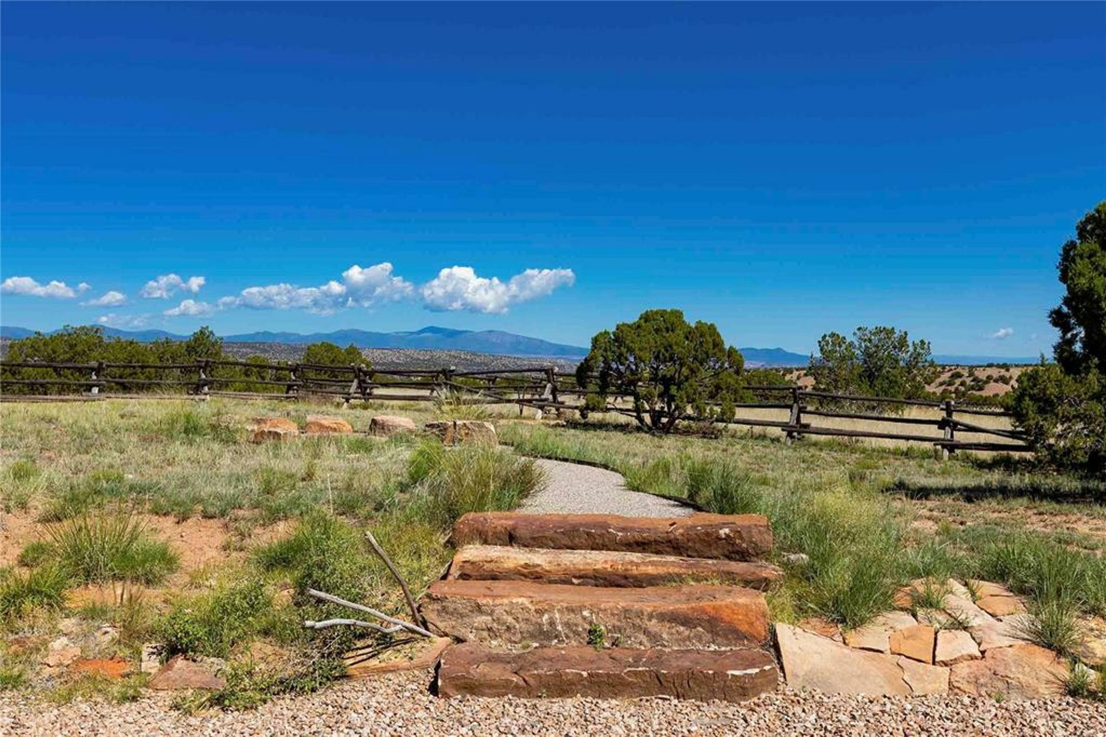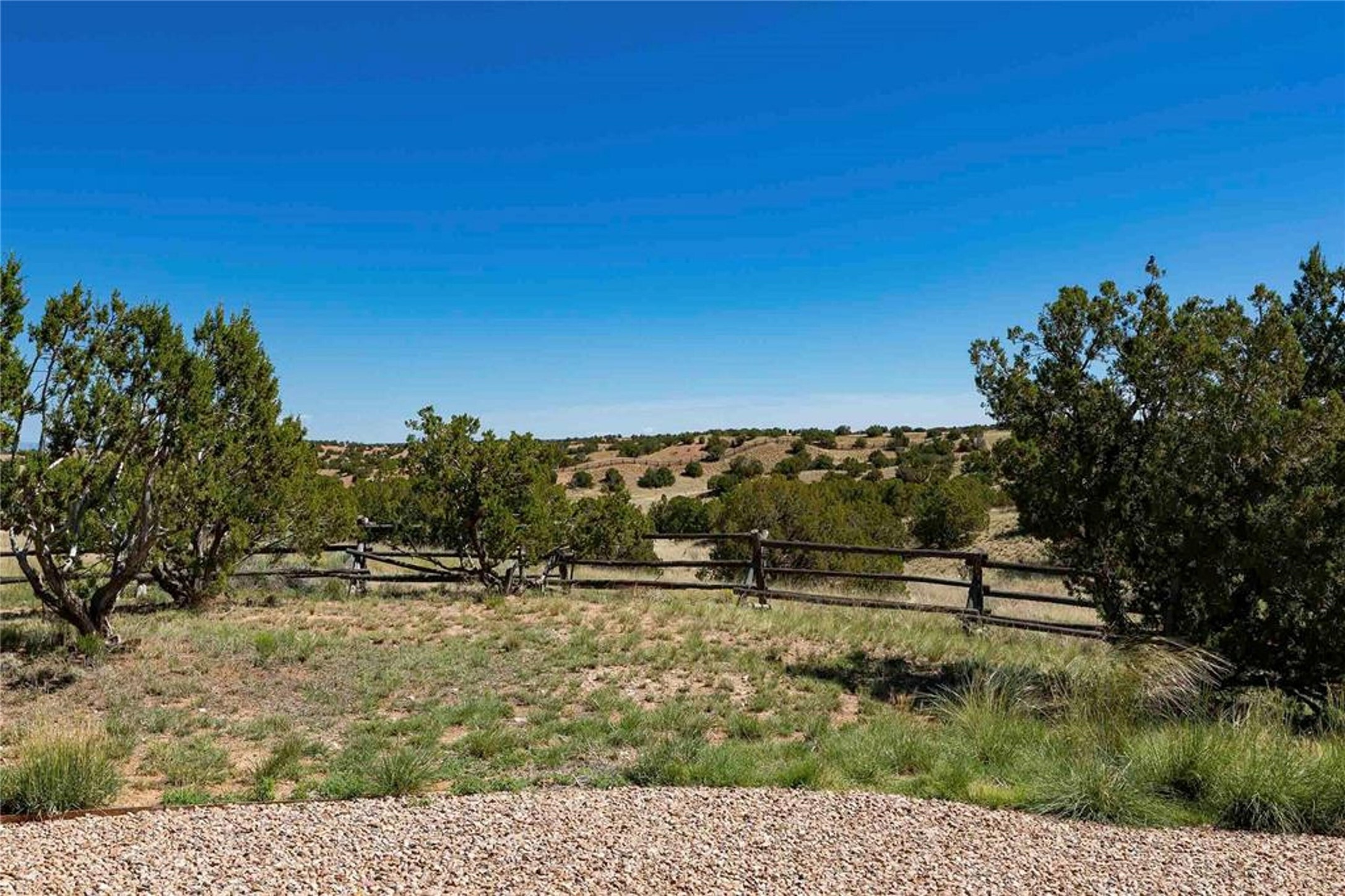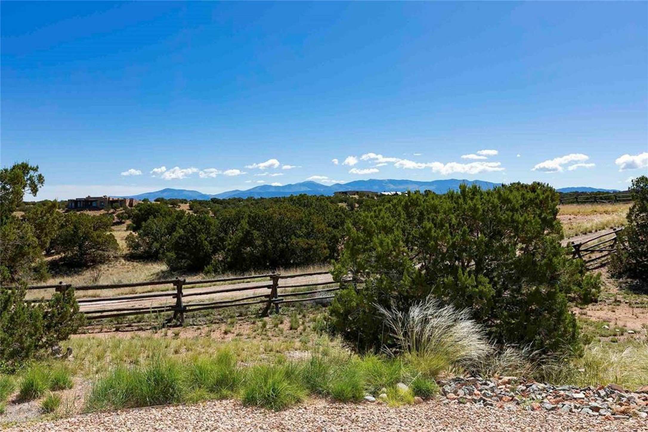 One of the rarest homes in all of Las Campanas, this exceptional contemporary, 2019-built home by Zachary & Sons, captivates with sophisticated log cabin architecture and stunning surround mountain views. Located within the Estancias of Las Campanas, this fabulous, single level home backs directly to BLM land and borders nearly 68,000 acres of open space, with endless Jemez Mountain and Sangre de Cristo Mountain views, and celebrates the true essence of the ultimate Santa Fe lifestyle. Design features include an open concept living room and dining room, ideal for entertaining with stunning views, back portal access through three sets of French doors, and a fireplace, all of which opens directly to the designer island kitchen with state of the art appliances, breakfast bar, views, and pantry. The owner's suite delights with portal access, Jemez views, an intimate seating area, and a modern bath complete with a walk-in shower, soaking tub, dual vanities and walk-in closet. Guests enjoy independence with a private ensuite bedroom and a secondary guest bedroom which is currently utilized as both a media room and office. Exceptional features include quality neutral finishes and soft natural light throughout, a generous two car garage with built-in storage, surround portals ideal for enjoying the ultimate outdoor living experience, and central air conditioning. Sited within close proximity to The Club at Las Campanas Clubhouse, (2) Jack Nicklaus Signature Golf Courses, Spa, Fitness and Tennis Center, and Equestrian Center, in addition to hiking trails and Diablo Canyon, this unique offering is truly a special opportunity. The owner's equity golf membership is available for purchase on a separate bill of sale.