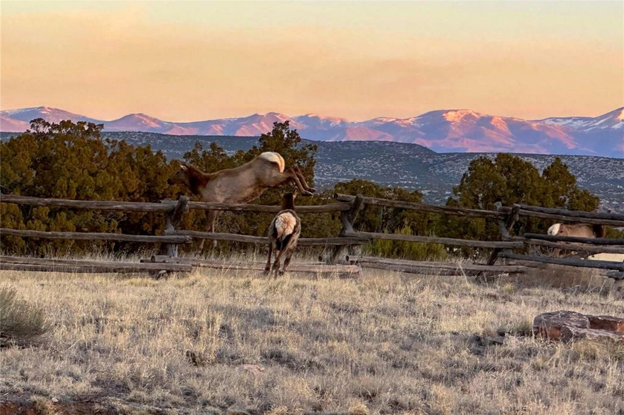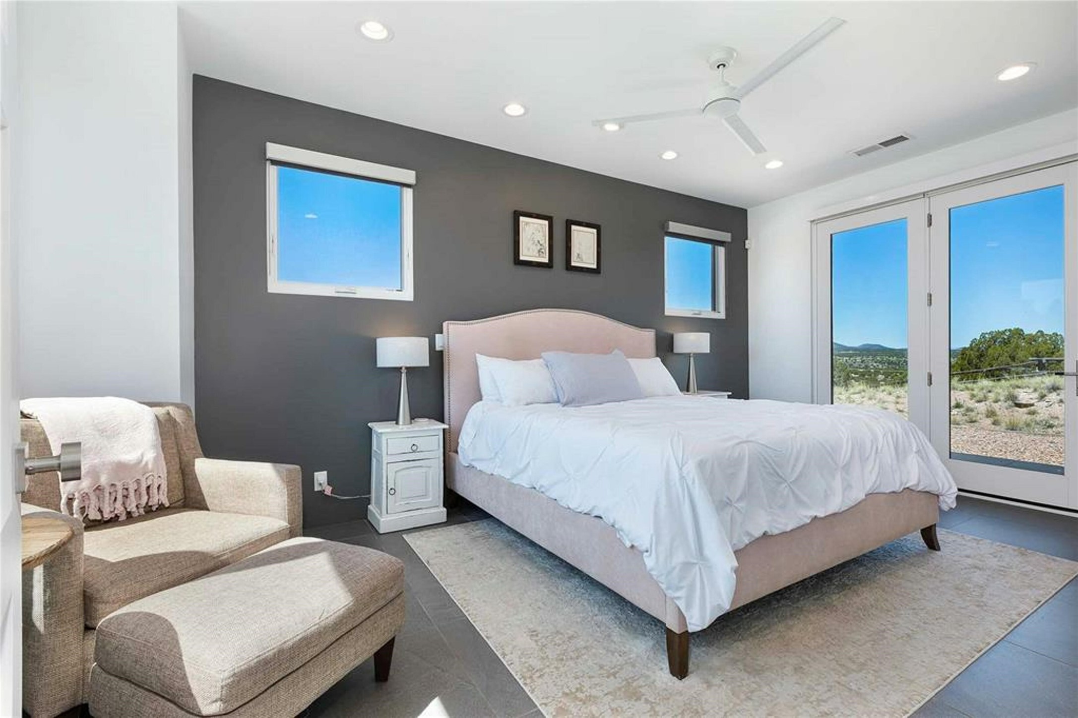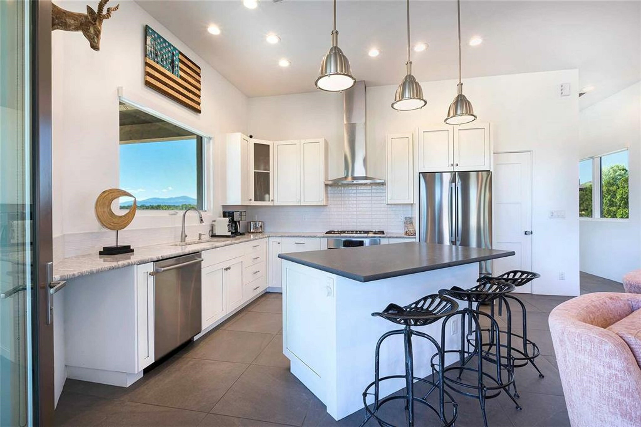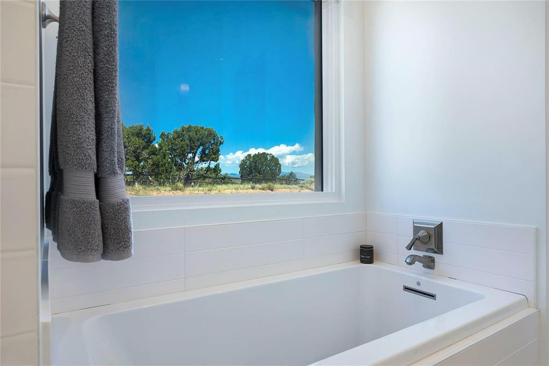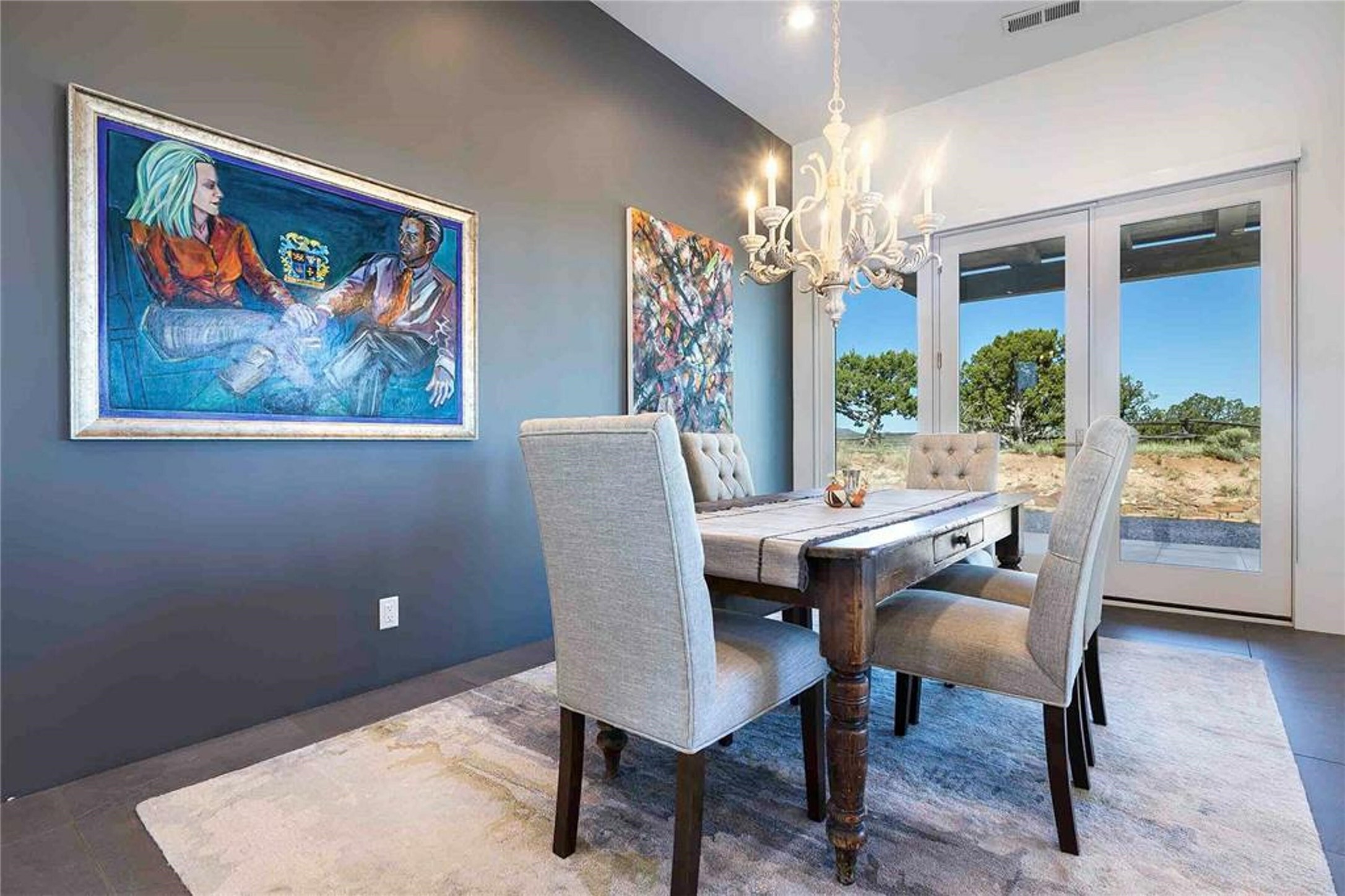 One of the rarest homes in all of Las Campanas, this exceptional contemporary, 2019-built home by Zachary & Sons, captivates with sophisticated log cabin architecture and stunning surround mountain views. Located within the Estancias of Las Campanas, this fabulous, single level home backs directly to BLM land and borders nearly 68,000 acres of open space, with endless Jemez Mountain and Sangre de Cristo Mountain views, and celebrates the true essence of the ultimate Santa Fe lifestyle. Design features include an open concept living room and dining room, ideal for entertaining with stunning views, back portal access through three sets of French doors, and a fireplace, all of which opens directly to the designer island kitchen with state of the art appliances, breakfast bar, views, and pantry. The owner's suite delights with portal access, Jemez views, an intimate seating area, and a modern bath complete with a walk-in shower, soaking tub, dual vanities and walk-in closet. Guests enjoy independence with a private ensuite bedroom and a secondary guest bedroom which is currently utilized as both a media room and office. Exceptional features include quality neutral finishes and soft natural light throughout, a generous two car garage with built-in storage, surround portals ideal for enjoying the ultimate outdoor living experience, and central air conditioning. Sited within close proximity to The Club at Las Campanas Clubhouse, (2) Jack Nicklaus Signature Golf Courses, Spa, Fitness and Tennis Center, and Equestrian Center, in addition to hiking trails and Diablo Canyon, this unique offering is truly a special opportunity. The owner's equity golf membership is available for purchase on a separate bill of sale.