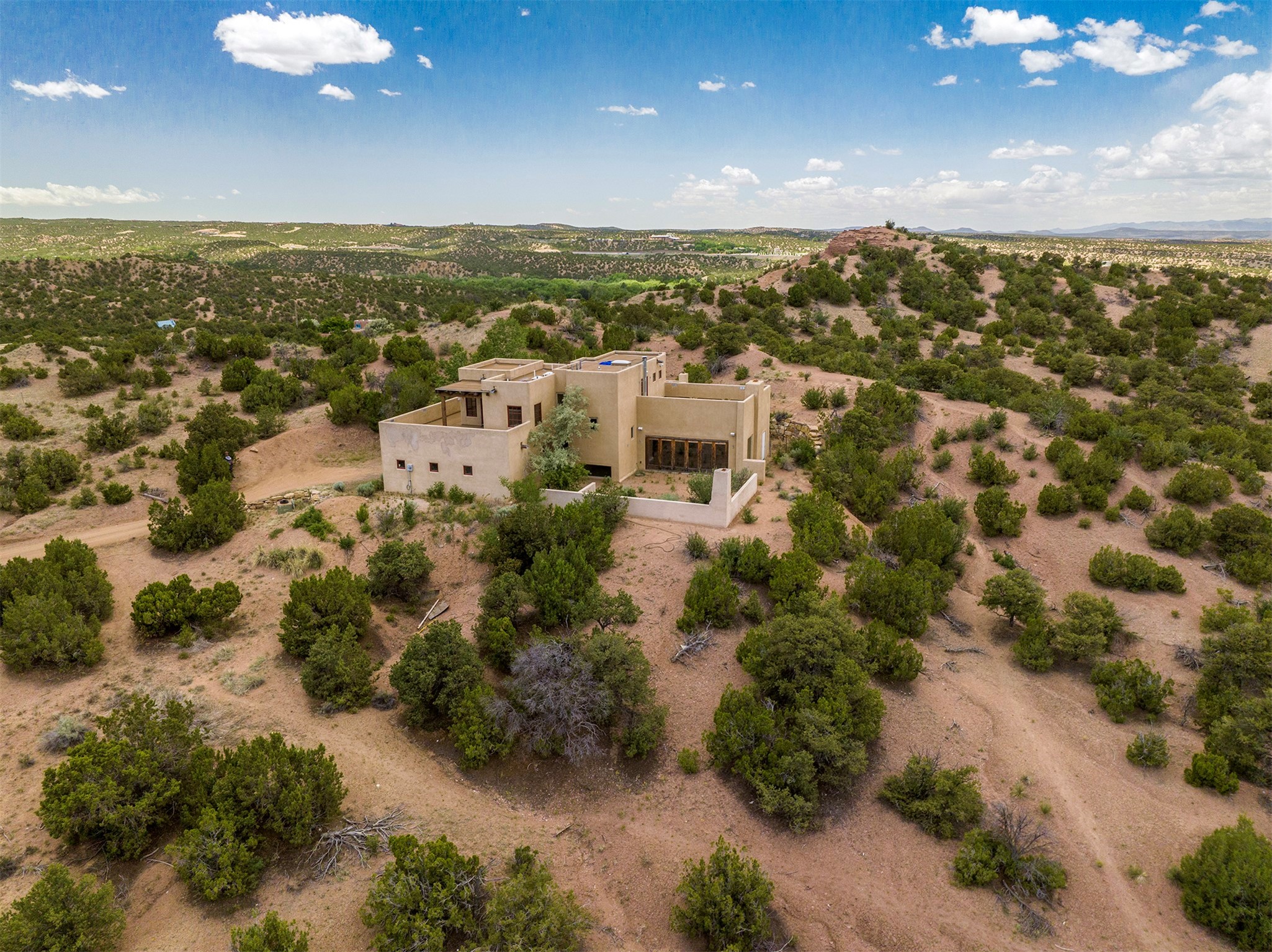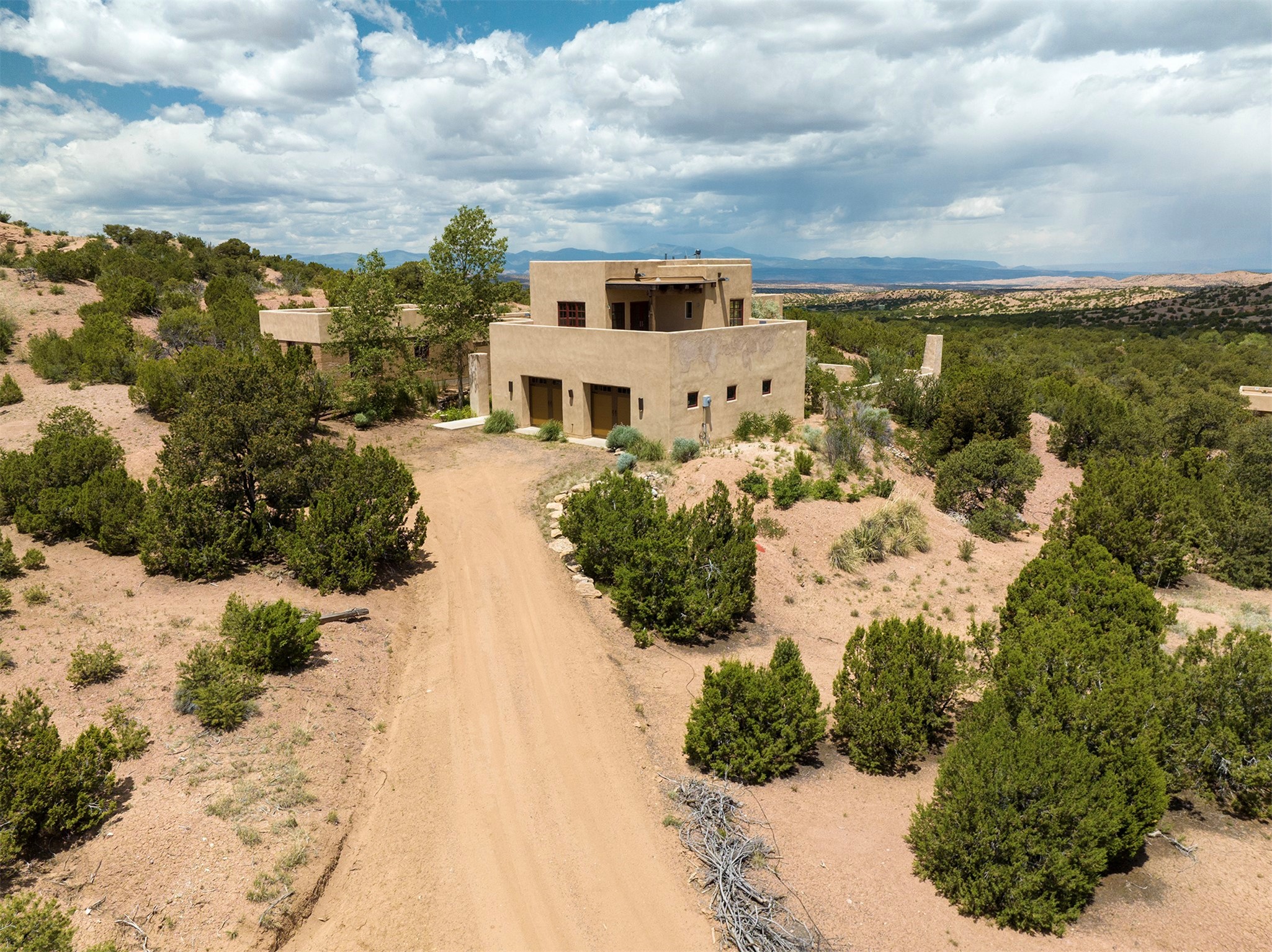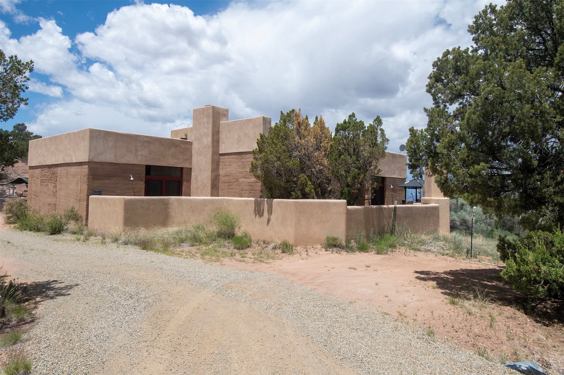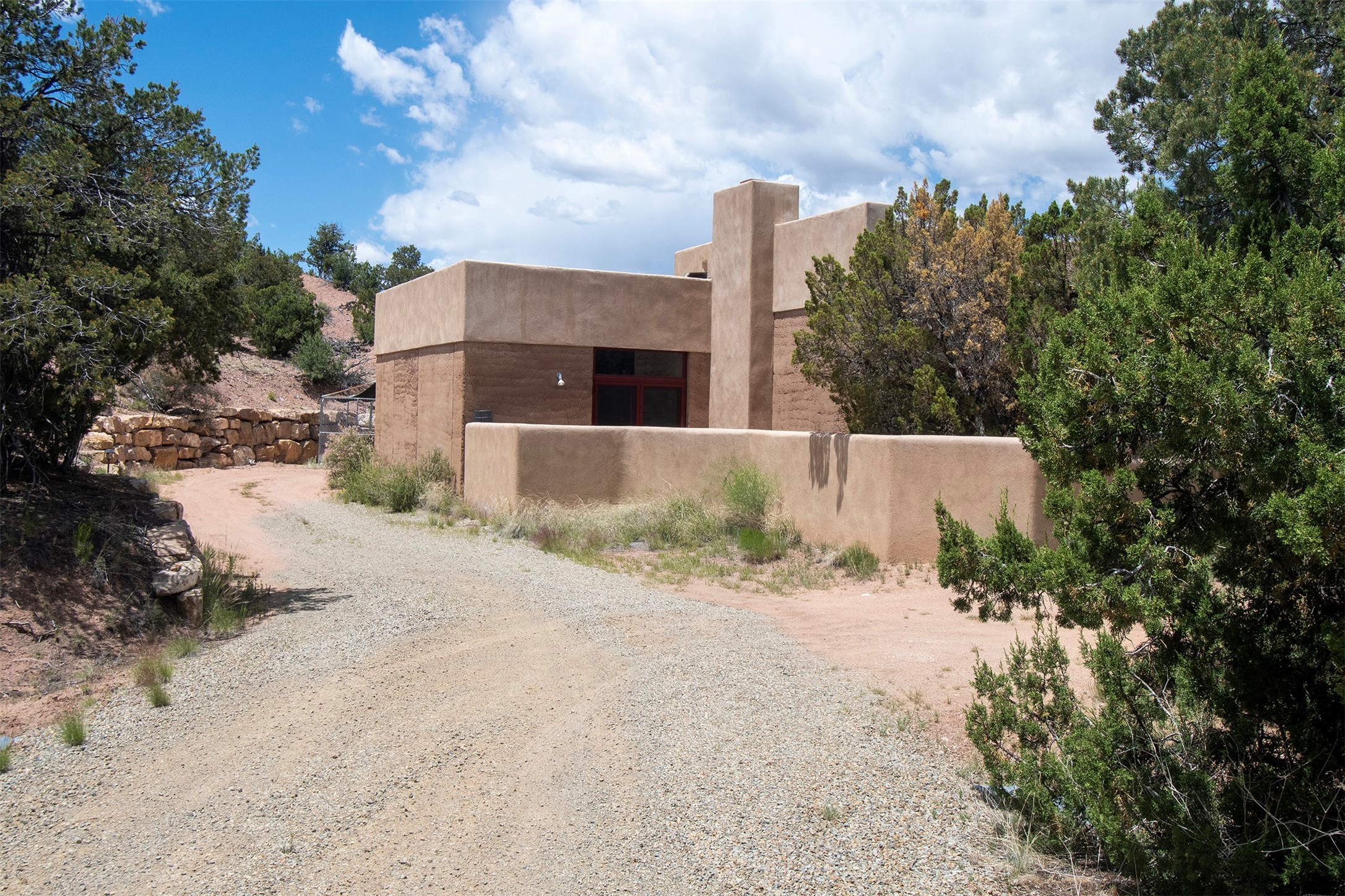 Introducing 23 Lavadero Rd, conveniently located in a neighborhood that offers a short commute to Los Alamos and Santa Fe, breathtaking views of the Sangre de Cristos and Jemez Mountains.Tucked behind Coyote Peak in the quaint hamlet of Tesuque is a stunning home and guest house, masterfully designed by the architect Efthimios Maniatis. One of the last rammed earth homes built with Chandler Huston in the Santa Fe area.As you walk the property, you'll be captivated by the custom garden walls constructed with stones sourced from Bishop's Lodge. Step inside, and you'll be greeted by the interior's exquisite craftsmanship, including steelwork by local metal artist Jeff Overlie. Notably, the basin sinks throughout the house, designed by Jeff, evoke the elegance of Tibetan prayer bowls.Adding to the allure, the mantles for the fireplaces were rescued from the home of the first territorial governor of New Mexico, a touch of local history into this exceptional residence. Furthermore, the home prioritizes nature-inspired living, employing materials with minimal volatile organics to ensure excellent interior air quality. The floors feature a combination of brick, strand-woven bamboo, and sustainable wool carpets. Many of the interior walls are custom diamond plaster.The main house comprises three or four bedrooms and two and a half baths, offering a comfortable and flexible living space, including a chef's kitchen. The guest house offers two bedrooms and two baths, with a strong rental history. It presents an ideal space for hosting guests, accommodating extended family, or generating rental income.Situated on 6.4 acres, this property features hiking trails perfect for dog walks that extend into the neighborhood and the National Forest. Explore the picturesque landscape, whether venturing into the Sangre de Cristos or strolling down to the Tesuque Village Market. Priced below market value so a special buyer can put the finishing touches on this one-of-a-kind home.