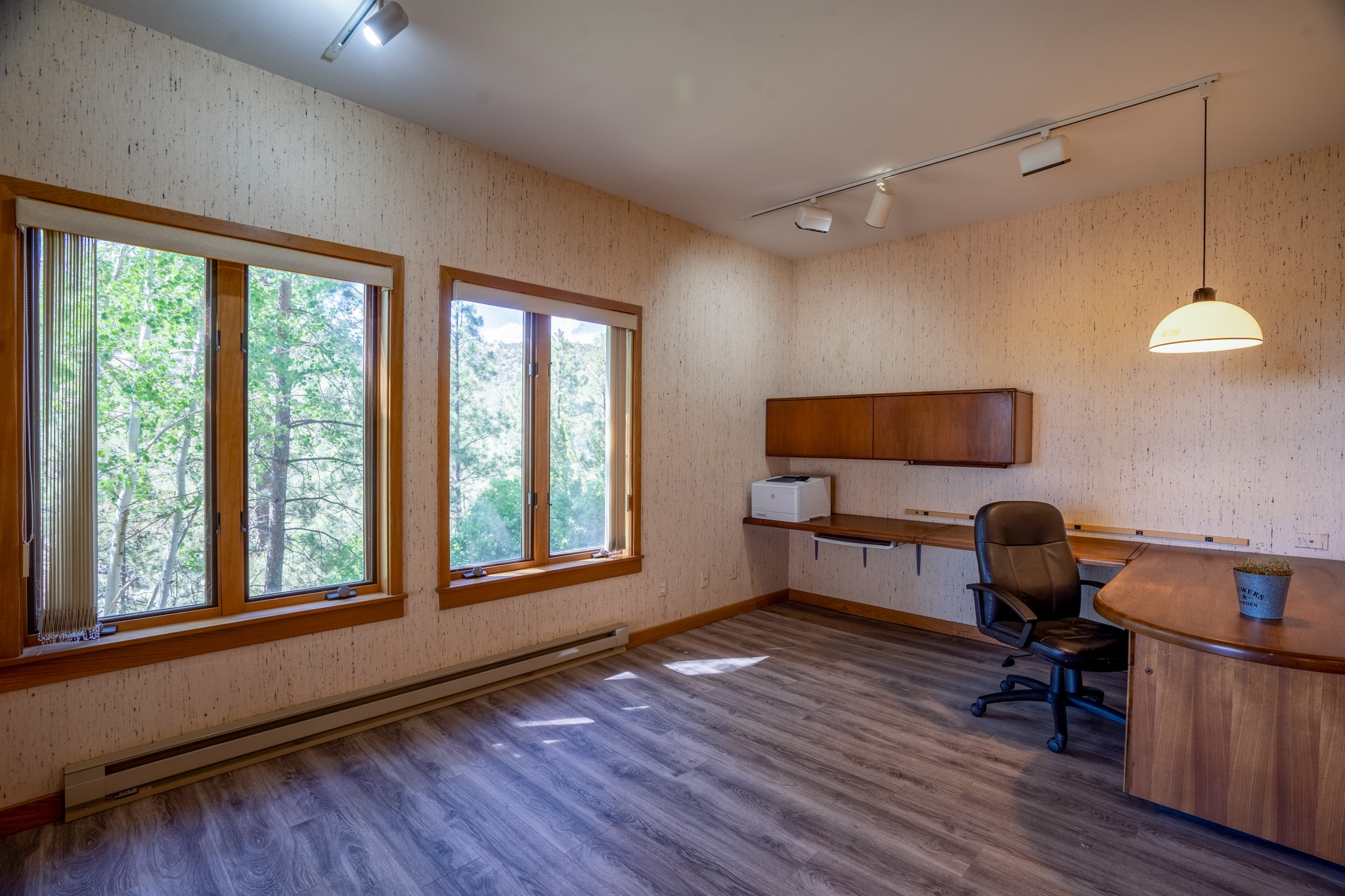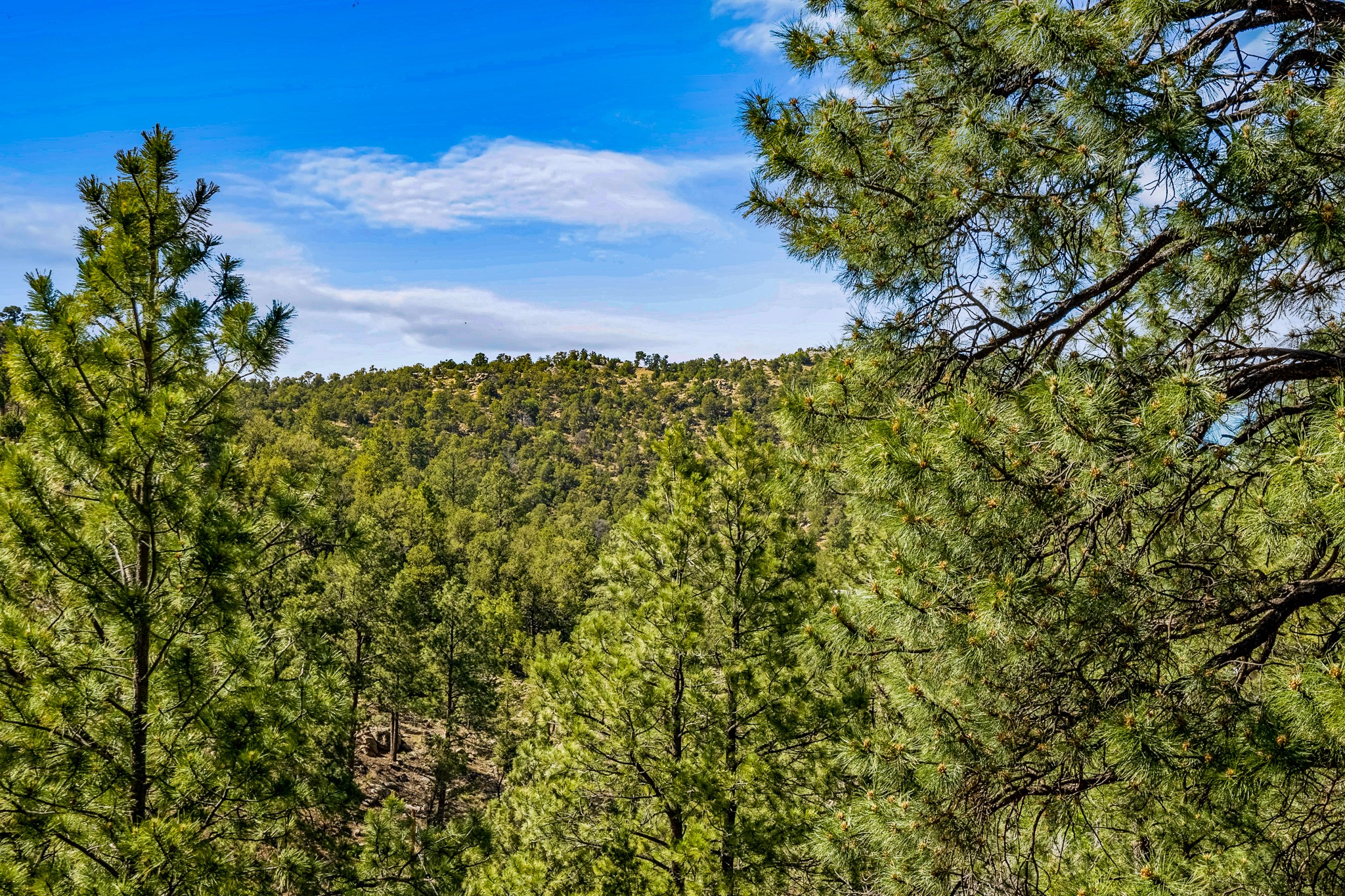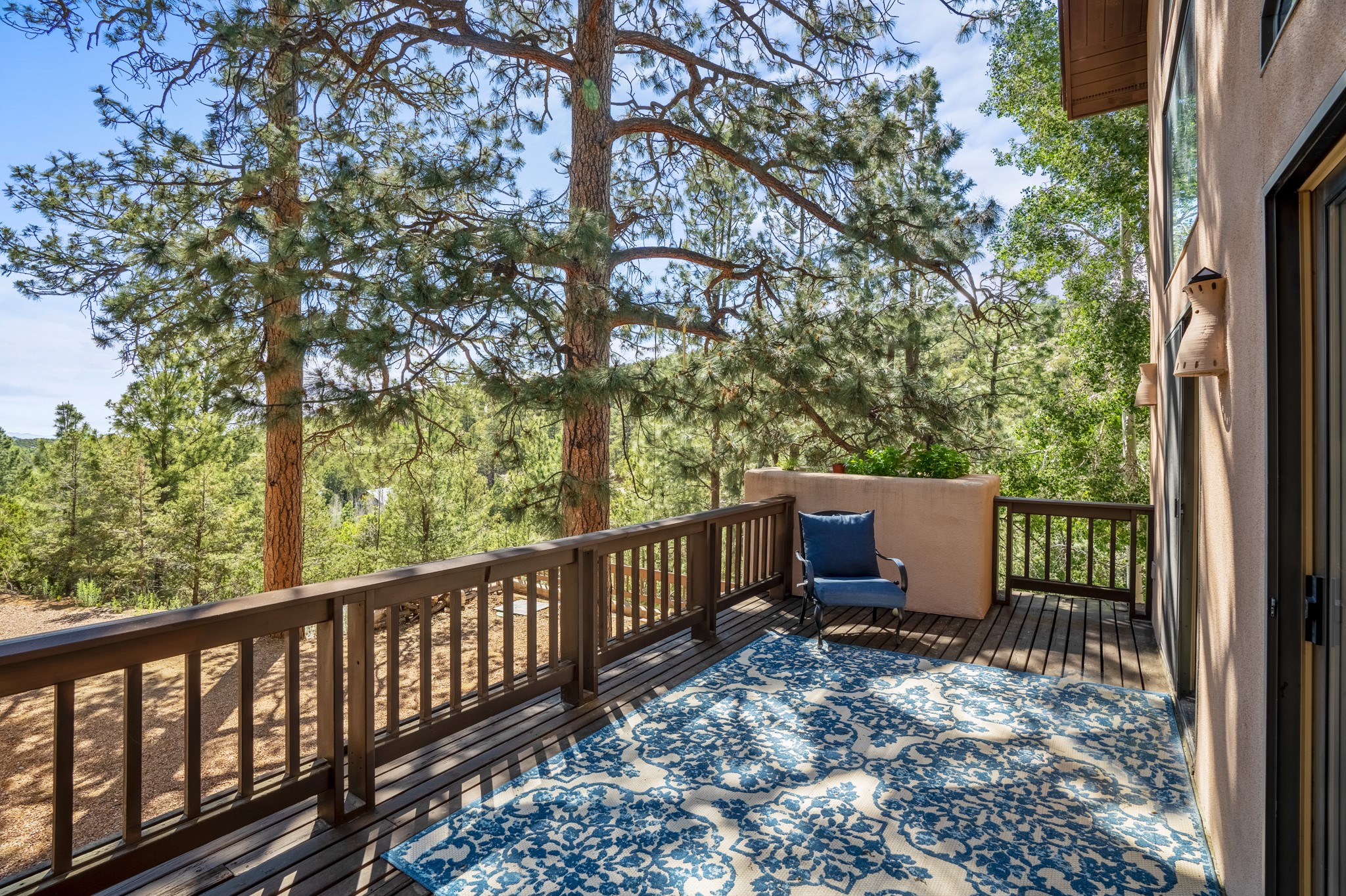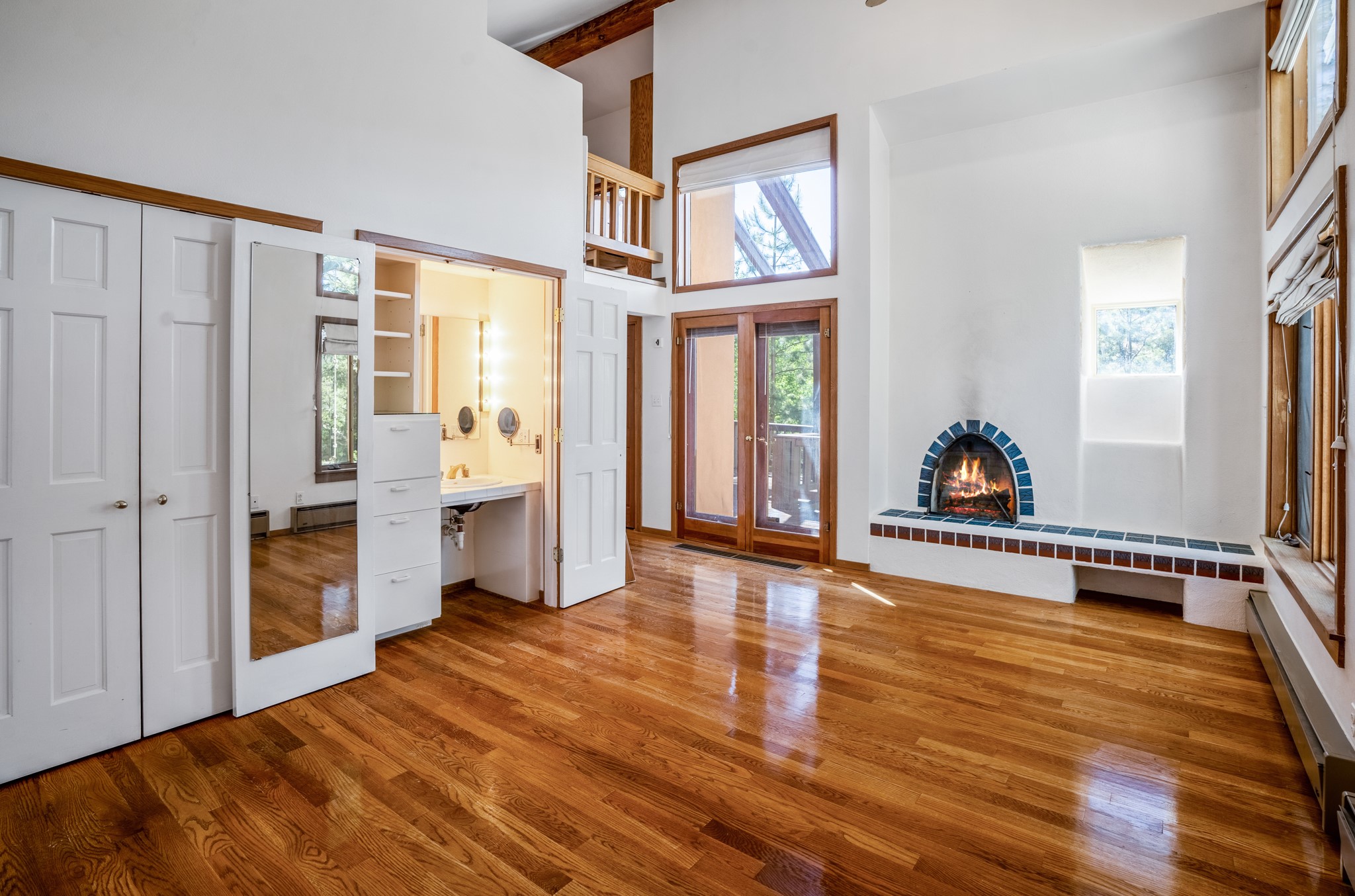 Privacy and serenity set on 10+ acres, just minutes from town! This light & bright residence is about 12 minutes drive to Antalya. Rio Grande, SF Prep & Thrive schools. What an wonderful opportunity for ski and mountain enthusiasts! A truly magical setting, nestled in the trees w/ dramatic rock outcroppings: a nature lover's dream. This home has numerous , wonderful outdoor living areas (3 decks & 3 patios). Thoughtfully designed home w/ a versatile floor plant to accommodate many lifestyles (home office, kids & grandkids, guests or a separate apartment) The public areas are comfortable and functional; consisting of a recently remodeled kitchen, formal dining room, living room w/ fireplace, & a study/media room (can be an additional bedroom), all with beautiful oak floors. The dining room opens to 2 outdoor decks and the kitchen also has access to one of the decks. The charming master suite features a kiva fireplace, well appointed bath, dual closets, library/loft, that leads outside to another deck. The 2nd bedroom is large w/a big storage closet, kiva fireplace; accesses another lively outdoor living area; designed as a den/family room or a guest apartment (a bathroom & pantry/kitchen adjoin it) so it can easily be a self-contained studio apt. The 11 acre site offers privacy and great hiking. No steep mountainous roads & mainly paved; this gated neighborhood off Old Santa Fe Trail is just minutes to the Plaza