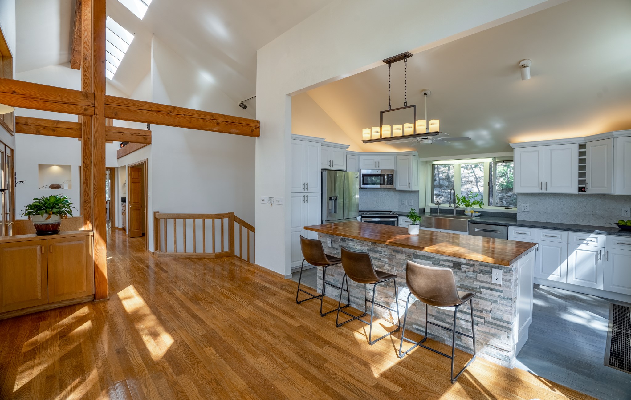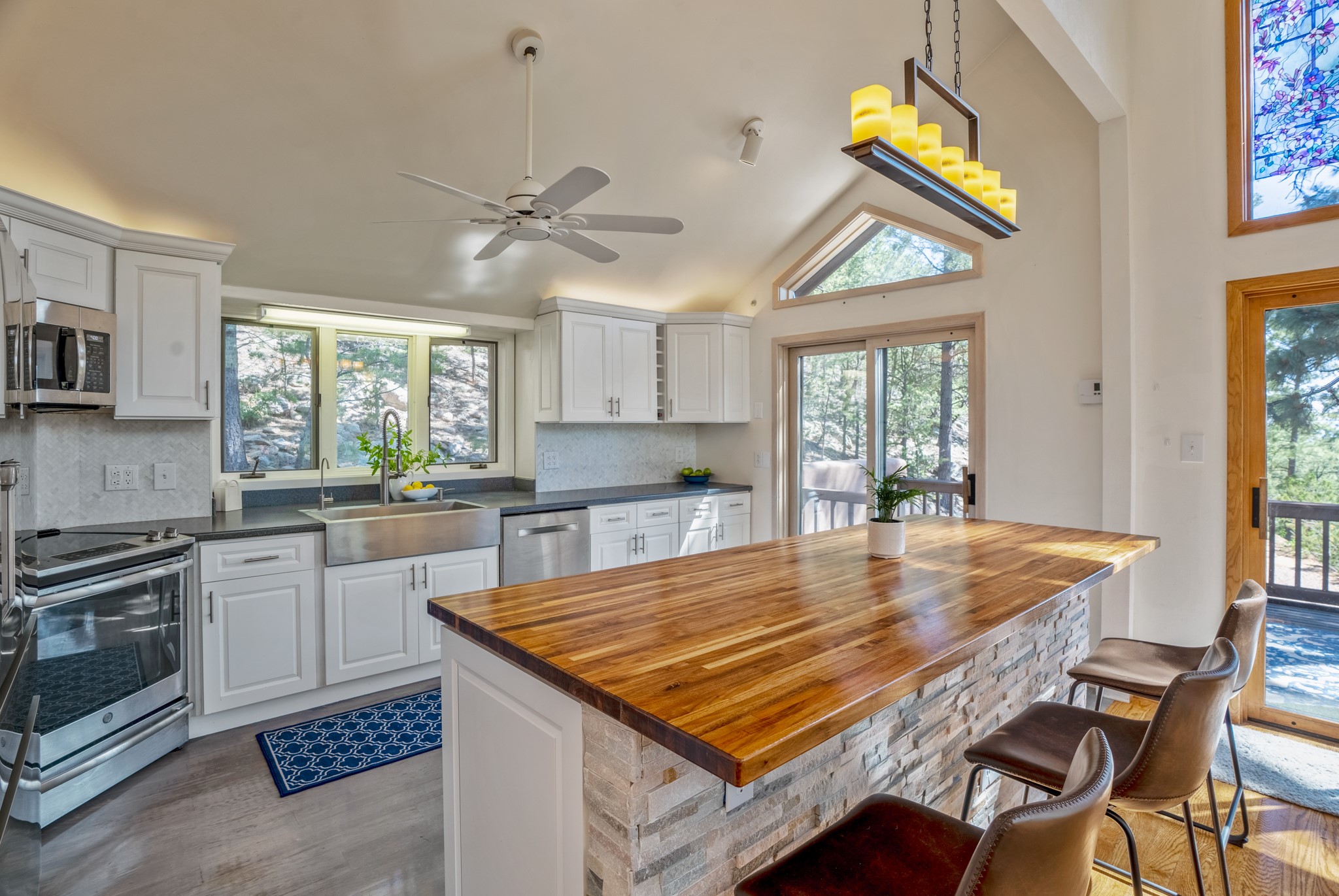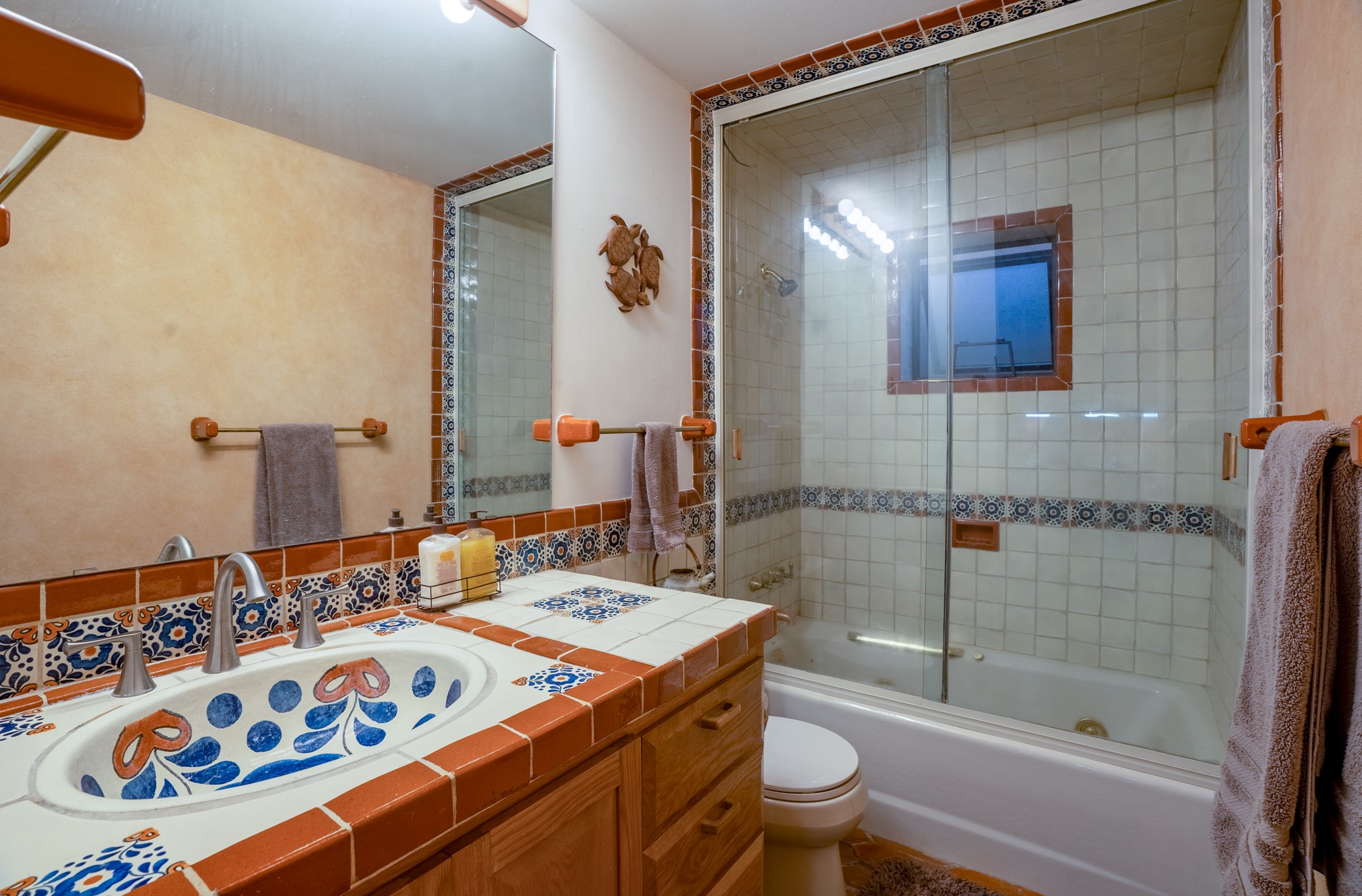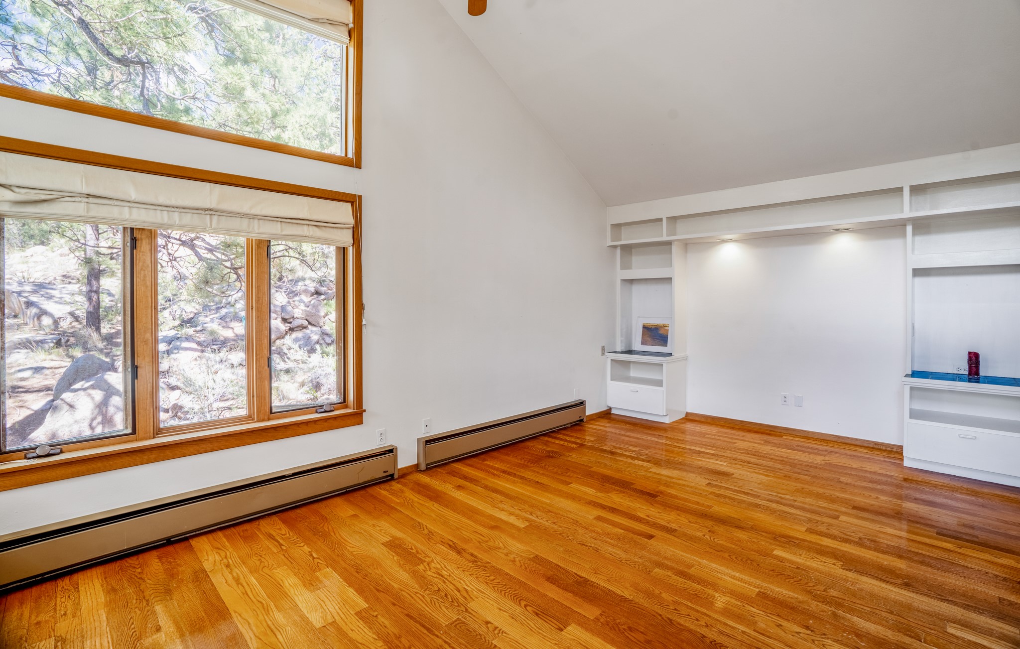 Privacy and serenity set on 10+ acres, just minutes from town! This light & bright residence is about 12 minutes drive to Antalya. Rio Grande, SF Prep & Thrive schools. What an wonderful opportunity for ski and mountain enthusiasts! A truly magical setting, nestled in the trees w/ dramatic rock outcroppings: a nature lover's dream. This home has numerous , wonderful outdoor living areas (3 decks & 3 patios). Thoughtfully designed home w/ a versatile floor plant to accommodate many lifestyles (home office, kids & grandkids, guests or a separate apartment) The public areas are comfortable and functional; consisting of a recently remodeled kitchen, formal dining room, living room w/ fireplace, & a study/media room (can be an additional bedroom), all with beautiful oak floors. The dining room opens to 2 outdoor decks and the kitchen also has access to one of the decks. The charming master suite features a kiva fireplace, well appointed bath, dual closets, library/loft, that leads outside to another deck. The 2nd bedroom is large w/a big storage closet, kiva fireplace; accesses another lively outdoor living area; designed as a den/family room or a guest apartment (a bathroom & pantry/kitchen adjoin it) so it can easily be a self-contained studio apt. The 11 acre site offers privacy and great hiking. No steep mountainous roads & mainly paved; this gated neighborhood off Old Santa Fe Trail is just minutes to the Plaza