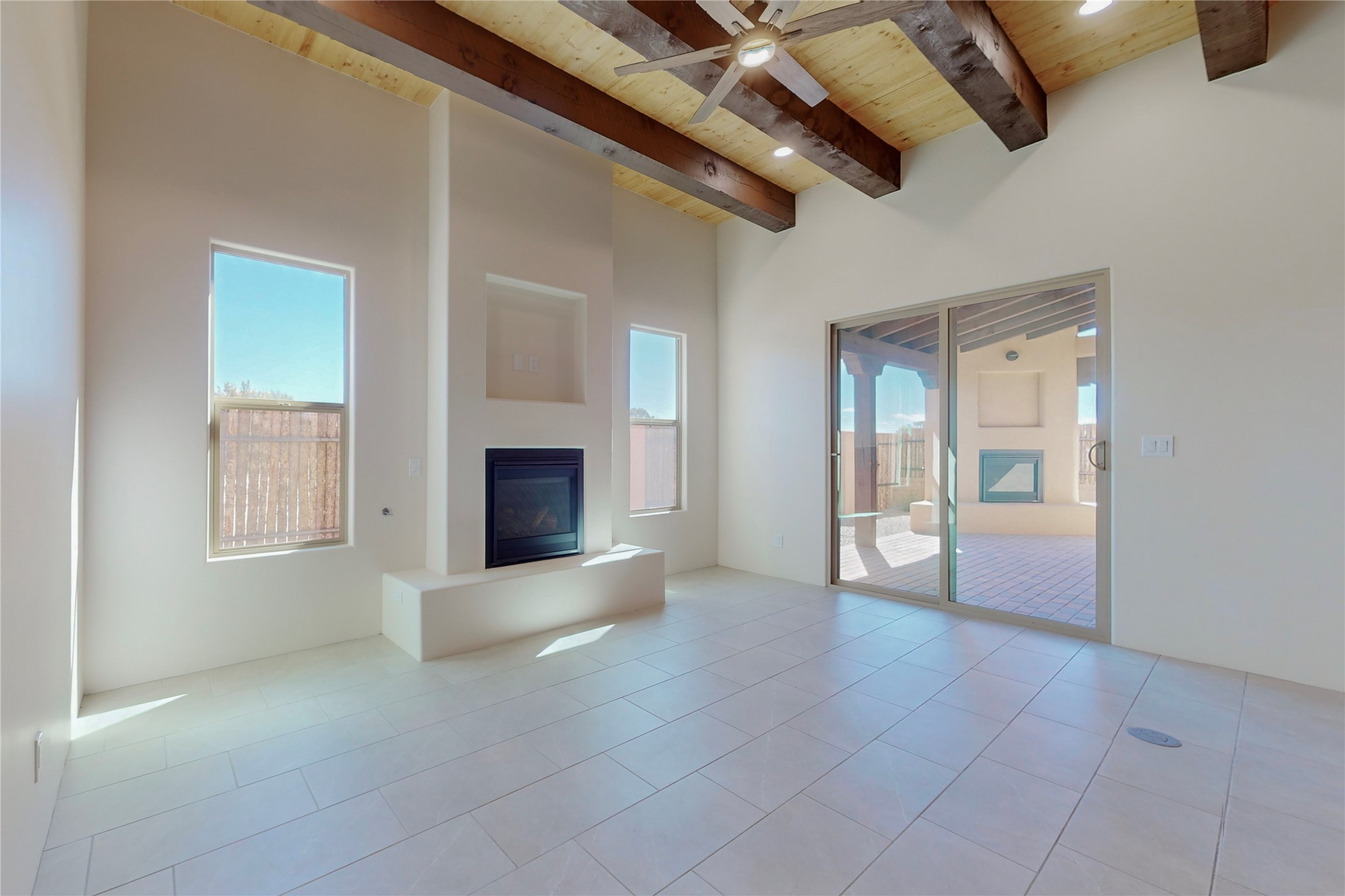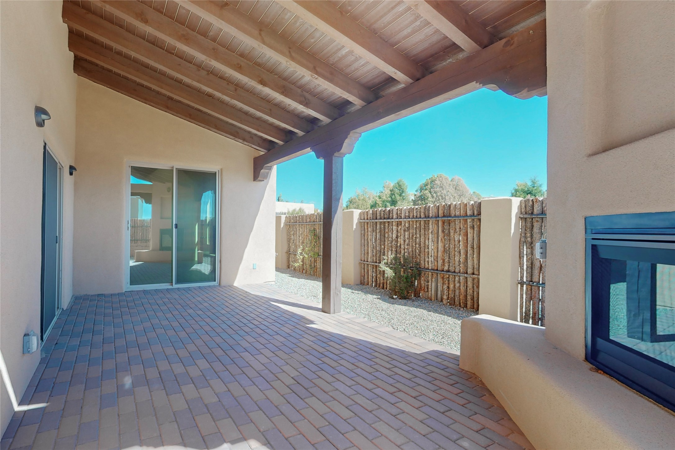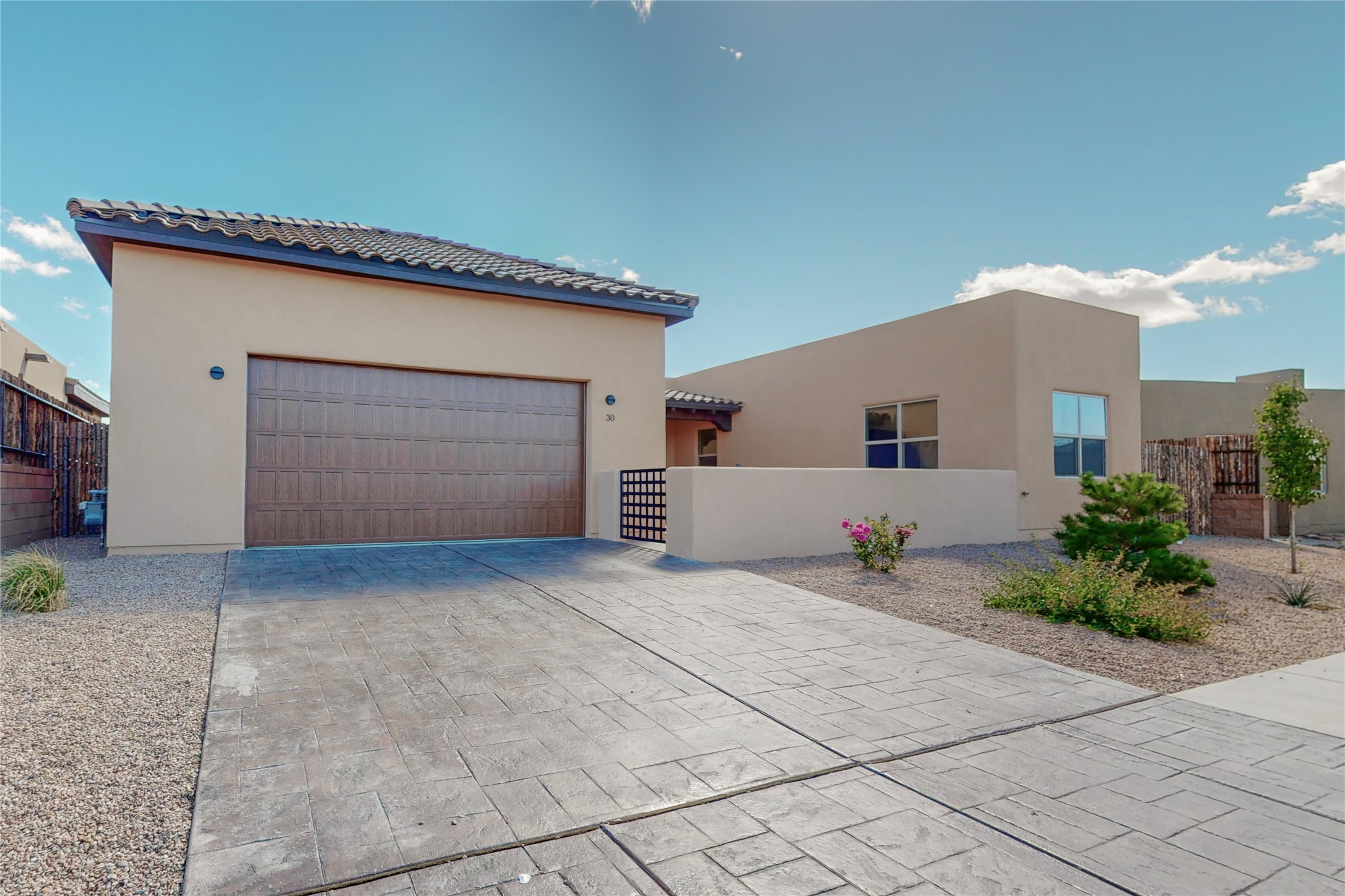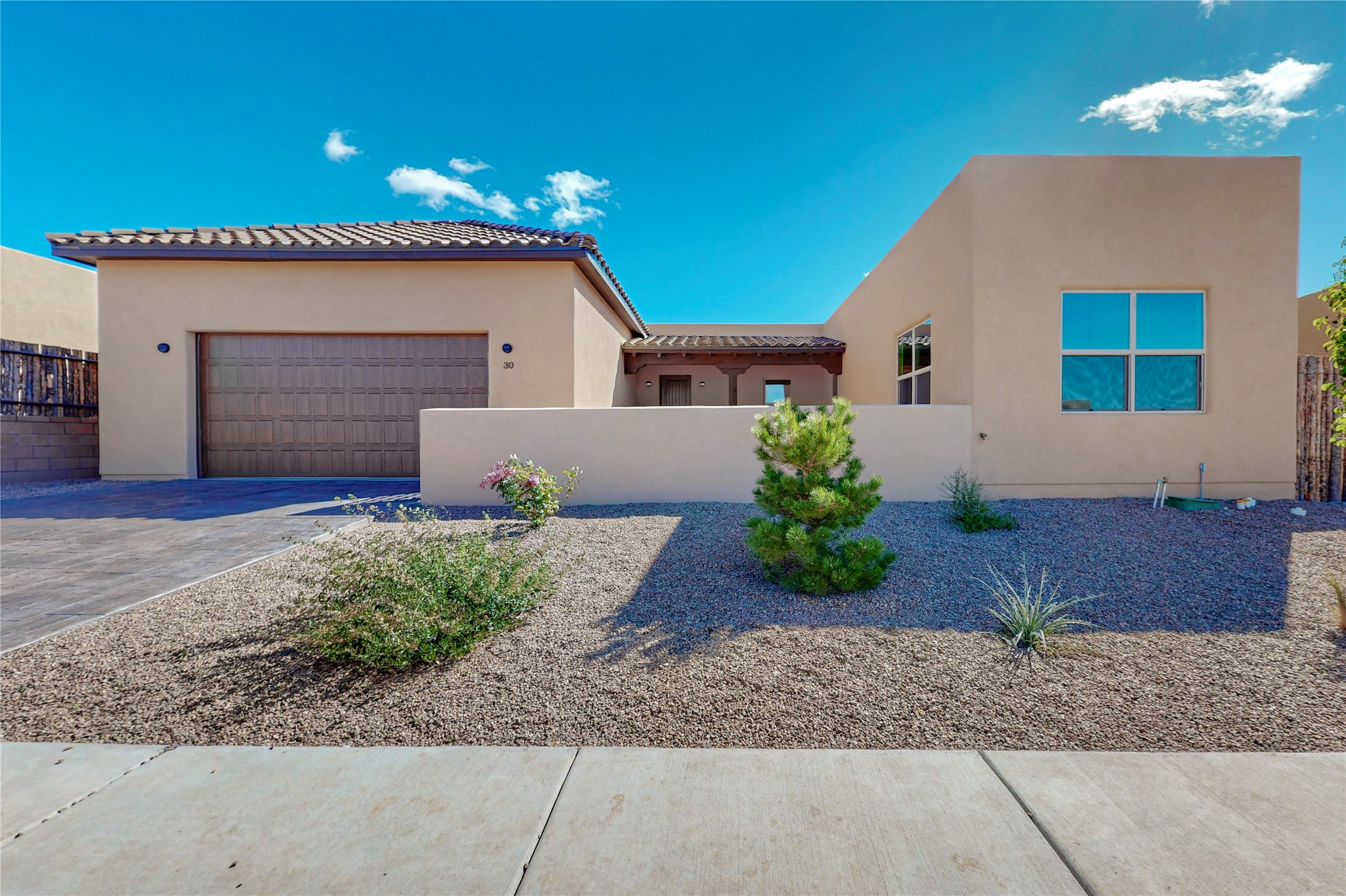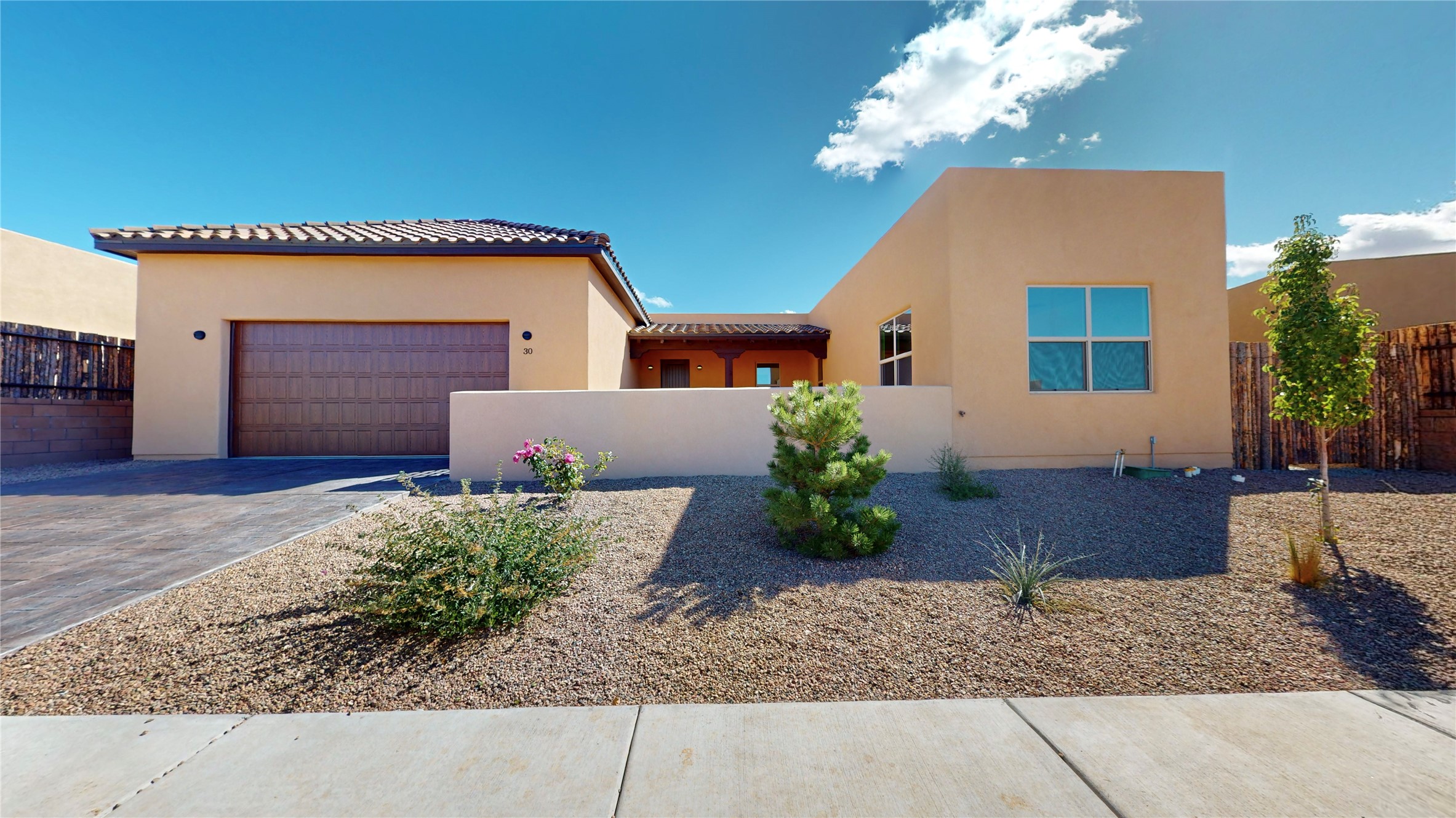 Just Completed! This San Antonio Plan contains 2260 sq. ft., 3 bedrooms and 2 1/2 baths. Located at 30 Pinon Doblado in the La Pradera Subdivision, the exterior is a pitched roof Spanish design with clay-like tile roofs and covered portals with heavy wood beams and brick pavers. The 2-car driveway is a colored stamped-concrete design. The home is entered through an 8 ft. high door to a foyer with a boveda ceiling and beige, wood-like porcelain floor tiles. To the left is a powder room and to the right is a hallway with a nicho-accented wall leading to two (2) guest bedrooms. The foyer leads into the living/dining room which has a 12-foot-high ceiling with Dark, brown-stained wood beams and clear T & G trim and a gas fireplace. The living room and the owner's suite open out to a covered portal with brick pavers and a gas-fired fireplace. The open kitchen has dark birch cabinets. An exceptionally large pantry is directly off the kitchen. The utility room is then accessed from the pantry and has ample cabinets, a skylight, and a sink. The owner's bath has a large walk-in shower with euro-style shower fixtures and an overhead rain shower head. There is also an exceptionally large walk-in closet. The insulated garage includes a storage room and an epoxy-coated floor.