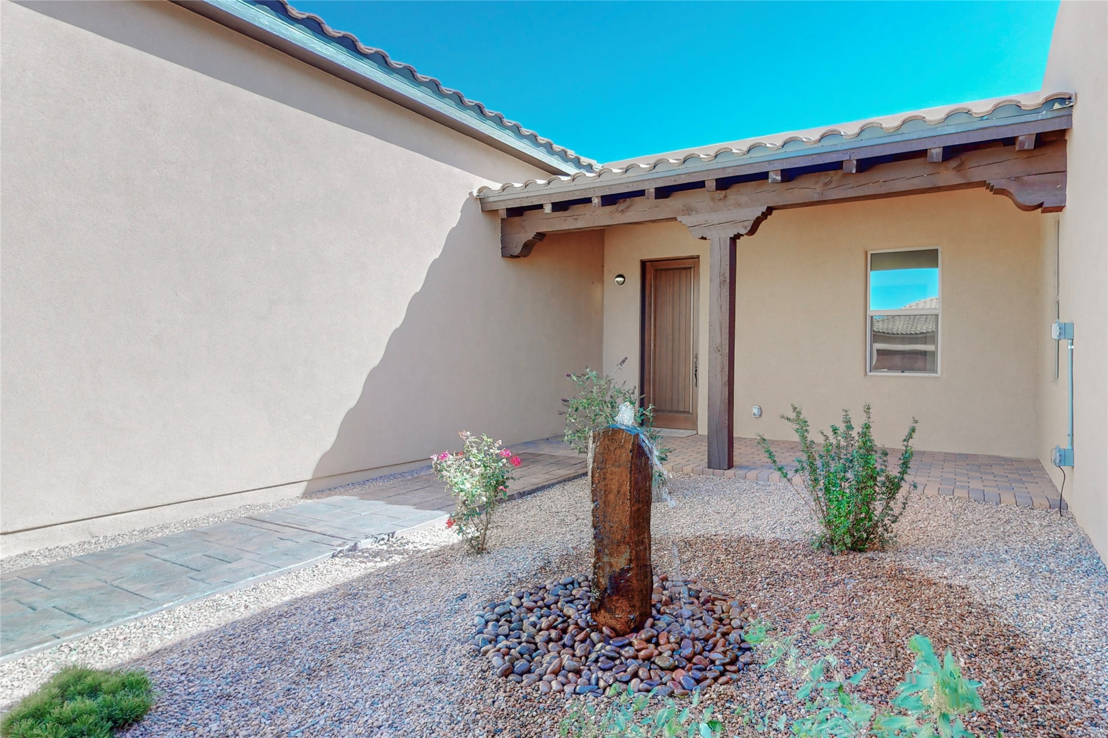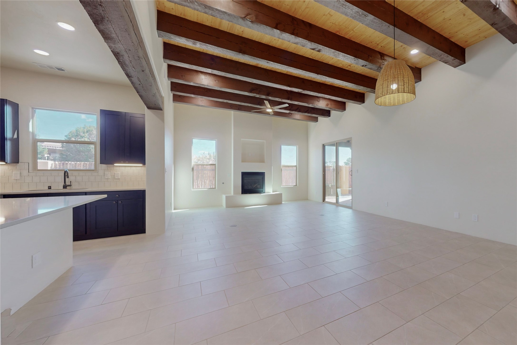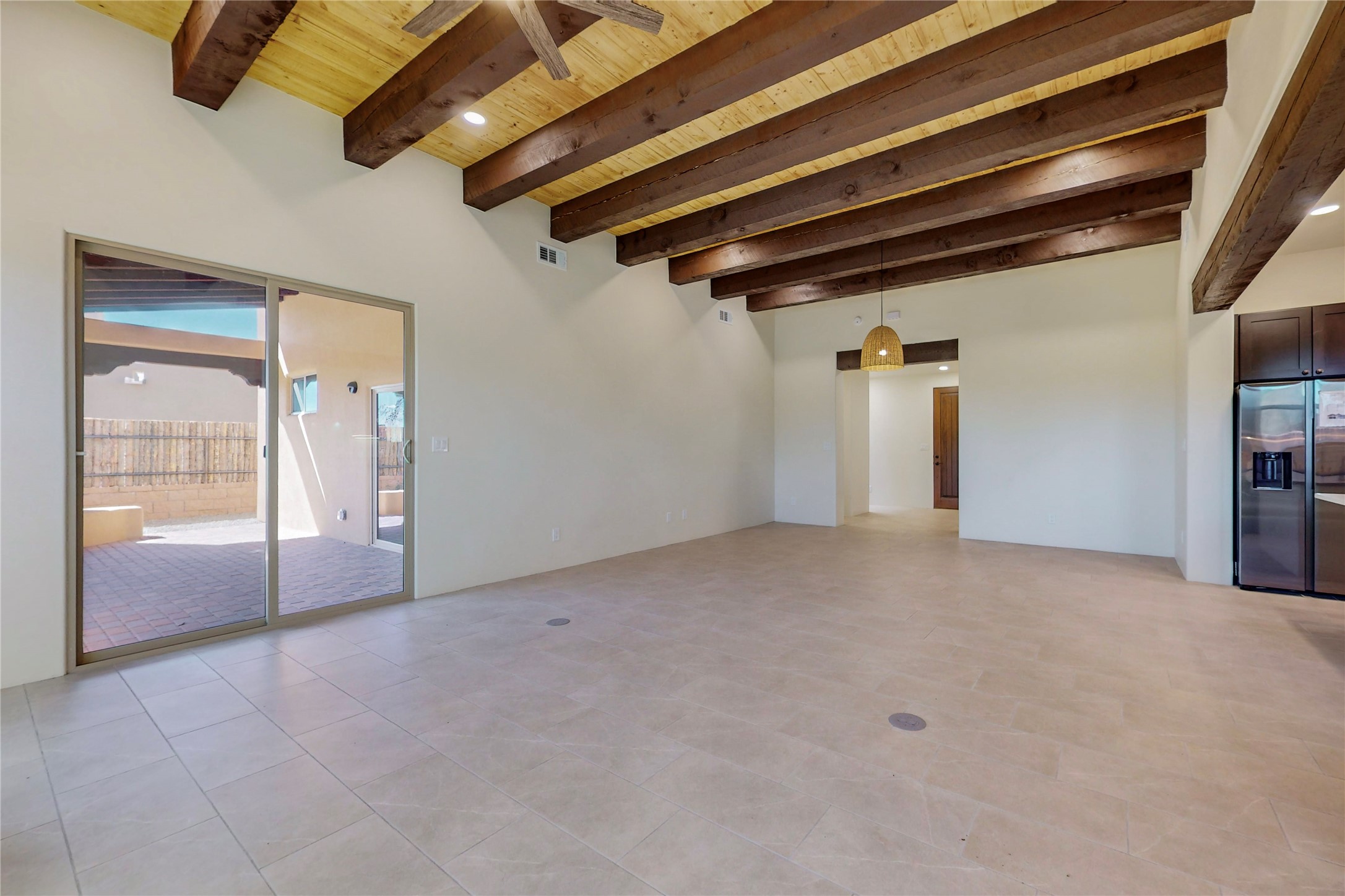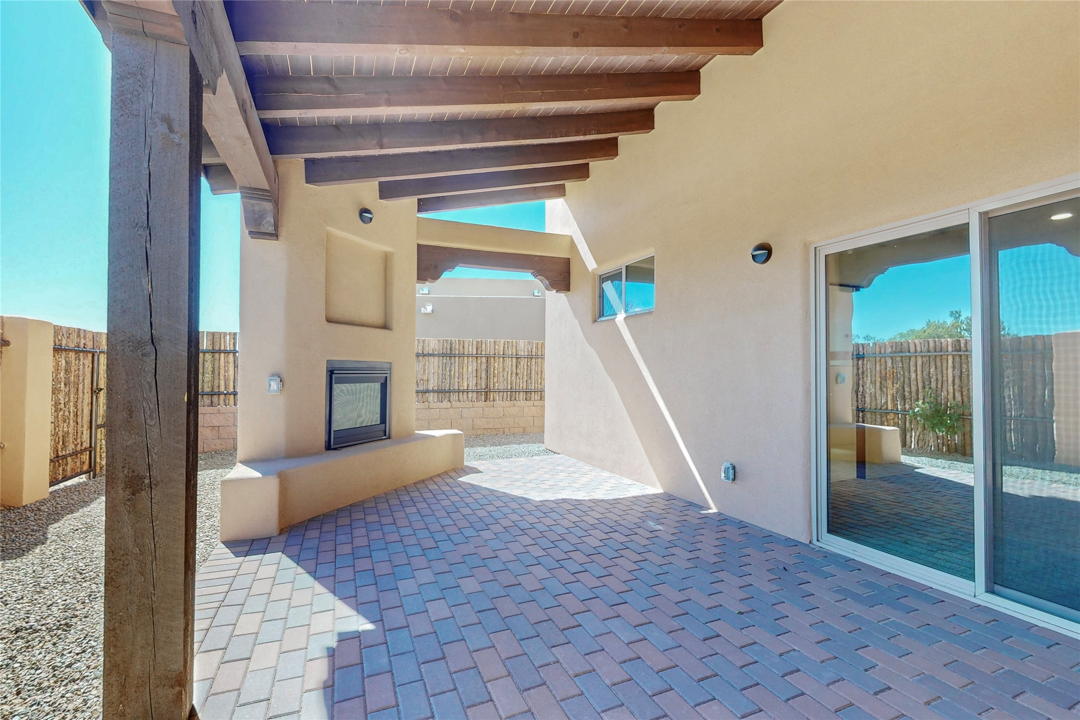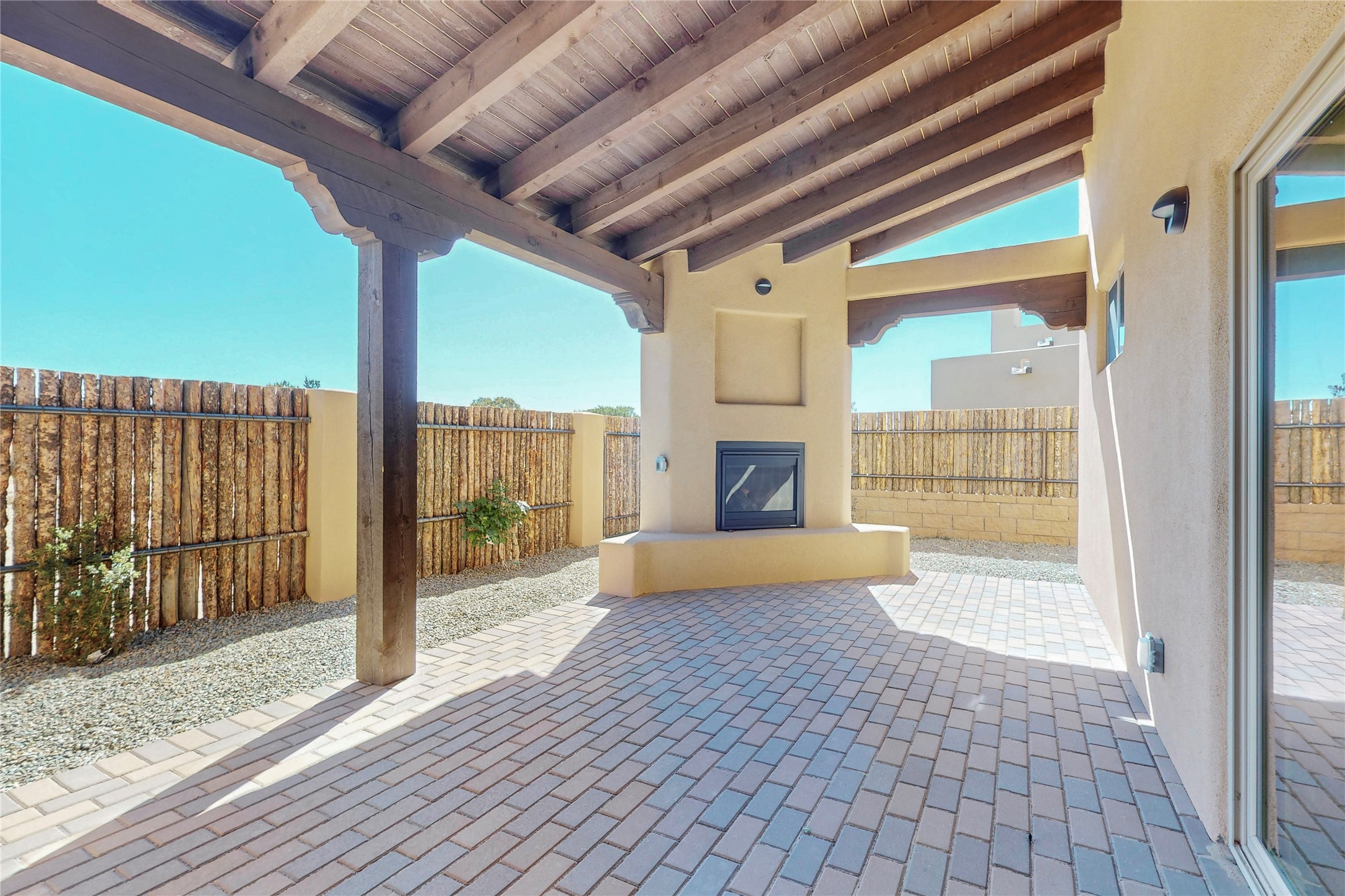 Just Completed! This San Antonio Plan contains 2260 sq. ft., 3 bedrooms and 2 1/2 baths. Located at 30 Pinon Doblado in the La Pradera Subdivision, the exterior is a pitched roof Spanish design with clay-like tile roofs and covered portals with heavy wood beams and brick pavers. The 2-car driveway is a colored stamped-concrete design. The home is entered through an 8 ft. high door to a foyer with a boveda ceiling and beige, wood-like porcelain floor tiles. To the left is a powder room and to the right is a hallway with a nicho-accented wall leading to two (2) guest bedrooms. The foyer leads into the living/dining room which has a 12-foot-high ceiling with Dark, brown-stained wood beams and clear T & G trim and a gas fireplace. The living room and the owner's suite open out to a covered portal with brick pavers and a gas-fired fireplace. The open kitchen has dark birch cabinets. An exceptionally large pantry is directly off the kitchen. The utility room is then accessed from the pantry and has ample cabinets, a skylight, and a sink. The owner's bath has a large walk-in shower with euro-style shower fixtures and an overhead rain shower head. There is also an exceptionally large walk-in closet. The insulated garage includes a storage room and an epoxy-coated floor.