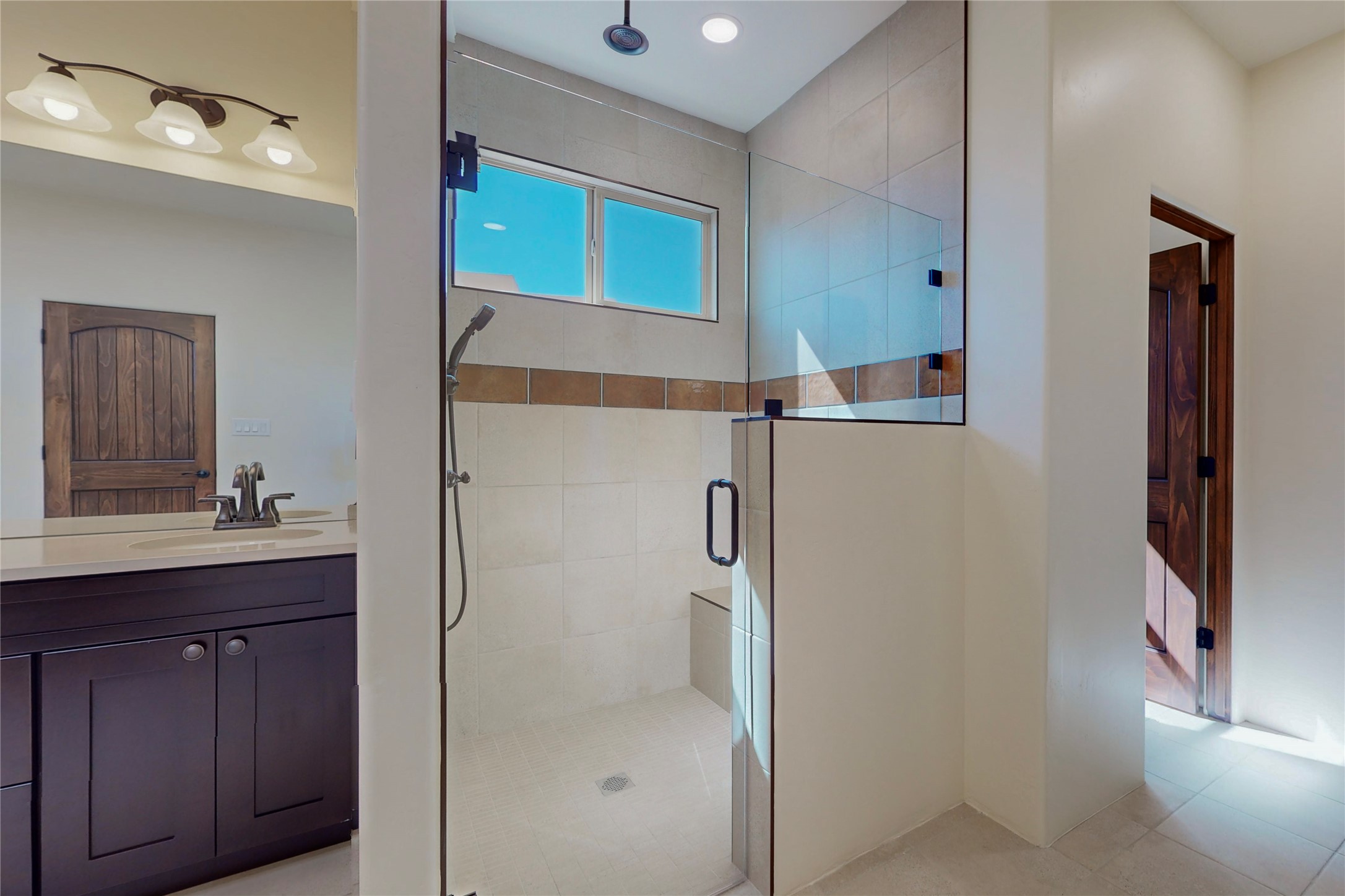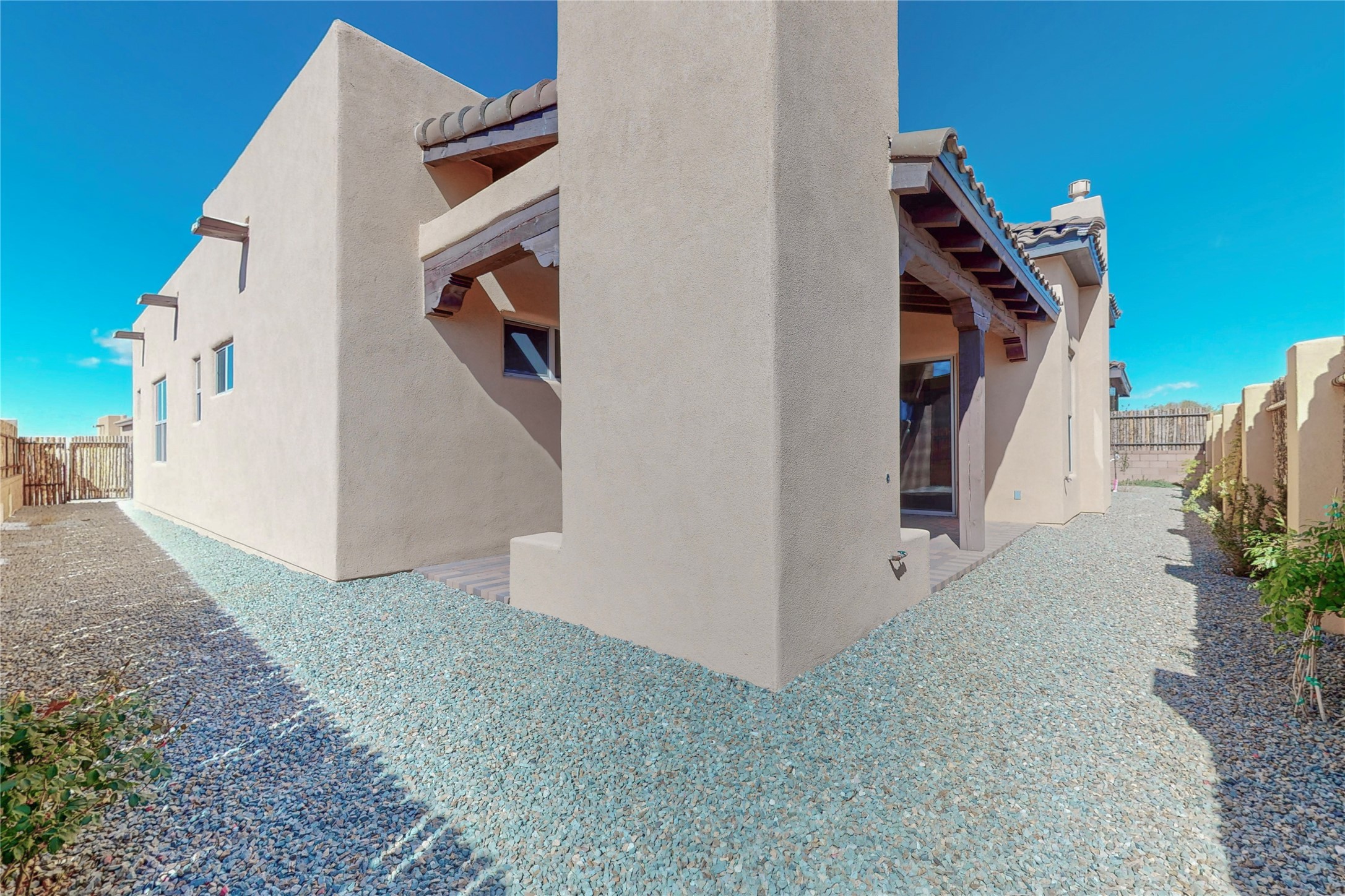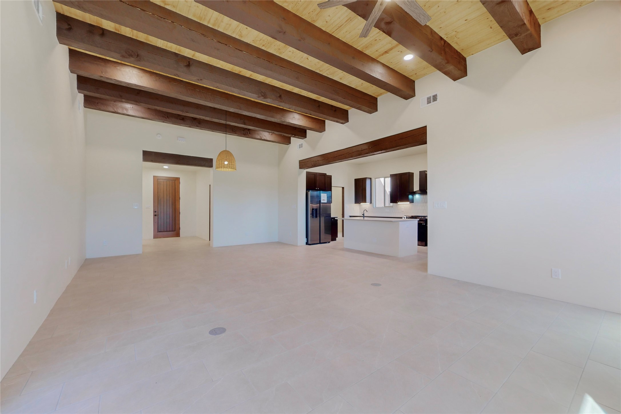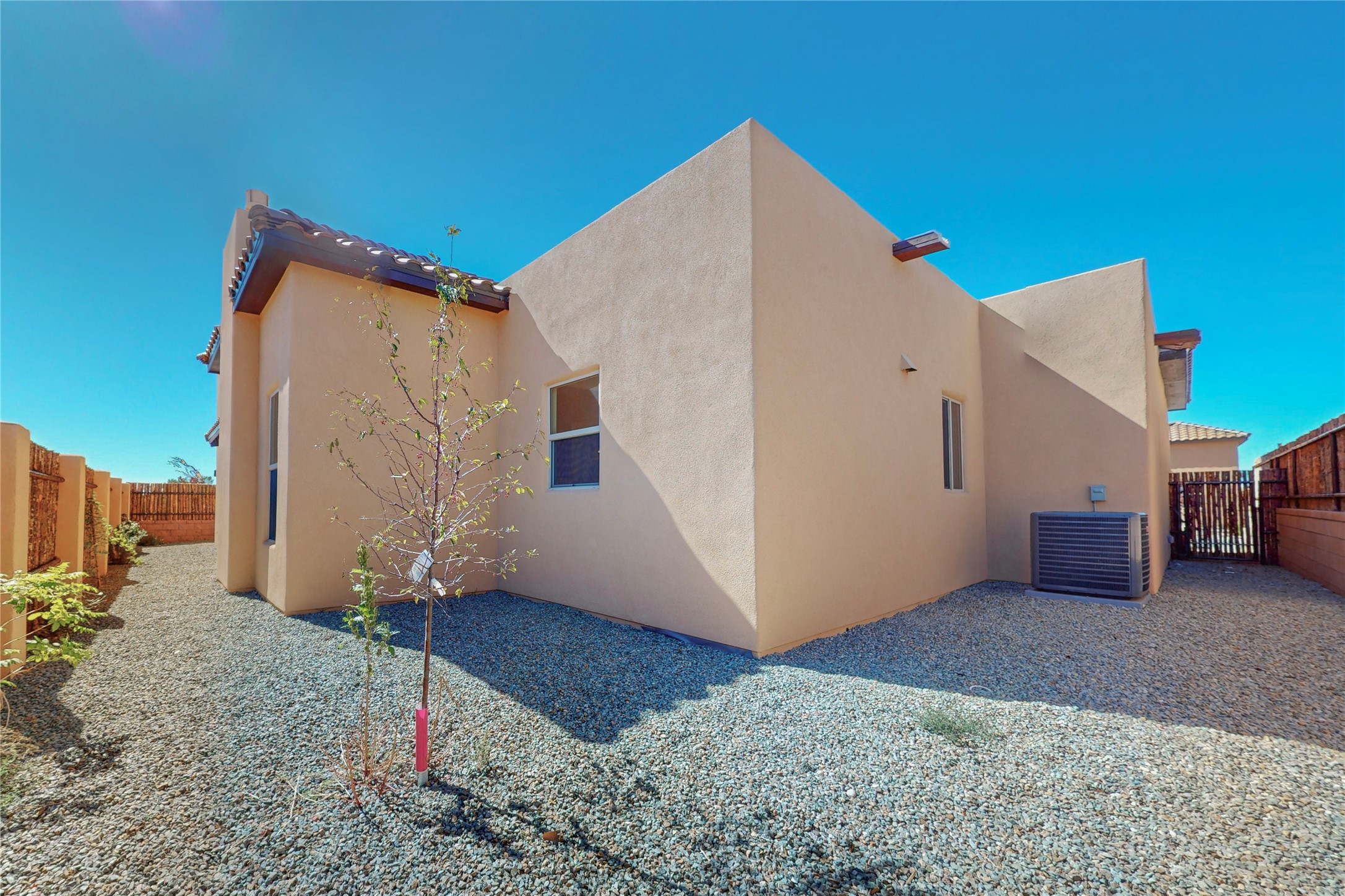 Just Completed! This San Antonio Plan contains 2260 sq. ft., 3 bedrooms and 2 1/2 baths. Located at 30 Pinon Doblado in the La Pradera Subdivision, the exterior is a pitched roof Spanish design with clay-like tile roofs and covered portals with heavy wood beams and brick pavers. The 2-car driveway is a colored stamped-concrete design. The home is entered through an 8 ft. high door to a foyer with a boveda ceiling and beige, wood-like porcelain floor tiles. To the left is a powder room and to the right is a hallway with a nicho-accented wall leading to two (2) guest bedrooms. The foyer leads into the living/dining room which has a 12-foot-high ceiling with Dark, brown-stained wood beams and clear T & G trim and a gas fireplace. The living room and the owner's suite open out to a covered portal with brick pavers and a gas-fired fireplace. The open kitchen has dark birch cabinets. An exceptionally large pantry is directly off the kitchen. The utility room is then accessed from the pantry and has ample cabinets, a skylight, and a sink. The owner's bath has a large walk-in shower with euro-style shower fixtures and an overhead rain shower head. There is also an exceptionally large walk-in closet. The insulated garage includes a storage room and an epoxy-coated floor.