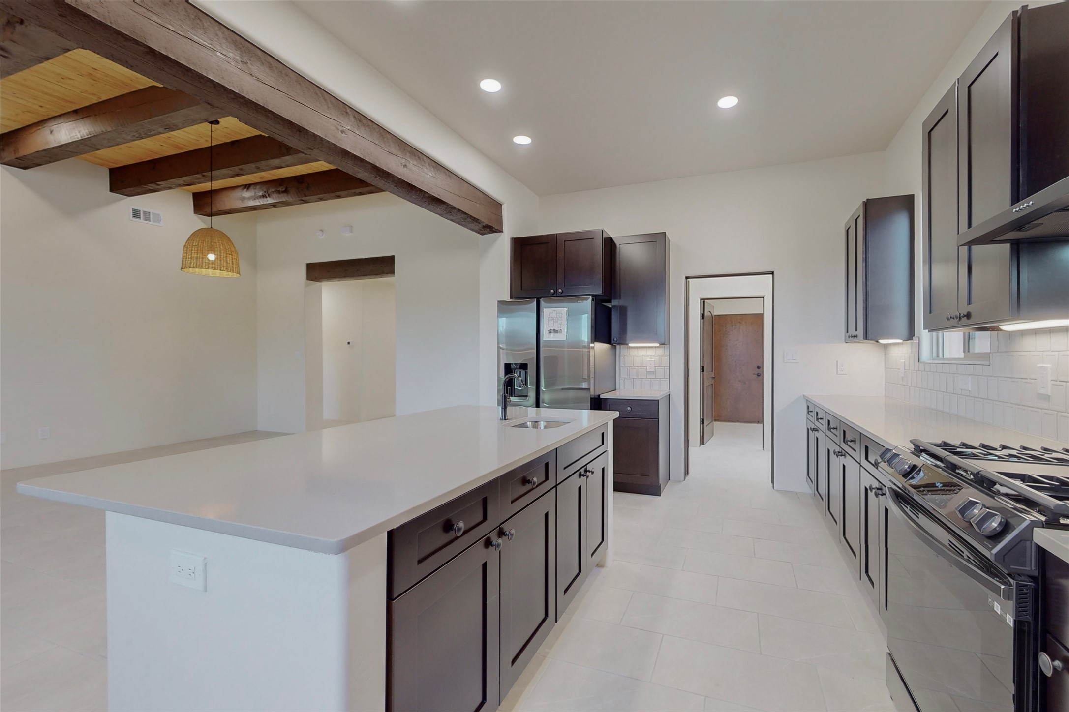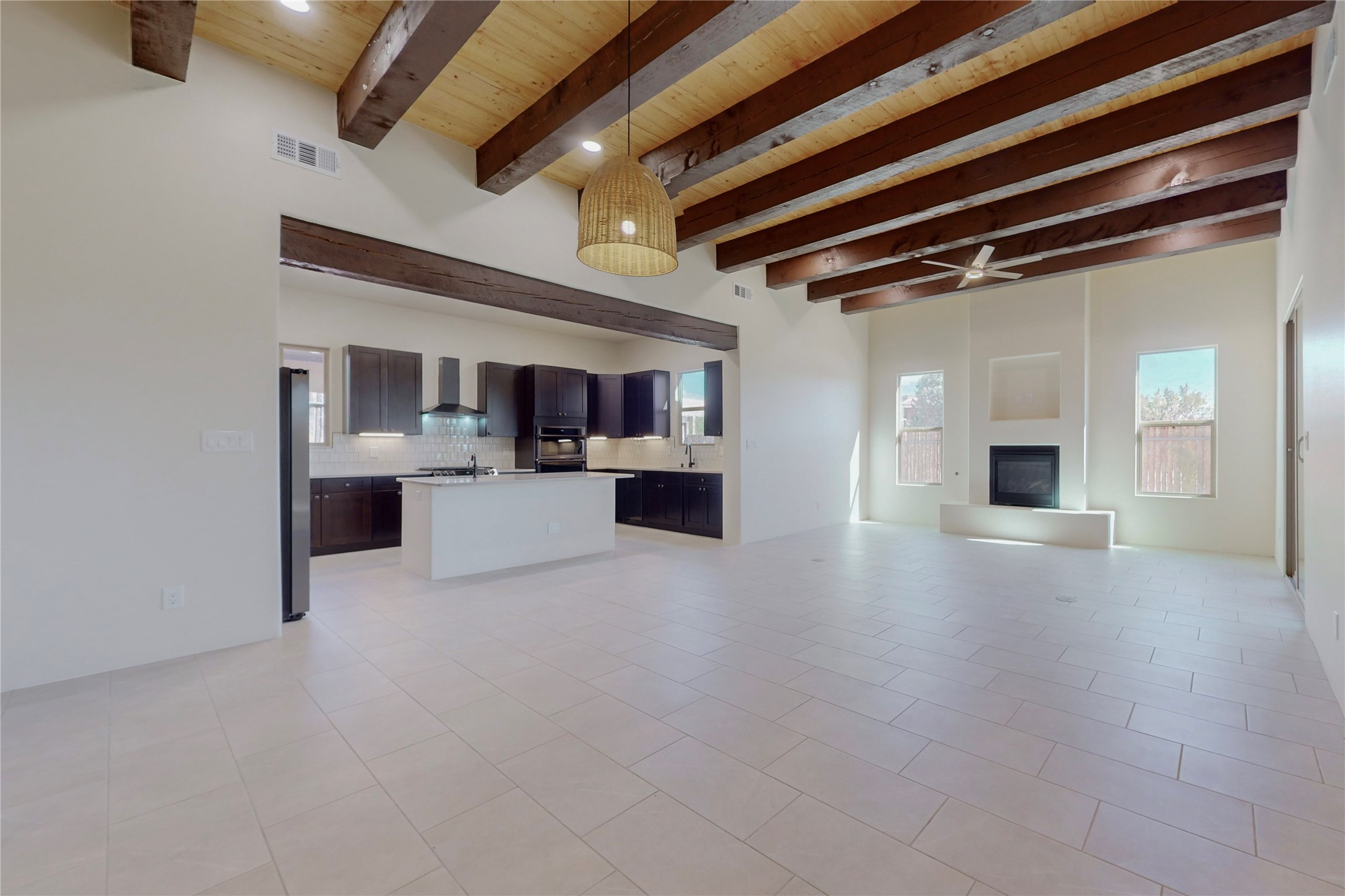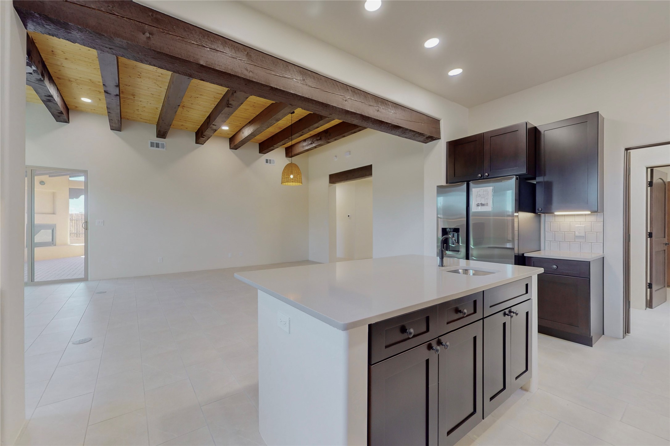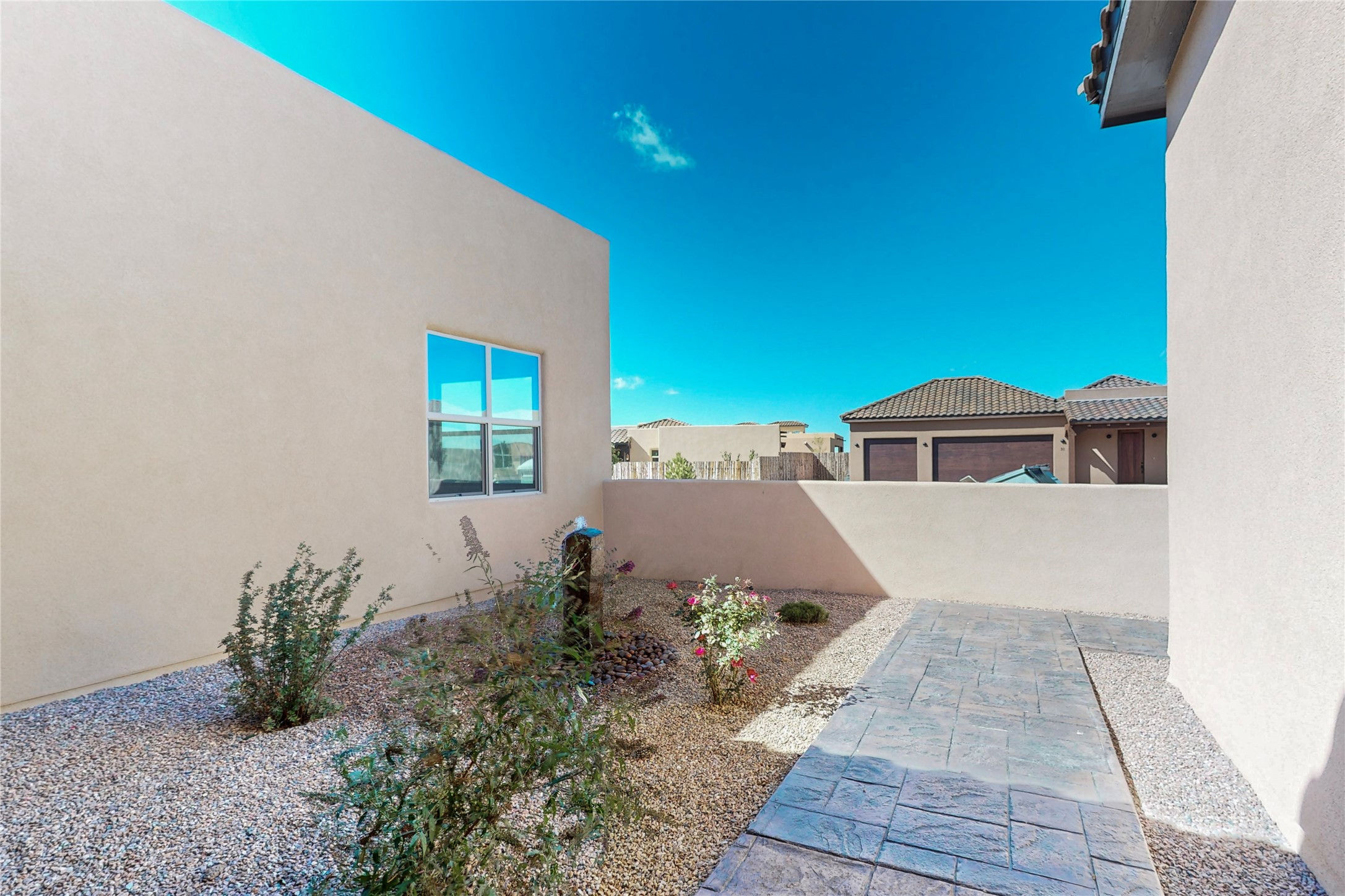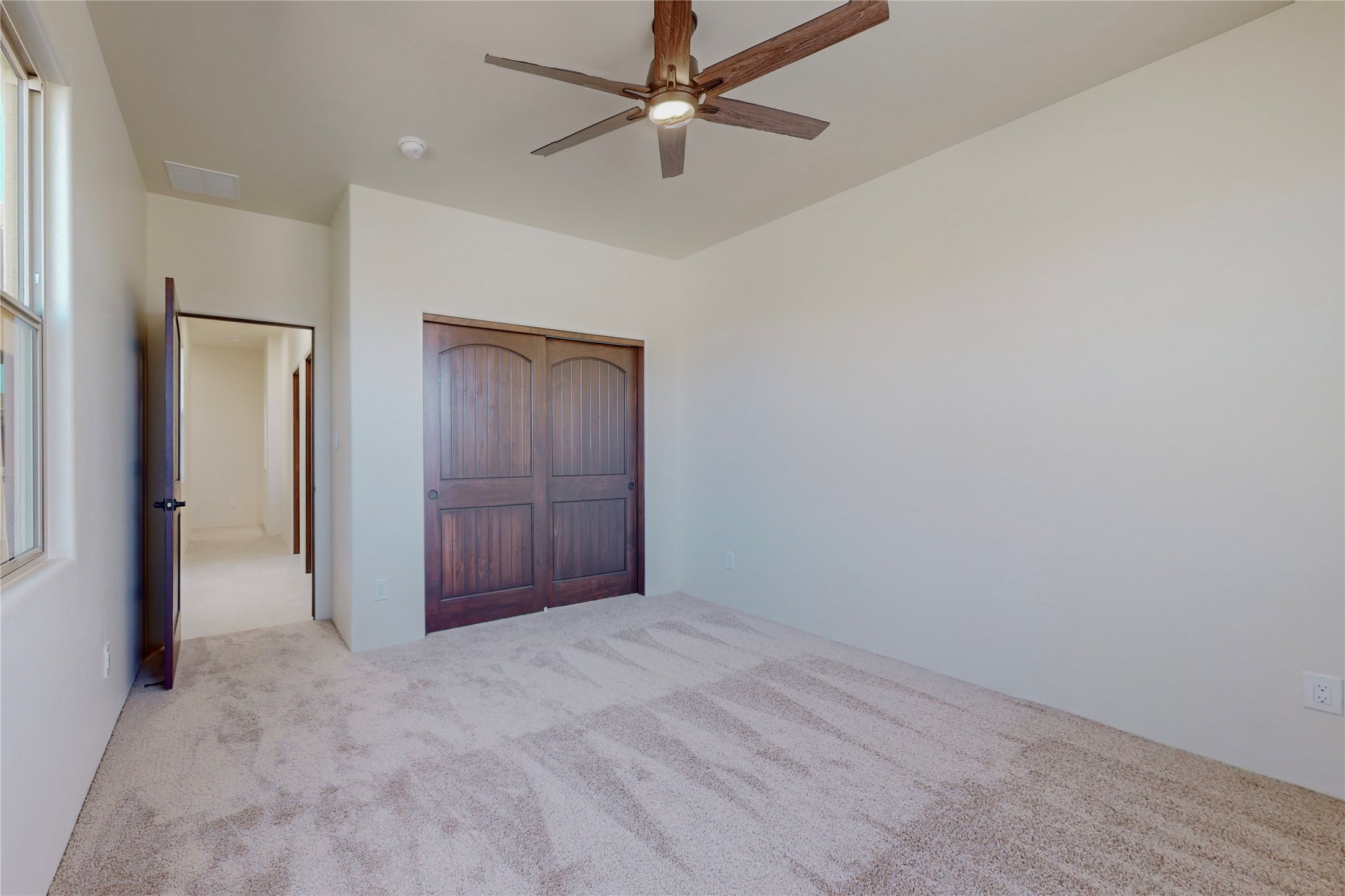 Just Completed! This San Antonio Plan contains 2260 sq. ft., 3 bedrooms and 2 1/2 baths. Located at 30 Pinon Doblado in the La Pradera Subdivision, the exterior is a pitched roof Spanish design with clay-like tile roofs and covered portals with heavy wood beams and brick pavers. The 2-car driveway is a colored stamped-concrete design. The home is entered through an 8 ft. high door to a foyer with a boveda ceiling and beige, wood-like porcelain floor tiles. To the left is a powder room and to the right is a hallway with a nicho-accented wall leading to two (2) guest bedrooms. The foyer leads into the living/dining room which has a 12-foot-high ceiling with Dark, brown-stained wood beams and clear T & G trim and a gas fireplace. The living room and the owner's suite open out to a covered portal with brick pavers and a gas-fired fireplace. The open kitchen has dark birch cabinets. An exceptionally large pantry is directly off the kitchen. The utility room is then accessed from the pantry and has ample cabinets, a skylight, and a sink. The owner's bath has a large walk-in shower with euro-style shower fixtures and an overhead rain shower head. There is also an exceptionally large walk-in closet. The insulated garage includes a storage room and an epoxy-coated floor.