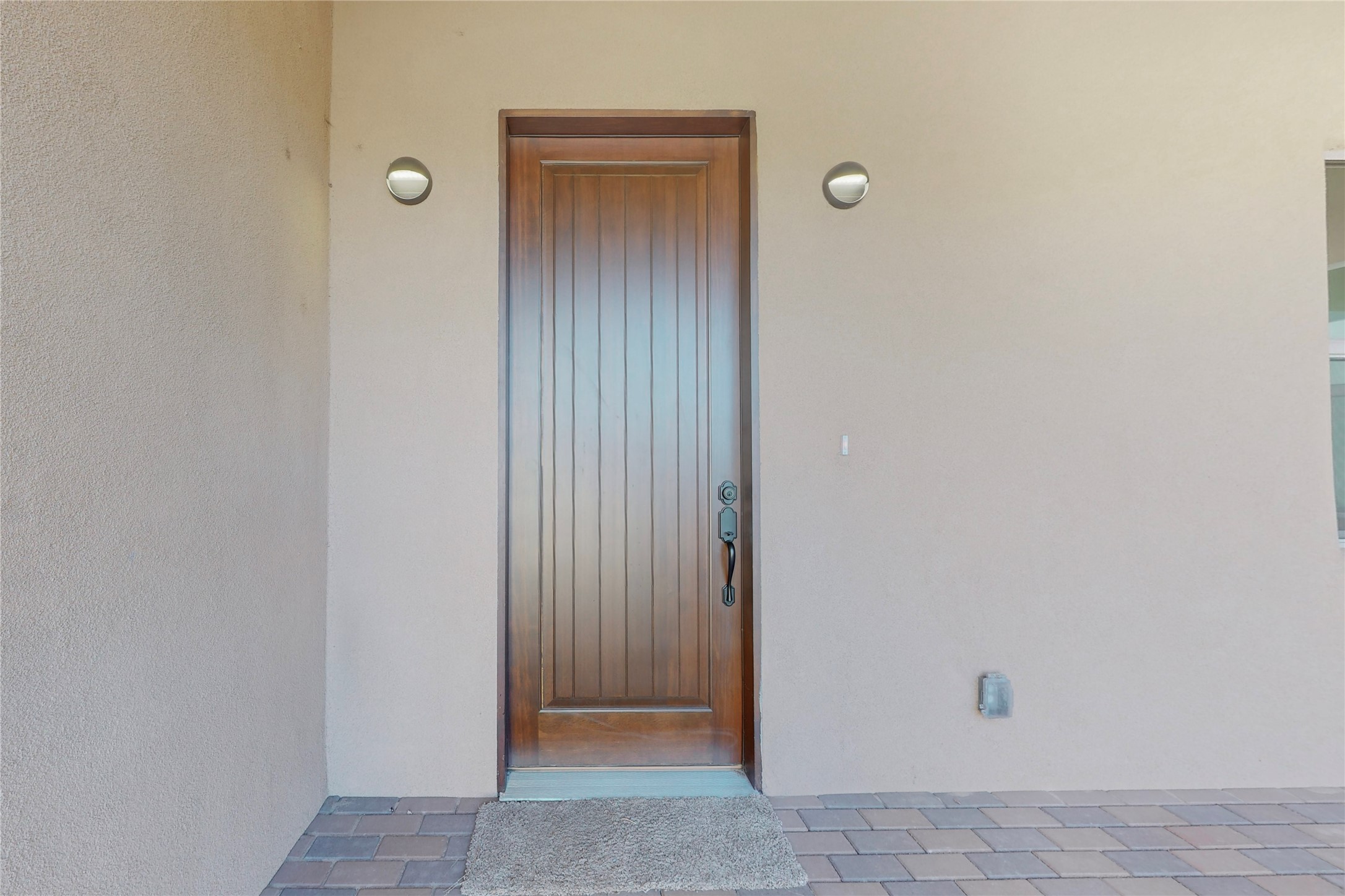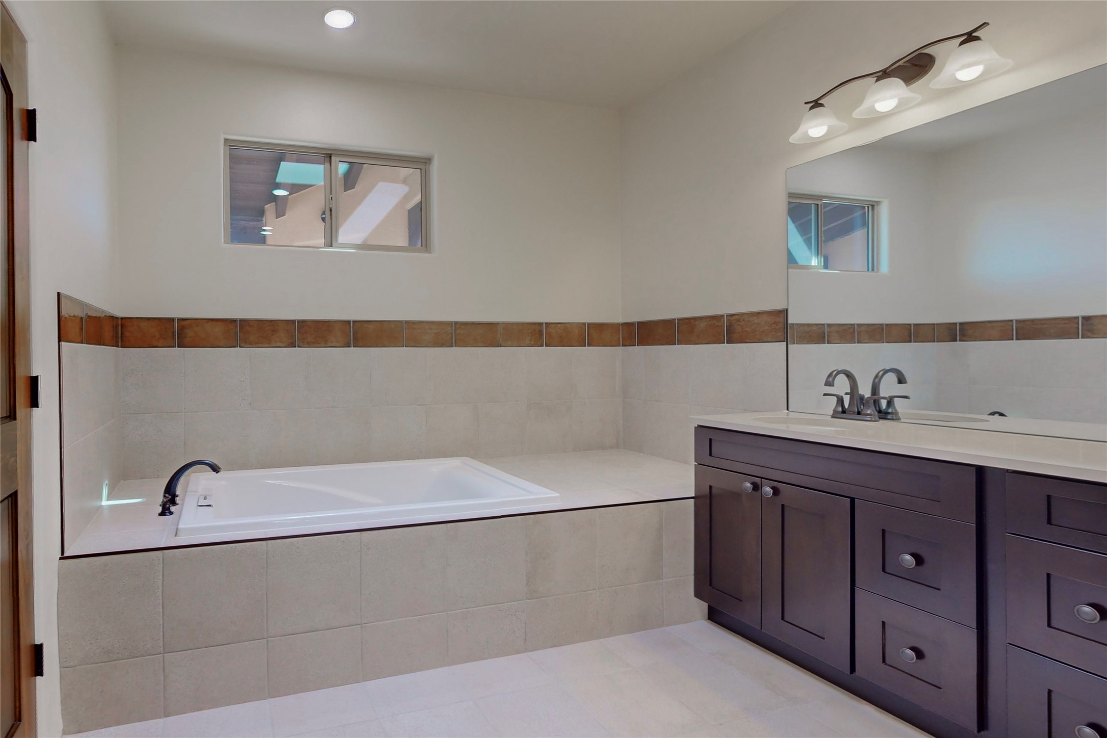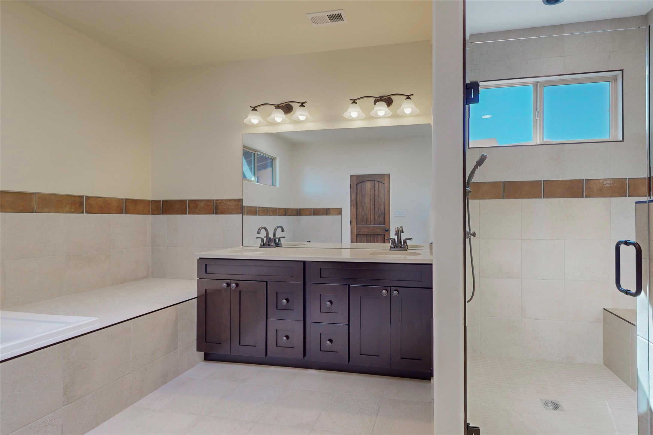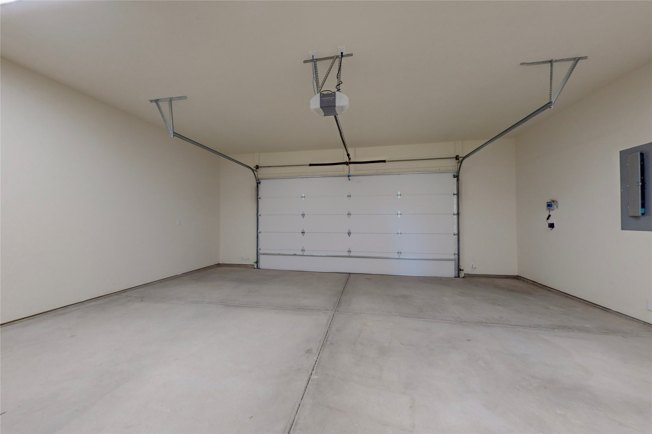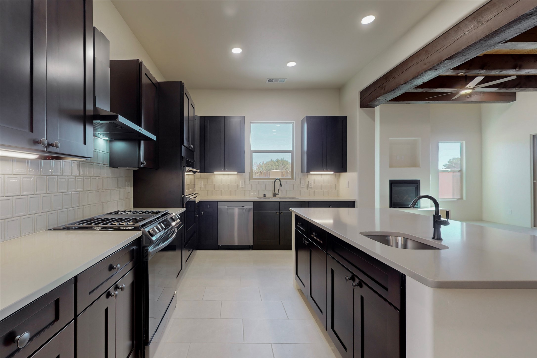 Just Completed! This San Antonio Plan contains 2260 sq. ft., 3 bedrooms and 2 1/2 baths. Located at 30 Pinon Doblado in the La Pradera Subdivision, the exterior is a pitched roof Spanish design with clay-like tile roofs and covered portals with heavy wood beams and brick pavers. The 2-car driveway is a colored stamped-concrete design. The home is entered through an 8 ft. high door to a foyer with a boveda ceiling and beige, wood-like porcelain floor tiles. To the left is a powder room and to the right is a hallway with a nicho-accented wall leading to two (2) guest bedrooms. The foyer leads into the living/dining room which has a 12-foot-high ceiling with Dark, brown-stained wood beams and clear T & G trim and a gas fireplace. The living room and the owner's suite open out to a covered portal with brick pavers and a gas-fired fireplace. The open kitchen has dark birch cabinets. An exceptionally large pantry is directly off the kitchen. The utility room is then accessed from the pantry and has ample cabinets, a skylight, and a sink. The owner's bath has a large walk-in shower with euro-style shower fixtures and an overhead rain shower head. There is also an exceptionally large walk-in closet. The insulated garage includes a storage room and an epoxy-coated floor.