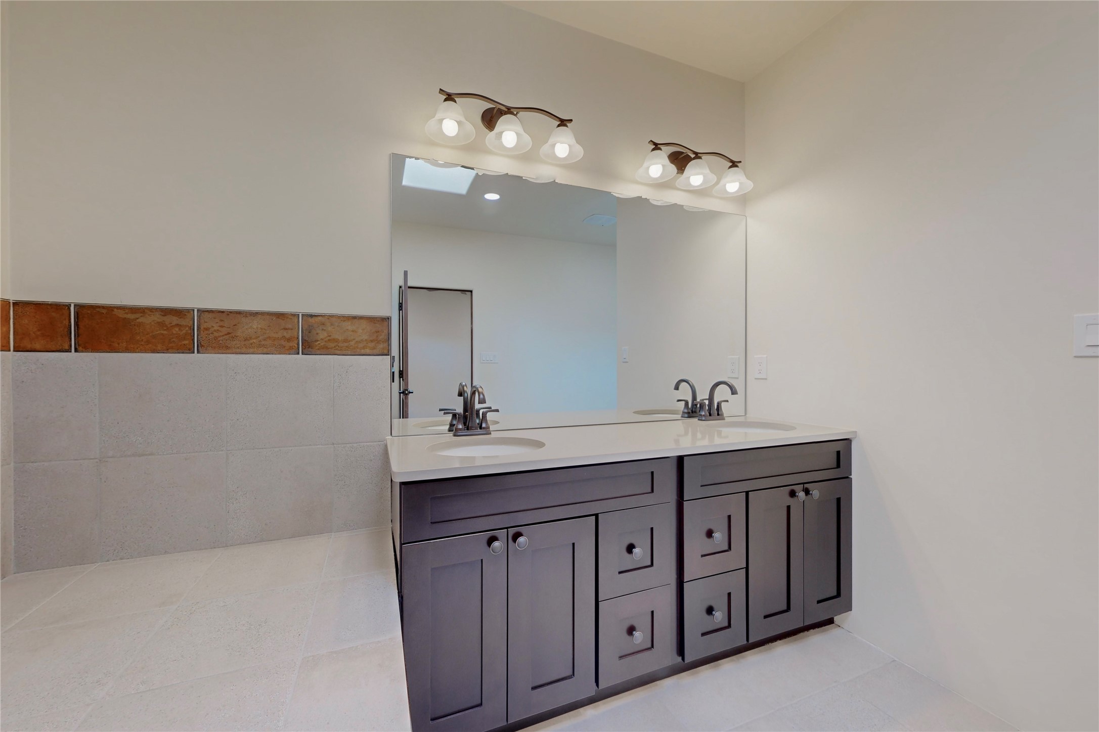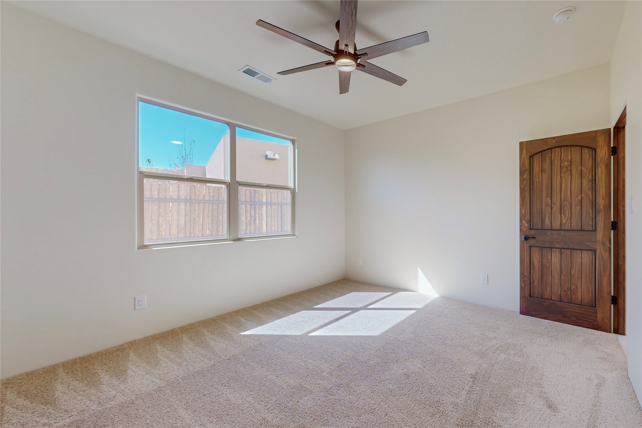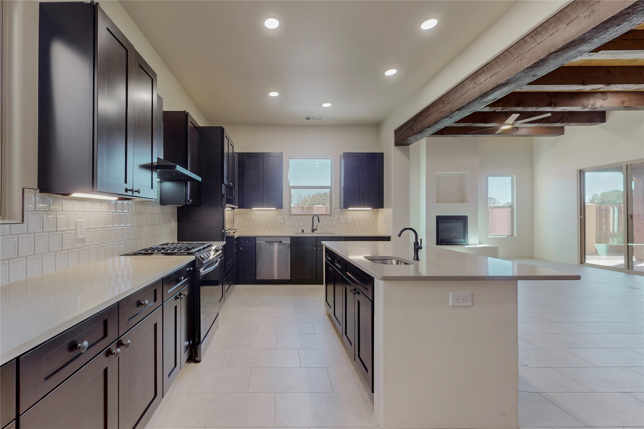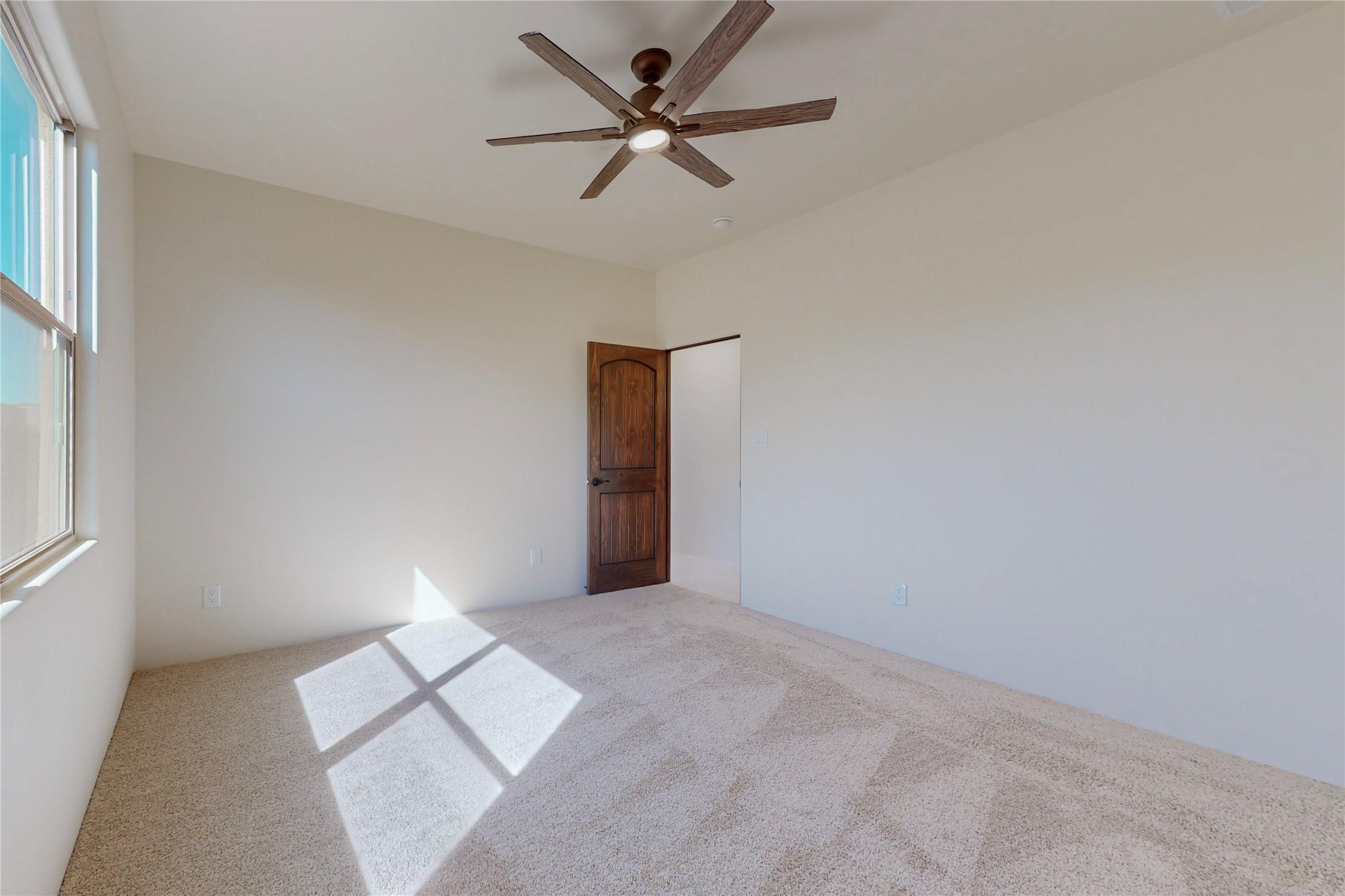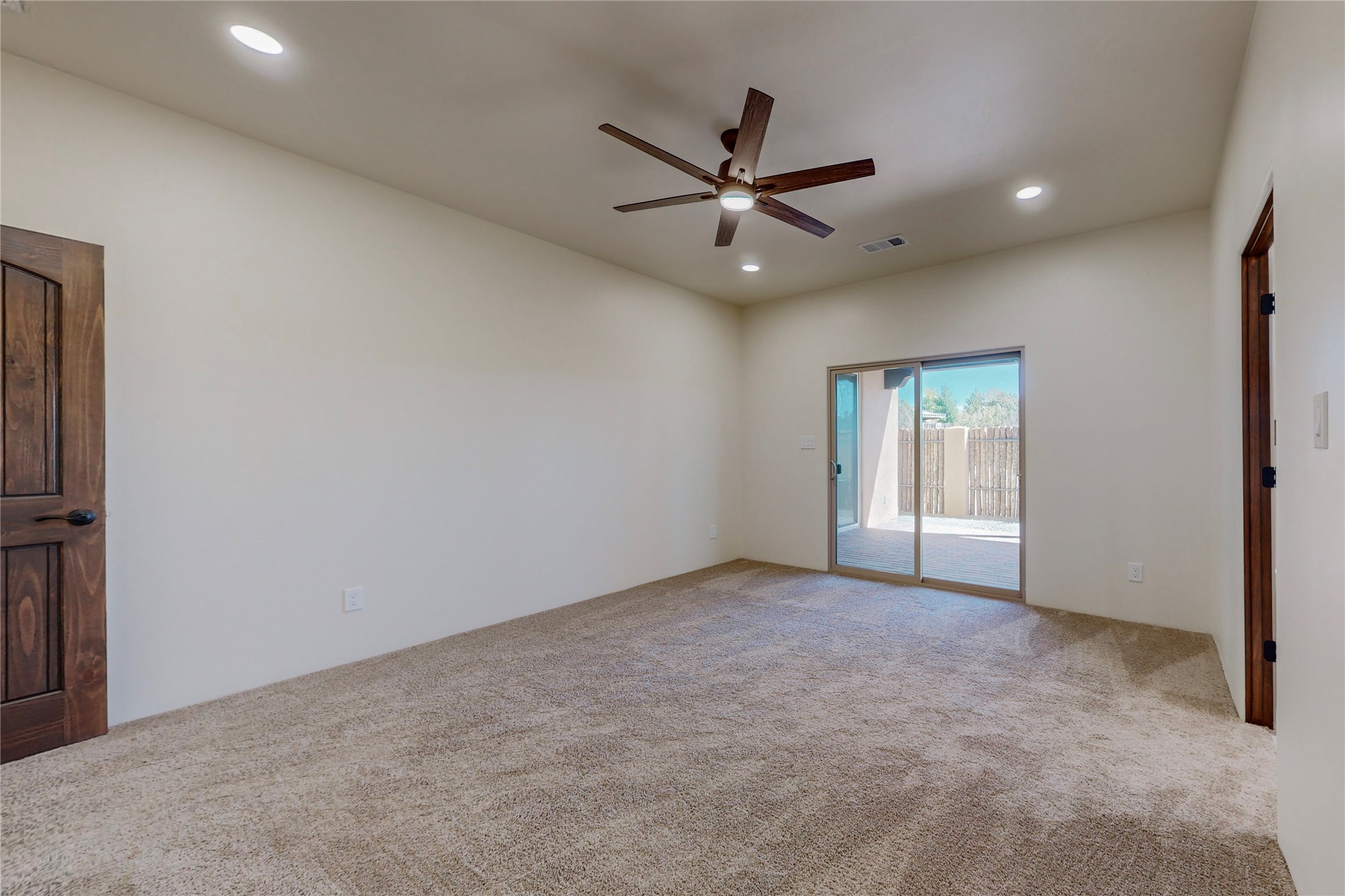 Just Completed! This San Antonio Plan contains 2260 sq. ft., 3 bedrooms and 2 1/2 baths. Located at 30 Pinon Doblado in the La Pradera Subdivision, the exterior is a pitched roof Spanish design with clay-like tile roofs and covered portals with heavy wood beams and brick pavers. The 2-car driveway is a colored stamped-concrete design. The home is entered through an 8 ft. high door to a foyer with a boveda ceiling and beige, wood-like porcelain floor tiles. To the left is a powder room and to the right is a hallway with a nicho-accented wall leading to two (2) guest bedrooms. The foyer leads into the living/dining room which has a 12-foot-high ceiling with Dark, brown-stained wood beams and clear T & G trim and a gas fireplace. The living room and the owner's suite open out to a covered portal with brick pavers and a gas-fired fireplace. The open kitchen has dark birch cabinets. An exceptionally large pantry is directly off the kitchen. The utility room is then accessed from the pantry and has ample cabinets, a skylight, and a sink. The owner's bath has a large walk-in shower with euro-style shower fixtures and an overhead rain shower head. There is also an exceptionally large walk-in closet. The insulated garage includes a storage room and an epoxy-coated floor.