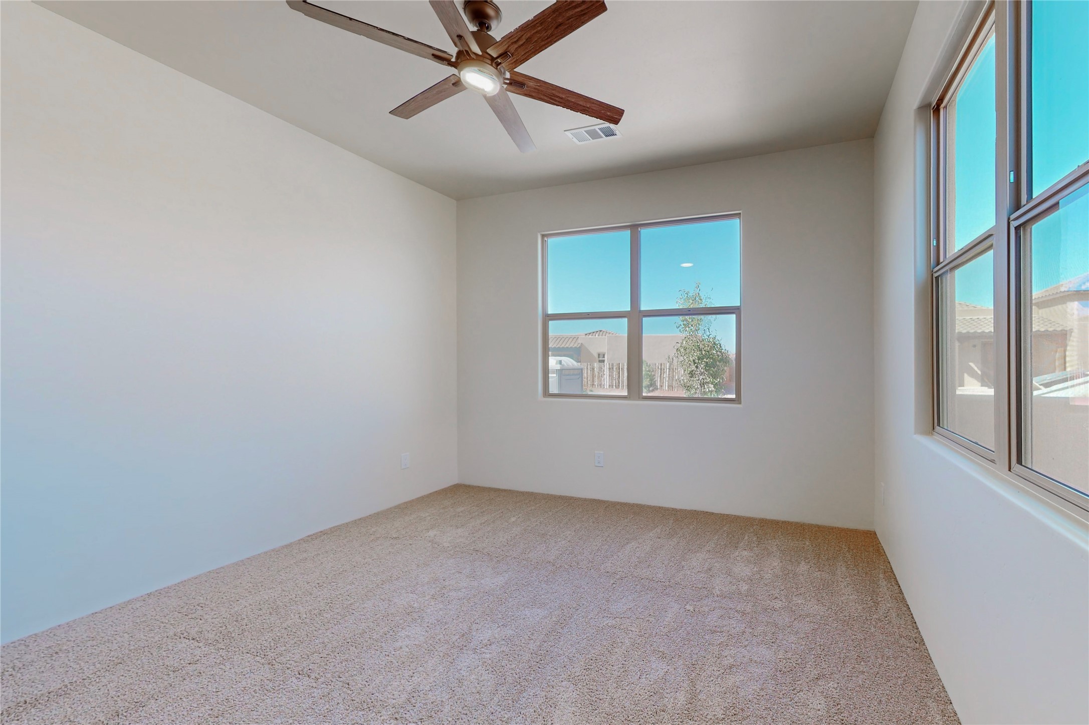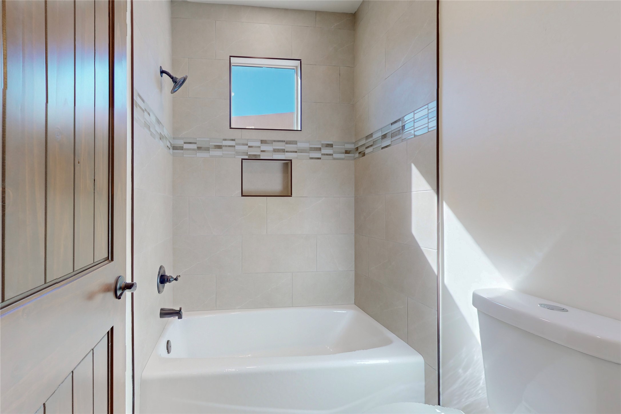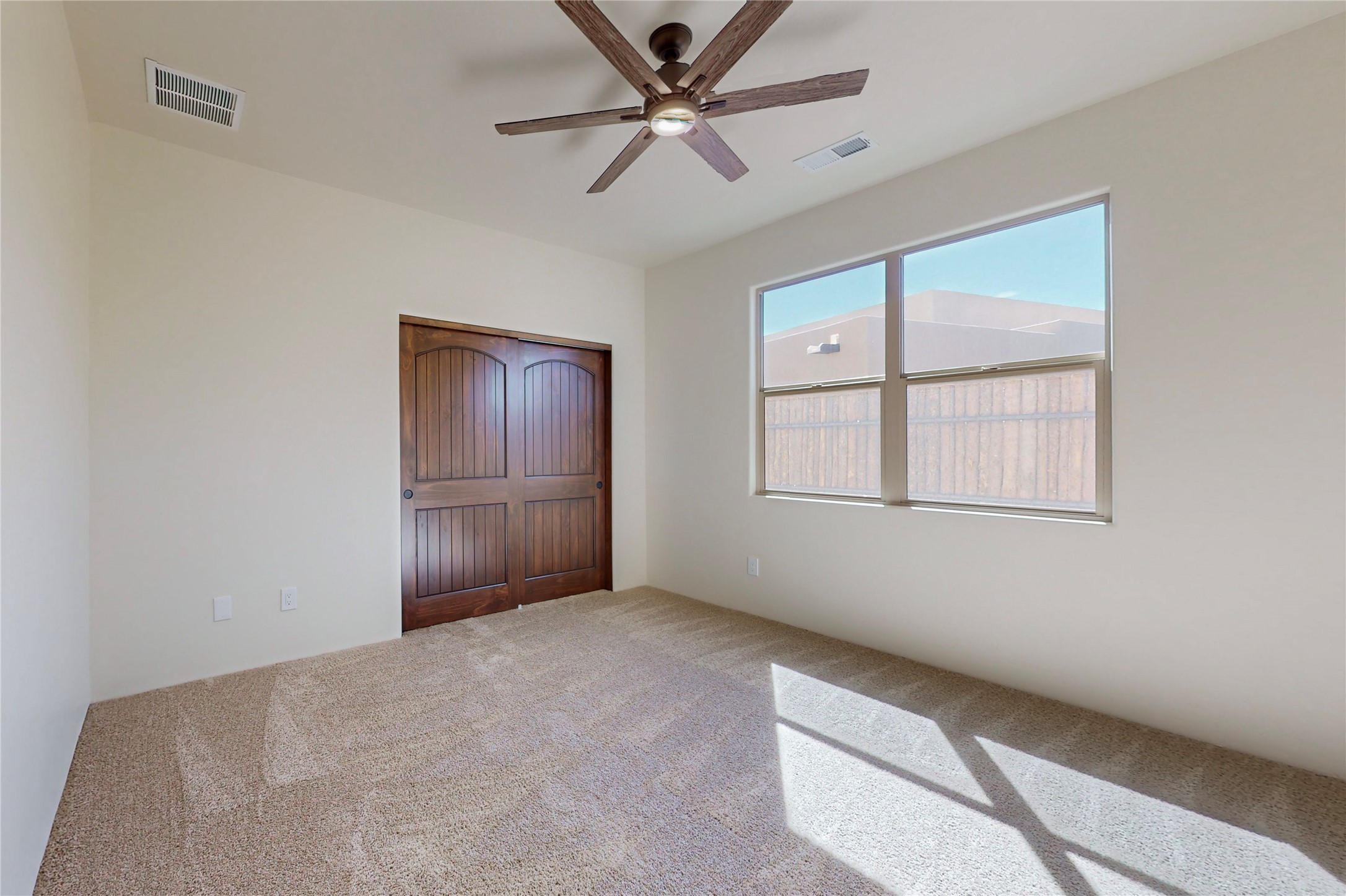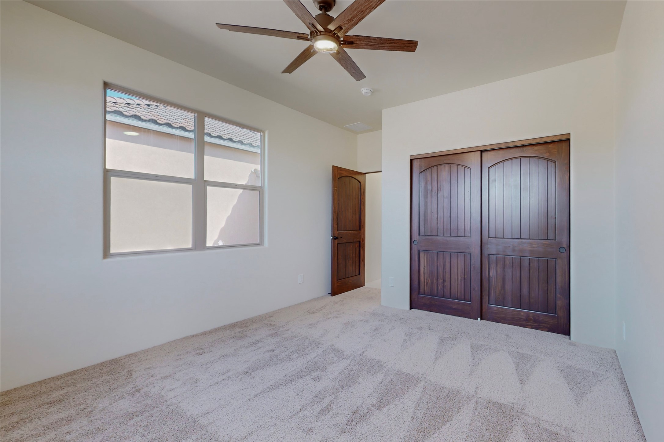 Just Completed! This San Antonio Plan contains 2260 sq. ft., 3 bedrooms and 2 1/2 baths. Located at 30 Pinon Doblado in the La Pradera Subdivision, the exterior is a pitched roof Spanish design with clay-like tile roofs and covered portals with heavy wood beams and brick pavers. The 2-car driveway is a colored stamped-concrete design. The home is entered through an 8 ft. high door to a foyer with a boveda ceiling and beige, wood-like porcelain floor tiles. To the left is a powder room and to the right is a hallway with a nicho-accented wall leading to two (2) guest bedrooms. The foyer leads into the living/dining room which has a 12-foot-high ceiling with Dark, brown-stained wood beams and clear T & G trim and a gas fireplace. The living room and the owner's suite open out to a covered portal with brick pavers and a gas-fired fireplace. The open kitchen has dark birch cabinets. An exceptionally large pantry is directly off the kitchen. The utility room is then accessed from the pantry and has ample cabinets, a skylight, and a sink. The owner's bath has a large walk-in shower with euro-style shower fixtures and an overhead rain shower head. There is also an exceptionally large walk-in closet. The insulated garage includes a storage room and an epoxy-coated floor.
