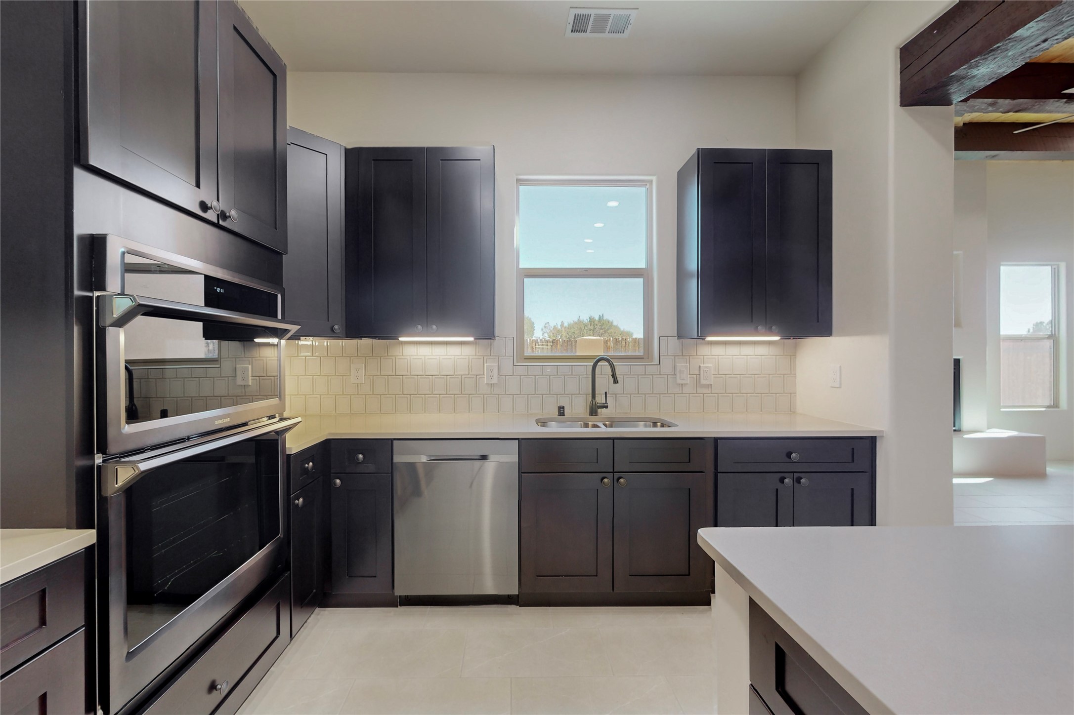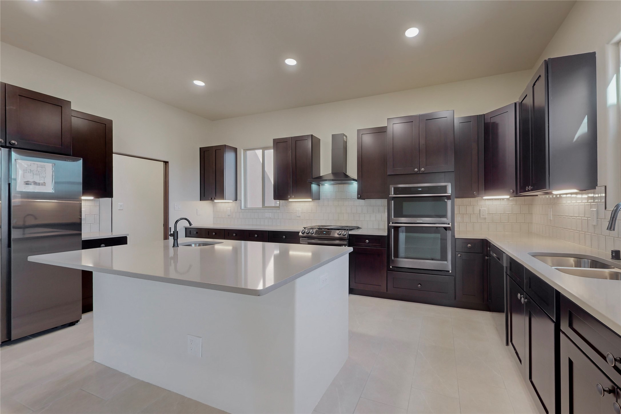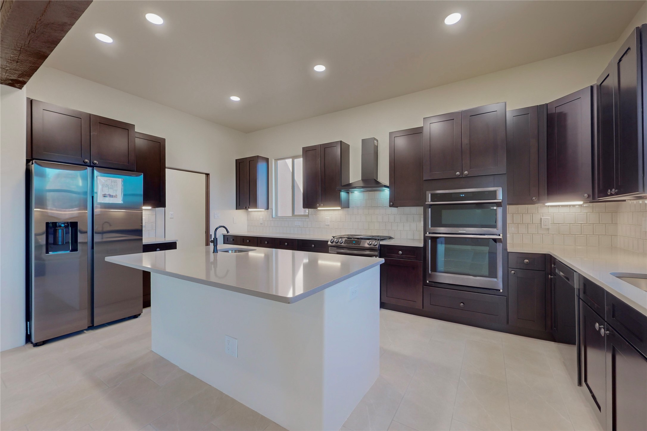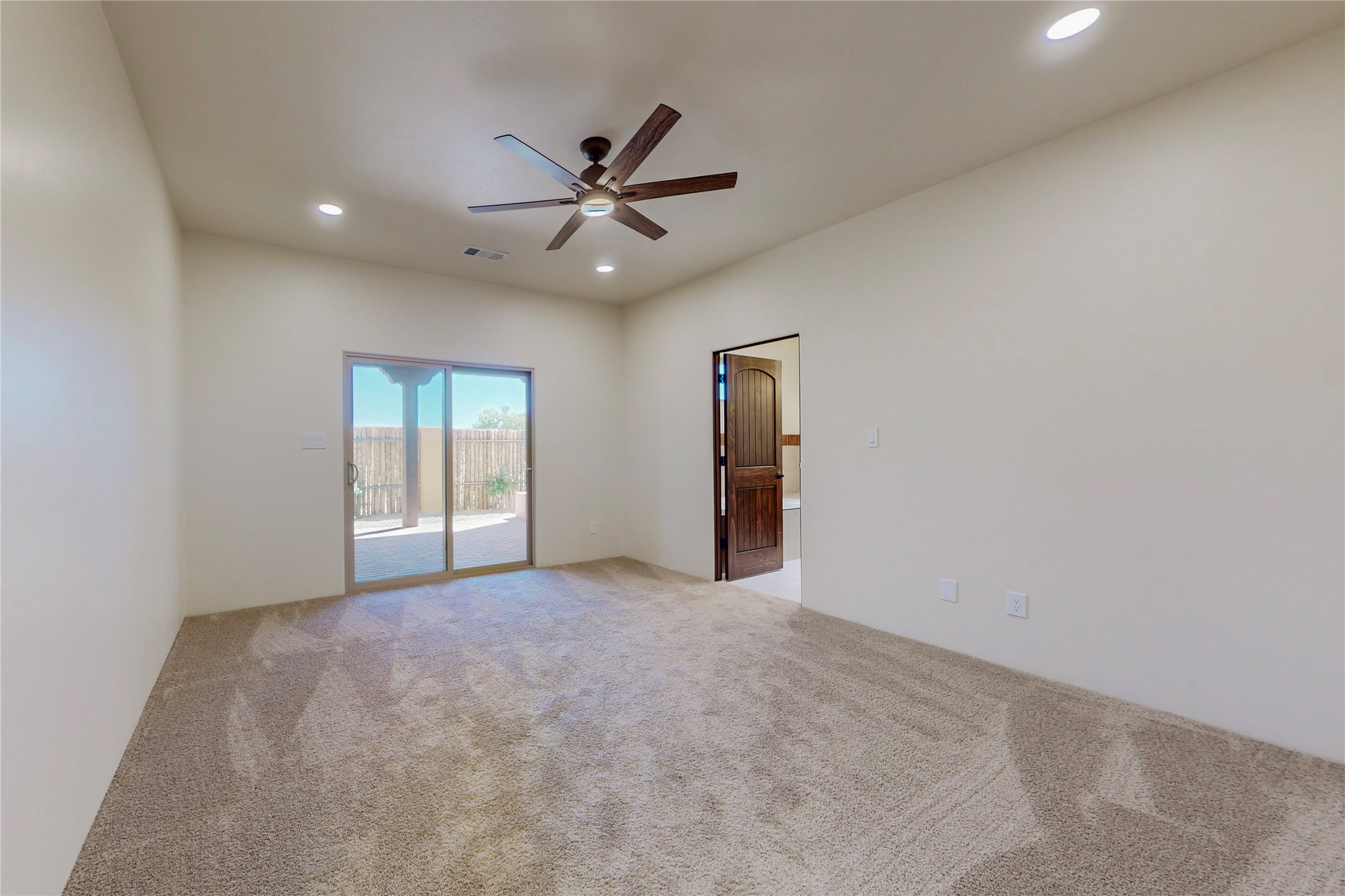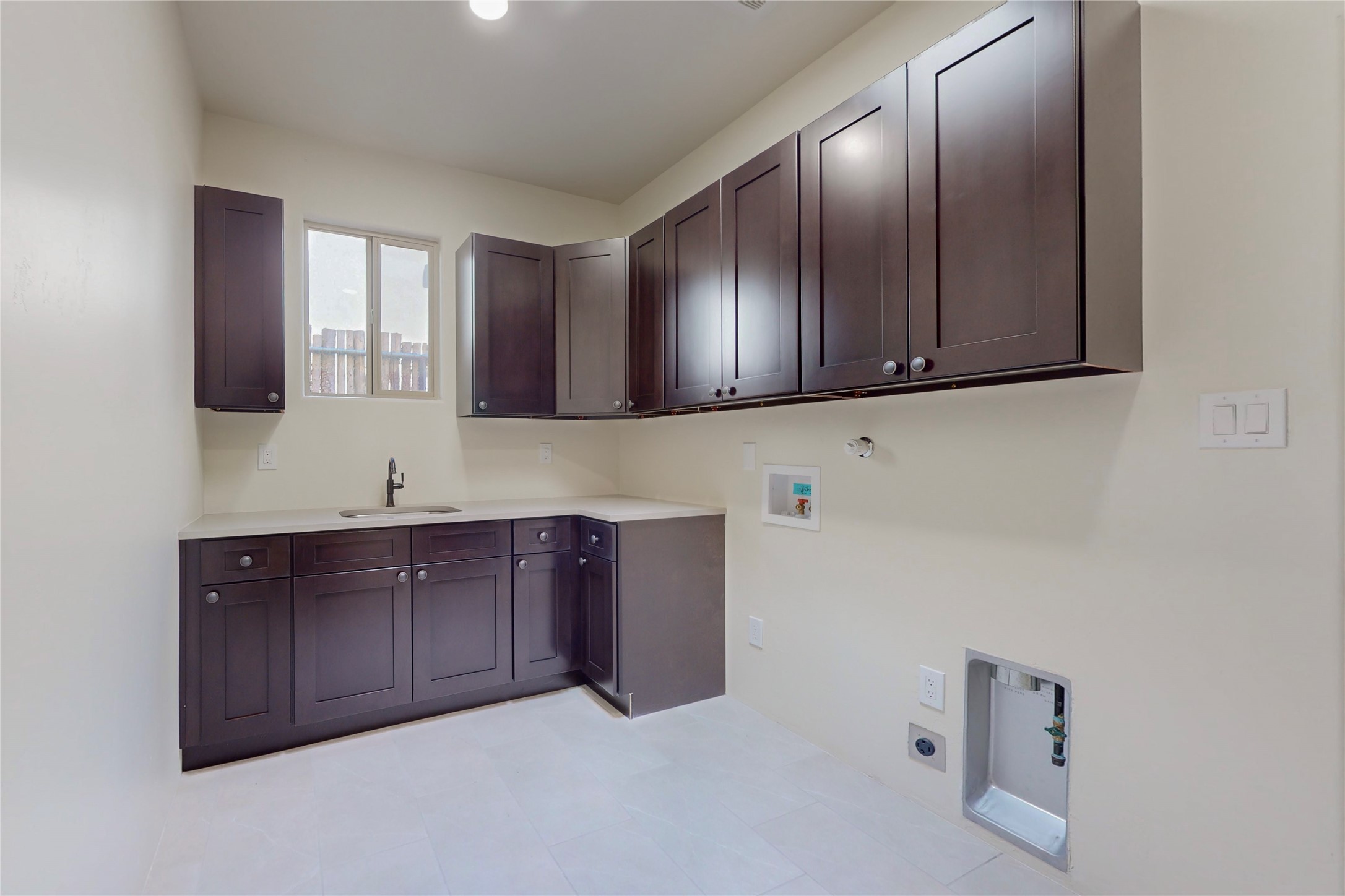Just Completed! This San Antonio Plan contains 2260 sq. ft., 3 bedrooms and 2 1/2 baths. Located at 30 Pinon Doblado in the La Pradera Subdivision, the exterior is a pitched roof Spanish design with clay-like tile roofs and covered portals with heavy wood beams and brick pavers. The 2-car driveway is a colored stamped-concrete design. The home is entered through an 8 ft. high door to a foyer with a boveda ceiling and beige, wood-like porcelain floor tiles. To the left is a powder room and to the right is a hallway with a nicho-accented wall leading to two (2) guest bedrooms. The foyer leads into the living/dining room which has a 12-foot-high ceiling with Dark, brown-stained wood beams and clear T & G trim and a gas fireplace. The living room and the owner's suite open out to a covered portal with brick pavers and a gas-fired fireplace. The open kitchen has dark birch cabinets. An exceptionally large pantry is directly off the kitchen. The utility room is then accessed from the pantry and has ample cabinets, a skylight, and a sink. The owner's bath has a large walk-in shower with euro-style shower fixtures and an overhead rain shower head. There is also an exceptionally large walk-in closet. The insulated garage includes a storage room and an epoxy-coated floor.