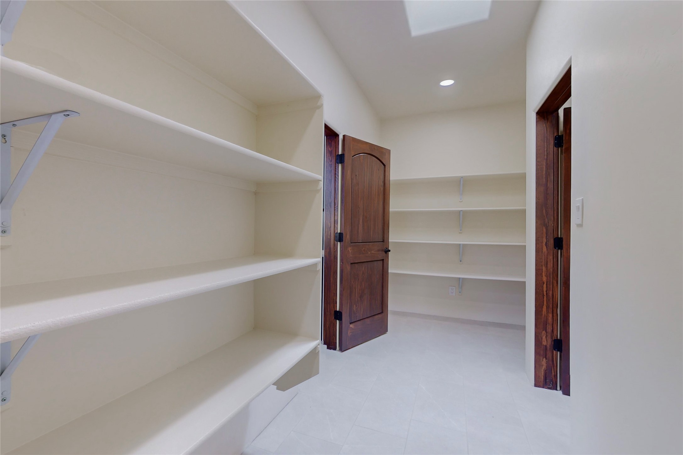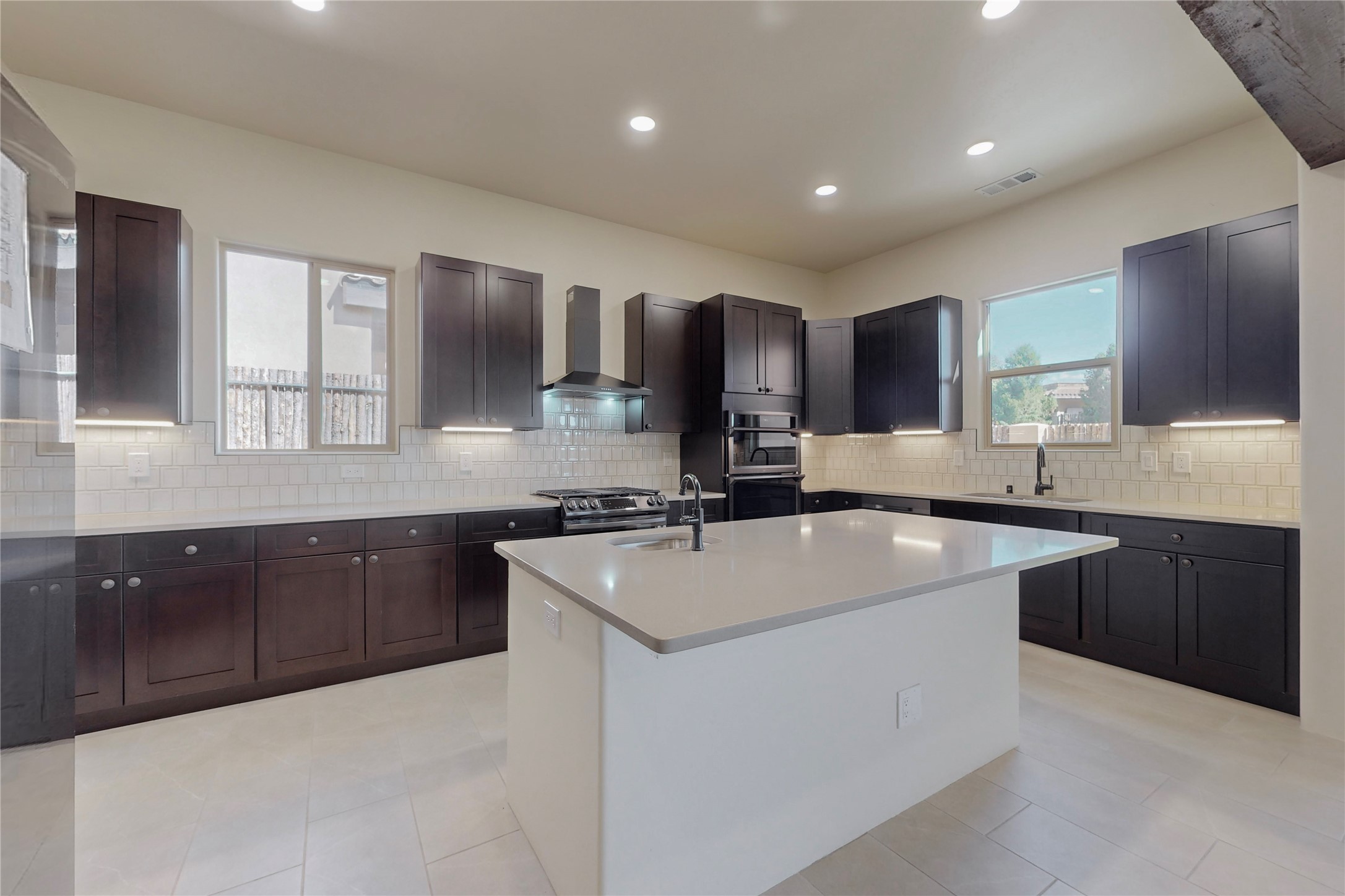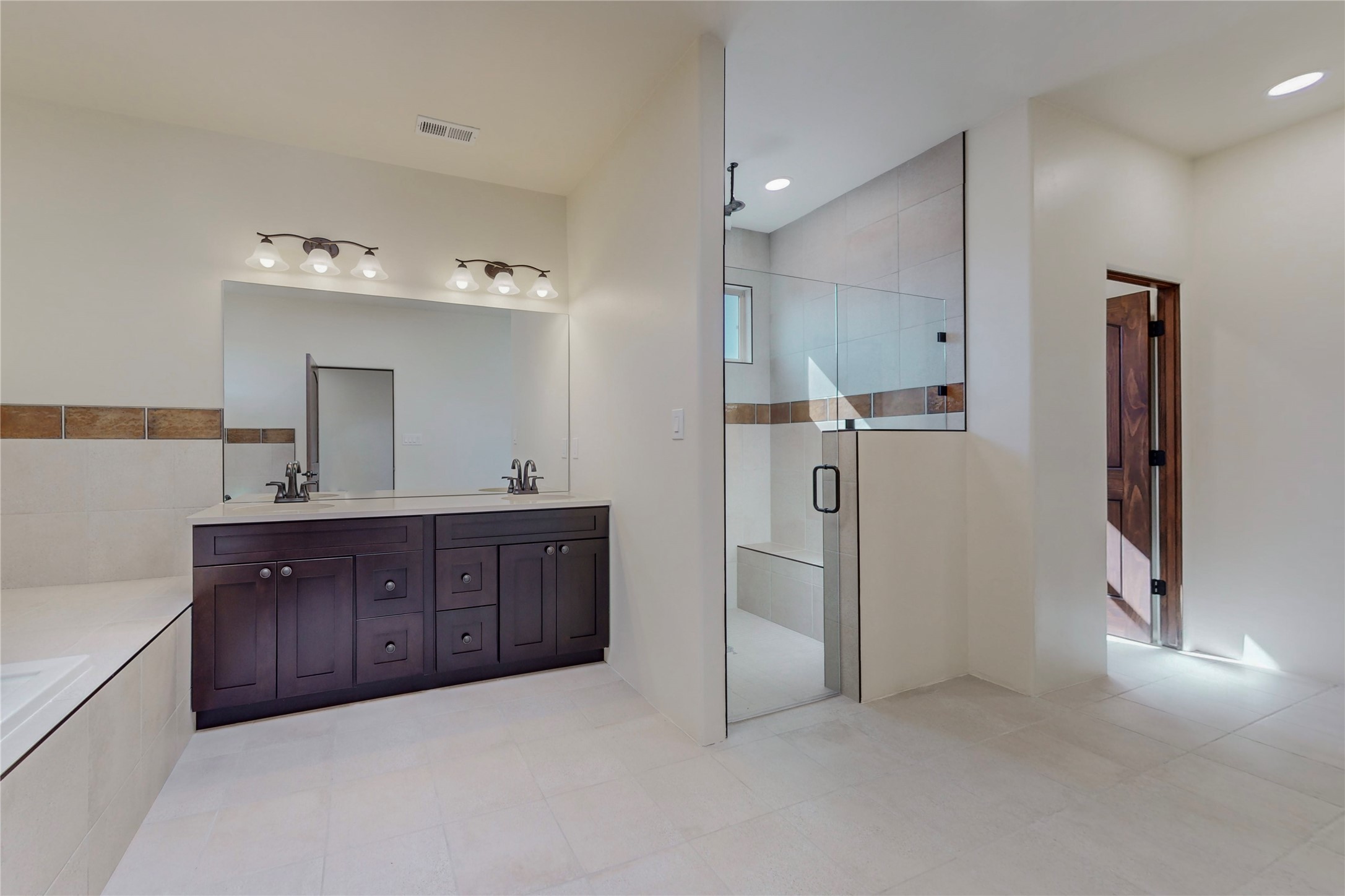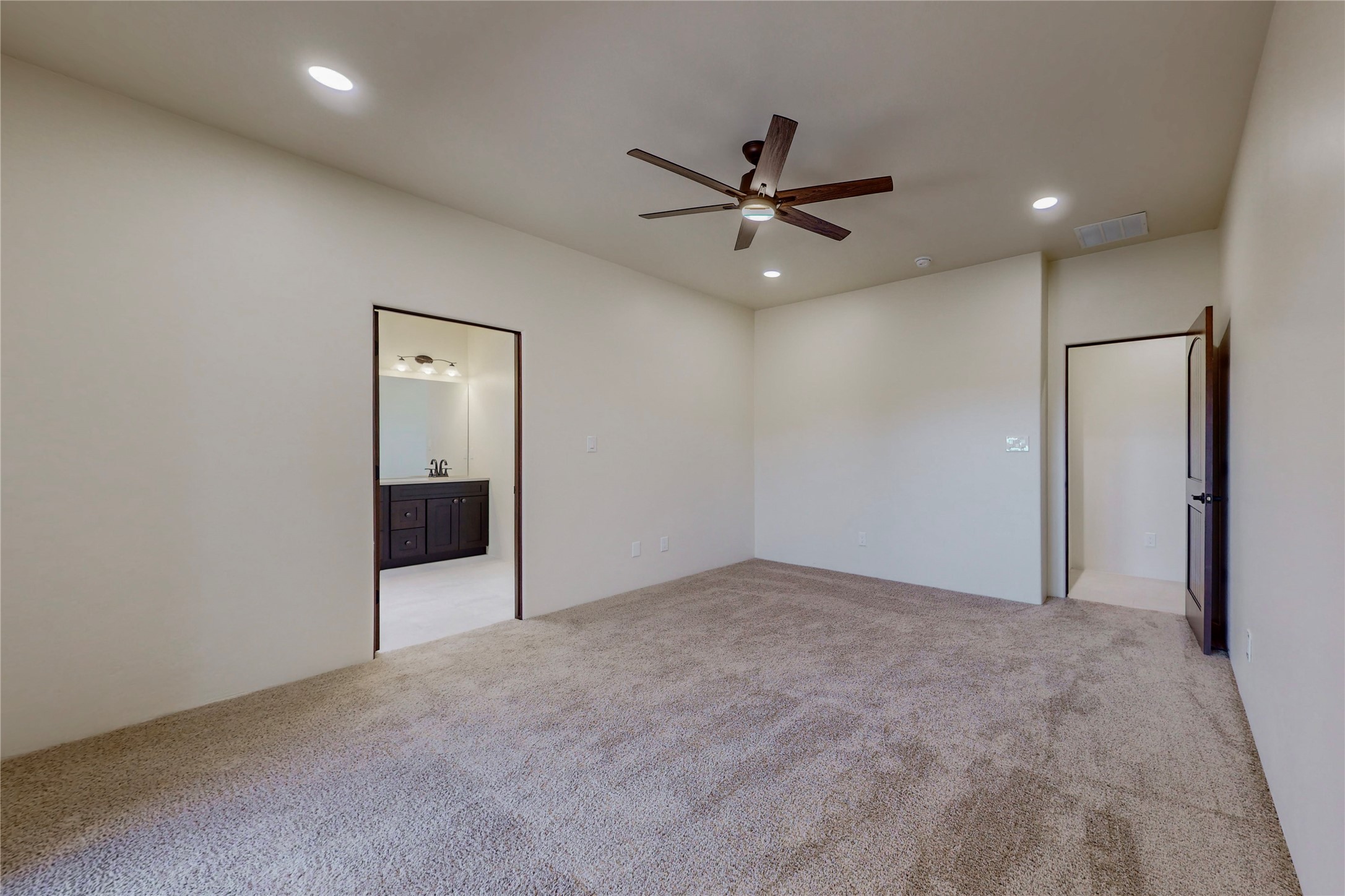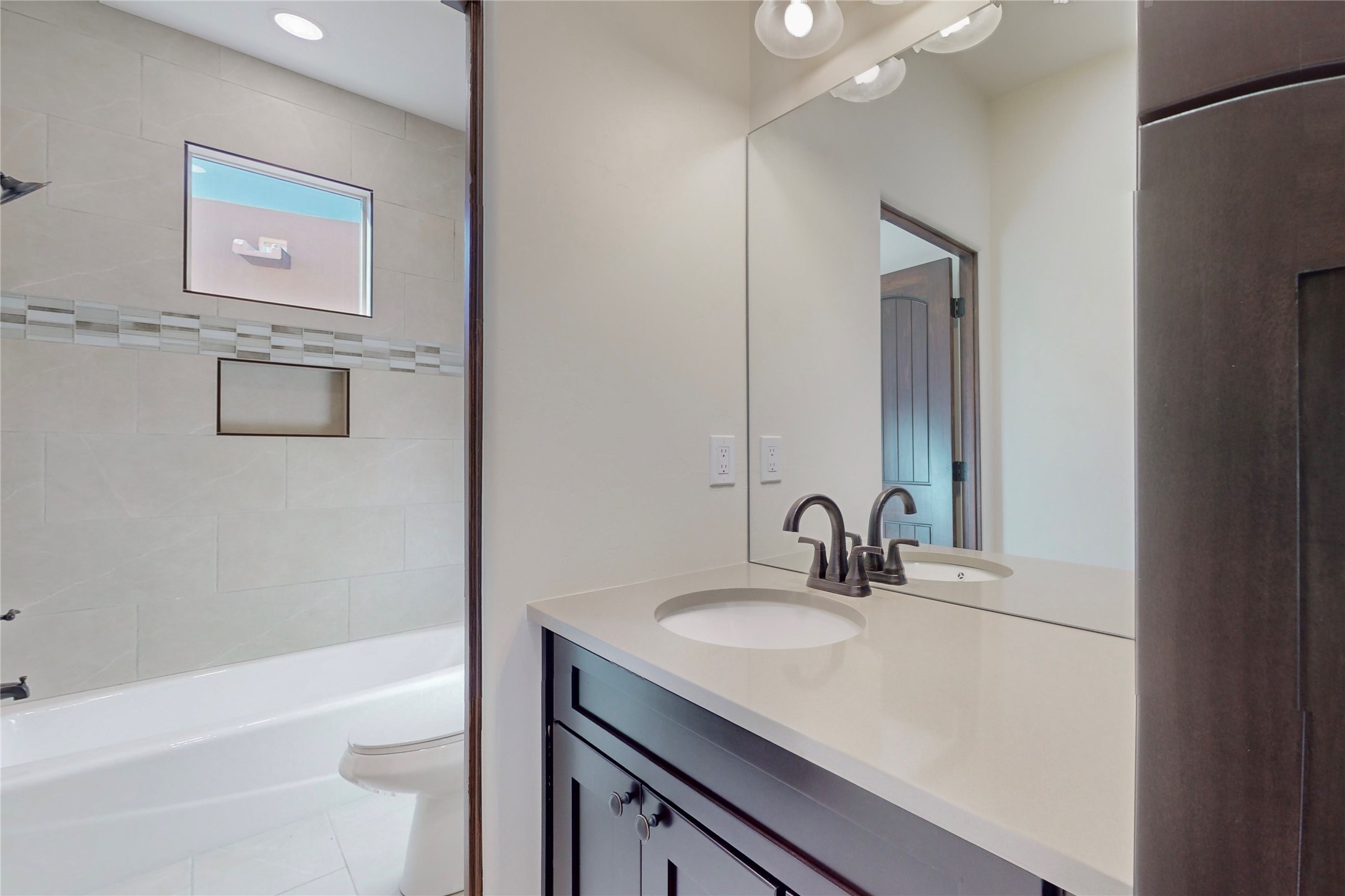 Just Completed! This San Antonio Plan contains 2260 sq. ft., 3 bedrooms and 2 1/2 baths. Located at 30 Pinon Doblado in the La Pradera Subdivision, the exterior is a pitched roof Spanish design with clay-like tile roofs and covered portals with heavy wood beams and brick pavers. The 2-car driveway is a colored stamped-concrete design. The home is entered through an 8 ft. high door to a foyer with a boveda ceiling and beige, wood-like porcelain floor tiles. To the left is a powder room and to the right is a hallway with a nicho-accented wall leading to two (2) guest bedrooms. The foyer leads into the living/dining room which has a 12-foot-high ceiling with Dark, brown-stained wood beams and clear T & G trim and a gas fireplace. The living room and the owner's suite open out to a covered portal with brick pavers and a gas-fired fireplace. The open kitchen has dark birch cabinets. An exceptionally large pantry is directly off the kitchen. The utility room is then accessed from the pantry and has ample cabinets, a skylight, and a sink. The owner's bath has a large walk-in shower with euro-style shower fixtures and an overhead rain shower head. There is also an exceptionally large walk-in closet. The insulated garage includes a storage room and an epoxy-coated floor.
