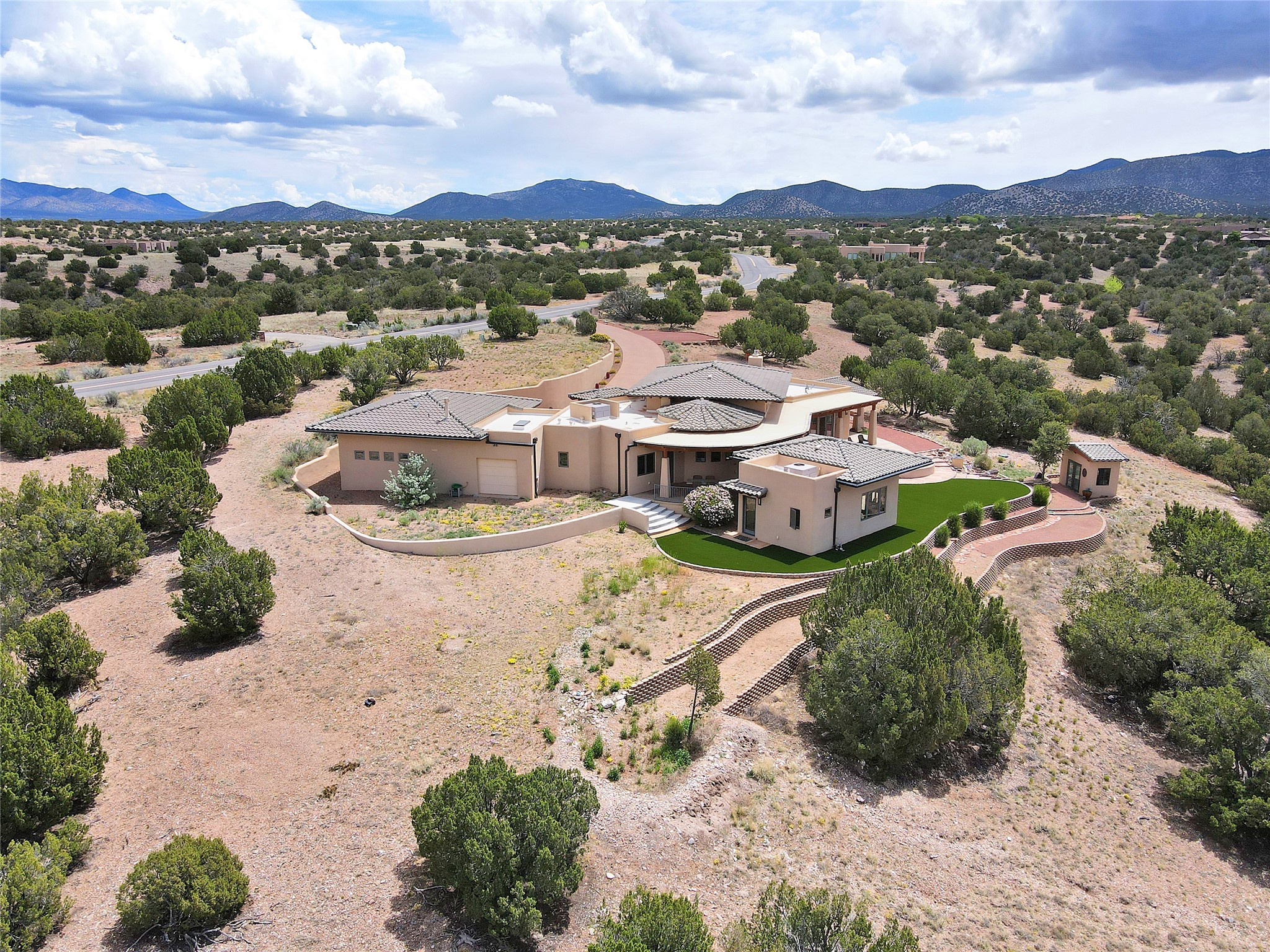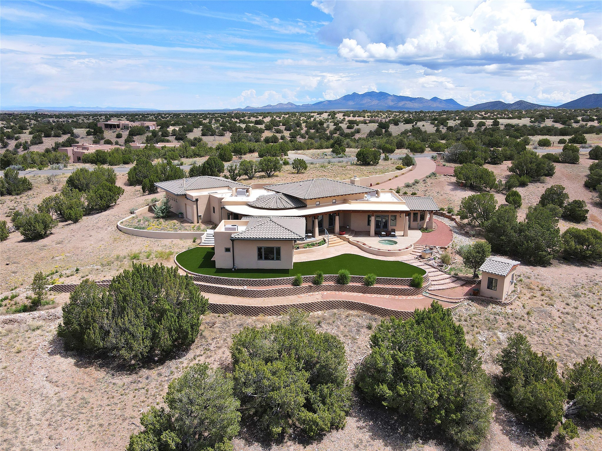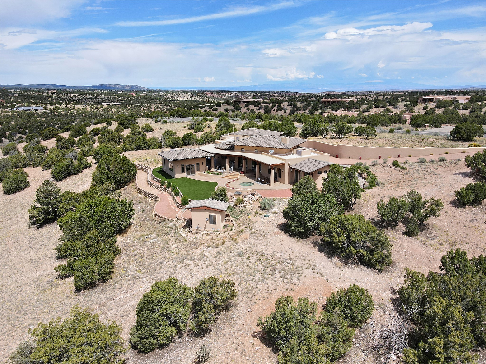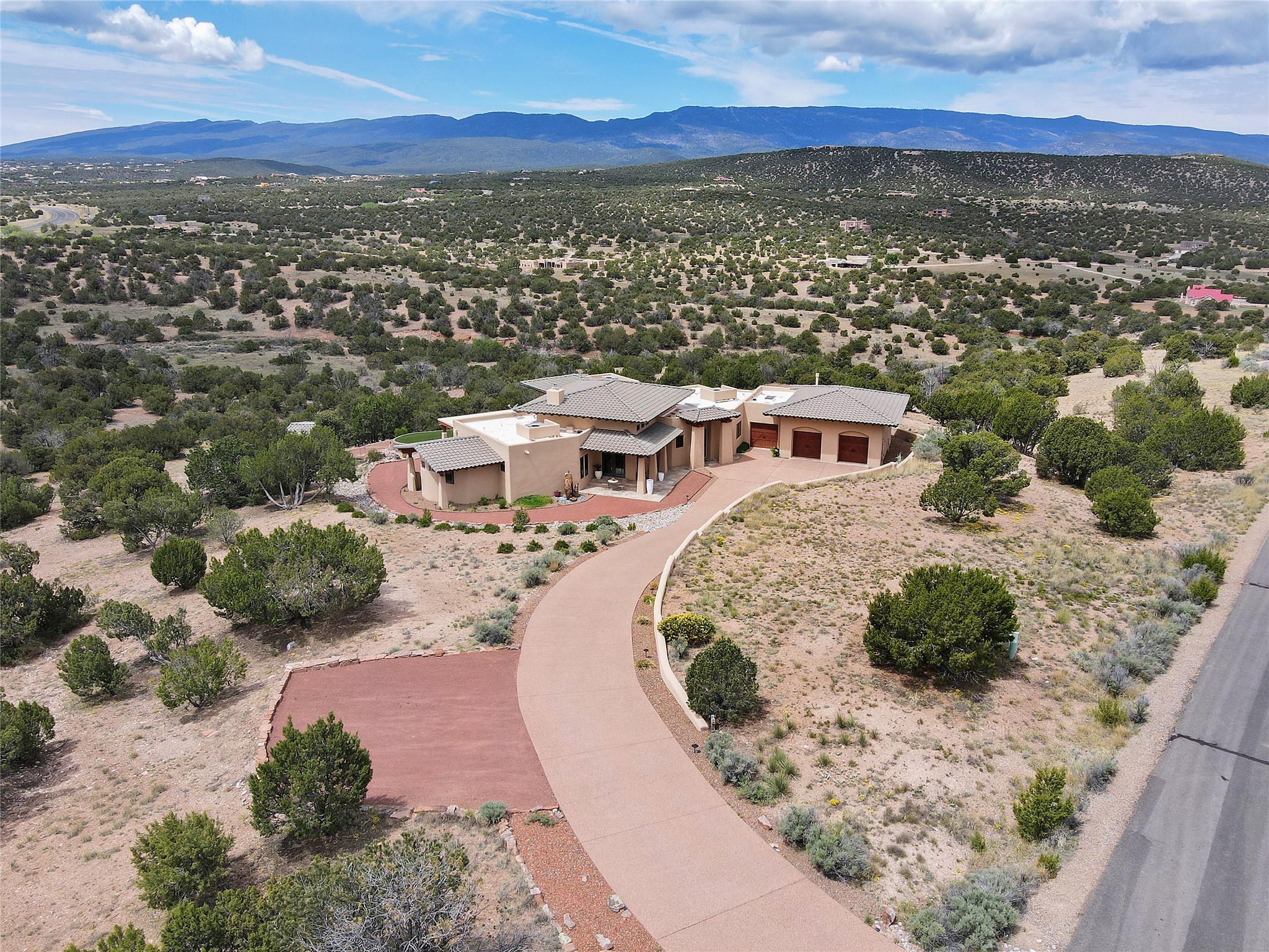The Overlook is an exclusive, secure community located along the Turquoise Trail National Scenic Byway. An impressive entrance provides a manned gate house and camera system for peace of mind and security. This full custom built San Pedro Creek Overlook home offers spectacular mountain and vista views with quiet enjoyment and privacy. Home features include top grade finishes and fixtures throughout the home with attention to every elegant detail. The entertaining, friendly kitchen is open to living and dining areas. Enjoy the views from your own in-ground spa and deck. The oversized (1050 sf) garage with a drive through bay accommodates the charming 3 room casita. The amenities of this fabulous home are further enhanced by the private club house featuring a large, heated pool, spa, amphitheater, kitchen and dining areas. The abundant wildlife and birds are an additional bonus to complete the setting. The best of both cities are only a short 25 minutes to Albuquerque and 40 minutes to Santa Fe.