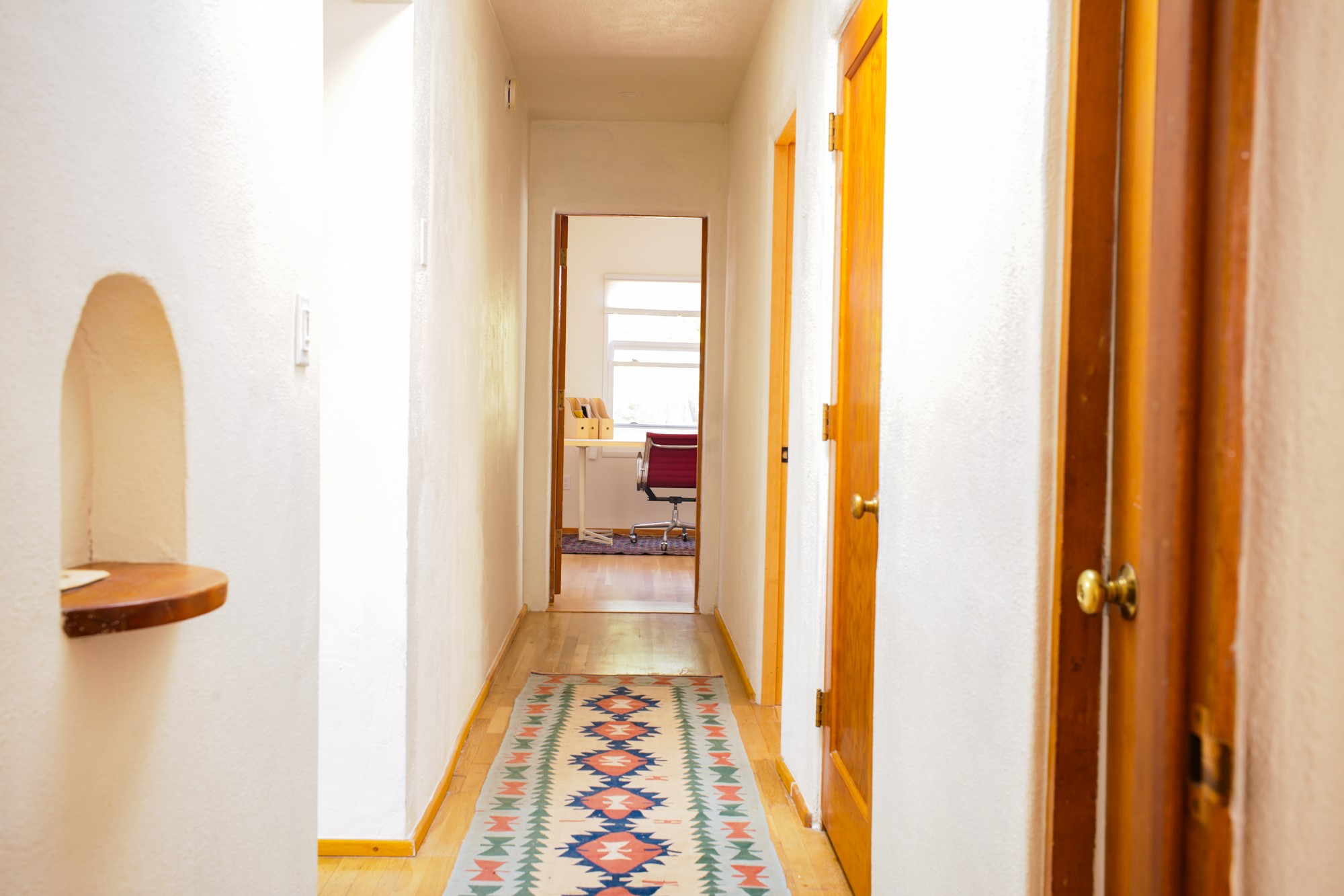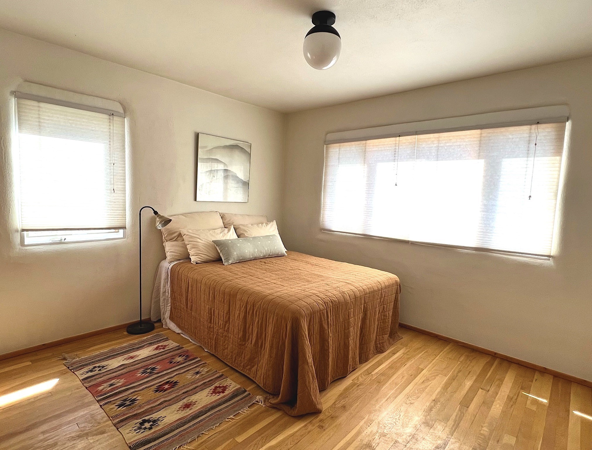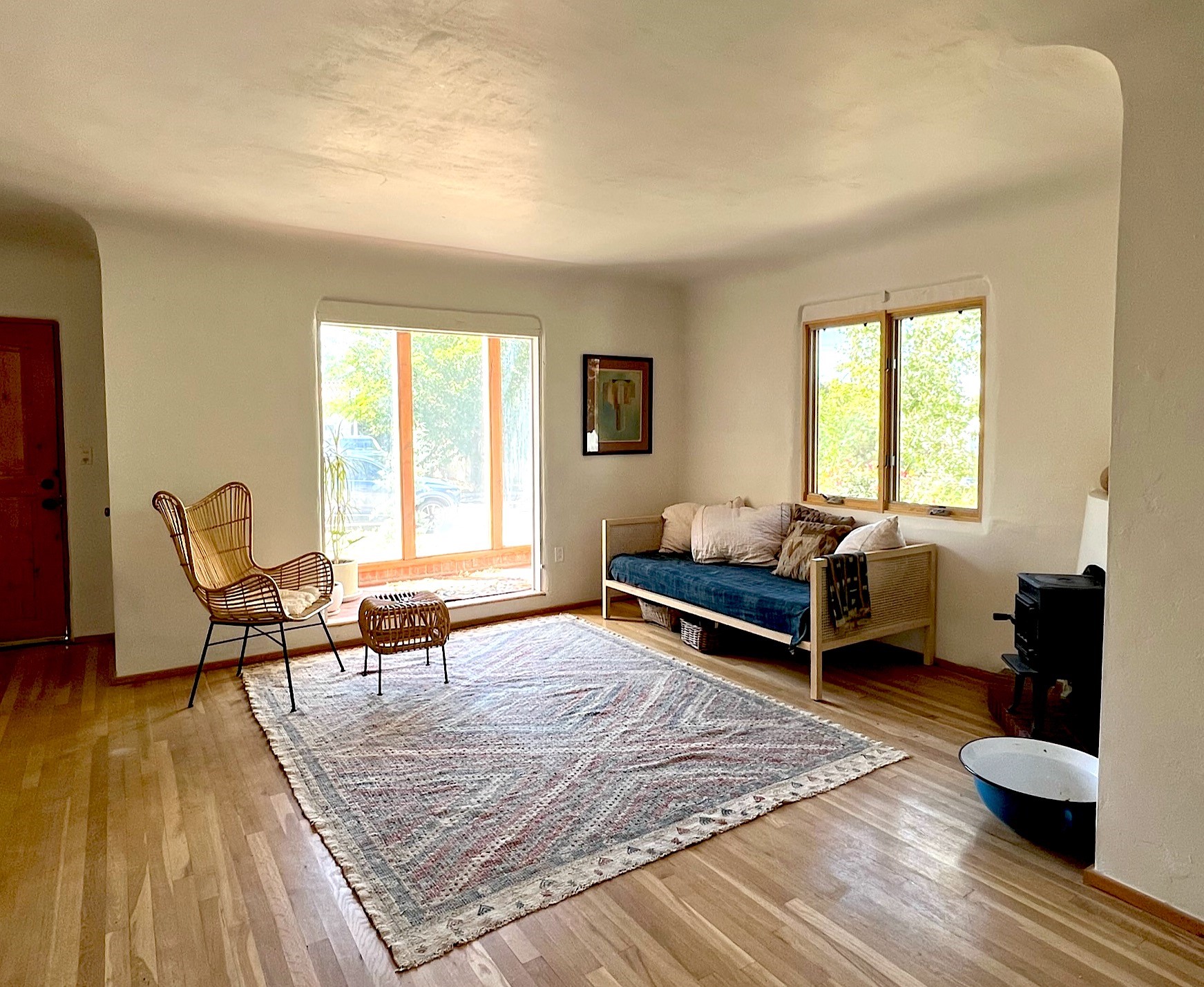 A rare opportunity to live in one of Santa Fe's most desirable neighborhoods in a beautiful, bright and airy move-in-ready South Capitol home! Seller will consider Owner-carry for qualified buyer.Three bedrooms, two full bathrooms and a detached single car garage with fully enclosed backyard provide ample space for a family, hobbyist or work-from-home professionals. Skylights and south-facing sunroom bring in copious natural light while rooftop solar, induction range and new Daikin mini-splits make this home modern and sustainable. Kitchen, bedrooms and bathrooms have been recently renovated with upgraded modern fixtures and double paned windows. Hardwood and porcelain tile floors throughout.Permit-ready, zoning-compliant plans to convert the garage into a one-bedroom ADU available with sale.