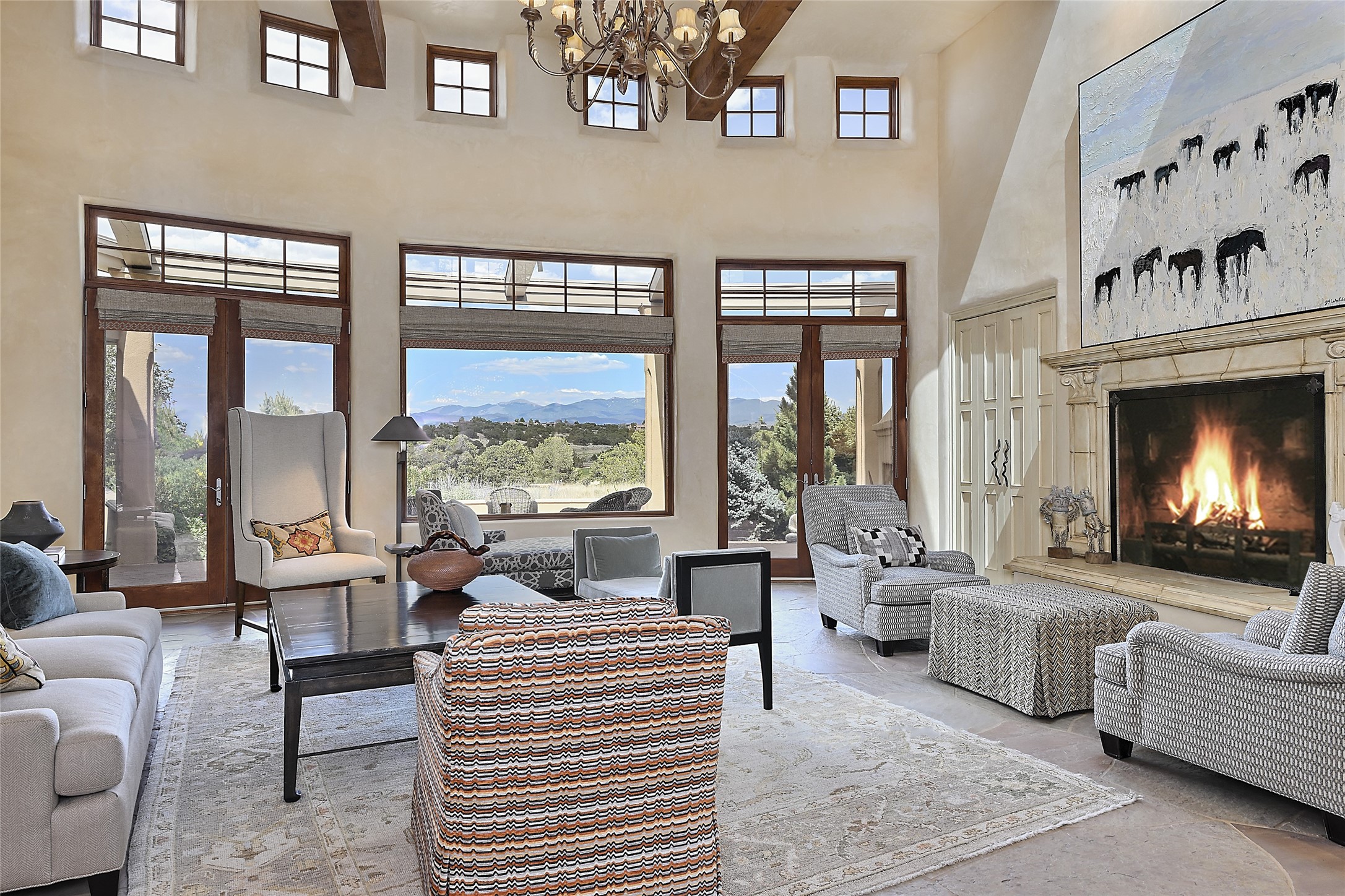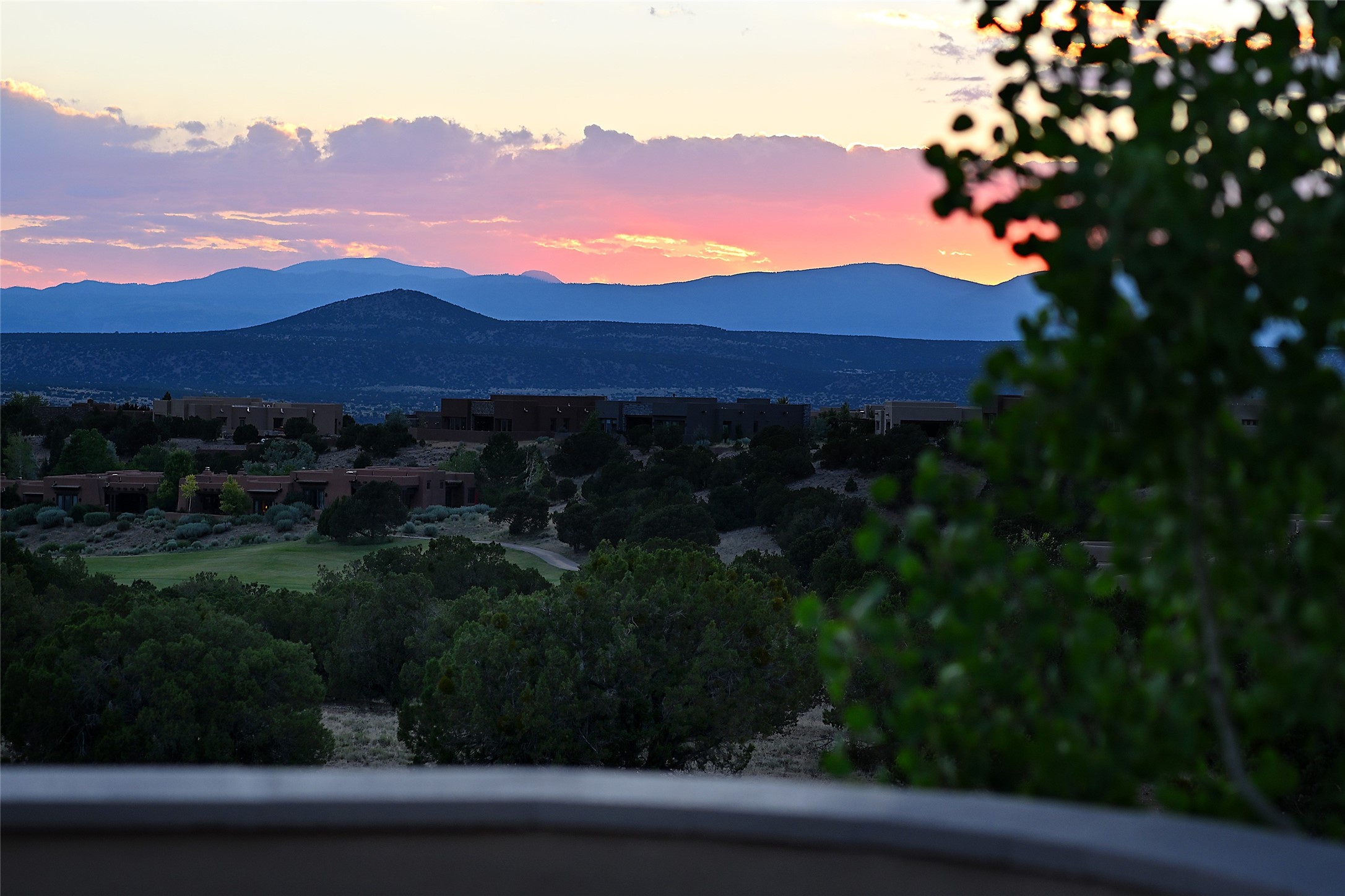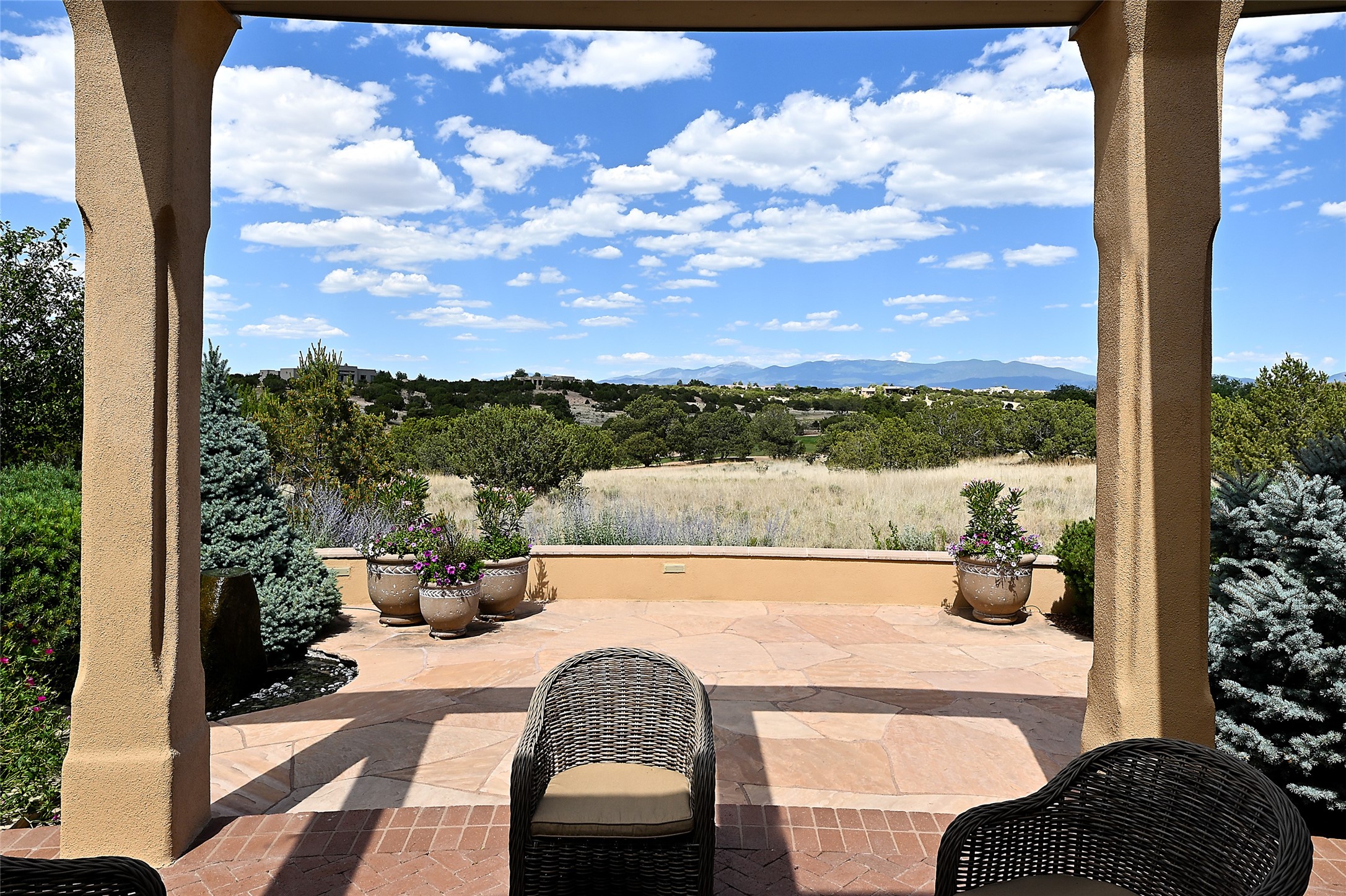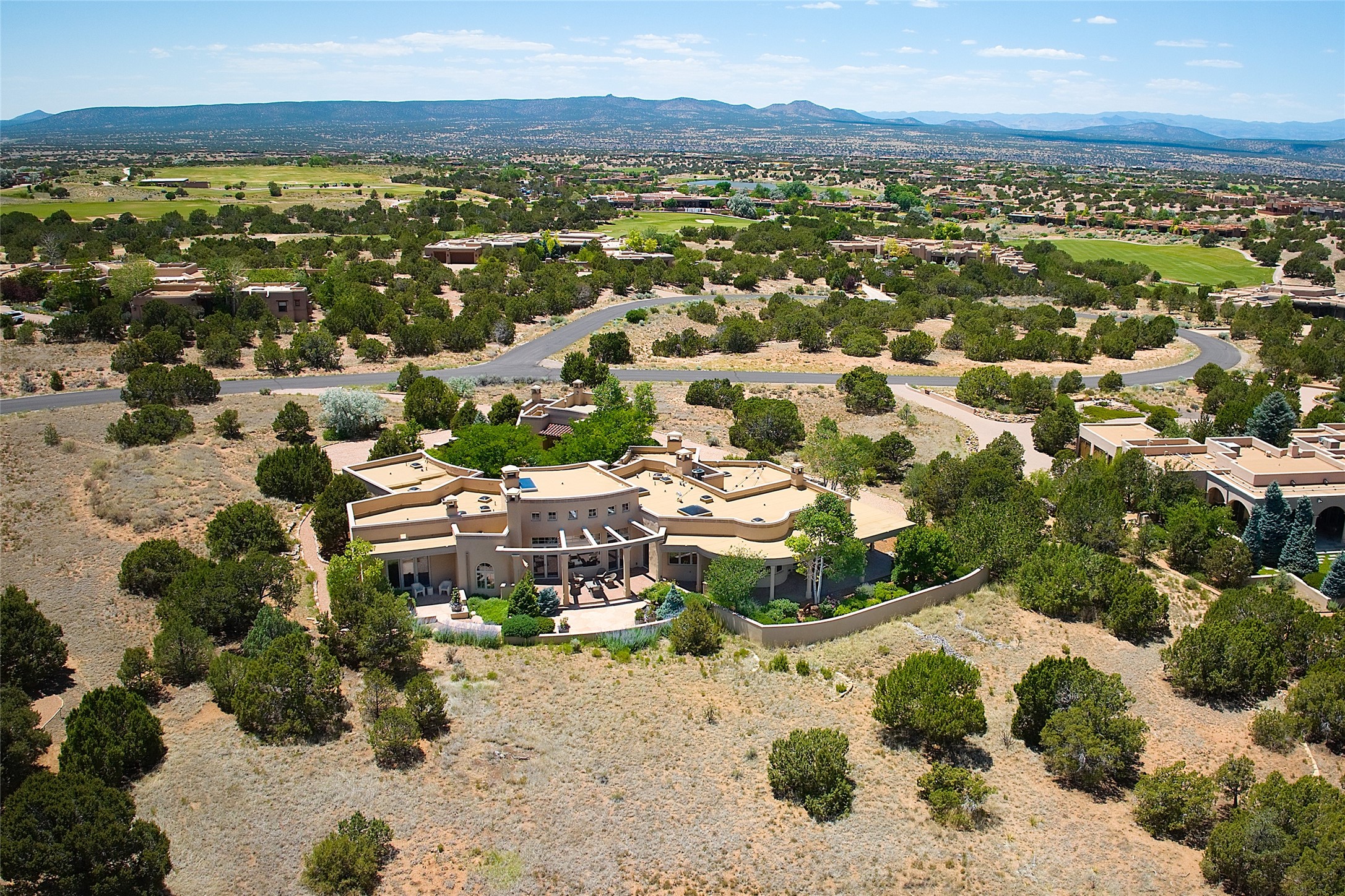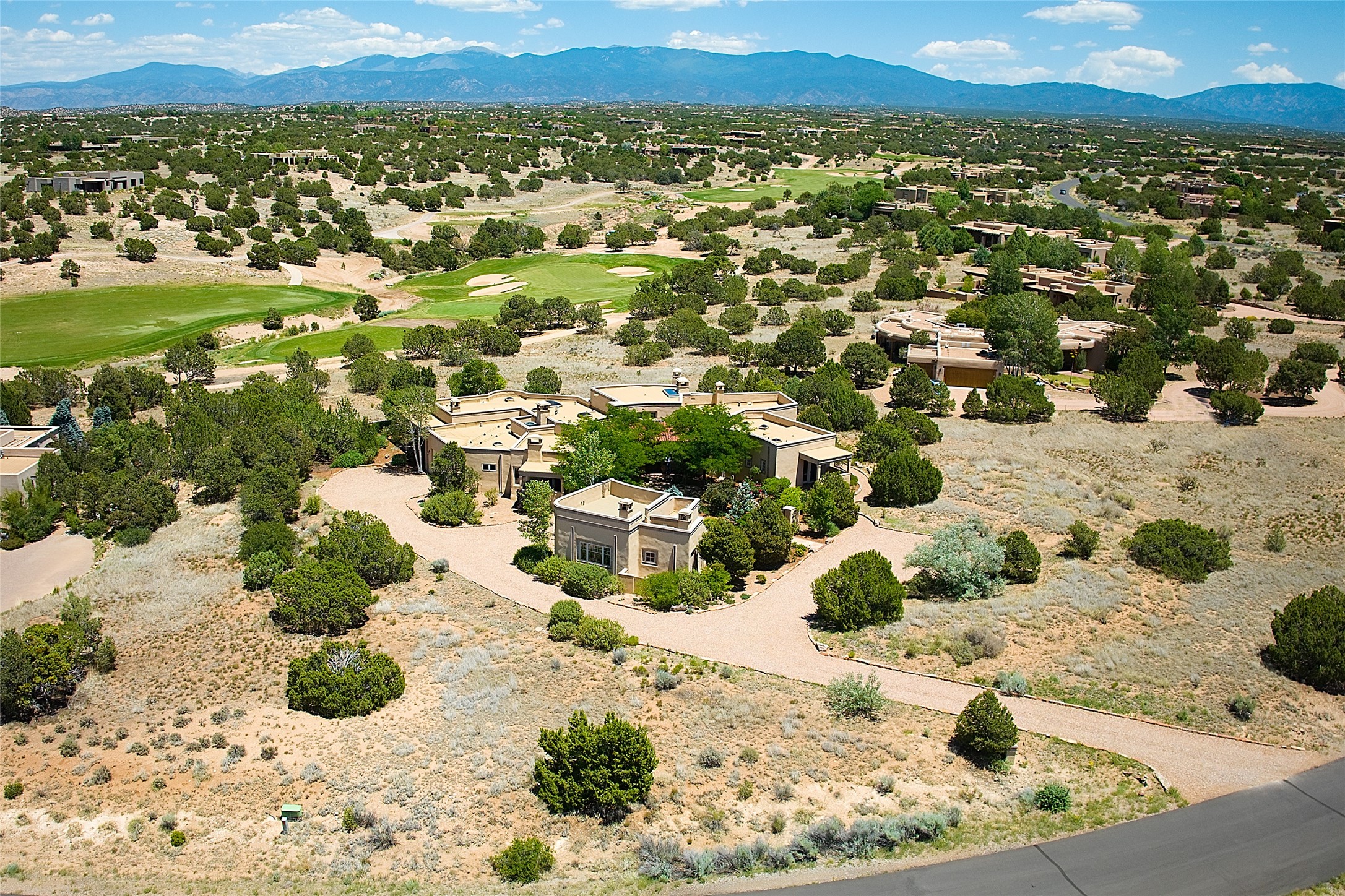 This remarkable residence boasts extraordinary views of the Sangre de Cristo mountains, providing a stunning backdrop from every vantage point. As you enter, you're immediately greeted by spacious living and dining areas that seamlessly blend with the meticulously designed gardens and surrounding landscape. Imagine relaxing on your private patio, marveling at the moonrise over the eastern mountain tops or the vibrant colors as the sun sets behind the mountains to the west. Picture yourself on winter days reading by the fire in the spacious and comfortable informal living area with the state-of-the-art kitchen steps away. The interior spaces are thoughtfully designed, with an emphasis on open layouts and large windows that invite natural light and create an atmosphere of comfort and tranquility. Reimagined by master builder Saye Construction, this home has been taken to extraordinary levels, ensuring the highest quality craftsmanship and meticulous attention to detail. This compound also features a separate guest house, providing ample space and privacy for visitors or family. The guest house mirrors the same level of luxury and comfort ensuring that guests feel pampered and at ease. Every detail of this home has been carefully crafted with stunning attention to detail, from the luxurious primary suite and two guest suites in the main home to the truly special guest house. Membership to the Club at Las Campanas is available but not required.