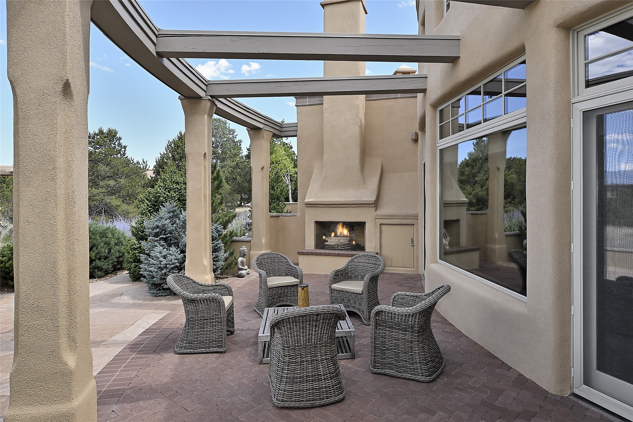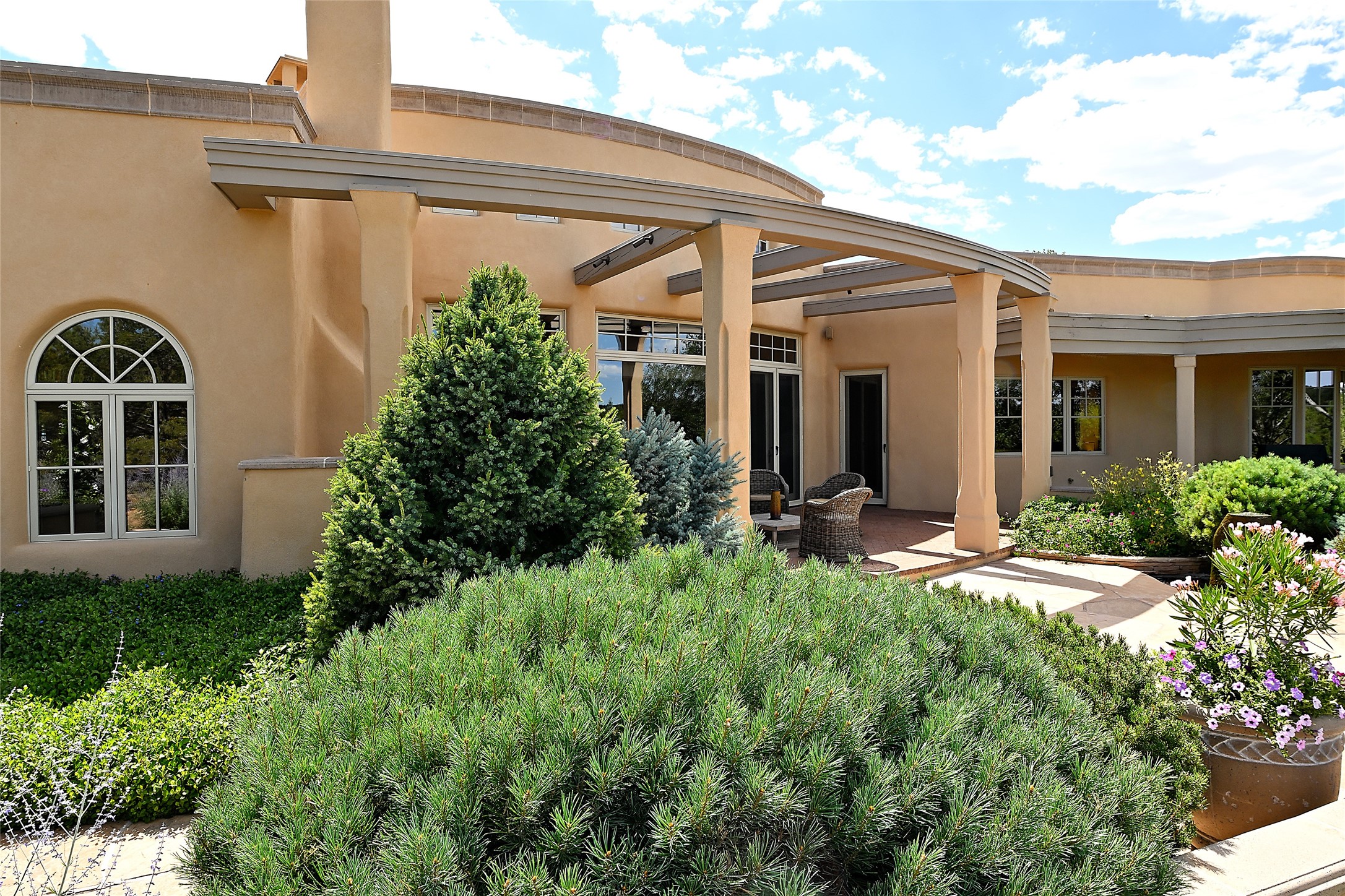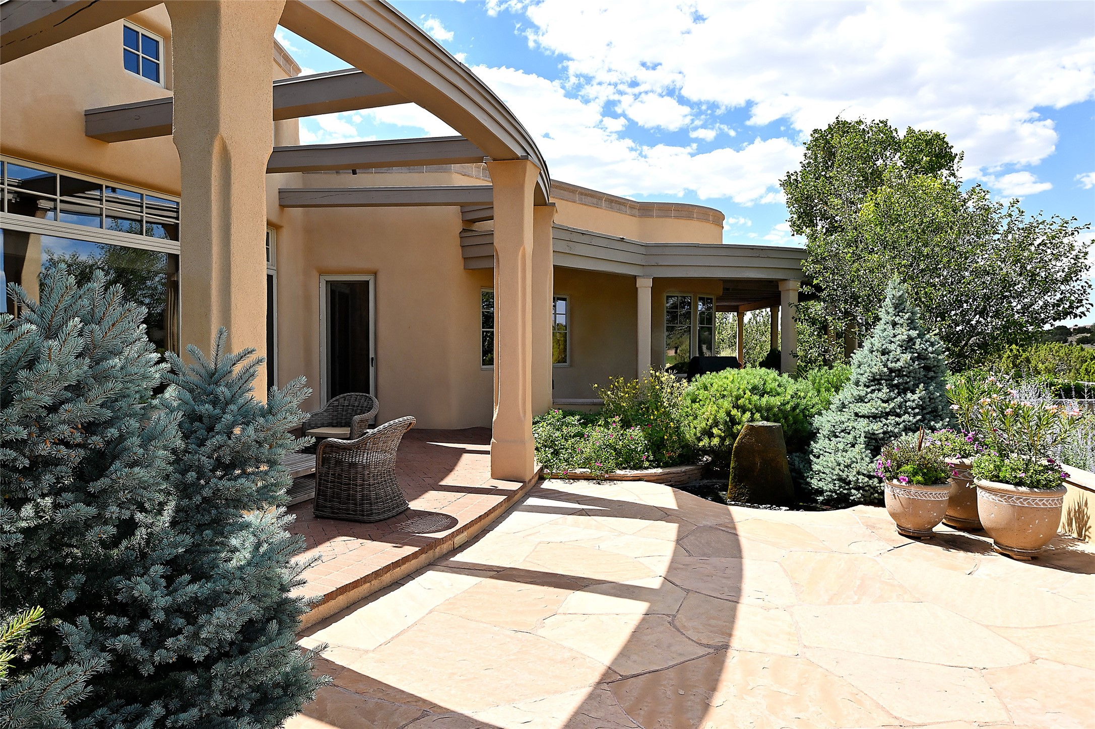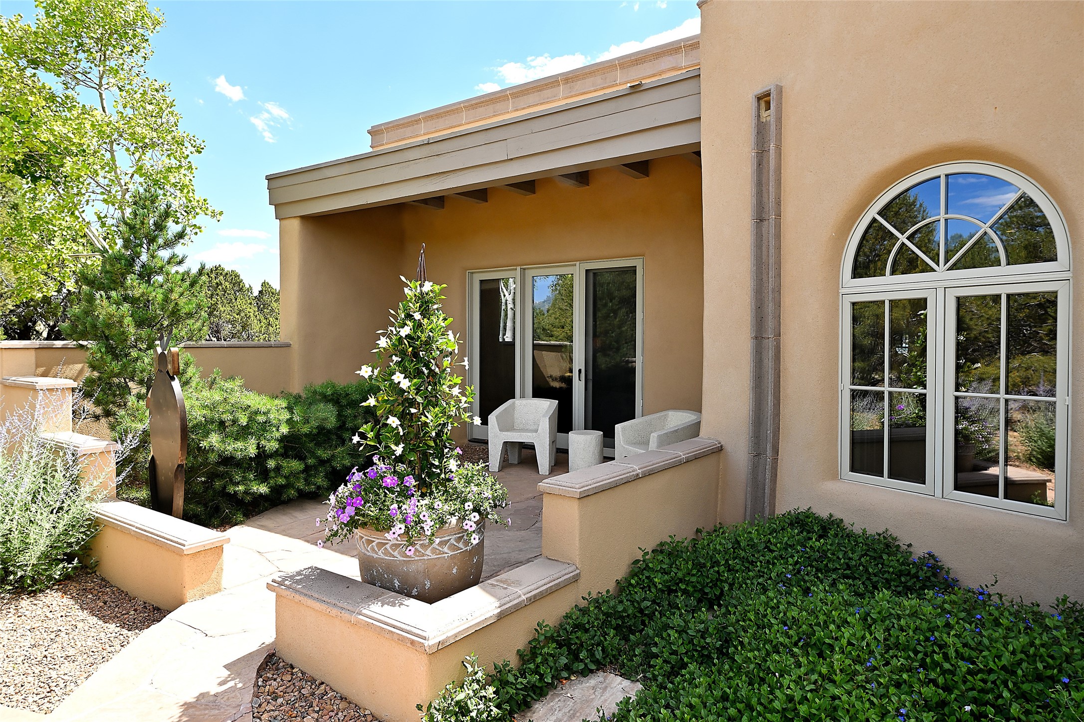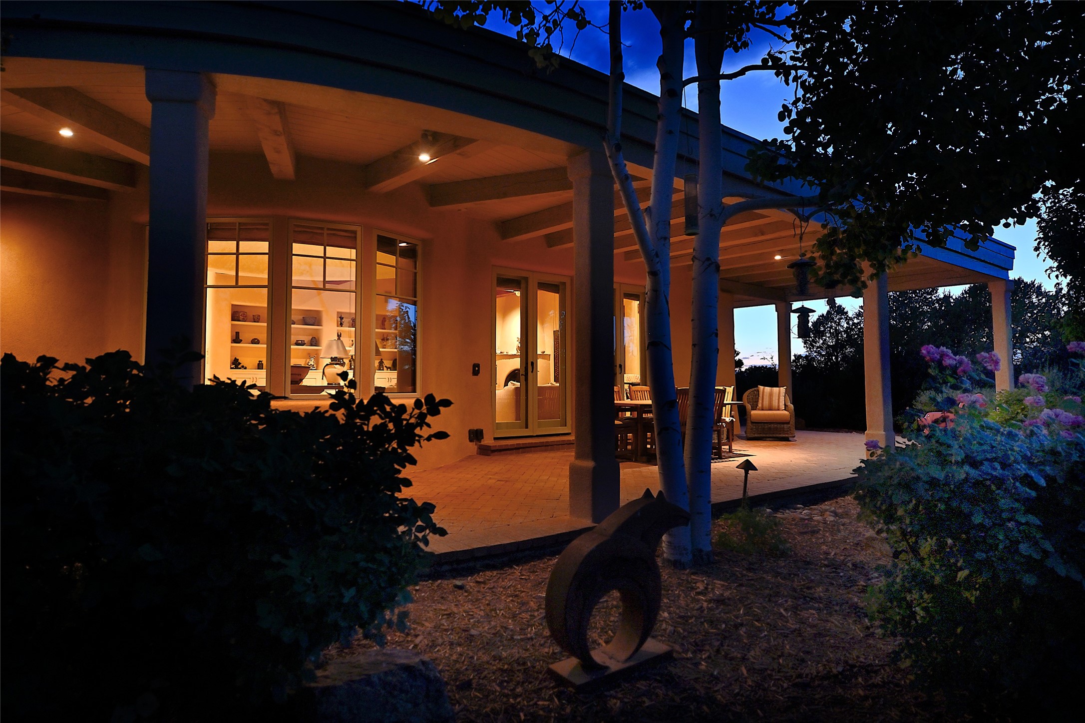 This remarkable residence boasts extraordinary views of the Sangre de Cristo mountains, providing a stunning backdrop from every vantage point. As you enter, you're immediately greeted by spacious living and dining areas that seamlessly blend with the meticulously designed gardens and surrounding landscape. Imagine relaxing on your private patio, marveling at the moonrise over the eastern mountain tops or the vibrant colors as the sun sets behind the mountains to the west. Picture yourself on winter days reading by the fire in the spacious and comfortable informal living area with the state-of-the-art kitchen steps away. The interior spaces are thoughtfully designed, with an emphasis on open layouts and large windows that invite natural light and create an atmosphere of comfort and tranquility. Reimagined by master builder Saye Construction, this home has been taken to extraordinary levels, ensuring the highest quality craftsmanship and meticulous attention to detail. This compound also features a separate guest house, providing ample space and privacy for visitors or family. The guest house mirrors the same level of luxury and comfort ensuring that guests feel pampered and at ease. Every detail of this home has been carefully crafted with stunning attention to detail, from the luxurious primary suite and two guest suites in the main home to the truly special guest house. Membership to the Club at Las Campanas is available but not required.