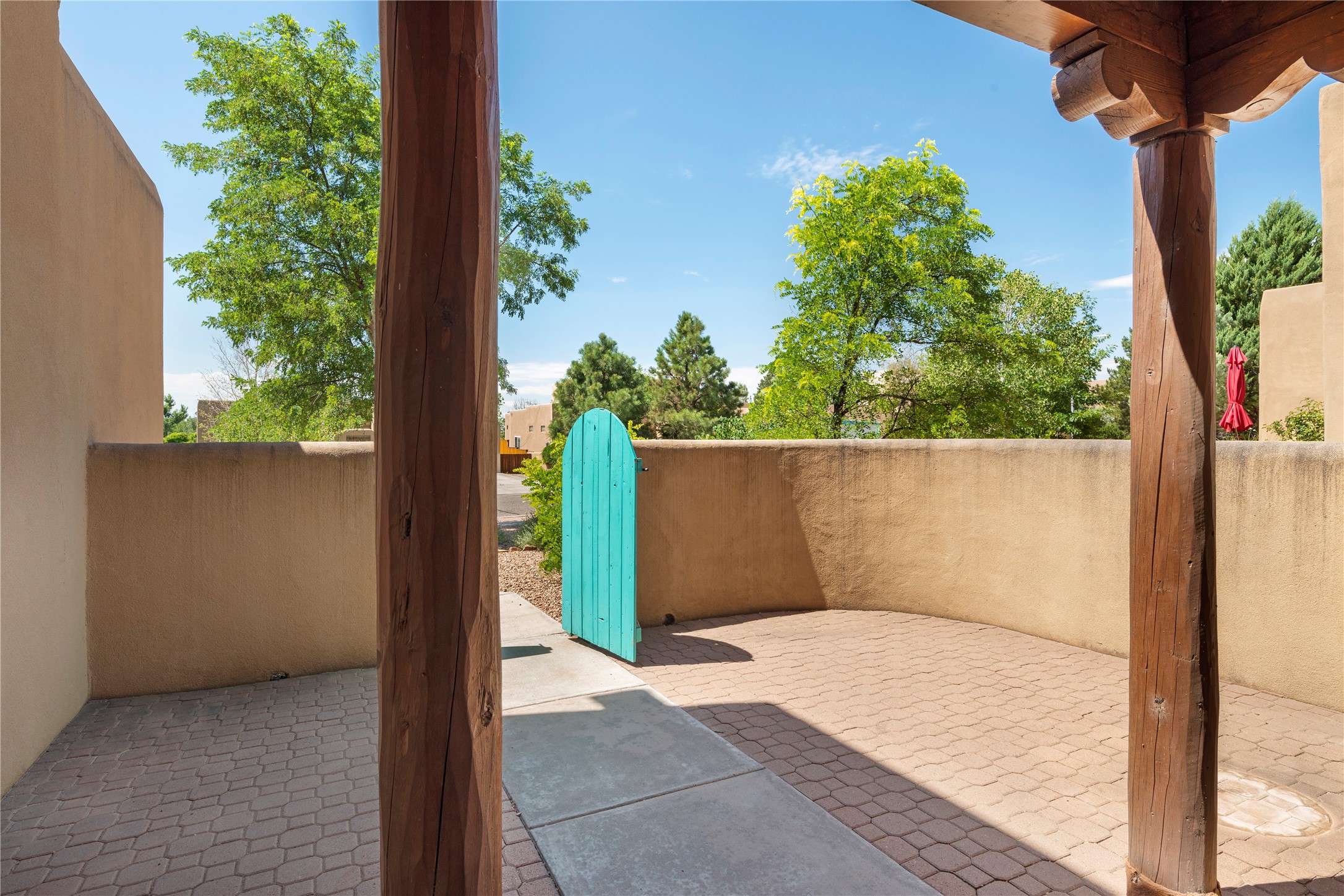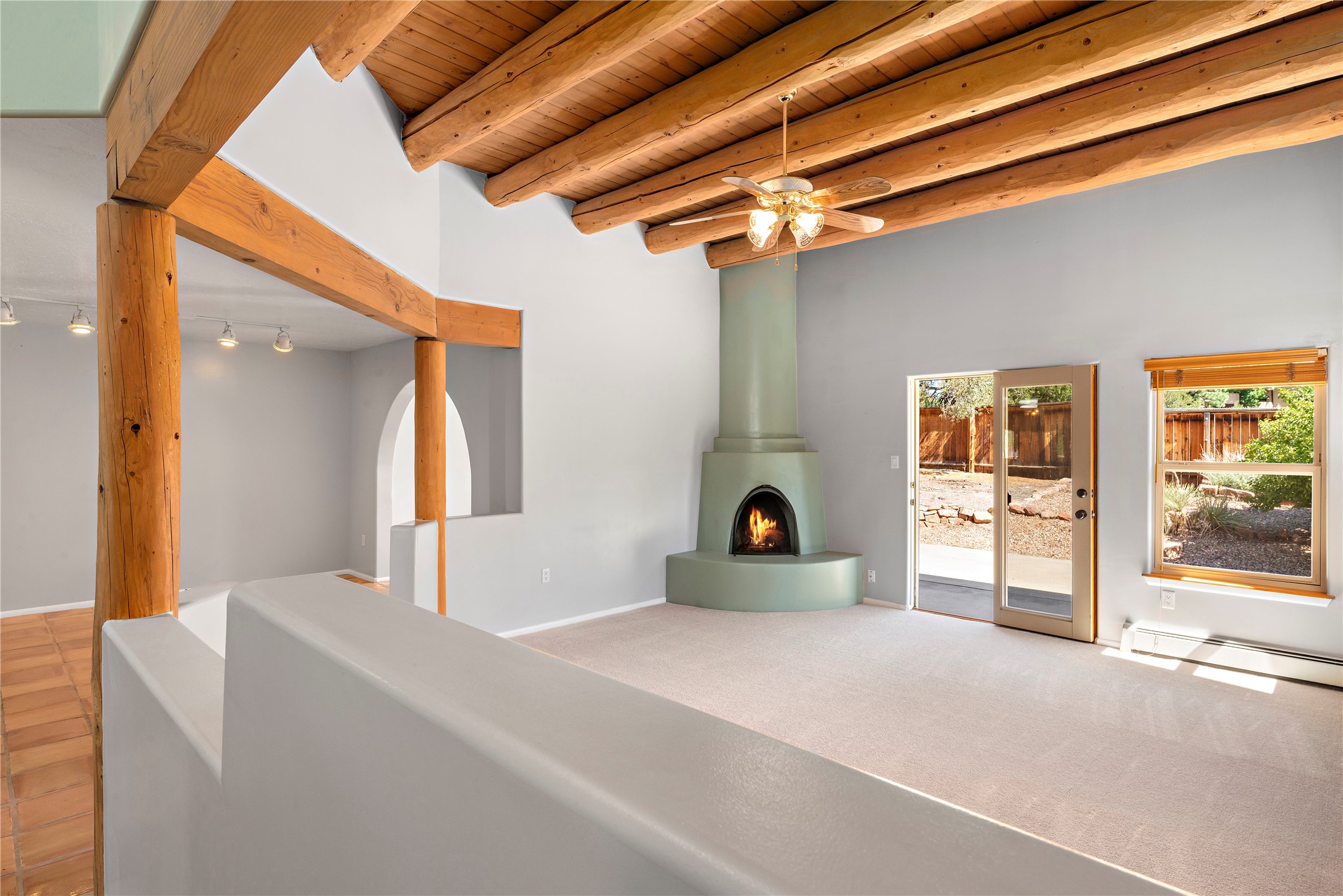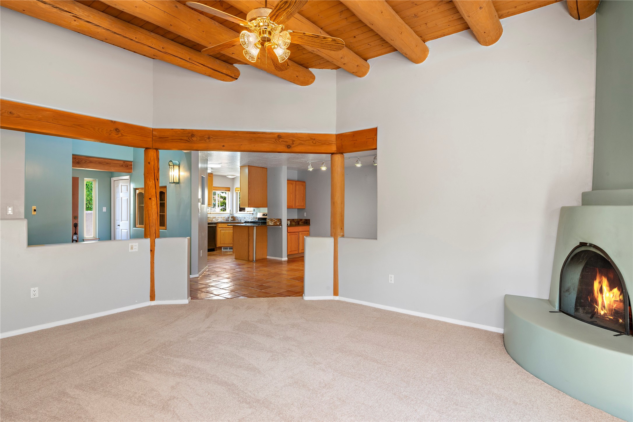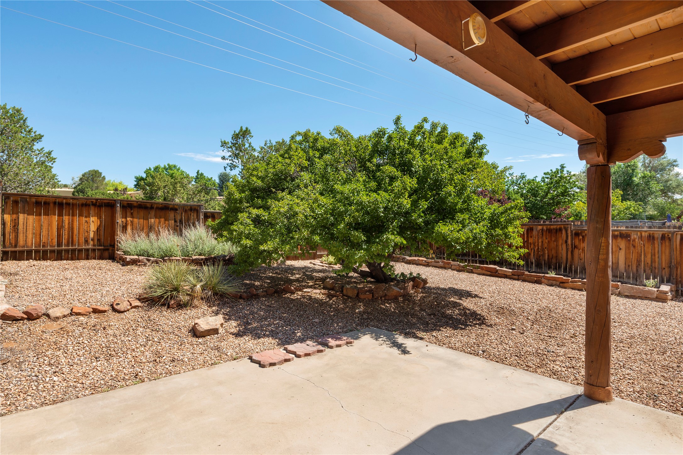 Good cheer abounds in this light-filled, Chapman-built home in Pueblos del Sol. Traditional touches such as Saltillo tile, nichos, a corner kiva and handsome vigas ground the home in Southwestern style, while the tall ceilings and many windows keep the overall feeling light and airy. The tidy kitchen is outfitted with granite countertops, stainless steel appliances, a brand-new gas stove, and plenty of storage. The Primary Suite has a walk-in closet, window seat, and ensuite bath with separate tub and shower. The adjacent office accesses a deck making the upper story a true, private retreat. Low-maintenance landscaping in front and rear includes mature trees and a fully-fenced backyard that backs up to open space. Enhanced with all new carpet, evaporative cooling and many sweet details, this custom home is not-too-close to the highway and near miles of walking trails.