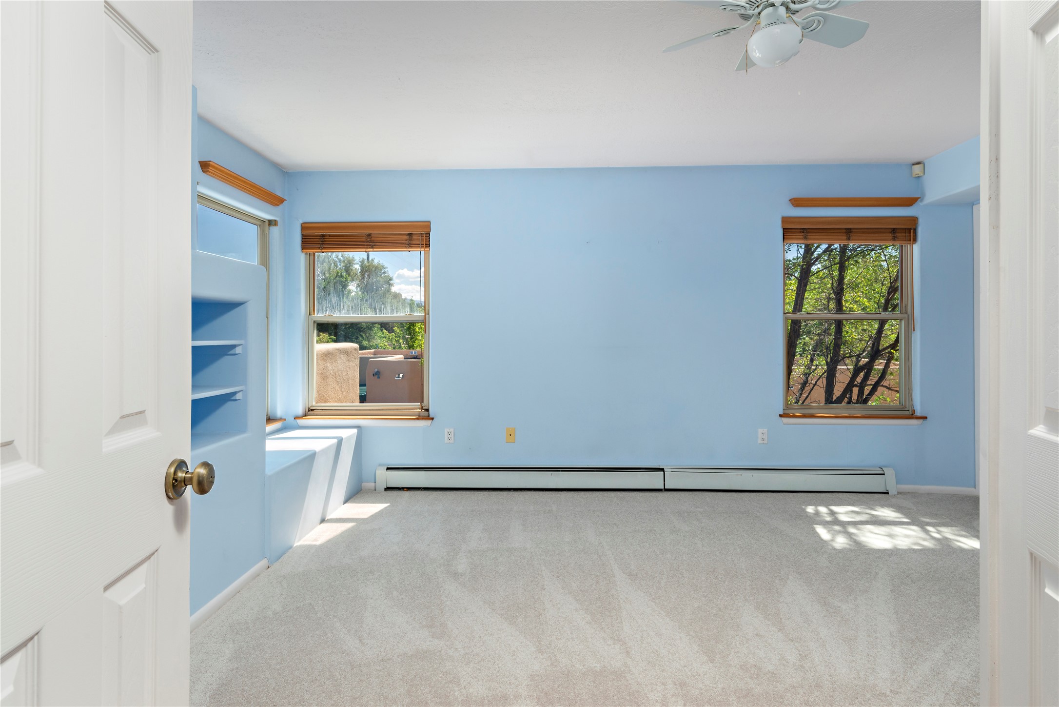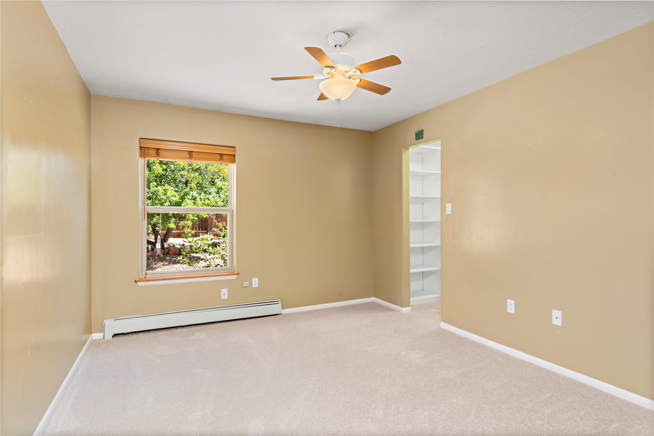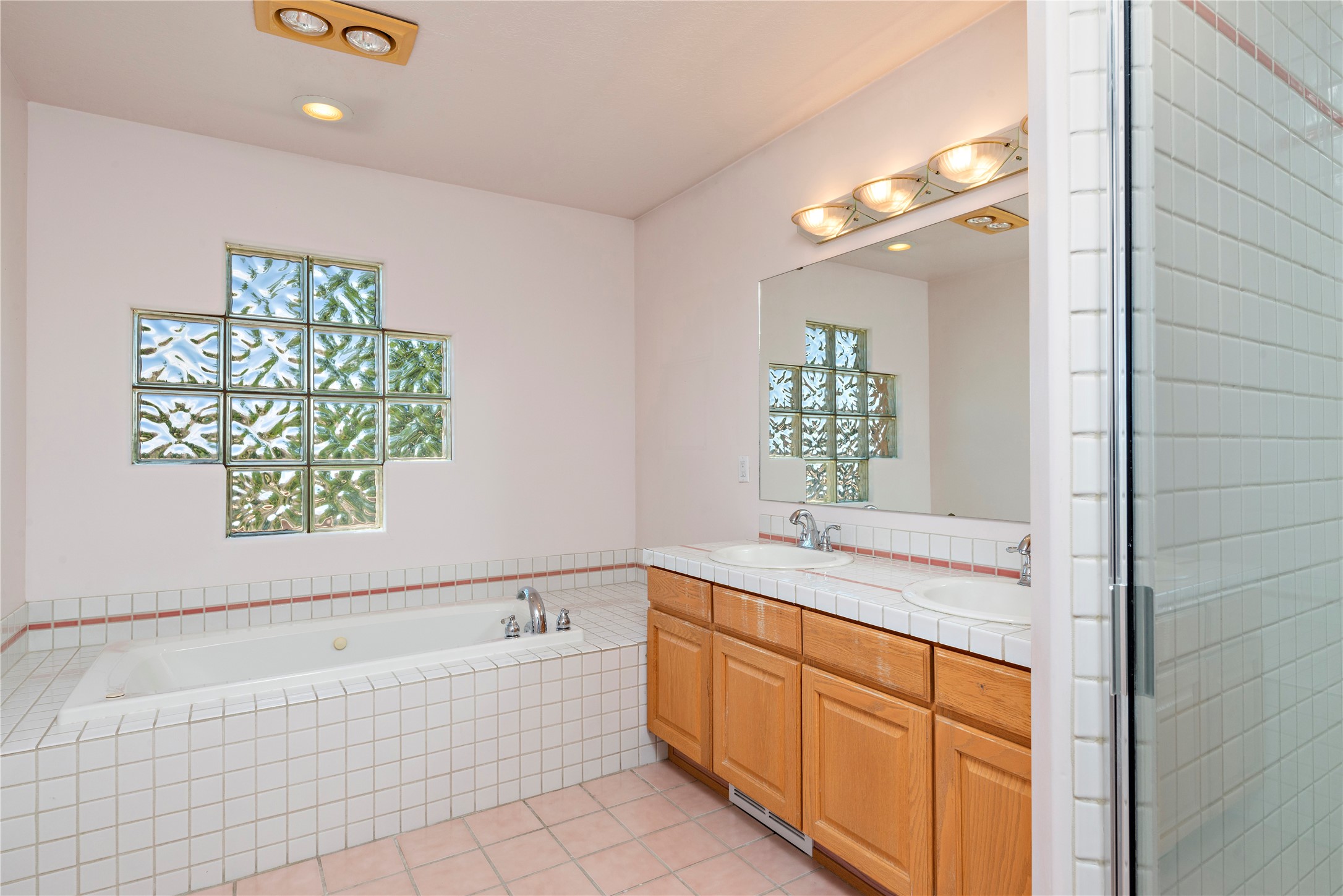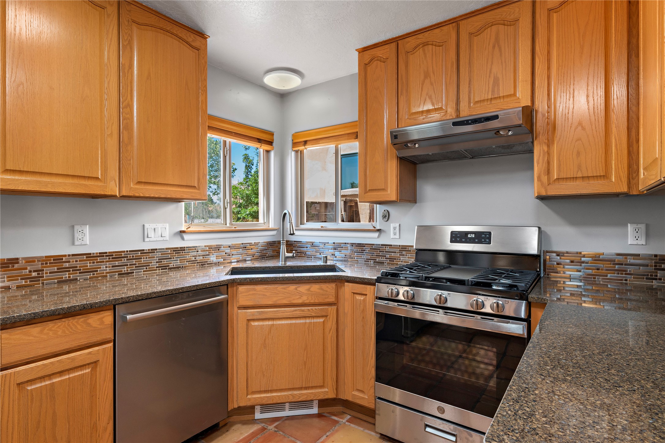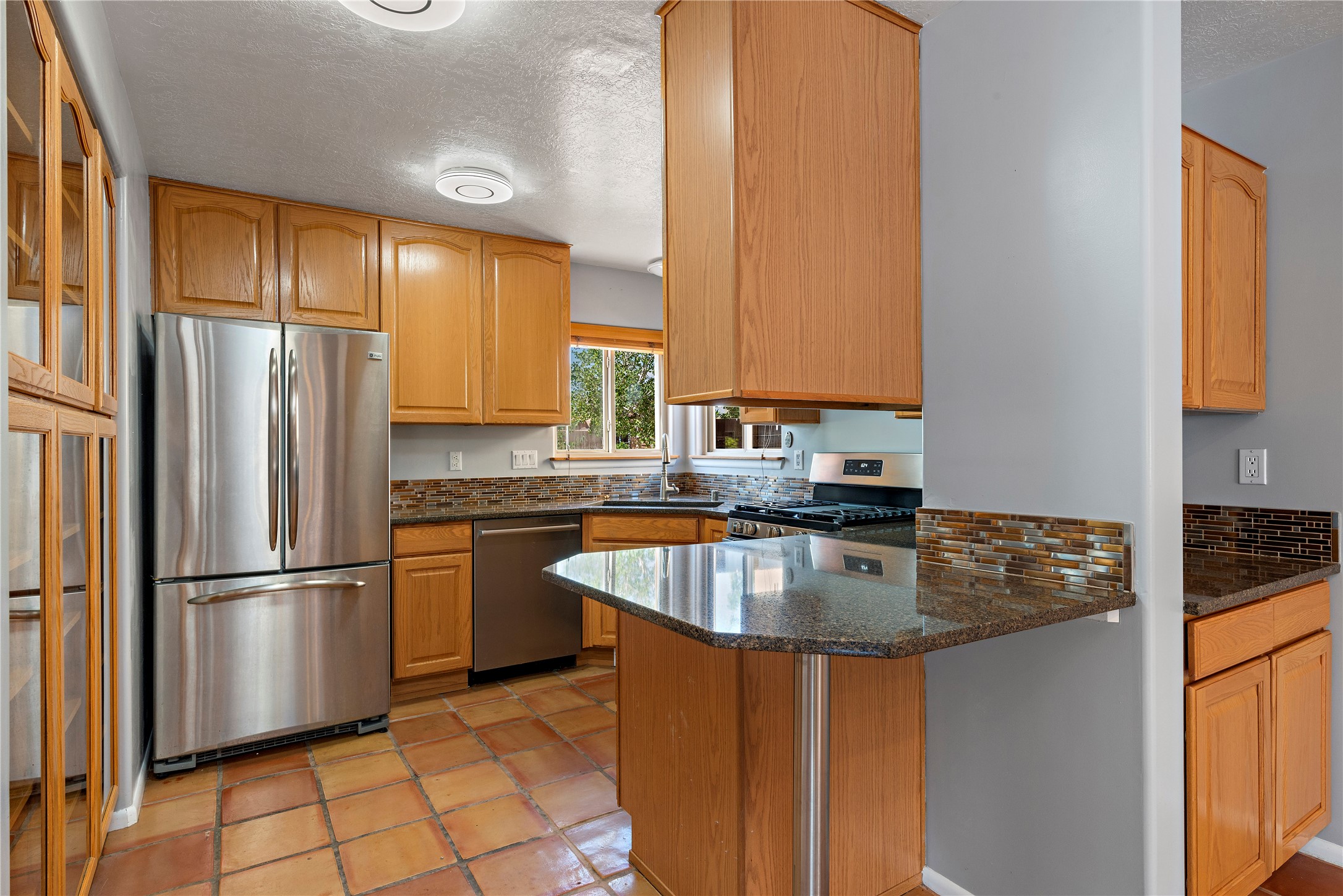 Good cheer abounds in this light-filled, Chapman-built home in Pueblos del Sol. Traditional touches such as Saltillo tile, nichos, a corner kiva and handsome vigas ground the home in Southwestern style, while the tall ceilings and many windows keep the overall feeling light and airy. The tidy kitchen is outfitted with granite countertops, stainless steel appliances, a brand-new gas stove, and plenty of storage. The Primary Suite has a walk-in closet, window seat, and ensuite bath with separate tub and shower. The adjacent office accesses a deck making the upper story a true, private retreat. Low-maintenance landscaping in front and rear includes mature trees and a fully-fenced backyard that backs up to open space. Enhanced with all new carpet, evaporative cooling and many sweet details, this custom home is not-too-close to the highway and near miles of walking trails.