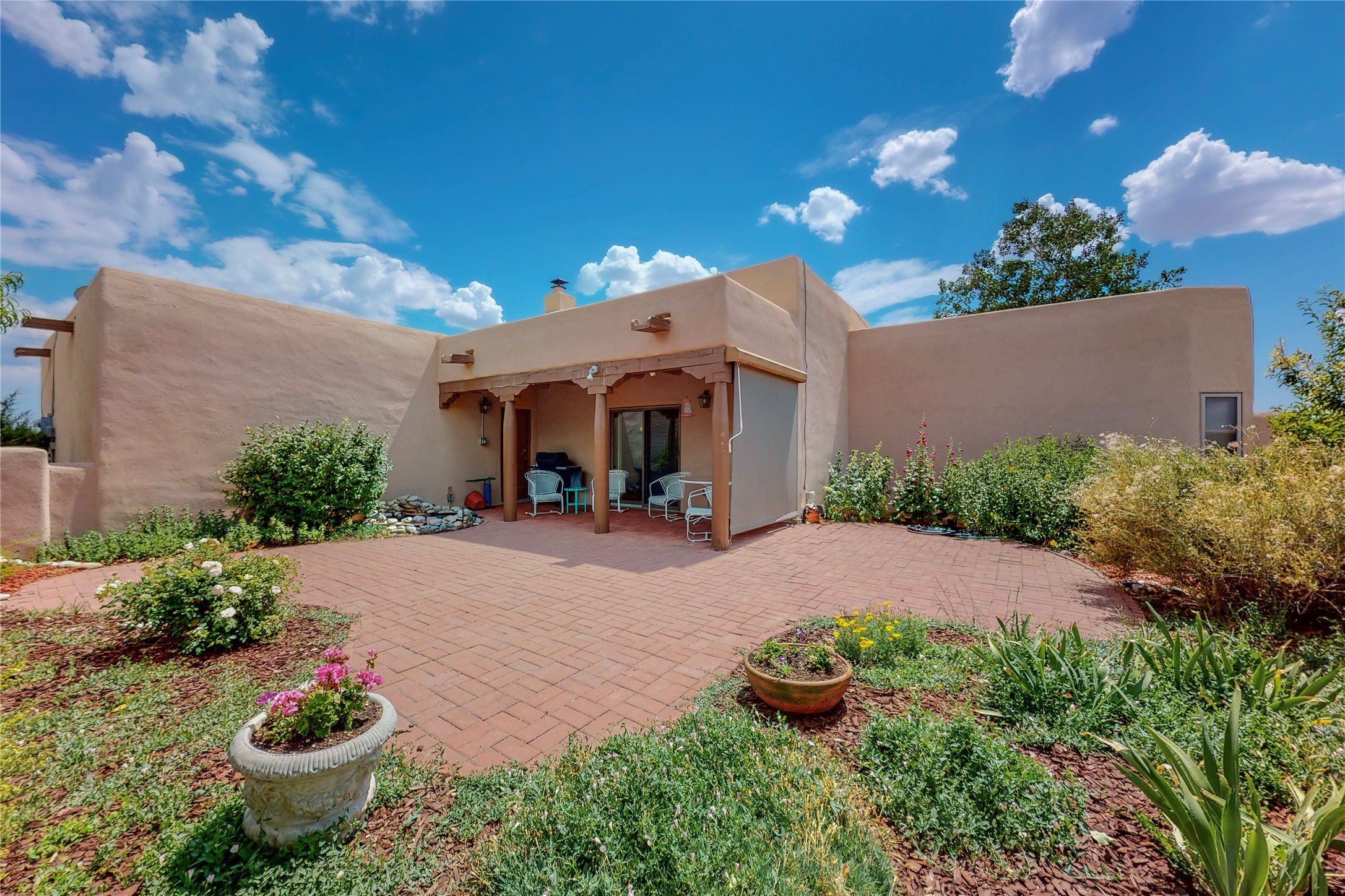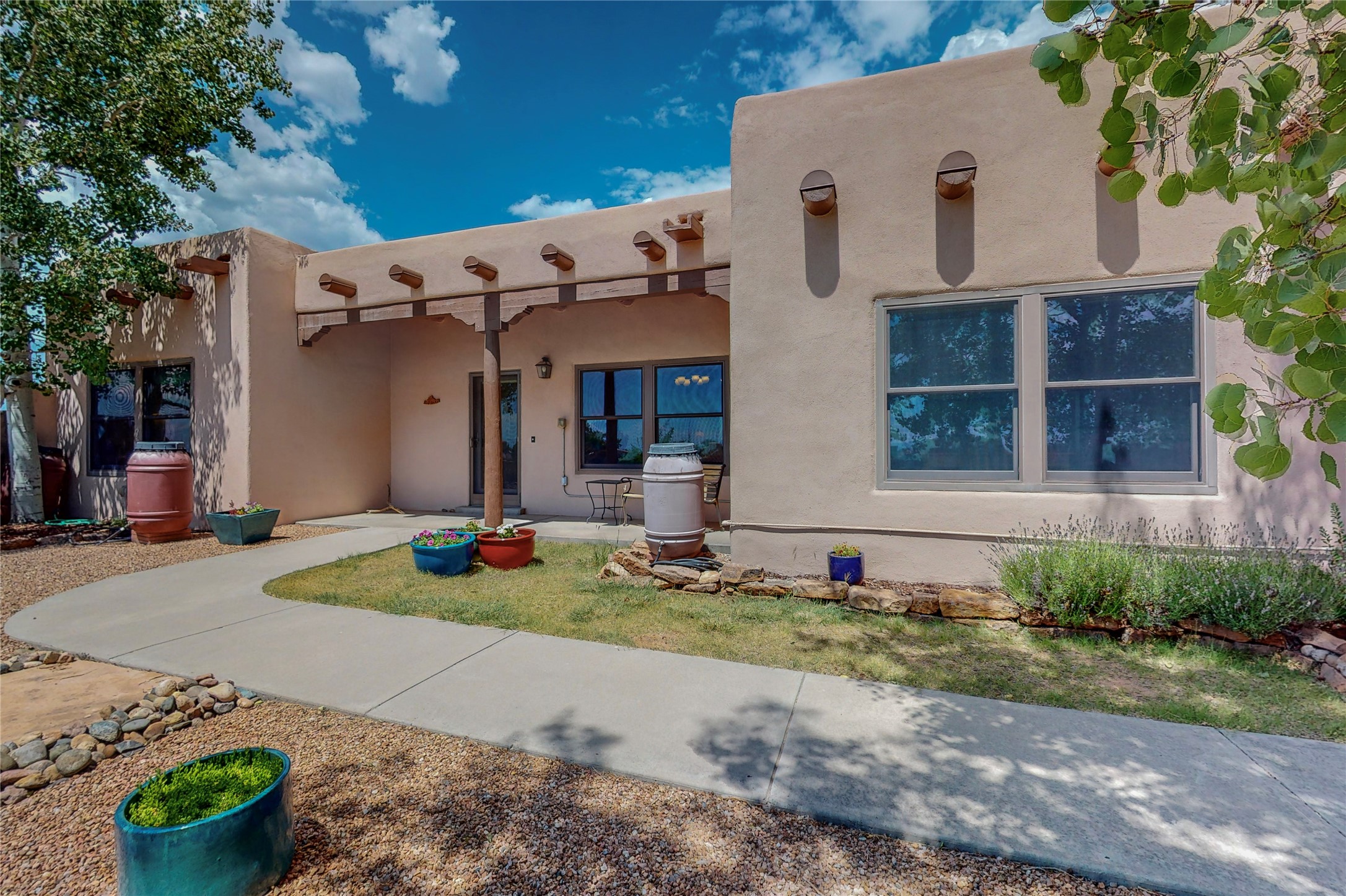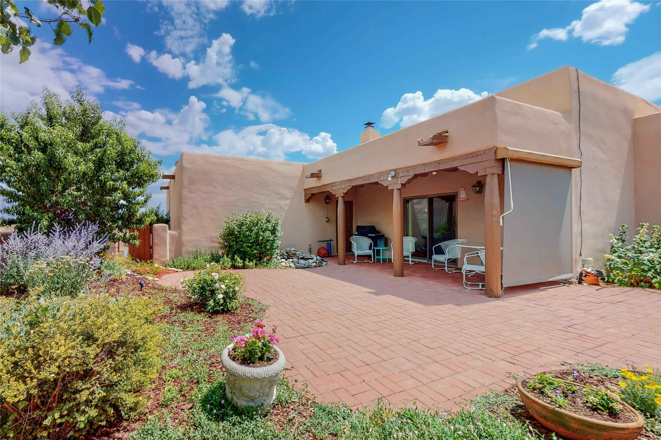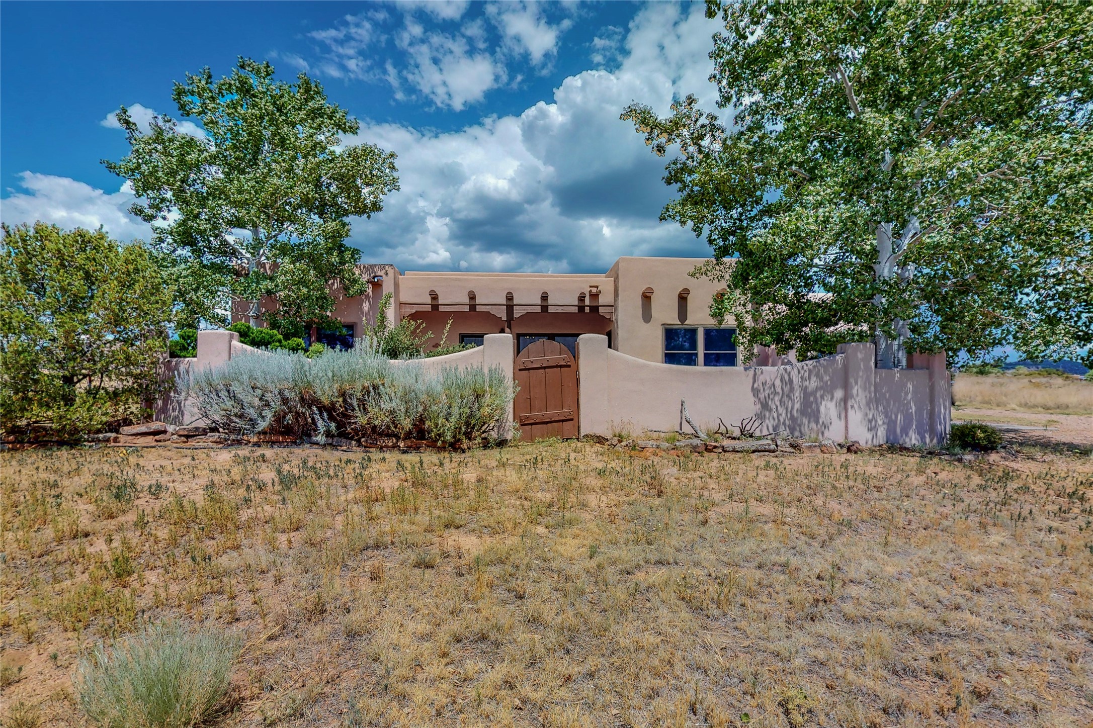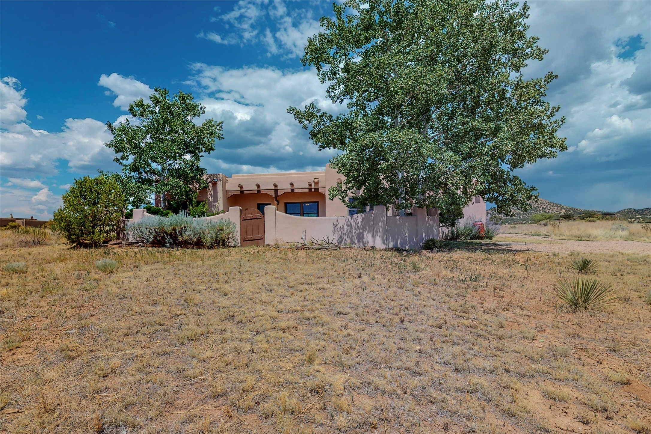 Outstanding mountain views from this lovely custom designed and built Eldorado home. Split 3 bedroom, 2 full bath open floorplan with high ceilings creating a welcoming light and spacious feel throughout. The living areas are graced with viga beam ceilings and dramatic kiva fireplace. An entertainers kitchen features an impressive Viking range and hood plus tons of cabinetry storage and is open to a large formal dining area. A poetic barrel ceiling gallery hallway connects the guest suite and office totally separate to the owners suite. There is a 6 zone, natural gas radiant heating system and a swamp cooler for the summer heat. Gracious walled gardens, portal and patios with expansive mountain views to the north, west and southwest sunsets to help you relax and enjoy country living. This carefully maintained home is close to local shopping, accesses the main roads into Santa Fe and also is close to all the trails, pool, parks and many recreational amenities Eldorado provides its members. Come be a part of our vibrant, active welcoming Eldorado community.